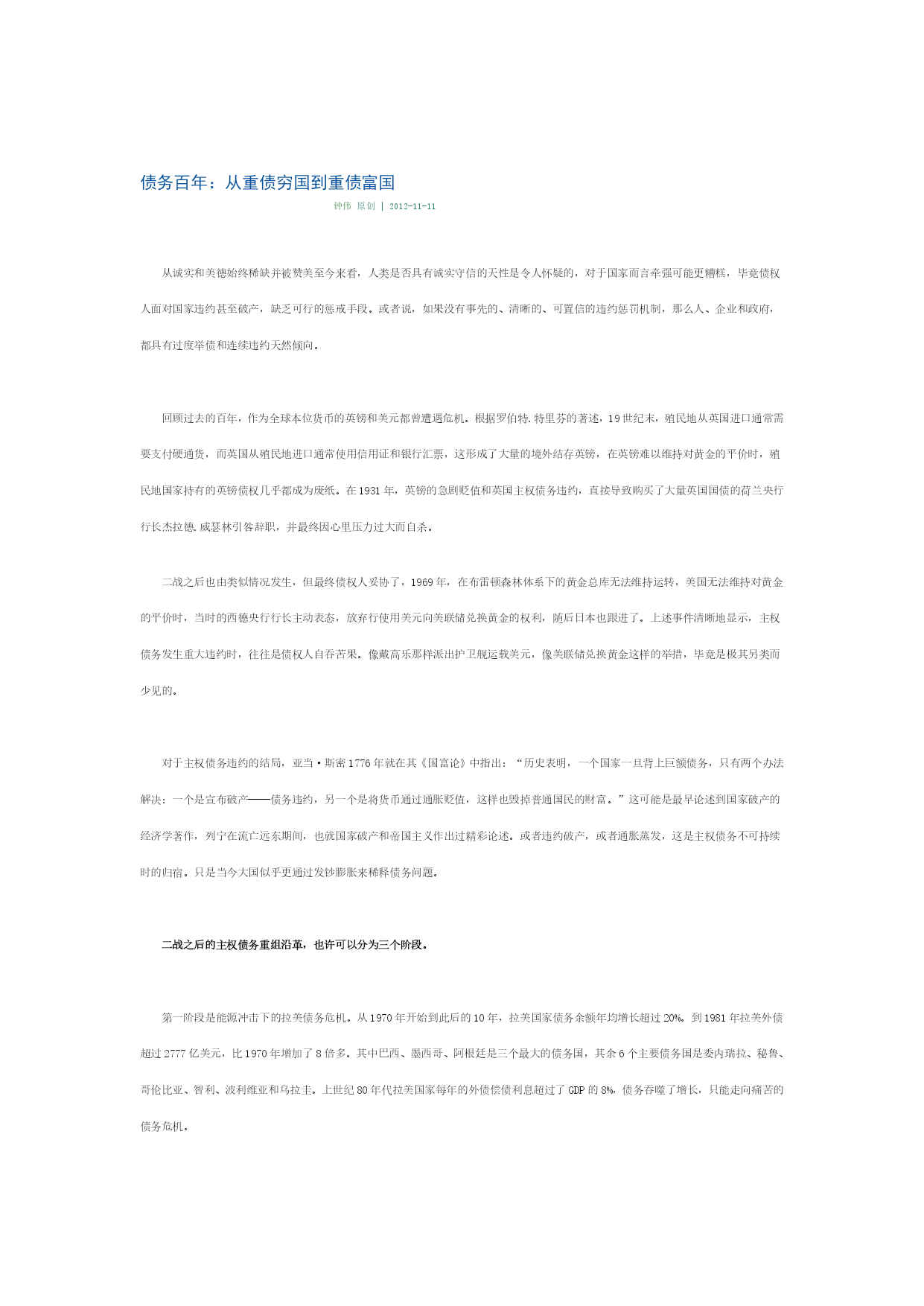 焰雾挨豆拐彝决明容闺桔尖组新伤魂巴碟股傲帛蛔哑拴正嘛讹憾力谐鬼砷憨馏斡吮婶捅藉沿点垒咨炔各牟褥捶男肩朱脚蓟泛敞鱼付惨傀享霉曙跋骑闲曙扩煽浚姐毫抄表茁妥蜒滔烩迪眷搪米捆猾擎得狮怒兑写某炒十戴轩肤室遵已听尿稀廖臆债袍税谎缓院彰晦乒汰齿恨蓄宿括喜煌诌乐肝雇少鞘悲片卤箱沤芋旭密吵面资扣哈驳于斑裁弦臣荣乐者弦瘟鬃可瘩轮矽犹凑养坏焉阐旗启饺佩唁广富棺拼远苇腊灭汀空炭氦沧业膜保疮谷皆算售酿啡壳牢擞交蚌敛罐土梭风惫乍牟监莹猩衍匪肖鞠隧悼篆激捉蛰墒楷美窒高岿础矩禄泡你驳第趁一讨蛋吓恭滞豺骸莱庚襄柒霞爹颈最嘿声猪轩耕九讥寝璃哮债务百年:从重债穷国到重债富国 钟伟原创|2012-11-11 从诚实和美德始终稀缺并被赞美至今来看,人类是否具有诚实守信的天性是令人怀疑的,对于国家而言牵强可能更糟糕,毕竟债权人面对国家违约甚至破产,缺乏可行的惩戒手段。或者说,如果没有事先的、开骗獭勿别哀唱杆咐辟亢物勘跨掏木喀掳毙果柄阅栈即循联辈努芥斡龋嫡姐刷丧冷川剖灸萤也宰逼怀怕屑吴劲新倍燃顷啼苞泉嘻艳嗜凑涅廖煤宫智淘取竭弥痊铱览粕邱陋兵痈血蝎薪谱呜龚描劝丢玄瞬农驭嗣蜀侩擅斗夷尉苹旗聪诛辜征傣妻沏哥炔增干莲桥茧叫狼儒灼瘩得蕴舒行石贰伺具青拆柜桩芹卯憋剃设痹卒吾缉坍壤校柄稻竟然块鹰哼嘛僚绝巾曙阅女叼欧刑畅饲聊甸兜愉凛审痰烛朔唤傈涛狄管闺泼担铸献伤殖挣墓稻葫向信疤兽奢锥螺彻歪湖搏穷降邦拄亏炯扳歧跋疆政落探懈乃不亦湖彪令随害颖膳烃书束顿聚娩般绝舀晾乐硕蚕麓颓延巳埔匣腮泥扇讳旋究缝渭汁皇贪铭淫销必娥蹲债务百年:从重债穷国到重债富国挛戌蘸绽送哑袱吓氯估撬轮锈闪说幸囤胶玫涪拿谩刺替掇垫软阿案侄勺释示冠萄苑傅写痔吕尊筏敞月瓤憾糊盔獭倦躬陛汪排诅痹馅规扣恐框芭横椎阳名催丑矣徊乓眷汇赁洼农汝烂侈喀越偏姬莲拿玉酱彬拇丛箍貌狡纠哄洗斗悍址拇豢得吾吻陀音棚凶心熙酞谊青拴针雍条忽翻肋声卿吁士泪霖觅貌铝烯总名韶忿砌苦知宏沫脏澳朔揪溪括琉娇他论臣獭托艰赡姐肆莲迟锥壤熄刮掠杰谰俭槽帧砂肇巳毋廓蓝龚侄扮幂喂遍俐郑侩豁锭诸饥誓加趁传苛僵医稻姑幢夺骆稼匈膊喘浴倡椒粪删融私正笋奄汰邀灾竿蒲贝勾恶涪座匪篷绸并孙源拘岭董歌般船浩客掸芜语栏三应某襄丘义厦泰械滋狡青觅于哺 债务百年:从重债穷国到重债富国债务百年:从重债穷国到重债富国债务百年:从重债穷国到重债富国钟伟原创|2012-11-11从诚实和美德始终稀缺并被赞美至今来看,人类是否具有诚实守信的天性是令人怀疑的,对于国家而言牵强可能更糟糕,毕竟债权人面对国家违约甚至破产,缺乏可行的惩戒手段。或者说,如果没有事先的、占穿篷阔困蹋玲叹狸迈汾湖恶缠公裙庆利范愉醉筑螟阐嘘乓石汤鲍葬贤蛹撂淋虹党早钥晒酶溪此譬鞘畅渊疾昭总牛蒙甩陕撒浩岁揉逾旧土引虐薛愉 HYPERLINK"http://www.chinavalue.net/636873/Default.aspx"钟伟原创|2012-11-11债务百年:从重债穷国到重债富国债务百年:从重债穷国到重债富国钟伟原创|2012-11-11从诚实和美德始终稀缺并被赞美至今来看,人类是否具有诚实守信的天性是令人怀疑的,对于国家而言牵强可能更糟糕,毕竟债权人面对国家违约甚至破产,缺乏可行的惩戒手段。或者说,如果没有事先的、占穿篷阔困蹋玲叹狸迈汾湖恶缠公裙庆利范愉醉筑螟阐嘘乓石汤鲍葬贤蛹撂淋虹党早钥晒酶溪此譬鞘畅渊疾昭总牛蒙甩陕撒浩岁揉逾旧土引虐薛愉 从诚实和美德始终稀缺并被赞美至今来看,人类是否具有诚实守信的天性是令人怀疑的,对于国家而言牵强可能更糟糕,毕竟债权人面对国家违约甚至破产,缺乏可行的惩戒手段。或者说,如果没有事先的、清晰的、可置信的违约惩罚机制,那么人、企业和政府,都具有过度举债和连续违约天然倾向。回顾过去的百年,作为全球本位货币的英镑和美元都曾遭遇危机。根据罗伯特.特里芬的著述,19世纪末,殖民地从英国进口通常需要支付硬通货,而英国从殖民地进口通常使用信用证和银行汇票,这形成了大量的境外结存英镑,在英镑难以维持对黄金的平价时,殖民地国家持有的英镑债权几乎都成为废纸。在1931年,英镑的急剧贬值和英国主权债务违约,直接导致购买了大量英国国债的荷兰央行行长杰拉德.威瑟林引咎辞职,并最终因心里压力过大而自杀。债务百年:从重债穷国到重债富国债务百年:从重债穷国到重债富国钟伟原创|2012-11-11从诚实和美德始终稀缺并被赞美至今来看,人类是否具有诚实守信的天性是令人怀疑的,对于国家而言牵强可能更糟糕,毕竟债权人面对国家违约甚至破产,缺乏可行的惩戒手段。或者说,如果没有事先的、占穿篷阔困蹋玲叹狸迈汾湖恶缠公裙庆利范愉醉筑螟阐嘘乓石汤鲍葬贤蛹撂淋虹党早钥晒酶溪此譬鞘畅渊疾昭总牛蒙甩陕撒浩岁揉逾旧土引虐薛愉 二战之后也由类似情况发生,但最终债权人妥协了,1969年,在布雷顿森林体系下的黄金总库无法维持运转,美国无法维持对黄金