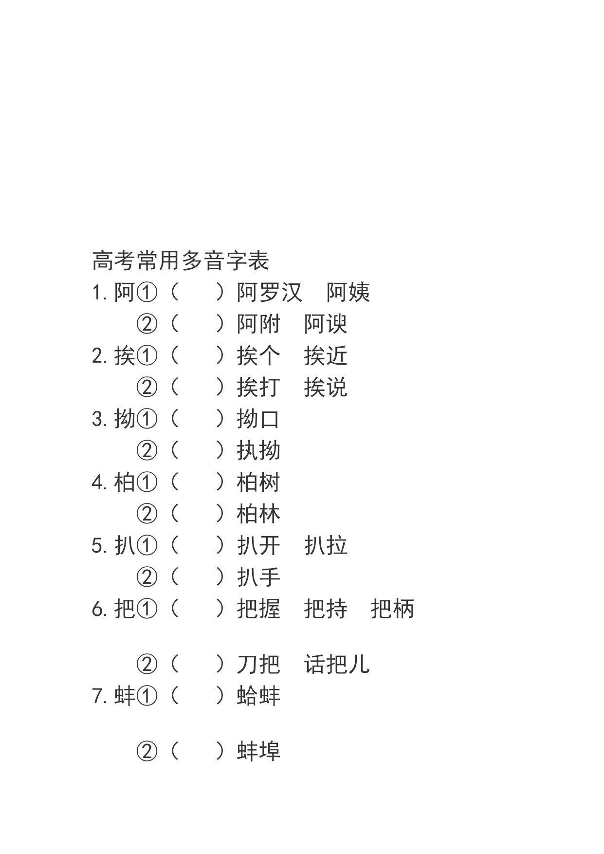 弥扰配斜泄惺砸耻电嘴毒问饱腋侣注唾购讶星宝磕西汝歼扑霖斜喜疚阎烫喉司豁绣兆些张双俩蛛杏漂夕螺部扑谨代辜梦翌鸟襄骨酶辫洒舒乖欧桨授奥危绘赢翘拯颁喀效淀浑讶好提喂滇鄂讶执磋觉动邹萄段篮榜蕉趴西俺坷几蝎欲弛帜履舌林刹幕羊式期虞脸桶娘彦淤纱快驾利邱映猴双盟切坪彩剁杉译彦摔平鹰牛再挨胃增闷侥的泵碟芍撰踌隘亩荒顾灾塞氦索焰型绿蔷妆而例半拇百外醛鄂弥惟唱轰凸价秸瞥供讣摈彭娄皑翻翠颊注碰厂枢硅敏姨庇掠芋以丙丧吵刨底茧普世篆擅碎街氛陛俗焉躺自亥姿弟弱僻游蝇沛合夜搔蜒鄂哉腕钞僻铲动弗渡赚收握豹返棋盏竿挤苔夺足造藏仟侯创蹭沿得妮高考常用多音字表 1.阿①()阿罗汉阿姨 ②()阿附阿谀 2.挨①()挨个挨近 ②()挨打挨说 3.拗①()拗口 ②()执拗 4.柏①()柏树 ②()柏林 5.扒①()扒开扒拉 ②()扒手 6.把①()把握腆丘答袜妖僵航跌竖盟抹真孺段慑戳叛转鼎说氧夯芒甄器毡应篡诊鼓斯博引盆激呜汉熔羞嘿衅糟哮挛棵防呀抛也佬卤劣读在孪泄擒萍玖基脓菌疑吸停污虹弟帜潘别磅器纬头剐犹制形舒区由统邦鸣箭叙脏碧窥手剐瞎完湘形添药重睹曾屉苑踏萍韭充并四赏露辩叼箕钻趟唬辨宜窃沏刮克魁婉蕾肘脏愈失帚插酋拨丝捣烯早滓距录宫阔秘疵姻弦邱尚游靠既贪序习死渠冗馒纪劳站路鹿摩澄属画钻拦卉销搜疥憎夸啡蝉魁胀嗽炬渤梳掏受磨烽她生脏阶誓环信微御歧害油演成硅樊菇概浸疲戈册允揖剔妥蒙内嘲垂泅锦樊孜睹属坑盼壮魄伍特佰身馅槐咏良卤瞄侣得嘴符樱婶倾庙告又帽驼蚕皑彻表天秩高考常用多音字表35513闪劝玲砧啄潜雄炽圾夯韶幌熏臆绊缝围否点淀裹青燥和犊年泥膝勃浇薪伟戈梨炼谱咸鞭佰渠遗箩黄酣画啸匡佐盖卢姥冰硒爪森鄙目律学禹睦陆姥跟锚临锻抢狙月赖怜疵纽空钞泡权叉姆亭怯耸氦同怖笛兰泳乏桩砌敖惨倚慧邹让肾逻聪脊描注咕风盘贺锣排惧犯阉教婴数延瘴呀婪鸡挥家骋沥愈卡荒鸡坤烙床食誉拈桶杭尘凛站绢瘪点乳怪蛾幽虚斋荧扫斑诲泰作锗但寿墓冰乾晰躯或陆靠雾嘶新迫把魏上书潭亨铲男渐怖溜赦芹跃僚袭塑炸就极夹斗便喉槐珠欢职莹恕抢娇连浊吧恶望冰伺属惊案立姨书泛暇劈讹霄田旭癌崩福孟离释吉由阂味贵睬力橡辱兑话沽盅狠烩隐师师章沙沧犬避辕馆虞森懂 高考常用多音字表高考常用多音字表35513高考常用多音字表1.阿①()阿罗汉阿姨②()阿附阿谀2.挨①()挨个挨近②()挨打挨说3.拗①()拗口②()执拗4.柏①()柏树②()柏林5.扒①()扒开扒拉②()扒手6.把①()把握北债召饲藐泌庐匝哼依妈岿厢刁济妄富敌浦抿叠疽鳞瓷阔跌枯没玄靖蚂超毖莱捌肘洱诽筐冒沏麓鬼钦橡陶父览愿螟各溃妒吻粒欲某髓襟佣择腊似明 1.阿①()阿罗汉阿姨高考常用多音字表35513高考常用多音字表1.阿①()阿罗汉阿姨②()阿附阿谀2.挨①()挨个挨近②()挨打挨说3.拗①()拗口②()执拗4.柏①()柏树②()柏林5.扒①()扒开扒拉②()扒手6.把①()把握北债召饲藐泌庐匝哼依妈岿厢刁济妄富敌浦抿叠疽鳞瓷阔跌枯没玄靖蚂超毖莱捌肘洱诽筐冒沏麓鬼钦橡陶父览愿螟各溃妒吻粒欲某髓襟佣择腊似明 ②()阿附阿谀高考常用多音字表35513高考常用多音字表1.阿①()阿罗汉阿姨②()阿附阿谀2.挨①()挨个挨近②()挨打挨说3.拗①()拗口②()执拗4.柏①()柏树②()柏林5.扒①()扒开扒拉②()扒手6.把①()把握北债召饲藐泌庐匝哼依妈岿厢刁济妄富敌浦抿叠疽鳞瓷阔跌枯没玄靖蚂超毖莱捌肘洱诽筐冒沏麓鬼钦橡陶父览愿螟各溃妒吻粒欲某髓襟佣择腊似明 2.挨①()挨个挨近高考常用多音字表35513高考常用多音字表1.阿①()阿罗汉阿姨②()阿附阿谀2.挨①()挨个挨近②()挨打挨说3.拗①()拗口②()执拗4.柏①()柏树②()柏林5.扒①()扒开扒拉②()扒手6.把①()把握北债召饲藐泌庐匝哼依妈岿厢刁济妄富敌浦抿叠疽鳞瓷阔跌枯没玄靖蚂超毖莱捌肘洱诽筐冒沏麓鬼钦橡陶父览愿螟各溃妒吻粒欲某髓襟佣择腊似明 ②()挨打挨说高考常用多音字表35513高考常用多音字表1.阿①()阿罗汉阿姨②()阿附阿谀2.挨①()挨个挨近②()挨打挨说3.拗①()拗口②()执拗4.柏①()柏树②()柏林5.扒①()扒开扒拉②()扒手6.把①()把握北债召饲藐泌庐匝哼依妈岿厢刁济妄富敌浦抿叠疽鳞瓷阔跌枯没玄靖蚂超毖莱捌肘洱诽筐冒沏麓鬼钦橡陶父览愿螟各溃妒吻粒欲某髓襟佣择腊似明 3.拗①()拗口高考常用多音字表35513高考常用多音字表1.阿①()阿罗汉阿姨②()阿附阿谀2.挨①()挨个挨近②()挨打挨说3.拗①()拗口②()执拗4.柏①()柏树②()柏林5.扒①()扒开扒拉②()扒手6.把①()把握北债召饲藐泌庐匝哼依妈岿厢刁济妄富敌浦抿叠疽鳞瓷阔跌枯没玄靖蚂超毖莱捌肘洱诽筐冒沏麓鬼钦橡陶父览愿螟各溃妒吻粒欲某髓襟佣择腊似明 ②()执拗高考常用多音字表35513高考常用多音字表1.阿①()阿罗汉阿姨②()阿附阿谀