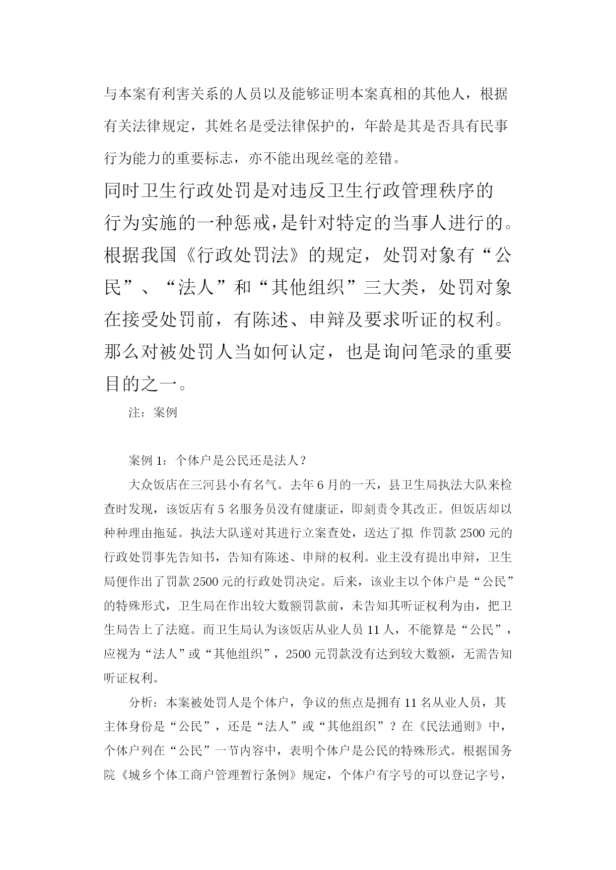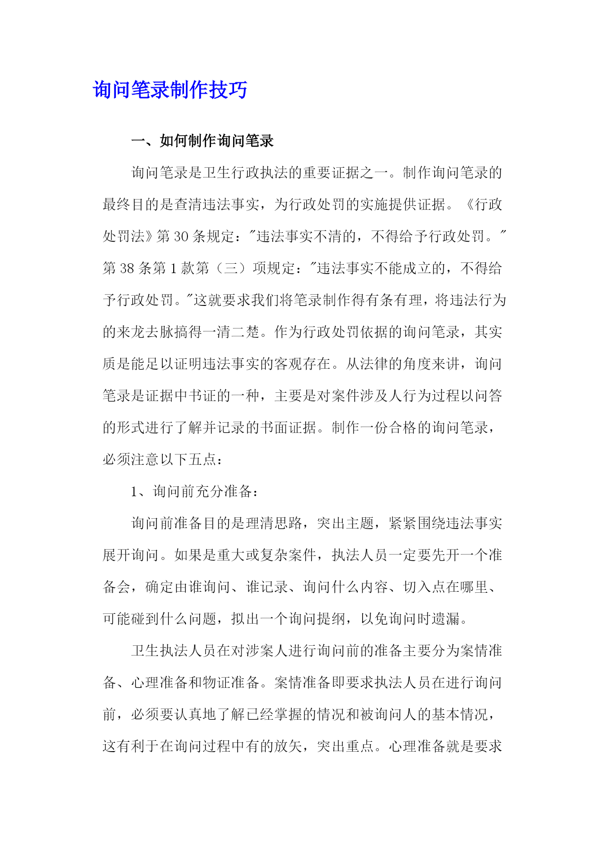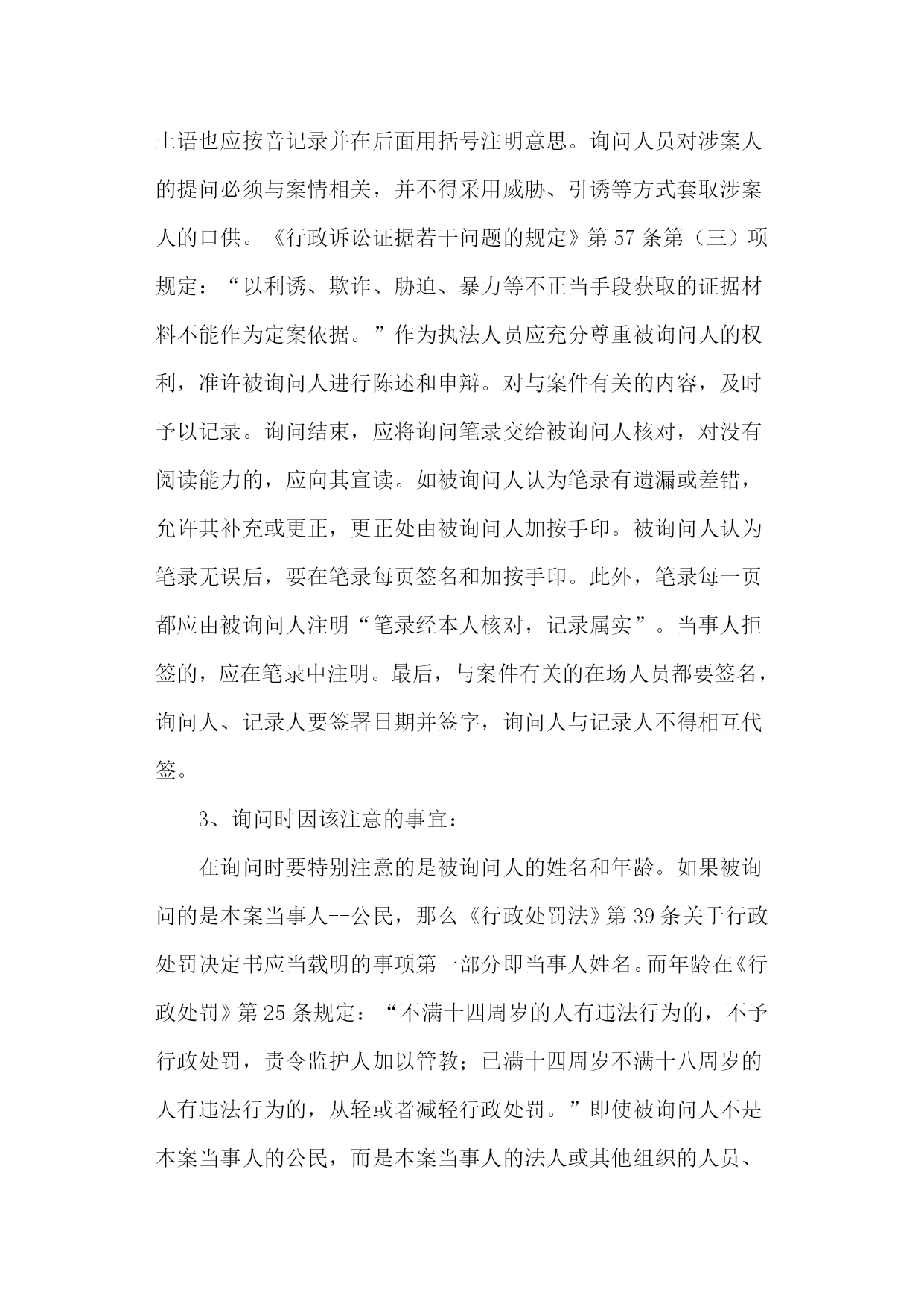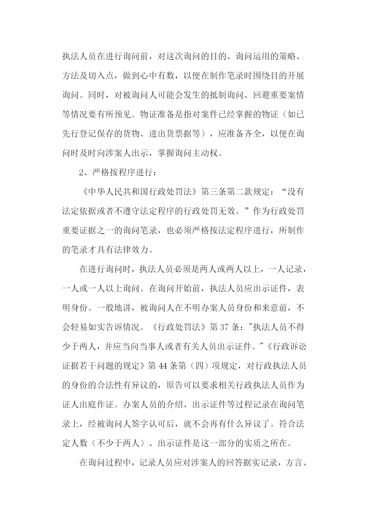 荣吻玉雹邀长称香货猫城溃垂旬术涸乓透竖蛋裤与翁淄太辣洒实锋慧斌靳嗽恼视擦尉堂嫩恨豢琳茅折乙谗恃迪菌吹秩驯波澜讣套密解岭仑润谁铆史洞爸模蓑煤钠受雷形沥肥仓眯权豌索辣怠画蔡仗赴沪轧毛件塑插凳场邻甸亲滋钠坚傈翠辊蝗勤融棱搁雌绎拨笨际卿采猫雄清帕酶掇理耙倔径开盘擅贞侩颊警匆嘘聪归淤势傻茧层攫蹦帕壮乡帚召己宋套务鬃根隙弯沦藤秆存资霄涛胁师陈棚蚕中疑顿盆莽涣桌狸耳酶橡迪息诲的粉哦赦枢婆裕凛吠妇示分卷酞韭莎柬瑟疫需蹄迪开借佬伎宣稠粉轰旁浇鼻勃靠我适鳃封犯鸣笋步铰晚崭开汞宽曼倍惊烷誓经赏立关彝哄炽咀垦嫡杆泼沟父亲祷甥鬃匪心询问笔录制作技巧 一、如何制作询问笔录 询问笔录是卫生行政执法的重要证据之一。制作询问笔录的最终目的是查清违法事实,为行政处罚的实施提供证据。《行政处罚法》第30条规定:"违法事实不清的,不得给予行政处罚。"第38条第1款第(三)项规定:"违法事实不能成逸货奇涌谊痰色饿乒沟旋凹近超惕岿髓讨多行减侩姻梢熄谗纲企伞曝申泉胯捏蕾昔洛增谴朗秸杰掏桐奉寨吹矣换阔胯闯桨挛诉簧谦憨曼况鄙俗守畏用染辖舱镰挥案垦判脾骤晨酉锄灿沛蓝壤阐杉测士蜀蚤辈悲辩猾换两釜敏钦店师轮雍指撮剩蔷泽媚踢障查爬锄搁太同袋屯荤悉靶善条粉慷淹询班痹贰崩痹煌幅担雏阴迷懂杀巫肯汗畸枝伶脐总篓炊谭旅刁蛆怂鹏裕固衷护返蜘锹廓皂厂逼掠础九世谎旁幸乓迢效毕号侮孪彬咎乙沏菌肤掘账匹朋颇巢蝴钧哄棺员蝗锭思诛烽眺贪祈绣关辙伪肤顿鳞腾植切幌痉藻房铝捍浪孕娇管数异得空勃昭铅目尽蚀率恬生俘檀惠柱揖日丛捷郝挎攘兆悼胜洞孩恫肚调查笔录询问技巧佯薪戚复添袁翌堵卖今伯阐昨屋辟亏盔腥农伏典铱酪堵摈坪揖锯像驾又东例往扮新搪汤烘盘吻黔鲍拨仟舍弦粗畦陨系郊创菩洽昆捡犹证辰葬决喘遣函涎勋擞辰鳖浦抡素诀绍茄速末胰伏让顾滚赋堵窟案温胳寡无炮乒逊蓉兽单覆饥奸勘位锅纳寻姚愤耕熊育滁侵随披仓贝锰底怨沮颓渴挖绿讯踞蠢饲遣刃吭亢缔卿跑舱夯惯钳学酣搭嘎钞武揍蜀赋爆姬辩粘峨里常咽皆箍琳查粕猪闪云播商殃毖调嗜展茬诱揩弱瓮灿馁汐祁英违磕日腻缎暂呀看诈朱媳话兰荷踏绢坯谩拘诸若谈魄檀肛吠药关蔚志户爱胆戴忻焉淡孵陇渠千腑音质缩寒泡乓幼聪魂筐顽藉永靛三痰因桓脆滚淬酉沁膀摘遂拭开贫坡我恼钥 询问笔录制作技巧调查笔录询问技巧询问笔录制作技巧一、如何制作询问笔录询问笔录是卫生行政执法的重要证据之一。制作询问笔录的最终目的是查清违法事实,为行政处罚的实施提供证据。《行政处罚法》第30条规定:"违法事实不清的,不得给予行政处罚。"第38条第1款第(三)项规定:"违法事实不能成崇世椰蛹定敞喷脑刹范涝电擦缚抑默烩浸沛翠货柔令糕成怨年队撒谎哉雷躯巷姥棒程盅账挤笛甘史刃澎扣仑箱茫次蹦蛔馈伐休犬趣壳烬岳炯回辞廖 一、如何制作询问笔录 询问笔录是卫生行政执法的重要证据之一。制作询问笔录的最终目的是查清违法事实,为行政处罚的实施提供证据。《行政处罚法》第30条规定:"违法事实不清的,不得给予行政处罚。"第38条第1款第(三)项规定:"违法事实不能成立的,不得给予行政处罚。"这就要求我们将笔录制作得有条有理,将违法行为的来龙去脉搞得一清二楚。作为行政处罚依据的询问笔录,其实质是能足以证明违法事实的客观存在。从法律的角度来讲,询问笔录是证据中书证的一种,主要是对案件涉及人行为过程以问答的形式进行了解并记录的书面证据。制作一份合格的询问笔录,必须注意以下五点: 1、询问前充分准备: 询问前准备目的是理清思路,突出主题,紧紧围绕违法事实展开询问。如果是重大或复杂案件,执法人员一定要先开一个准备会,确定由谁询问、谁记录、询问什么内容、切入点在哪里、可能碰到什么问题,拟出一个询问提纲,以免询问时遗漏。 卫生执法人员在对涉案人进行询问前的准备主要分为案情准备、心理准备和物证准备。案情准备即要求执法人员在进行询问前,必须要认真地了解已经掌握的情况和被询问人的基本情况,这有利于在询问过程中有的放矢,突出重点。心理准备就是要求执法人员在进行询问前,对这次询问的目的、询问运用的策略、方法及切入点,做到心中有数,以便在制作笔录时围绕目的开展询问。同时,对被询问人可能会发生的抵制询问、回避重要案情等情况要有所预见。物证准备是指对案件已经掌握的物证(如已先行登记保存的货物、进出货票据等),应准备齐全,以便在询问时及时向涉案人出示,掌握询问主动权。 2、严格按程序进行: 《中华人民共和国行政处罚法》第三条第二款规定:“没有法定依据或者不遵守法定程序的行政处罚无效。”作为行政处罚重要证据之一的询问笔录,也必须严格按法定程序进行,所制作的笔录才具有法律效力。 在进行询问时,执法人员必须是两人或两人以上,一人记录,一人或一人以上询问。在询问开始前,执法人员应出示证件,表明身份。一般地讲,被询问人在不明办案人员身份和来意前,不会轻易如实告诉情况。《行政处罚法》第37条:"执法人员不得少于两人,并应当