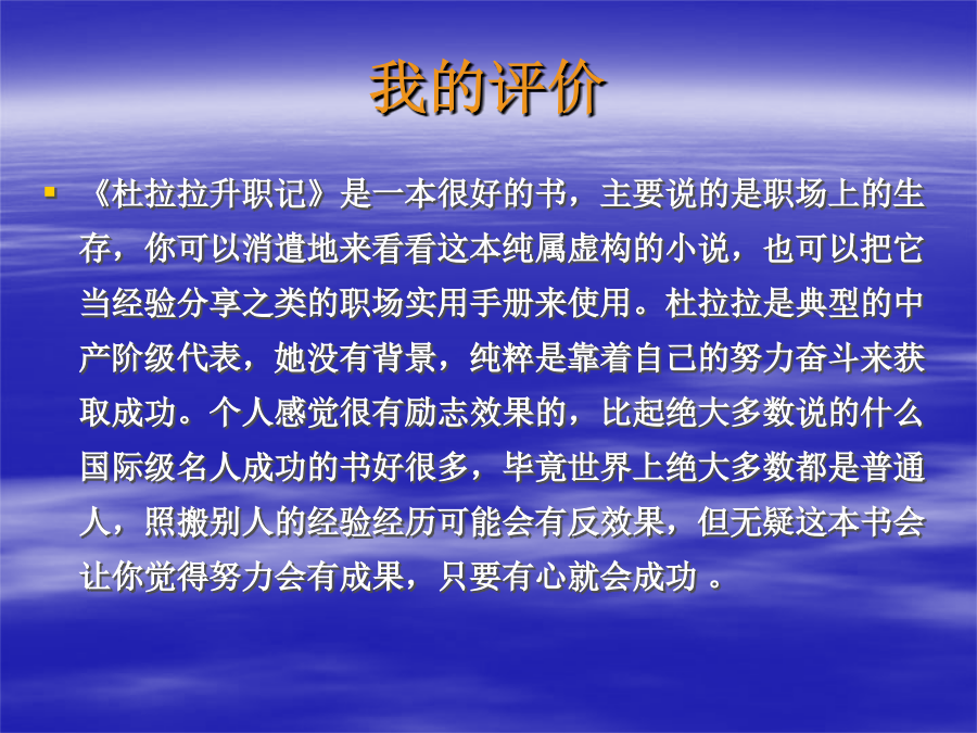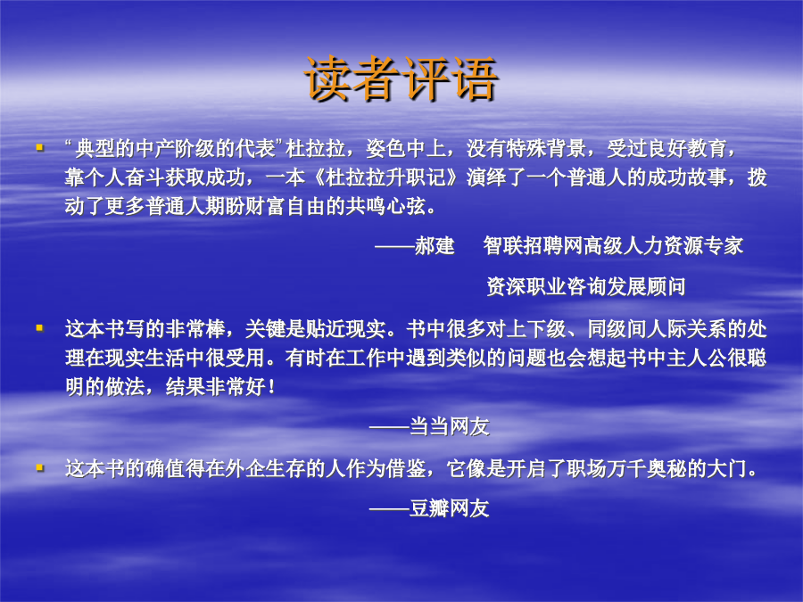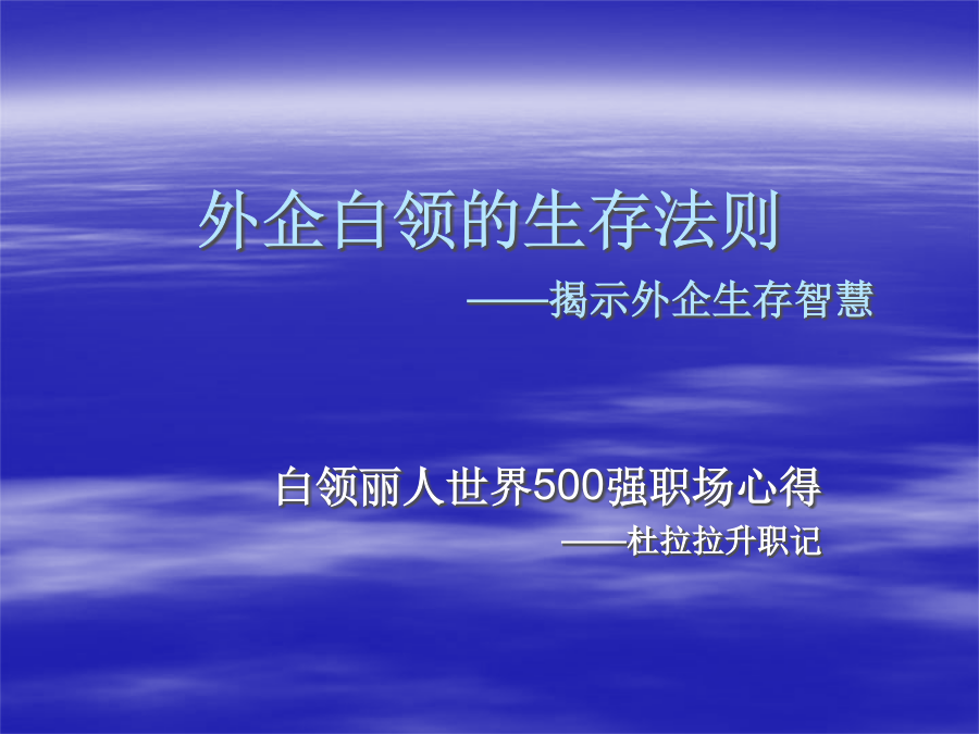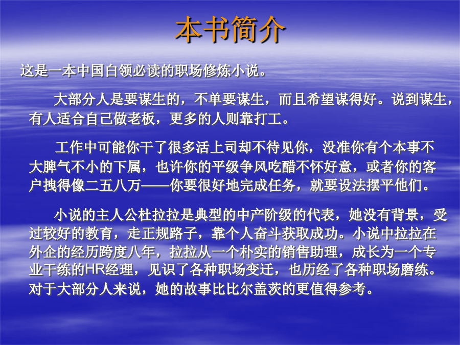 外企白领的生存法则——揭示外企生存智慧本书简介读者评语我的评价人物关系简介杜拉拉其人老板们的不同特点和上司要保持一致——玫瑰自己独立完成工作——李斯特净利经营为导向——何好德目录忠诚源于满足老板心中谁更重要别搞不清楚谁是老大受累又受气该怎么办职场天条:慎用MAIL要想当经理就别想轻松:学习与承压认可须及时上级与下级之间的匹配又笨脾气又大的下属SMART原则是在工作目标设定中,被普遍运用的法则。 S---Specific:意思是设定绩效考核目标的时候,一定要清晰、明确,也就是目标不可以是抽象模糊,让考核者与被考核者能够准确的理解目标。 M---Measurable:就是目标要可衡量,要量化。考核时可以采用相同的标准准确衡量 A----Attainable:即设定的目标要高,要有挑战性,但一定要是可达成的. R----Relevant:设定的目标要和该岗位的工作职责相关联。 T----Time-bounding:对设定的目标,要规定什么时间内达成,要有时间限制。SMART原则SMART原则个人权力太大会妨碍组织的安全Sop的多种功能诚信为先什么叫“不道德”自由的活你的找一家好公司。 产品附加值高,生意好,并且从业务线看,具备持续发展的能力和前景; 有专业的/聪明能干的/经验丰富的/并且为人现实的管理层,在把握这公司,并且有保护一贯这样用人的制度的公司; 有严格的财务制度,对预算、费用和利润等于投入产出有关的内容,敏感并且具有强控制力的公司; 崇尚客户导向/市场导向/结果导向/执行力的公司; 有专业严谨全面的流程和制度,并且其执行有利于推动业务的良性发展,具有控制性和实操性兼备的特点; 总结起来,就是一家具有持续赢利能力的牛气公司。你的找一个好的方向 什么是好的方向?永远不要远离核心业务线。你得看明白,在企业中,哪个环节是实现利润最大化的关键环节。有时候是销售环节,有时候是市场策划环节,有时候是研发环节,有时候是生产环节,视你所在行业而不同。 最重要的环节,总是最贵的,最牛的,最得到重视的,也是最有发展前途的部门。它拥有最多的资源和最大的权威--你应该依附在这样的核心业务线上发展,至少能避免被边缘化,而成为关键人才的可能性则更大了。 你得跟一个好老板。 好老板的标准很多,关键的是,你要设法跟上一个在公司处于强势地位的老板。他强,你才能跟着上。跟了一个弱势的老板,你的前途就很容易被跟着给耽搁了。具备谋取好职位的资格具备谋取好职位的资格本书结论结语到此结束 谢谢大家