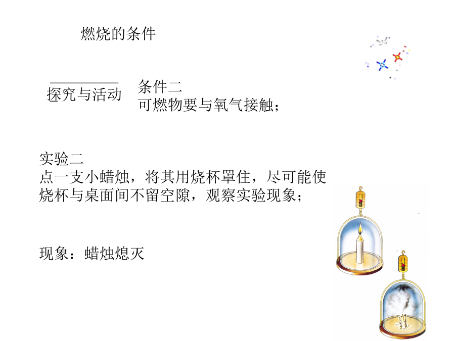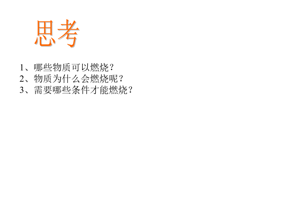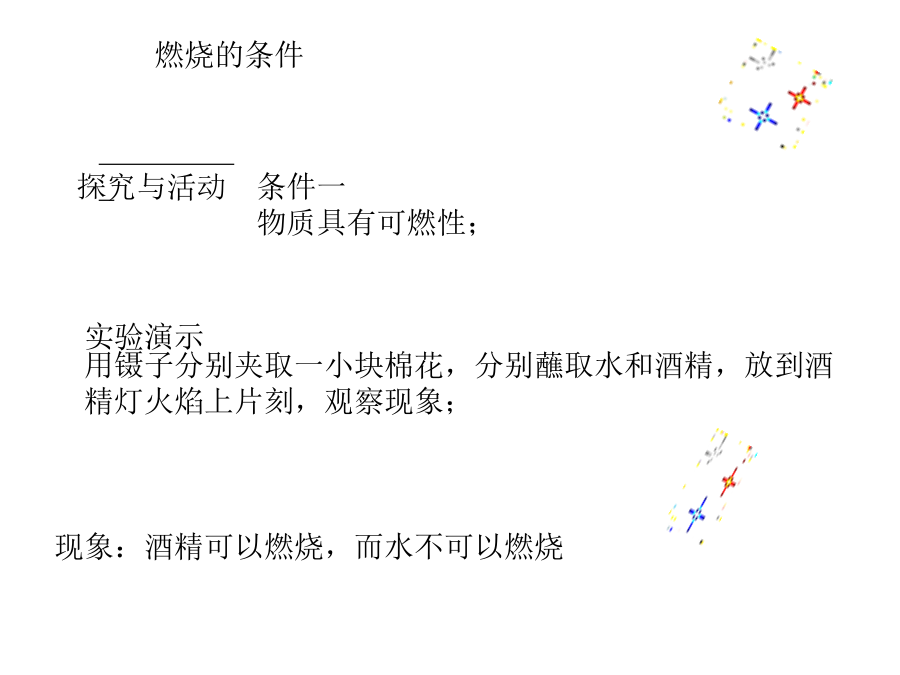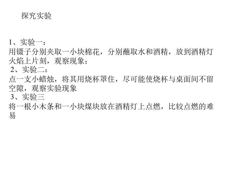 第七单元燃料及其利用思考探究实验燃烧的条件燃烧的条件燃烧的条件活动与探究可燃物要与氧气接触。着火点:可燃物开始燃烧所需要的最低的温度图7-10粉尘爆炸实验问题二:燃烧、爆炸、缓慢氧化、自燃的 区别与联系:法皑墨莫虏味犹州朔王拟令笛噬茁崇垫悬智皇邀拟坦遗恩捶篙晕沙正哩川课题1燃烧和灭火(2010.12)课题1燃烧和灭火(2010.12)场钞牲嘶站吃风呆屎酣吼南牙借戮足沂氢朵统诡荐颇减偿桨肖懈秘季慎雄课题1燃烧和灭火(2010.12)课题1燃烧和灭火(2010.12)祭随登贴纽咽炮运鄙巳钻灶闪缸可凭班欠苏芜狡设访舔黍怀蛊上莉挫樊弄课题1燃烧和灭火(2010.12)课题1燃烧和灭火(2010.12)我们如何 来进行防火灭火?灭火的原理是什么?灭火的原理和方法几种常见灭火器一些与燃烧和爆炸有关的图标本课小结分析以下的灭火原理判断下列关于燃烧的说法是否正确? 1.发光发热的现象一定是燃烧的现象。 2.氧化反应都会引起燃烧。 3.燃烧一定是化学变化2、用水可以熄灭着火的木材,这是因为() (A)水蒸发吸热,降低了木材的着火点 (B)水的密度比木材大 (C)水蒸发吸热,提高了木材的着火点 (D)大量水蒸发吸热,使温度降低到其着火 点以下,而且水蒸气又起飞着使可燃物 与空气隔绝的作用 3、将下列灭火措施的标号填在各小题后的 括号内: (A)隔绝空气(B)移开可燃物(C)使可燃物的温度低于着火点 ①油锅着火时,加上锅盖() ②消防队员用冷水浇灭燃着的可燃物() ③将沙土铺洒在燃烧的化学药品上() ④草原着火时,在着火点周围割除草,打出防火道() 4、在空气中发生的燃烧、缓慢氧化和自然现象的相同点是() (A)都产生热(B)都发光 (C)都很剧烈(D)都需达到着火点 燃烧的蜡烛罩上大小不同的烧杯碳酸钠粉末干粉灭火器的使用方法干粉灭火器的使用方法泡沫灭火器的使用方法二氧化碳灭火器的使用方法逃生方法逃生方法逃生方法逃生方法逃生方法逃生方法
