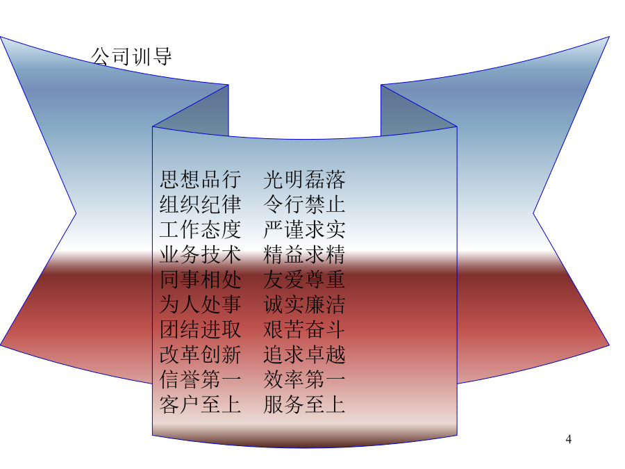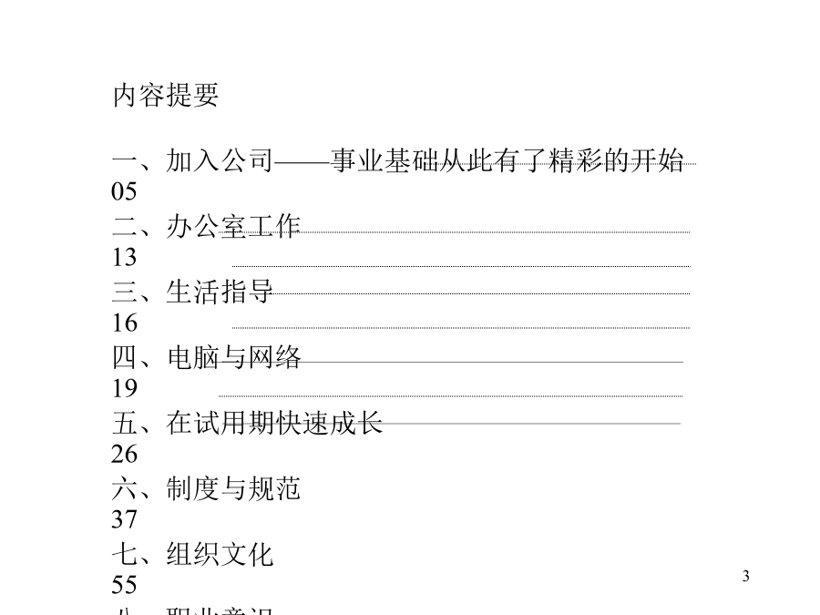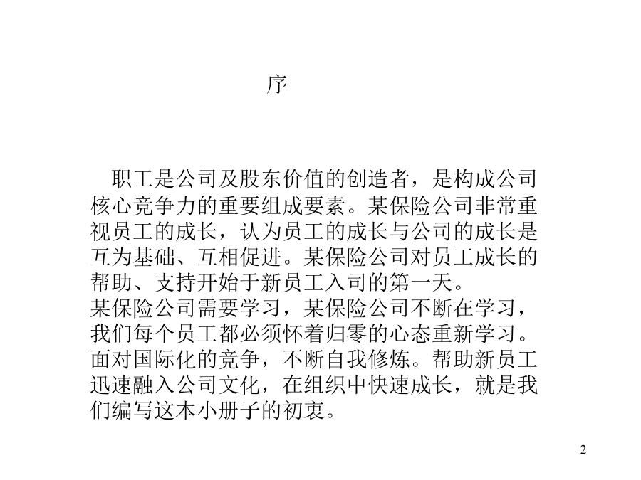 员工入职培训课程序内容提要 一、加入公司——事业基础从此有了精彩的开始05 二、办公室工作13 三、生活指导16 四、电脑与网络19 五、在试用期快速成长26 六、制度与规范37 七、组织文化55 八、职业意识71 公司训导波澜壮阔地录取了要做些什么呢?报到入司须知 1、公司实行每周五天工作制,上班佩戴工作卡,上下班打卡,工作 时间为上午8:30-12:00,下午13:30-17:30,每个工作日早晨须提前 5分钟到达办公场所,以便及时参加晨会。 2、遵守某保险公司礼仪,谦和礼貌待人。 3、工作时间不得擅离职守,禁止聊天、办私事、大声喧哗,不得妨碍他 人工作。 4、八卦岭地图座位:是由所在部门统一安排地点:六楼东622室可借阅书籍。 时间:星期一至星期五中午12:00-1:30 规则:每次最多两本、最长借二个星期。 电话:3864如何使用内部信息网在试用期快速成长试用期是指在《劳动(聘用)合同》中所规定的一定时间的试用阶段。公司规定的试用期是指员工结束入司培训后,在岗工作三个月的考察期,最多不超过六个月(含培训时间)。在此期间公司将进一步考察被录用的员工是否真正符合聘用条件,能否适应公司要求及工作需要。生涯规划潜能的发挥制度与规范文件保密规定某保险公司礼仪三、社交礼仪 (一)握手:握手时,应尊者先伸手。握手的力度不宜过猛或毫无力度。握手时间一般在2、3秒。要注视对方并面带微笑。 握手时注意:不能交叉握手,不能在握手时与其他人说话。握手摆动幅度过大,戴手套或手不清洁和他人握手都是不礼貌的行为。组织文化资源是有限的,只有文化是生生不息的。某保险公司认为,现代企业的竞争归根到底是企业文化的竞争,因此某保险公司不懈地构建独特的公司文化。 某保险公司的规模在不断地扩大,某保险公司的责任也在不断地加重。某保险公司强调精诚团结、不惧困难、顽强拼搏、追求卓越的精神传统,某保险公司将企业文化贯穿在公司资本、核心技术、人才等核心竞争因子的始终! 不断地自我批判, 不断地挑战自我, 不断地突破极限, 不断地追求卓越, 凝聚、协调、合作、激情、责任, 这——就是某保险公司的组织文化。 职业意识 职业意识——德、才、能、拼