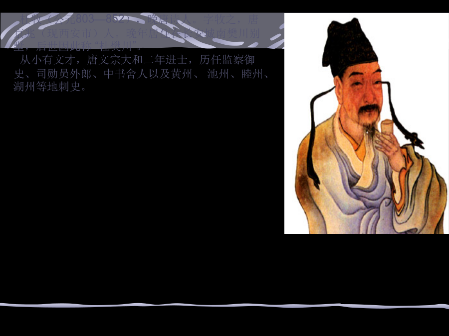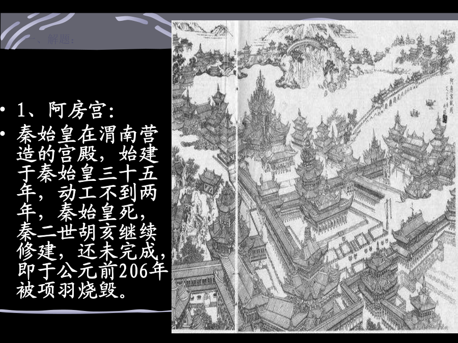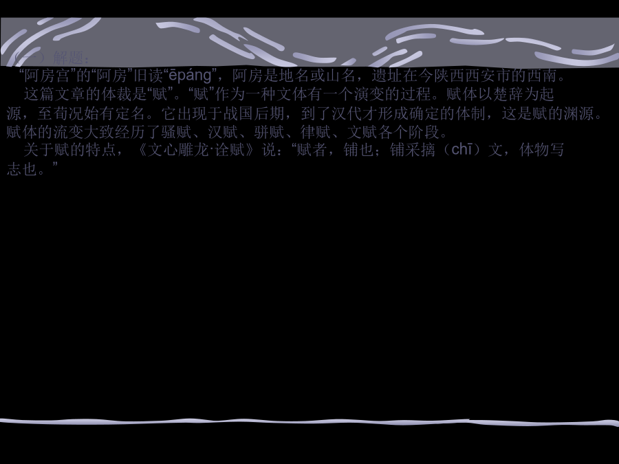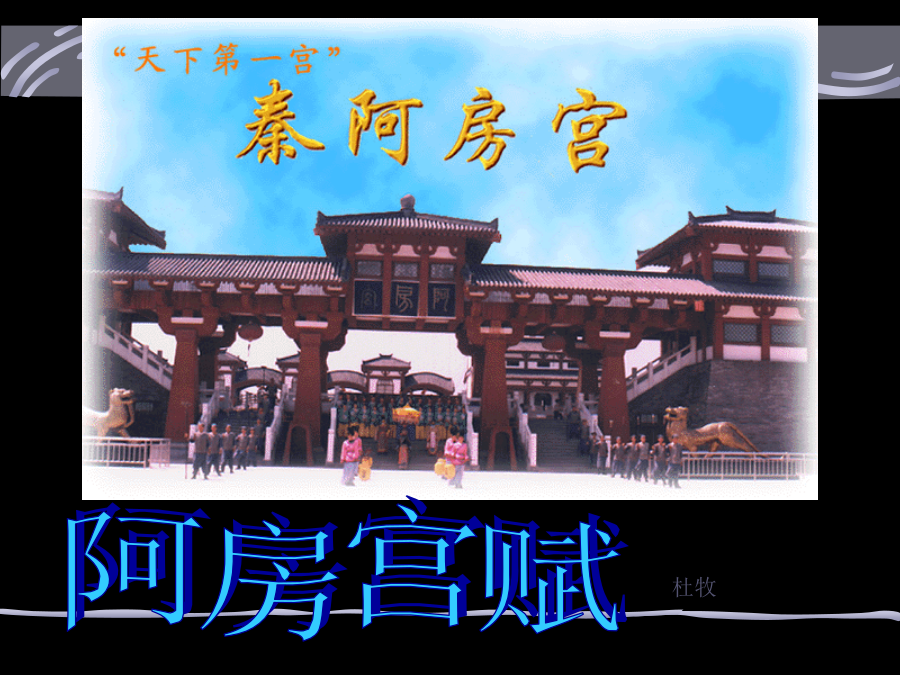 阿房宫赋 1、阿房宫: 秦始皇在渭南营造的宫殿,始建于秦始皇三十五年,动工不到两年,秦始皇死,秦二世胡亥继续修建,还未完成,即于公元前206年被项羽烧毁。(一)解题: “阿房宫”的“阿房”旧读“ēpáng”,阿房是地名或山名,遗址在今陕西西安市的西南。 这篇文章的体裁是“赋”。“赋”作为一种文体有一个演变的过程。赋体以楚辞为起源,至荀况始有定名。它出现于战国后期,到了汉代才形成确定的体制,这是赋的渊源。赋体的流变大致经历了骚赋、汉赋、骈赋、律赋、文赋各个阶段。 关于赋的特点,《文心雕龙·诠赋》说:“赋者,铺也;铺采摛(chī)文,体物写志也。”杜牧(公元803—852),晚唐诗人。字牧之,唐京兆(现西安市)人。晚年居住在长安城南樊川别墅,后世因此称“杜樊川”。从小有文才,唐文宗大和二年进士,历任监察御史、司勋员外郎、中书舍人以及黄州、池州、睦州、湖州等地刺史。杜牧有政治理想,但由于秉性刚直,屡受排挤,一生仕途不得志,因而晚年纵情声色,过着放荡不羁的生活。杜牧的诗、赋、古文都负盛名,而以诗的成就最大,与李商隐齐名,世称“小李杜”。其诗风格清新,意境深远,独树一帜,和王维一样,也是“诗中有画,画中有诗”。尤其擅长于写七言律诗和绝句。作品有《樊川文集》。从这几首诗歌中我们约略可以知道:杜牧善于将个人对国家和民族命运的关切熔铸于诗情画意之中。他的诗歌作品与晚唐气象紧密结合,同样也体现了诗歌的现实主义传统精神。生字词:细致读文三是写阿房宫珍宝之宫。三是写阿房宫珍宝之宫。嗟乎!一人之心,千万人之心也。秦爱纷奢,人亦念其家。奈何取之尽锱铢,用之如泥沙?使负栋之柱,多于南亩之农夫;架梁之椽,多于机上之工女;钉头磷磷,多于在庾之粟粒;瓦缝参差,多于周身之帛缕;直栏横槛,多于九土之城郭;管弦呕哑,多于市人之言语。使天下之人,不敢言而敢怒。独夫之心,日益骄固。戍卒叫,函谷举,楚人一炬,可怜焦土。使负栋之柱,多于南亩之农夫;架梁之椽,多于机上之工女;钉头磷磷,多于在庾之粟粒;瓦缝参差,多于周身之帛缕;直栏横槛,多于九土之城郭;管弦呕哑,多于市人之言语。使负栋之柱,多于南亩之农夫;架梁之椽,多于机上之工女;钉头磷磷,多于在庾之粟粒;瓦缝参差,多于周身之帛缕;直栏横槛,多于九土之城郭;管弦呕哑,多于市人之言语。 明星荧荧,开妆镜也;绿云扰扰,梳晓鬟也;渭流涨腻,弃脂水也;烟斜雾横,焚椒兰也。雷霆乍惊,宫车过也;辘辘远听,杳不知其所之也。明星荧荧,开妆镜也;绿云扰扰,梳晓鬟也;渭流涨腻,弃脂水也;烟斜雾横,焚椒兰也。雷霆乍惊,宫车过也;辘辘远听,杳不知其所之也。嗟乎!一人之心,千万人之心也。秦爱纷奢,人亦念其家。奈何取之尽锱铢,用之如泥沙?使负栋之柱,多于南亩之农夫;架梁之椽,多于机上之工女;钉头磷磷,多于在庾之粟粒;瓦缝参差,多于周身之帛缕;直栏横槛,多于九土之城郭;管弦呕哑,多于市人之言语。使天下之人,不敢言而敢怒。独夫之心,日益骄固。戍卒叫,函谷举,楚人一炬,可怜焦土。呜呼!灭六国者六国也,非秦也;族秦者秦也,非天下也。嗟夫!使六国各爱其人,则足以拒秦;使秦复爱六国之人,则递三世可至万世而为君,谁得而族灭也?秦人不暇自哀,而后人①哀之;后人②哀之而不鉴之,亦使后人③而复哀后人④也。呜呼!灭六国者六国也,非秦也;族秦者秦也,非天下也。嗟夫!使六国各爱其人,则足以拒秦;使秦复爱六国之人,则递三世可至万世而为君,谁得而族灭也?秦人不暇自哀,而后人①哀之;后人②哀之而不鉴之,亦使后人③而复哀后人④也。总结全文阿房宫赋 《过秦论》和《阿房宫赋》,前后时隔千年有余,然而同中有异,流传千古,同为文 苑奇葩。请指出二者的“同”与“异”。相同:第一,写作目的相同。西汉初期,经济凋敝,人口减少,贾谊其《过秦论》的目的即是借说秦之过而劝汉文帝“安民”。杜牧《阿房宫赋》一文同样是为了以古鉴今,针砭时政。第二,灭亡原因相同。贾谊将秦灭亡的原因概括为“仁义不施而攻守之势异也”。杜牧在文末也说:“嗟夫!使六国各爱其人,则足以拒秦;使秦复爱六国之人,则递三世可至万世而为君,谁得而族灭也?”“施仁义”和“爱人”皆儒家一脉相承之观点。第三,全文结构相同。 《过秦论》全文5段,前4段叙史,概括了秦自孝公(公元前361年)崛起,到二世灭亡(公元前207年)的整个兴亡过程,末段议论,归纳出秦灭亡原因。《阿房宫赋》全文4段,前2段描写,详尽地描绘了阿房宫的雄伟壮观、美人珍宝之多和“秦爱纷奢”之状,末段发出感叹,总结秦灭亡的教训。两文都是前叙后论,篇末明旨。 第四,都用铺排渲染,语言整齐峻拔。两文都使用了夸张、比喻等修辞手法,既形象,又生动,给人以审美的愉悦。 不同 秦孝公之雄心“有席卷天下,包举宇内,囊括四海之意,并吞八荒之心”;叙九国之师攻秦“于是六国之士,有宁越……之属为之谋,齐明…
