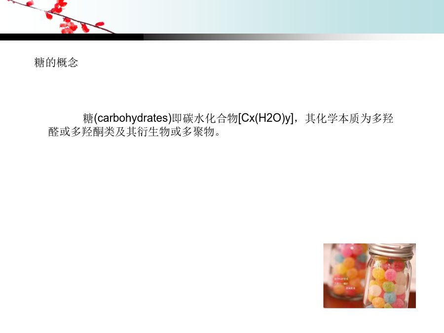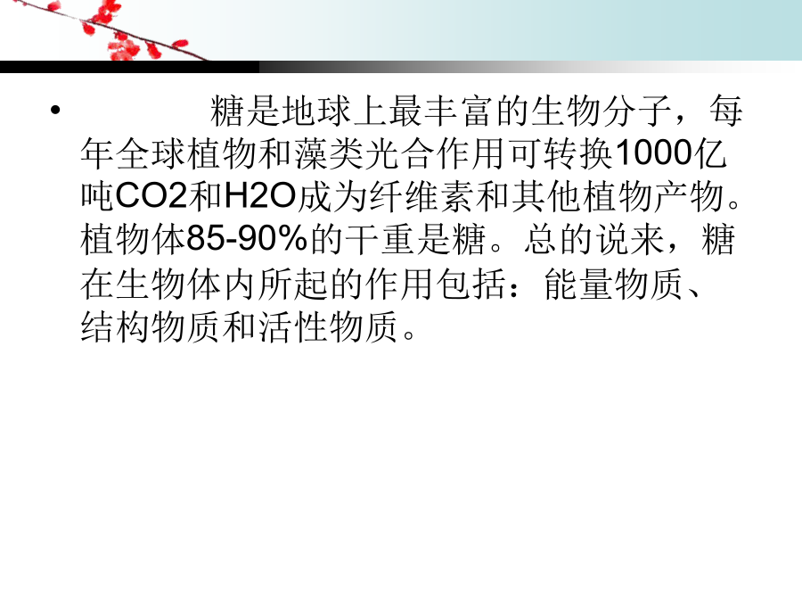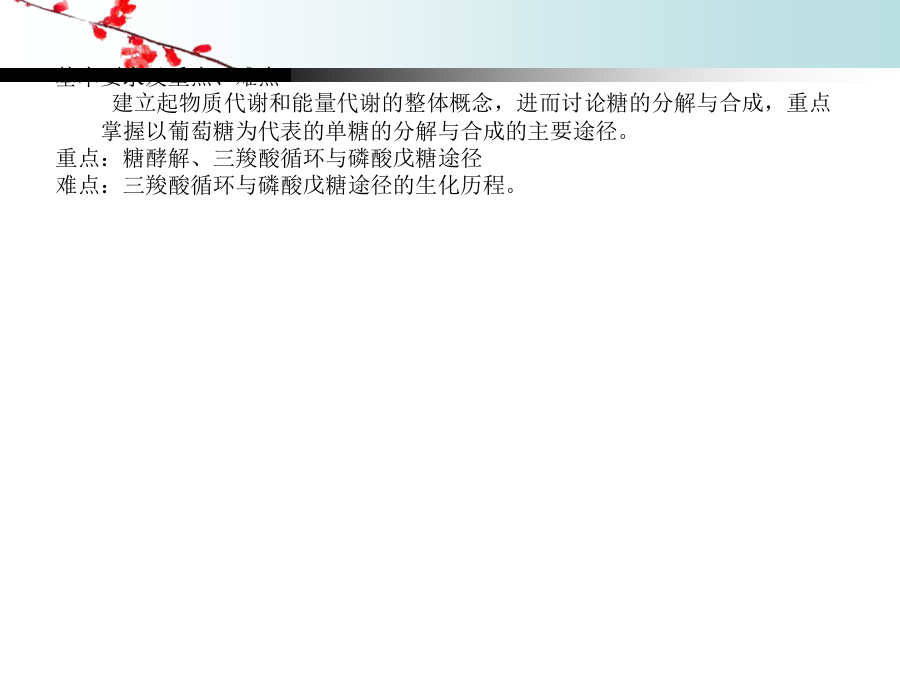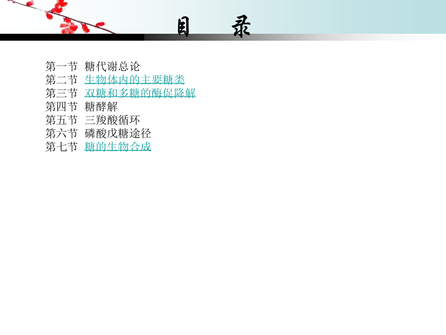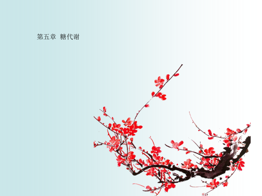 第五章糖代谢糖(carbohydrates)即碳水化合物[Cx(H2O)y],其化学本质为多羟醛或多羟酮类及其衍生物或多聚物。 糖是地球上最丰富的生物分子,每年全球植物和藻类光合作用可转换1000亿吨CO2和H2O成为纤维素和其他植物产物。植物体85-90%的干重是糖。总的说来,糖在生物体内所起的作用包括:能量物质、结构物质和活性物质。 基本要求及重点、难点 建立起物质代谢和能量代谢的整体概念,进而讨论糖的分解与合成,重点掌握以葡萄糖为代表的单糖的分解与合成的主要途径。 重点:糖酵解、三羧酸循环与磷酸戊糖途径 难点:三羧酸循环与磷酸戊糖途径的生化历程。目录新陈代谢与糖类的分解有密切的联系,因为糖类的分解对生物体来讲,具重要的意义。2.作为合成生物体内重要代谢物质的碳架和前体 葡萄糖、果糖等在降解过程中除了能提供大量能量外,其分解过程中还能形成许多中间产物或前体,生物细胞通过这些前体产物再去合成一系列其它重要的物质,包括: (1)乙酰辅酶A、氨基酸、核苷酸等,它们分别是合成脂肪、蛋白质和核酸等大分子物质的前体。 (2)生物体内许多重要的次生代谢物、抗性物质,如生物碱、黄酮类等物质,它们对提高植物的抗逆性起着重要的作用。3.细胞中结构物质 细胞中的结构物质如植物细胞壁等是由纤维素、半纤维素、果胶质等物质组成; 甲壳质或几丁质为N-乙酰葡萄糖胺的同聚物,是组成虾、蟹、昆虫等外骨骼的结构物质。这些物质都是由糖类转化物聚合而成。4.参与分子和细胞特异性识别 由寡糖或多糖组成的糖链常存在于细胞表面,形成糖脂和糖蛋白,参与分子或细胞间的特异性识别和结合,如抗体和抗原、激素和受体、病原体和宿主细胞、蛋白质和抑制剂等常通过糖链识别后再进行结合。第二节 生物体内的主要糖类糖的分类及其结构1单糖CHO | (CHOH)n | CH2OH 醛糖通式 单糖的构型以甘油醛为参照标准,甘油醛C2为手性碳,与其相连的-OH在右边的为右旋(D型)、在左边的为左旋(L型),D型和L型互为立体异构体,是一对对映体,具有对映体的结构又称手性结构。 单糖的构型由于手性碳往往不止一个,因而规定:离羰基最远的不对称C上的-OH方向判定糖的构型,在右边的为D型、在左边的为L型。悦瞳芝刊琢懒请彼店最催罚菌柴每要淘馆站源箕糯那同任槛安粮蜂微紫宿chapt5chapt5A、一些重要单糖的结构四 碳 糖五 碳 糖葡萄糖(glucose) ——已醛糖葡萄糖和果糖在溶液中的主要形式并不是开链式结构,而是环式结构。因为,一般说来,醛会和醇反应形成半缩醛,因此葡萄糖中的C1的醛基与C5的羟基反应,形成分子内的半缩醛,形成的糖环称为吡喃糖,因为它与吡喃相似。 D-吡喃葡萄糖α-D-吡喃葡萄糖 (开链式)(环式)同样,酮也能与醇反应形成半缩酮。果糖分子上的C2酮基与C5羟基反应,形成分子 内的半缩酮。形成的糖环称为呋喃糖,因为它与呋喃相似。α-D-呋喃果糖(开环式)2.寡糖麦芽糖α-葡萄糖(1→2)β-果糖苷乳糖(半乳糖--1,4-葡萄糖)棉子糖(Raffinose)是自然界中最知名的一种三糖,由半乳糖、果糖和葡萄糖结合而成,在大部分的植物中都存在。棉子糖能顺利地通过胃和肠道而不被吸收。环糊精(Cyclodextrin,简称CD)是直链淀粉在由芽孢杆菌产生的环糊精葡萄糖基转移酶作用下生成的一系列环状低聚糖的总称,通常含有6~12个D-吡喃葡萄糖单元。3.多糖 能水解生成多个分子单糖的糖。是由20个到上万个单糖组成的大分子。①淀粉是植物中养分的储存形式淀粉支链淀粉中除有α-1,4-糖苷键外,还有α-1,6-糖苷键,大约每间隔30个α-1,4-糖苷键就有一个α-1,6-糖苷键支链淀粉含有大约1300个葡萄糖基,有50个以上支链,每一个支链由24~30个葡萄糖基通过α-1,4-糖苷键连接起来。②糖原是动物体内葡萄糖的储存形式,是人和动物体内的储藏多糖。它的结构类似于淀粉,只是分支程度更高,大约每10个α-1,4-糖苷键就有一个α-1,6-糖苷键。糖原大量存在于肌肉和肝脏中。③纤维素作为植物的骨架 是植物组织中主要的多糖,也是生物圈中最丰富的有机化合物,它占所有的有机碳一半以上。纤维素是由大约上千个葡萄糖通过β-1,4-糖苷键连接组成的不分支的葡聚糖。纤维素③纤维素作为植物的骨架4.结合糖 糖与非糖物质的结合物。细胞膜表面的糖链第三节 双糖和多糖的酶促降解3.1双糖的酶促降解淀粉分解有两条途径:3.2.1淀粉的水解酶其产物为: 若直链淀粉→葡萄糖+麦芽糖 若支链淀粉→葡萄糖+麦芽糖+糊精也水解a-1,4-糖苷键,但须从淀粉分子外围非还原末端开始切,每次切下两个葡萄糖基。又称为外切淀粉酶。要需说明的是:α-淀粉酶和β-淀粉酶中的α和β并不是指其作用的α-或β-糖苷键,而只是表明对淀粉