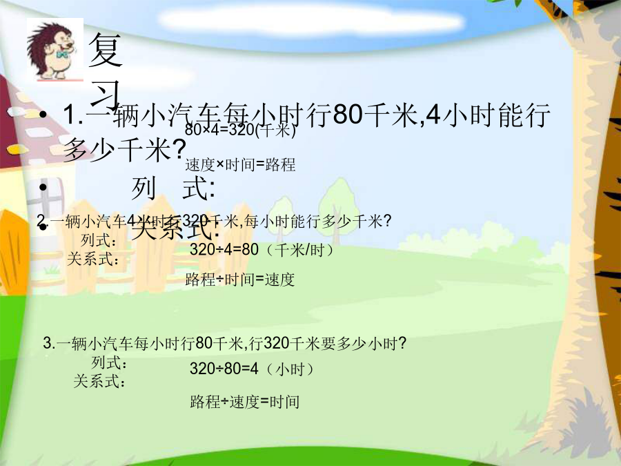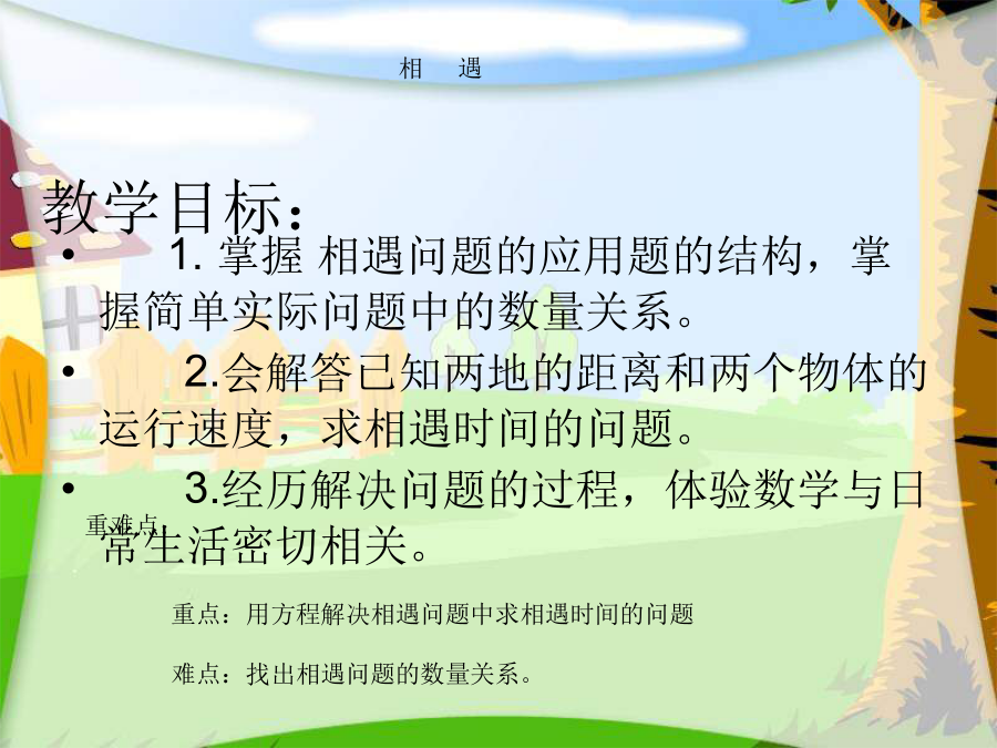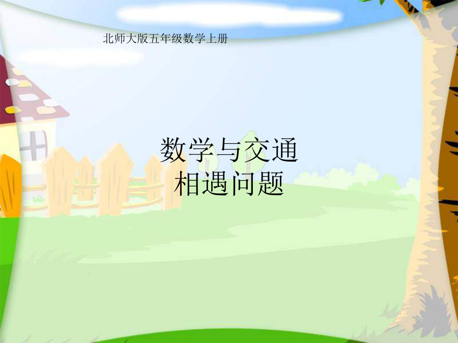数学与交通相遇问题教学目标:速度×时间=路程 路程÷时间=速度 路程÷速度=时间 复习关于相遇,你是怎么理解的?张叔叔要给王阿姨送一份材料。两人约定同时坐车出发。如图,遗址公园距天桥50千米。出发后几时相遇?相遇地点到遗址公园的路程是多少千米?面包车的路程+小轿车的路程=总路程方法一:小结:40x+60x=50方法二:同学们,看谁做得又对又快!努力吧!修一条长70米的水渠,由甲乙两个工程队从两端同时开工。甲队每天修8米,乙队每天修6米。修完这条水渠需要多少天?拓展练习