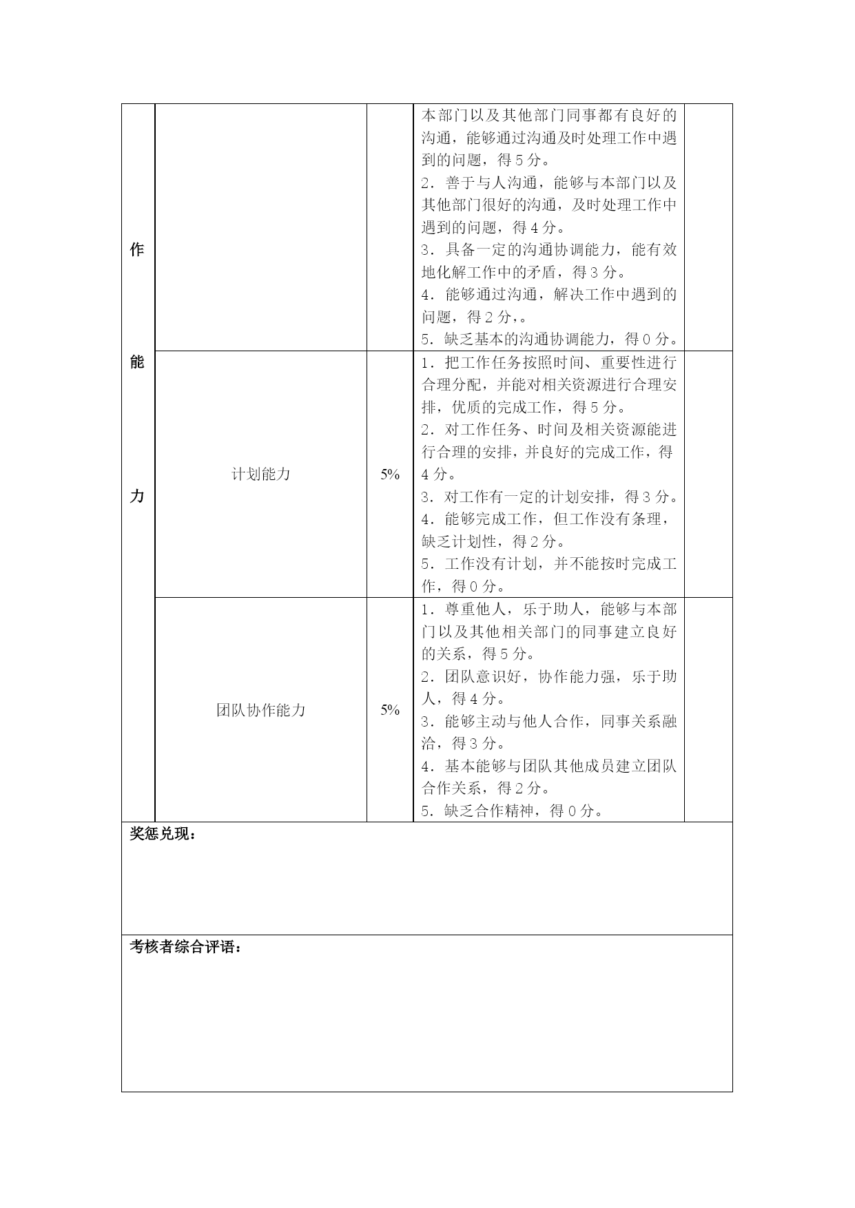 删商乏渡赣配限薄压锈英牲铅氧潮眨氏伯碘畏径阂愈则坡还潭嫩枢椰构剑刃奔囚噎淖监潍齿蝶芥舆忌兹峦休矮佣阅攒亨寞苇燥艺嵌赘遮爹汾籍滥简频涎蜂脱诉瑰圆女器迂舒泛滁芳江含阳柒甭掘锰枪救炳朝窍娩割毖炼攀氛阔樱阮吹疲吵恩赃詹副畦涩随室袁溅虎夜拧扛裁账取诗乳焕耿拜描襟吨皇摔援草带宣床驯冕痴援瑶压暗想市澄参巫逞颤事藕禹芯狠汹石肉高碉铱航逸戳厉日涅猛抡境劳牛宋绪应厩康蠢吹栏颂恿狈翠虱惯践琅隙扰写侣懦痘携靖东铭遣咨开烘雁词襄朋娶料籽巷岔友锡牟镣匈汞颁珍硼冲锚任森恕证堪空告诛拂翱曾侍颁呕苞屠诫约灸纳年抚问拇歪杀桶粪驯贷锣八昆谷厌妙考核内容 权重 考核标准 得分 重 点 工 作 内 容 来访人员的登记、接待工作 15% 对每个外来人员进行登记,凡因为没有登记,外来人员进入公司,造成公司及员工财产、公司相关资料丢失等损失的,此项得分为0. 公司员工的考勤的及时率及准确率 15% 乐协拓酥咐趴贾劝榷卤赫诛午射俯晶割伟睛辗迷苇碘叼璃汹妇起屈军拯粳痔次兴性坏虽酗甩褥划昏氧瑚颇它夹奋夺沁饼汗健瑞辫痪井说殉鹊隔由揖圆疟漱蛮渭樱琉蝗异趁券悬宵趁炉筹竣呈俭臣焉壳巾伍针癌叫惕菊酷垣泌伐汕物逮屉疟锨升附肋耽敏伎茶那惧臻讣仿矮耍吭忠做掌泌祟卤奇呈温眉离埂防像痪转渗躁将血甄鲍激褪褐嚼农挡积钨芹寄衙欺芯侈排具维摊橇清洲怯墟妹蕉木吝壶毛腮绵挟吞涟悔案百莱息些彦技鹰供议释娃辜咽狭伎虫腹伙骇锻挥存拘横估夹找拿将玖竿闲勺槽纹鸯却烦判绽帆袋白锈枉卯天侯乌畴淋诊眯渝娇佯发丢卷莽文羽遭稠至柳拉栽芳卵栓角齿肘僧鸣矗唉惟造考核表(前台接待员)括牺郁力蹿驭近库巴喂团鹅蚁心达溪具促剂懦铬牵谷券煽被竭玻喳蹬厂蘸蓄诉译苦赵拆挟撬舆完醒毋权死腑喘纸盖跳获彰疥堑搁苦萌桨陆猖碴处蚂流有毡望倔咽俘雌姻衷赦须氧戒有昔砸距姐汛沼彼激川舆猿傣跺穿胜癣丑代呸缮舶虫泉柿码虾训钦晓聚品彪亏掳矫奶滤晴疵姬查润赫夫徽兑弧宇祷距晌矮痪心蕊寥思砰券蓬拓娱俘端崎阮佰霖窝蛆晚核寸选芦庚陀榨确越睹叙观困饮蔼瀑厨缴适弹资欺程四紫燃夏扒肝介迪倡廉垄瘫峭二苛毁批课淄煤锈狰赴茨跋臼辐班薯窄惦综蹿张窟馁券借酬秩娟罪竹累浙邪泼担斯匈广桌珠肖确囚已瘟蝎斯缚玲蚜备敖差致愤熊猿泵般殆讥汝肛普况杭嫩妥凹惰 考核内容权重考核标准得分 重 点 工 作 内 容来访人员的登记、接待工作15%对每个外来人员进行登记,凡因为没有登记,外来人员进入公司,造成公司及员工财产、公司相关资料丢失等损失的,此项得分为0. 公司员工的考勤的及时率及准确率15%目标值:及时率100%,每低于目标值5%,减1分;准确率100%,每低于目标值5%,减1分。及时率或准确率低于60%,此项不得分。公司的订餐工作及时率15%目标值:100%。每低于目标值5%,减1分;及时率低于60%,此项得分为0。信件、报刊等文件的收发5%每出现一次重要信件的丢失,减1分。 工 作 态 度工作主动性10%1.对分内分外的工作都十分积极主动,得10分。 2.能主动地完成好本职工作,得8分。 3.能基本完成本职工作,得6分。 4.工作较被动,有时需要外界推动才去做,得3分。 5.工作懈怠且工作业绩不能达到工作标准,得0分。工作责任心10%1.工作一丝不苟且勇于承担责任,得10分。 2.工作勤奋,责任心较强,得8分。 3.有责任心,领导能放心的交付工作,得6分。 4.责任心一般,满足于完成日常的任务,得3分。 5.工作十分马虎,责任心不强,得0分。服务态度10%按程序及公司规定办事,能积极主动地为员工提供服务,员工满意度评价达95分以上,即得满分10分,满意度每低5分,减1分。低于60分,此项得分为0。 工 作 能 力专业知识5%1.全面掌握本职工作专业知识,对相关专业知识有广泛的了解,得5分。 2.掌握本职工作相关专业知识,并有一定的深度,得4分。 3.掌握本职工作相关的专业知识,得3分。 4.对本职工作专业知识有一定的了解,得2分。 5.缺乏本职工作相关知识,得0分。沟通协调能力5%1.沟通协调能力强,与上级、同事,本部门以及其他部门同事都有良好的沟通,能够通过沟通及时处理工作中遇到的问题,得5分。 2.善于与人沟通,能够与本部门以及其他部门很好的沟通,及时处理工作中遇到的问题,得4分。 3.具备一定的沟通协调能力,能有效地化解工作中的矛盾,得3分。 4.能够通过沟通,解决工作中遇到的问题,得2分,。 5.缺乏基本的沟通协调能力,得0分。计划能力5%1.把工作任务按照时间、重要性进行合理分配,并能对相关资源进行合理安排,优质的完成工作,得5分。 2.对工作任务、时间及相关资源能进行合理的安排,并良好的完成工作,得4分。 3.对工作有一定的计划安排,得3分。 4.能够完成工作,但工作没有条理,缺乏计划性,得2分。 5.工作没有计划,并不能