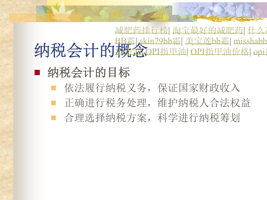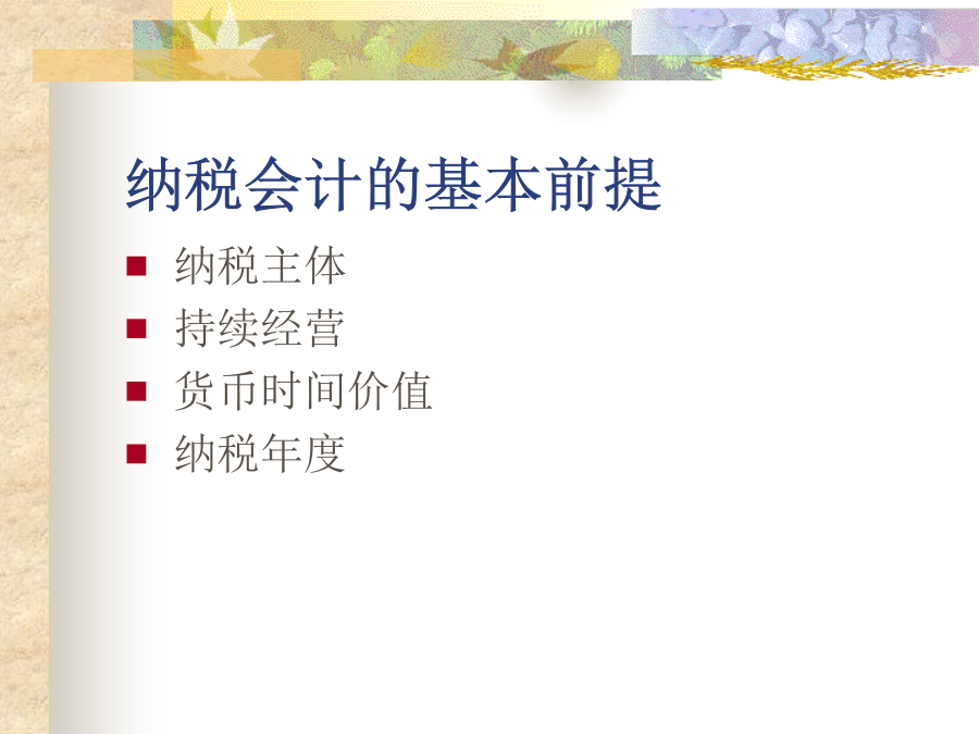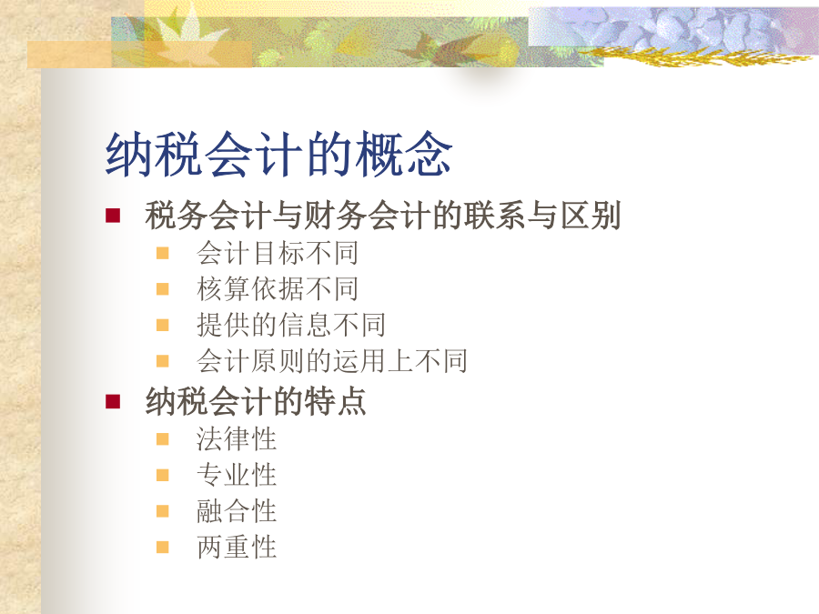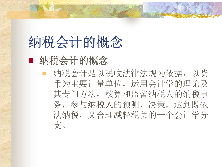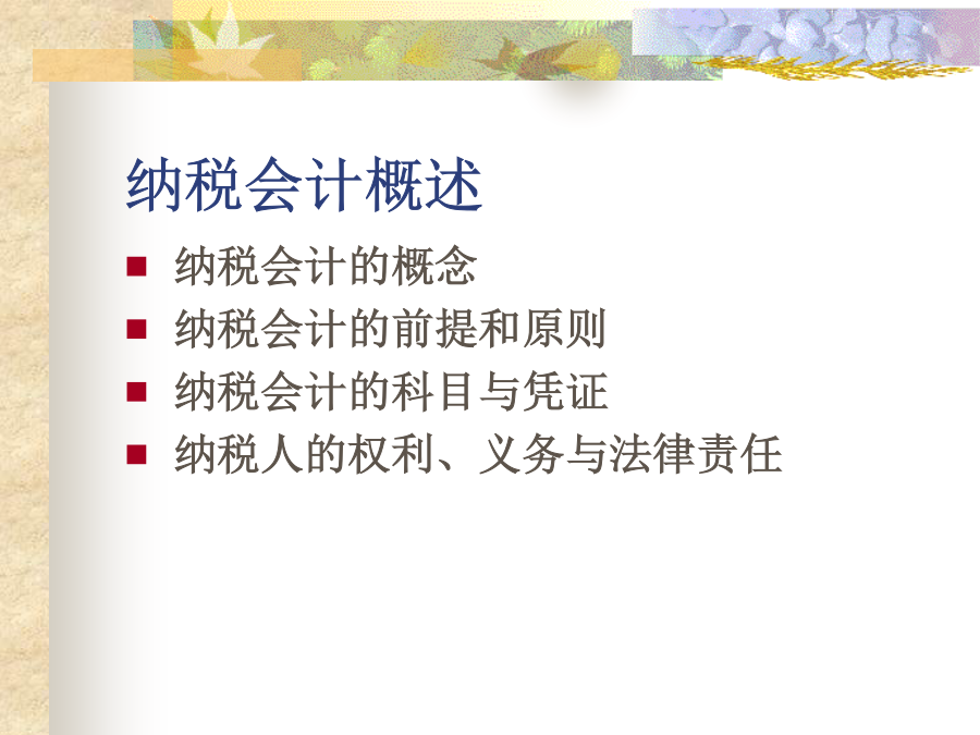 纳税会计概述纳税会计的概念纳税会计的概念纳税会计的概念纳税会计的基本前提纳税会计的原则纳税会计的科目设置纳税会计凭证纳税人的权利、义务与法律责任