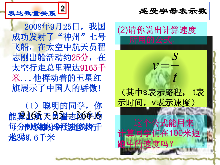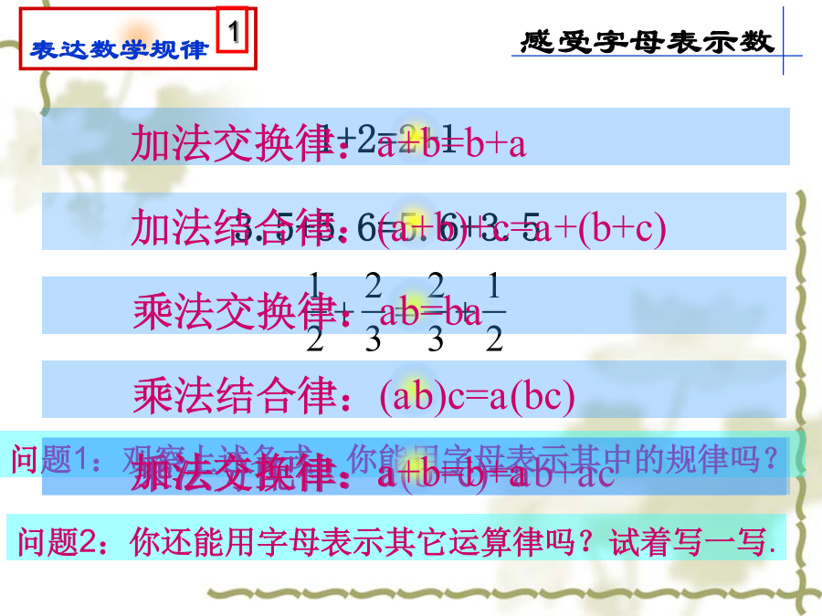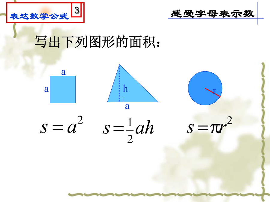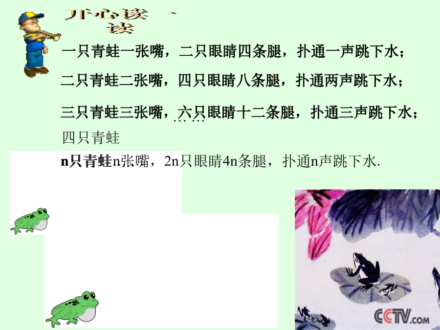 课改一只青蛙一张嘴,二只眼睛四条腿,扑通一声跳下水;2008年9月25日,我国成功发射了“神州”七号飞船,在太空中航天员翟志刚出舱活动约25分,在太空行走总里程达9165千米...他挥动着的五星红旗展示了中国人的骄傲! 1.(1)若每只青蛙每天能吃害虫x只,那么 5只青蛙每天能吃害虫只. (2)若青蛙爸爸每天捕捉害虫70只,小青 蛙每天捕捉害虫n只,它俩每天一共 捕捉害虫只;m天里青蛙爸 爸比小青蛙多捕捉害虫只. (1)已知如图1,有一个长方形草坪,它的边长分别为a和b,顺次连结四条边的中点围成的区域建为花池,你能用字母表示剩余草坪的面积吗?3.国庆期间,某景点花盆摆放的图案,如下图所示,请你仔细观察花盆摆放的规律,可得: 谈谈这节课你的收获!课改必做题:书本P142习题1~3.下面我们用小棒拼正方形的例子来更深刻的理解用字母表示的道理和奥妙。1234如果要搭200个这样的正方形, 需要多少根小棒呢?一、活动目的:用字母代表数,将学过的一些 数学事实(数学结论)表示出来. 二、活动过程: (1)用文字写出所要表述的数学 事实. (2)用字母表示数的方法表示出 这个数学事实. (3)选出2-3个,准备给同学们 介绍一下. 三、活动纪录: