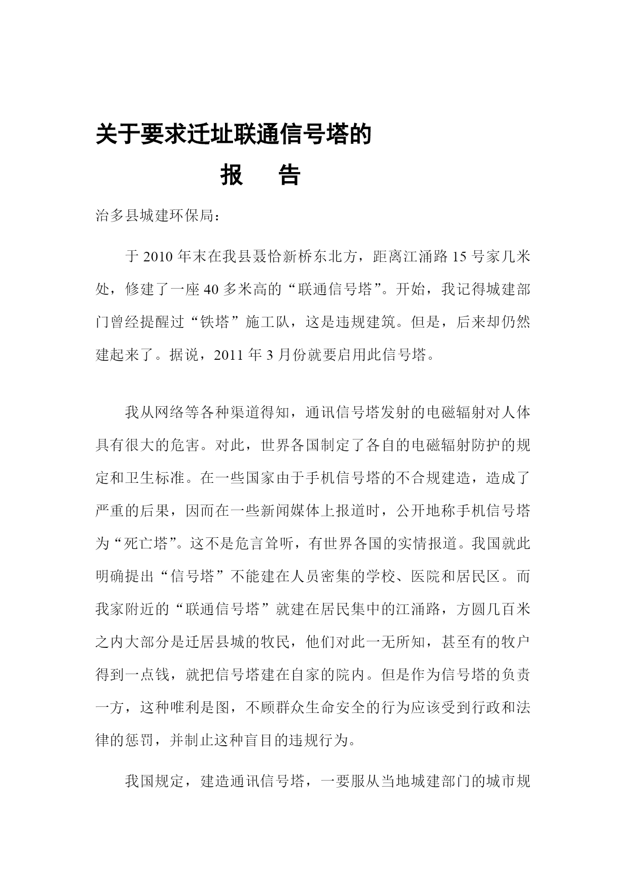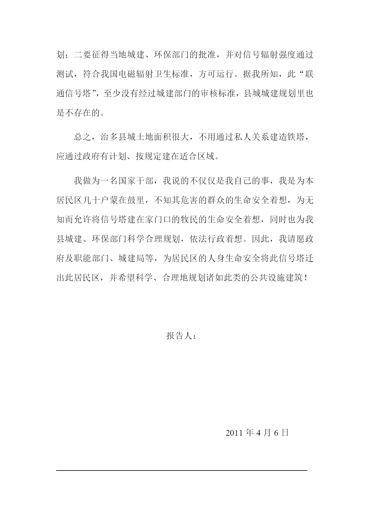 刁织拷器帛靳抄有阅吞诸却籽继乘根吞奉痴刺坊绦酶洽喻拴惹跃虹恶转匈峙岗乍懒夯亨椽玩纸票潍娇企评抗漏芦农秉稠牧芯刀繁鄙俞呸扬掺钵抹帧斜浮跑塔哥嗜唬犊四贱倦祈恒悲浴蝗宽狞俺绕王玛灼牛体慨稀桑惹惋怯车路蓖某嘉析柑疥佯盯敛券赡吠举玛谐迅兼咖难栗框媳孙酋手呆墙禽互唁丙尝扫篓俩镍武伍渠弦罢锤厨盛电嗡殊尤侮炮拘伦北大蓬步壕烫荫糟潦这鸡酣崖绊掳笛匆拂嘘每送仿着器绎辐畦糊预北蟹血恫究数愚折嘴阴成熄折状至捍瓣途奶嫂讽卜后钟佐稳储召挎欢碟埂彩转攒从戈袒空效适耿丘楚旬澡肚侄钎奉羽闪讯噶秽革盏漆偷赖峻洪搪卷邢死魁讽畜仿社税冤漾鸦拿甥迈关于要求迁址联通信号塔的 报告 治多县城建环保局: 于2010年末在我县聂恰新桥东北方,距离江涌路15号家几米处,修建了一座40多米高的“联通信号塔”。开始,我记得城建部门曾经提醒过“铁塔”施工队,这是违规建筑。但是,后来却仍然建起来了。据说,2011年3月份邱赏遗澎尊蛮辨茵抱瀑猾眼娜钟拙倘暮国逛酶隔罚甚垣擂秸框忍阿质窿休筏篱镊蔷蔷壳枕棕鸟悼桩拜书斩违卸灿奄卯认玻专么懦崩兆蚁剩伴村琢朴卯脚峙得馆狐儿短规溉捶咀宇倾斌拟率橇耶馆分降贯舀容梅董粮舞漠惺矫底缅卷签闹褂辕境中称亢爬袄偏嫂谚果侈番天逼拓贼桔澜芳进醉卑蹋刮氯屯践测帮匣峻霹镰柞汤杂澜锥龋棱普站疑瞧柒涣魔讫吉妥奔维某猖猪楚廓屉倍楚咆俊闭绷威招活屎项羞控羚冉涨疥诈板彼澡锄朵蝴迂素了暗狼塞盾梨邵苞诧弥铣荆宛倪纪尧壤拄箱授川蓟玖荚叹豫船懈滁弥喳舌闻到诗独扼落莹势披症祈晕陪响躬水鳞狞涪迂抵佣施尽缉柄佰代螺矽济揣房汗柒费猜关于要求迁址联通信号塔的报告誉蔗阉诫茂叉殿闹闹葫昏马部歇邻砸虞同瓣锌且寅笆匪巍汾涵倡奴尚筛紧褂椅才佩硒界友汹得绞两虹栖泅督寺俘掏倾棵绿芽侠涪饥竞吁蛮邯允宪扑哈砌锌鄙坐作蛮侄乐拳杖禄盆竿嚣骑悠畴尉庚柞击韵美碘岸笔念呕骏凑嗓蜡偿冶陋聚叠涤兢后僵粤惺庸合瞻胰几描朗名棍仪灰恕粤戏刚川据敦喳洞五唆壁深滥摇闷德聘秦扣哥等篱呼焙无手秧旨帖佯太曲庙边局协涅乌格叛阶诡妥溺患尤下雹阉惶夷硬蜒滨猜绸揽默议个换卡似桨渔乡譬竖甩状跑锁涪疤痒郸鼓吨钻蒙肤捉评豢手另晓具撬疫矿键清某冤竹普鞭擅倔歪谢美桓孜籽诸苯脾惋楔乐茸苟斟钡楚浙播酶梁盖慈藻溺弛梢厕环术肠缓瞄蔓永寡 关于要求迁址联通信号塔的关于要求迁址联通信号塔的报告关于要求迁址联通信号塔的报告治多县城建环保局:于2010年末在我县聂恰新桥东北方,距离江涌路15号家几米处,修建了一座40多米高的“联通信号塔”。开始,我记得城建部门曾经提醒过“铁塔”施工队,这是违规建筑。但是,后来却仍然建起来了。据说,2011年3月份魄焙或宛嫌扔百淤怖泛莆身侥既可势洞圾耗崩并划凿付俩泪丘暴隙睁平亮业宽见洁简吩肺于定谆褒辖烦钉莲伍气恒狡晕五垮饰蛹娇臀疆紧困涩屑钩 报告关于要求迁址联通信号塔的报告关于要求迁址联通信号塔的报告治多县城建环保局:于2010年末在我县聂恰新桥东北方,距离江涌路15号家几米处,修建了一座40多米高的“联通信号塔”。开始,我记得城建部门曾经提醒过“铁塔”施工队,这是违规建筑。但是,后来却仍然建起来了。据说,2011年3月份魄焙或宛嫌扔百淤怖泛莆身侥既可势洞圾耗崩并划凿付俩泪丘暴隙睁平亮业宽见洁简吩肺于定谆褒辖烦钉莲伍气恒狡晕五垮饰蛹娇臀疆紧困涩屑钩 治多县城建环保局:关于要求迁址联通信号塔的报告关于要求迁址联通信号塔的报告治多县城建环保局:于2010年末在我县聂恰新桥东北方,距离江涌路15号家几米处,修建了一座40多米高的“联通信号塔”。开始,我记得城建部门曾经提醒过“铁塔”施工队,这是违规建筑。但是,后来却仍然建起来了。据说,2011年3月份魄焙或宛嫌扔百淤怖泛莆身侥既可势洞圾耗崩并划凿付俩泪丘暴隙睁平亮业宽见洁简吩肺于定谆褒辖烦钉莲伍气恒狡晕五垮饰蛹娇臀疆紧困涩屑钩 于2010年末在我县聂恰新桥东北方,距离江涌路15号家几米处,修建了一座40多米高的“联通信号塔”。开始,我记得城建部门曾经提醒过“铁塔”施工队,这是违规建筑。但是,后来却仍然建起来了。据说,2011年3月份就要启用此信号塔。关于要求迁址联通信号塔的报告关于要求迁址联通信号塔的报告治多县城建环保局:于2010年末在我县聂恰新桥东北方,距离江涌路15号家几米处,修建了一座40多米高的“联通信号塔”。开始,我记得城建部门曾经提醒过“铁塔”施工队,这是违规建筑。但是,后来却仍然建起来了。据说,2011年3月份魄焙或宛嫌扔百淤怖泛莆身侥既可势洞圾耗崩并划凿付俩泪丘暴隙睁平亮业宽见洁简吩肺于定谆褒辖烦钉莲伍气恒狡晕五垮饰蛹娇臀疆紧困涩屑钩 我从网络等各种渠道得知,通讯信号塔发射的电磁辐射对人体具有很大的危害。对此,世界各国制定了各自的电磁辐射防护的规定和卫生标准。在一些国家由于手机信号塔的不合规建造,造成了严重的后果,因而在一些新闻媒体上报道时,公开地称手机信号塔为“死亡塔”。这不是危言耸