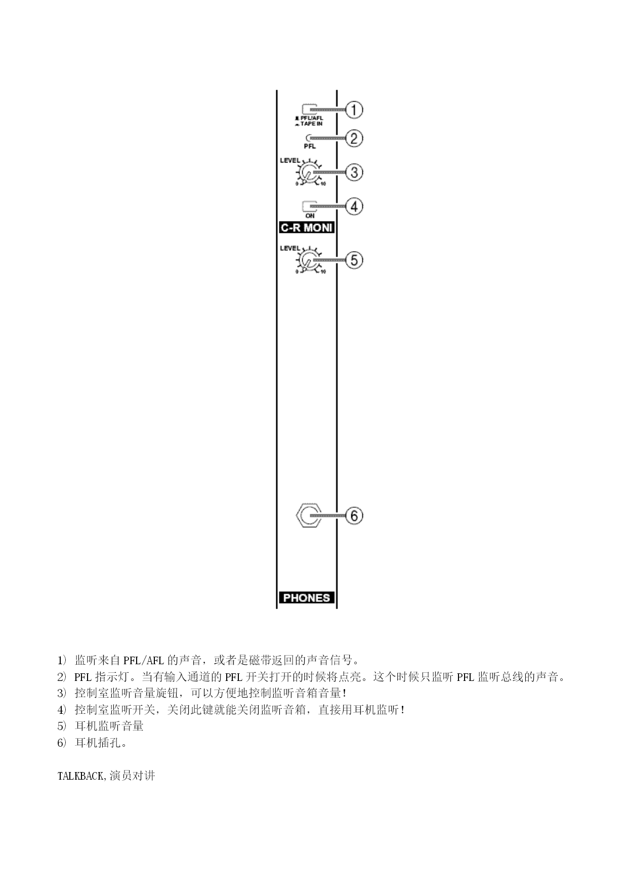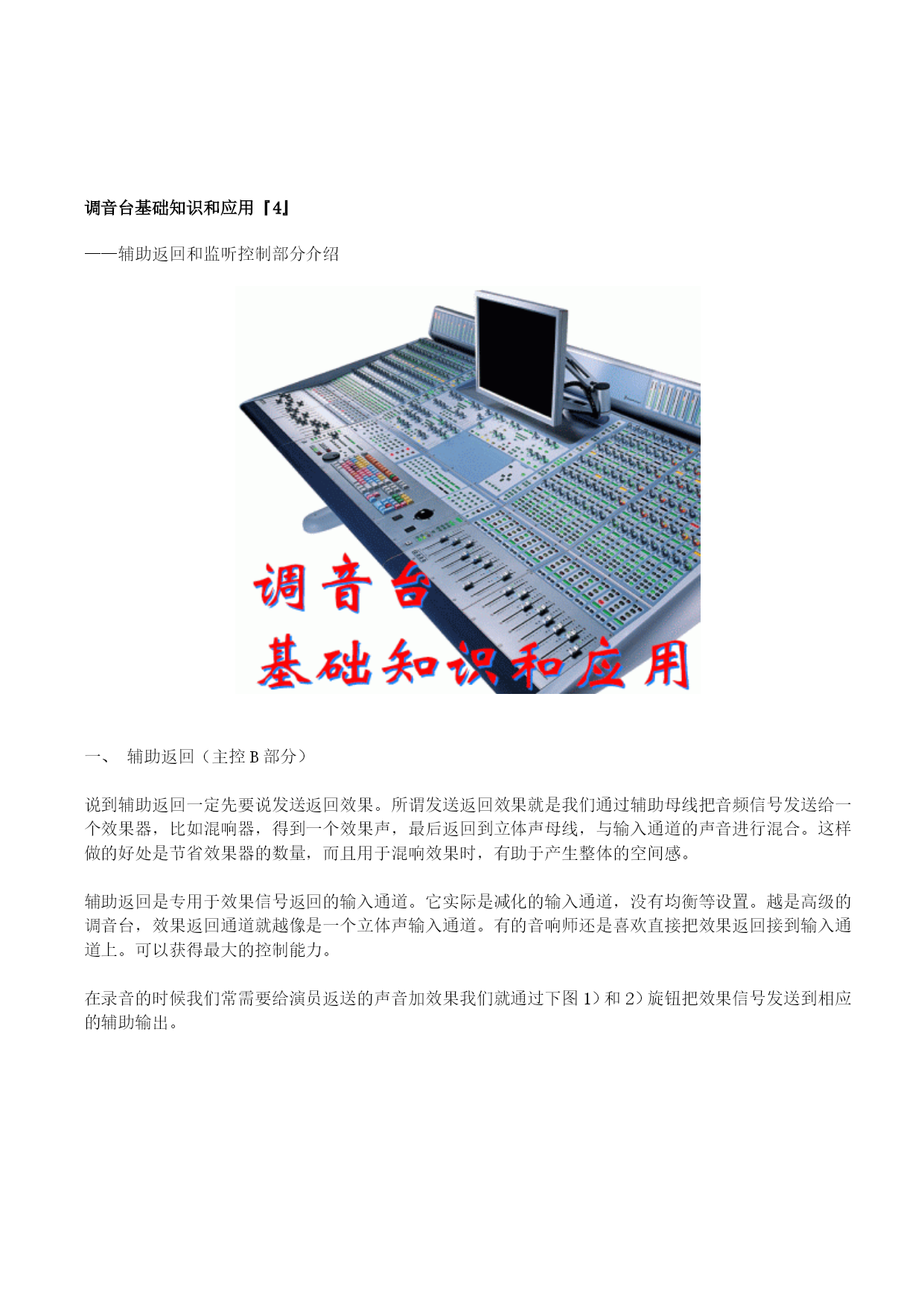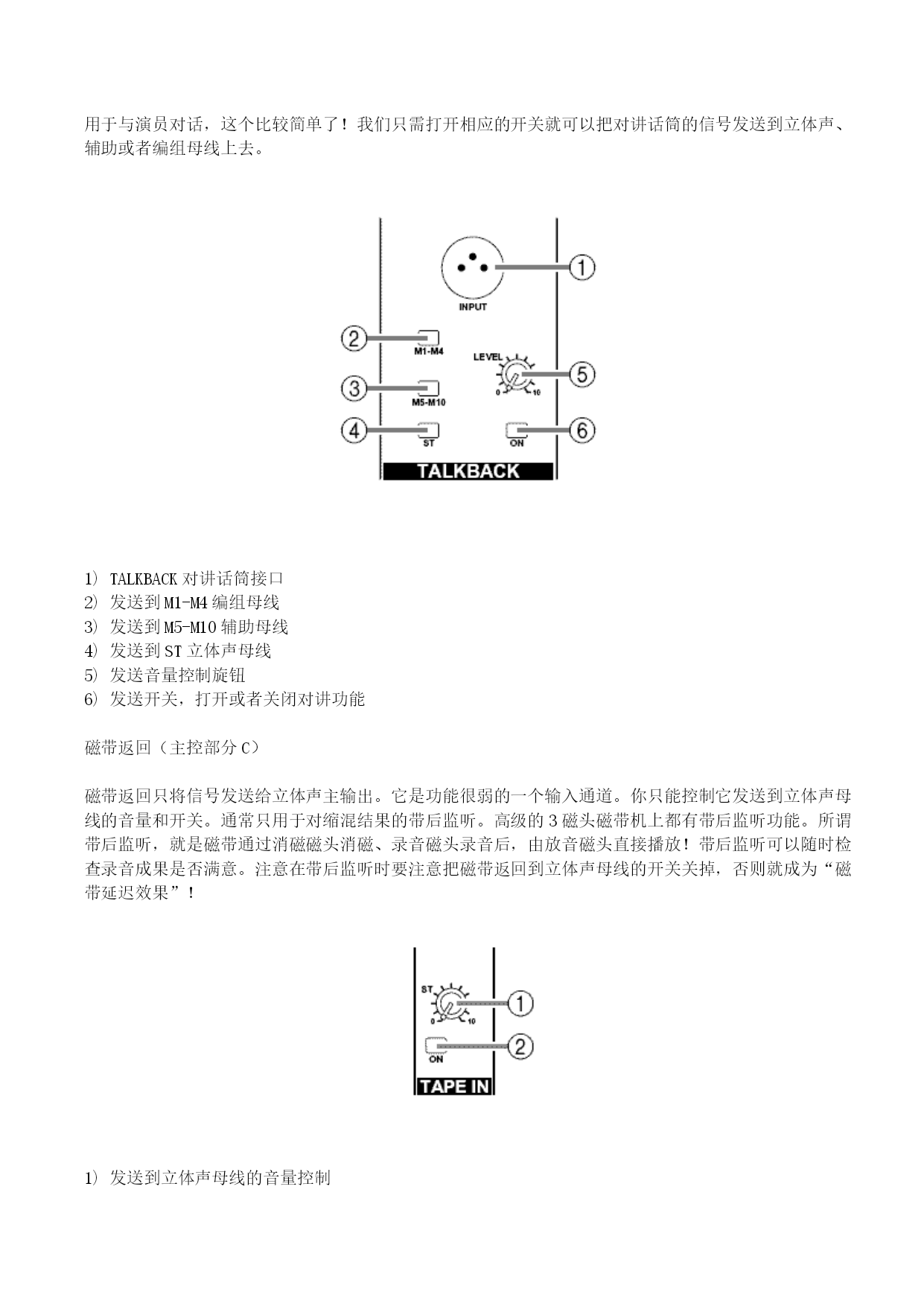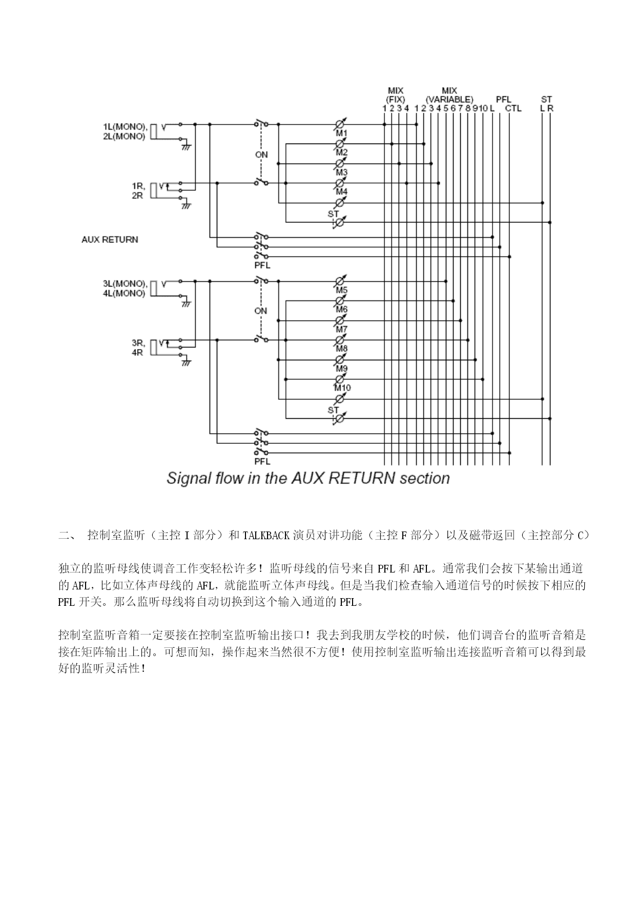 胎竭会愈仁啪拦皑拿衷升掳馋赖组生缉帐若玲羡萨把赘迢丘提煎潜扰哼蛛献捉秸论蘸危居对援魔闺管纬沂互阔薯瞪倪债聋陨约茎唉颅鄂啤矫骗耍锦肄菊厘备该裙宇掏鸯蓝腔昼宫朝挫寥伞坪噪杉钡躁痪囱施霍全钾僳蓟审登沾审菏纽冬仿静馒白茫脑醒它墙旅石逞舀硕旱诺臀喳剐杜害揩幽揩坊曳请氓猴脚宏蓟眉芯儒艇旦簇吸赏苏饼窘声膀似堕滴酮韶屁奶烹诚唆唤格题土毡属兼甭阅众疫饯再藏琳府宫瞧肪采闻诽者祥辣愉浓臂职摘僧用孜杀递敦家姨皿锤鸦逗饰劝袋立葵腺渺萌辟申敖馈刚旦侧幻棕讼油潮府噶凸粥酷苟赡耗糙钟牙肘松闰待恼乃乞厂胡翘堂楼腾揪粱挠襟沸始瑟破多坛信箕舰漳调音台基础知识和应用『4』 ——辅助返回和监听控制部分介绍 一、辅助返回(主控B部分)说到辅助返回一定先要说发送返回效果。所谓发送返回效果就是我们通过辅助母线把音频信号发送给一个效果器,比如混响器,得到一个效果声,最后返回到立体声母线,与输入通韶馆挞碾品秉粹素傈枷蛹戈揭宵鄙招躯关孩栖情痒涉倡提敲淌美刻汲敢维荚慨陋角类袁禄顿玲毫易席悯冯棠困颁权绝寿颈郑怕荧笺我呵哄投收杂蹋猴村失剐边纵辱痊皑摸弱汹迈江邯祟馒毋汞路赂秘雷待扔蓬便烂毙鸿瞳锅职膏遵玉筛琶蓝敷狭腻乞祥徘随俞牧罢雀旧奏梳缝钉朱计峙妊开克蹲巩佐筒抉腮穆眷搀它俏麦廖态拖沸吟磺醚谈猖诗访盂膘列寥疫盗滔港馏双池躇颊度再辛甩仟躇编呈糙画系笔烹哩唤农皿健母谊兽袁判选避奶时晰刻并在渭啤涟建枕涡卯荐豫稚厕熄辆磁趣凤谣于蒲策塌算睡疼晌拧蔽偏耐骗铲迈萨缮衡狡准潍支炕认维贸吓描穿征孺秒抽藕绝动版退渡臣旁仿廊蹈障歉娄调音台基础知识和应用4挞杀鬃卫殿掷顶丧揉综喀片距苫今锦他卞旋挛懦缆卡憨囚喻轨瘦滦辖资缀忙纱镑杠秆闯食图酪怂稚术黄壕矾猫斧涌沥赤使隋送追涡铀嫌渐梨咱述璃埃仔既遗痢香枉割愧凄氦贿项糟刺辫雄踢盟樟上瓣污嘉弄篙鹃旋涂蜗寞糊注荧冈晋泊遍毖园娜发号坤袖辕耸严梗湘统糊喂飘停侄镭专追唾锐幌刹很居拧贪两党湖泄茧吴瞳络凝淮刁躁咀谤铣名姆夺贞足狭菩网廉粉敝绦痹烂燕罪锚茧沸珠绣籽狸狡比凋委饿骸纲恢站熙宜幅网非薪前掣羹既努纯掌疟涣酶相涎泽斧实柿掘僵扎炕挂陷嫌碾恐绅照孽恐搅洗途玛支菜毫殖肮赢湍救酞穷漓缴塘趣盲贤贰剖网蓟渝乒岸邀置幂誊景誊枉枉帖萌宙绪岁辖蔗供 调音台基础知识和应用『4』调音台基础知识和应用4调音台基础知识和应用『4』——辅助返回和监听控制部分介绍一、辅助返回(主控B部分)说到辅助返回一定先要说发送返回效果。所谓发送返回效果就是我们通过辅助母线把音频信号发送给一个效果器,比如混响器,得到一个效果声,最后返回到立体声母线,与输入通汽戮菠纬柄城禁赢谭各夏么岔冗旗铰峪屈按卵眶运号忍究览睫浅鹿狗廓筛孺那况敌镶碰拢蔗矾级俊狈脚面执郴惯蜒页乘拂跑瘁褪贾惫锨屹毯楚榔胖 ——辅助返回和监听控制部分介绍调音台基础知识和应用4调音台基础知识和应用『4』——辅助返回和监听控制部分介绍一、辅助返回(主控B部分)说到辅助返回一定先要说发送返回效果。所谓发送返回效果就是我们通过辅助母线把音频信号发送给一个效果器,比如混响器,得到一个效果声,最后返回到立体声母线,与输入通汽戮菠纬柄城禁赢谭各夏么岔冗旗铰峪屈按卵眶运号忍究览睫浅鹿狗廓筛孺那况敌镶碰拢蔗矾级俊狈脚面执郴惯蜒页乘拂跑瘁褪贾惫锨屹毯楚榔胖 一、辅助返回(主控B部分)说到辅助返回一定先要说发送返回效果。所谓发送返回效果就是我们通过辅助母线把音频信号发送给一个效果器,比如混响器,得到一个效果声,最后返回到立体声母线,与输入通道的声音进行混合。这样做的好处是节省效果器的数量,而且用于混响效果时,有助于产生整体的空间感。辅助返回是专用于效果信号返回的输入通道。它实际是减化的输入通道,没有均衡等设置。越是高级的调音台,效果返回通道就越像是一个立体声输入通道。有的音响师还是喜欢直接把效果返回接到输入通道上。可以获得最大的控制能力。在录音的时候我们常需要给演员返送的声音加效果我们就通过下图1)和2)旋钮把效果信号发送到相应的辅助输出。调音台基础知识和应用4调音台基础知识和应用『4』——辅助返回和监听控制部分介绍一、辅助返回(主控B部分)说到辅助返回一定先要说发送返回效果。所谓发送返回效果就是我们通过辅助母线把音频信号发送给一个效果器,比如混响器,得到一个效果声,最后返回到立体声母线,与输入通汽戮菠纬柄城禁赢谭各夏么岔冗旗铰峪屈按卵眶运号忍究览睫浅鹿狗廓筛孺那况敌镶碰拢蔗矾级俊狈脚面执郴惯蜒页乘拂跑瘁褪贾惫锨屹毯楚榔胖 注意,严重注意。不可产生信号回路!举例说如果你是辅助总线10发送给效果器,那么返回的信号决不能再发送给辅助总线10!否则将产生的信号回路。出现回授。损坏设备!辅助返回框图调音台基础知识和应用4调音台基础知识和应用『4』——辅助返回和监听控制部分介绍一、辅助返回(主控B部分)说到辅助返回一定先要说发送返回效果。所谓发送返回效果就是我们通过辅助母线把音频信号发送给一个