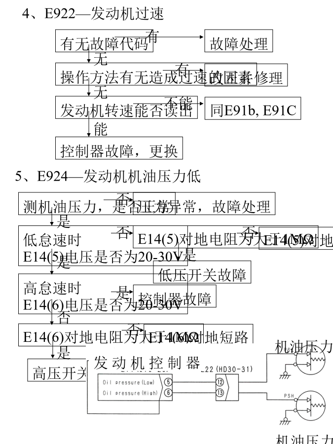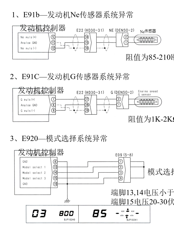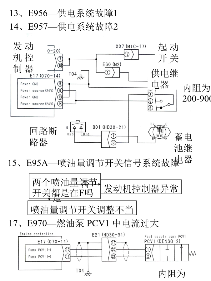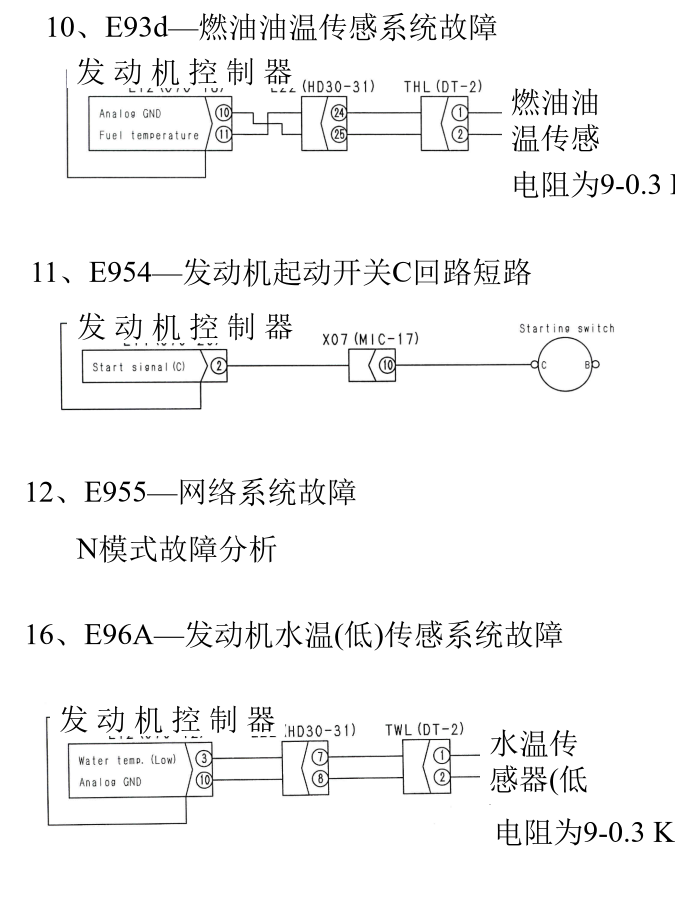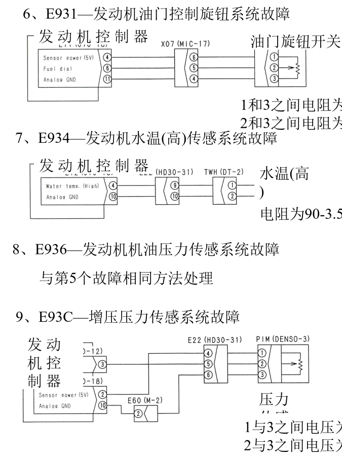 1、E91b—发动机Ne传感器系统异常4、E922—发动机过速6、E931—发动机油门控制旋钮系统故障10、E93d—燃油油温传感系统故障13、E956—供电系统故障118、E971—燃油泵PCV2中电流过大22、E979—燃油槽高压异常1 E97A—燃油槽高压异常2有无故障代码注1:如下检查,更换,清洗滤芯与粗滤器 1)滤网—分解检查,如有堵塞则清洗 2)粗滤器在滤网的上游,如果滤网堵塞了,则也要清洗粗滤器 3)如果上述二步没有解决问题,则更换滤芯 注2:如果低压回路装置有故障,检查下列要点 1)残存部分燃油 2)供油泵的粘接与磨损 3)低压油管的漏油与堵塞 4)旁通阀故障,装错 5)柴油进入油底盘(缸头内内漏)24、E97d—燃油槽压力异常28、E983—第3喷油嘴回路断线31、E986—第6喷油嘴回路断线