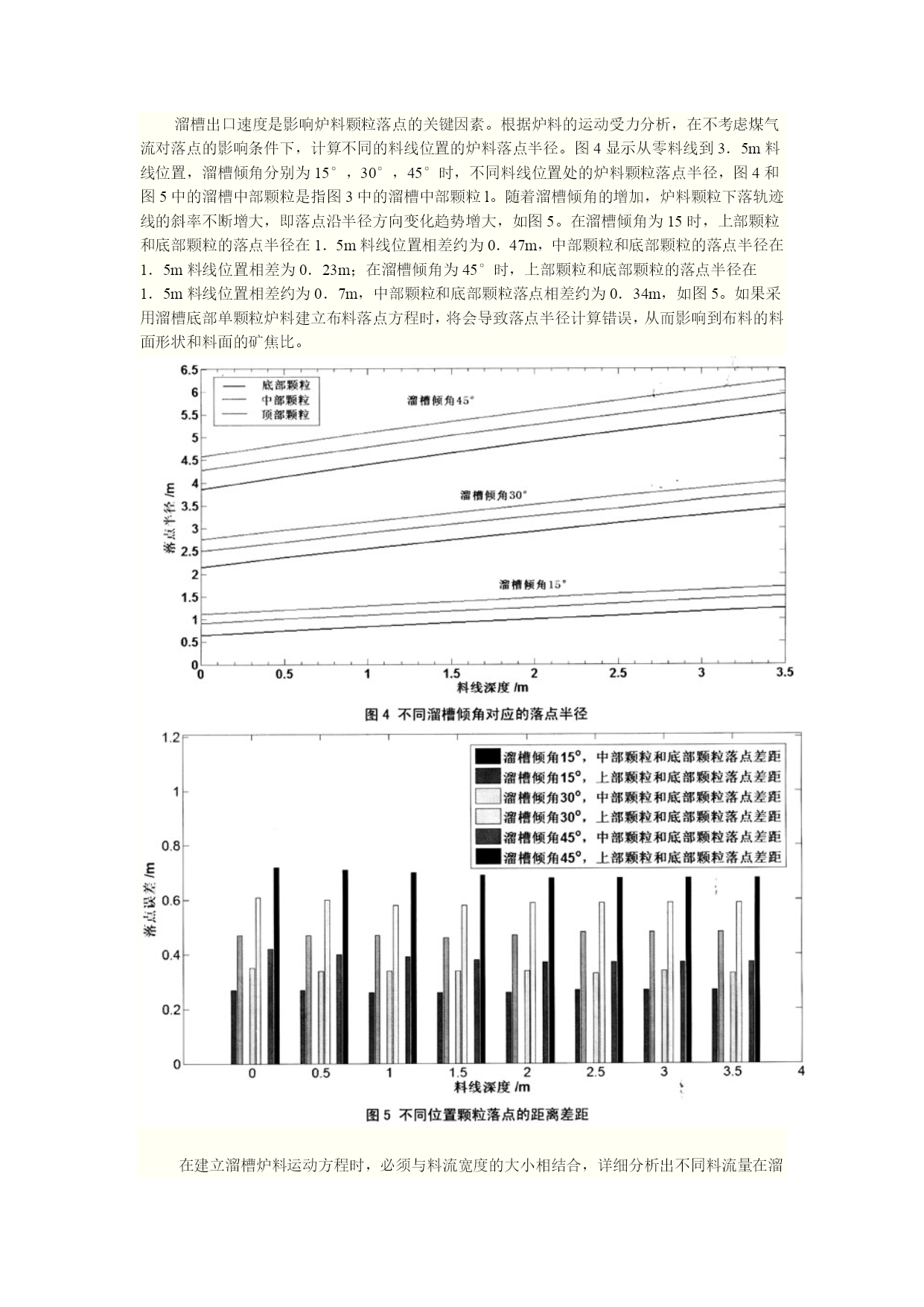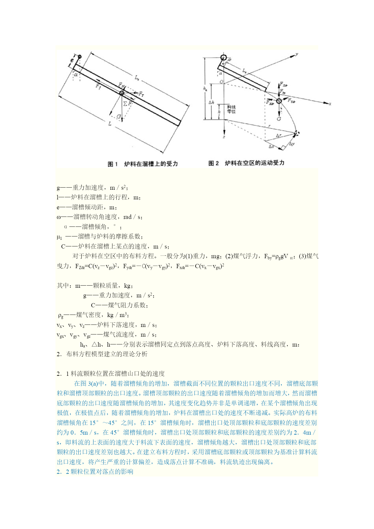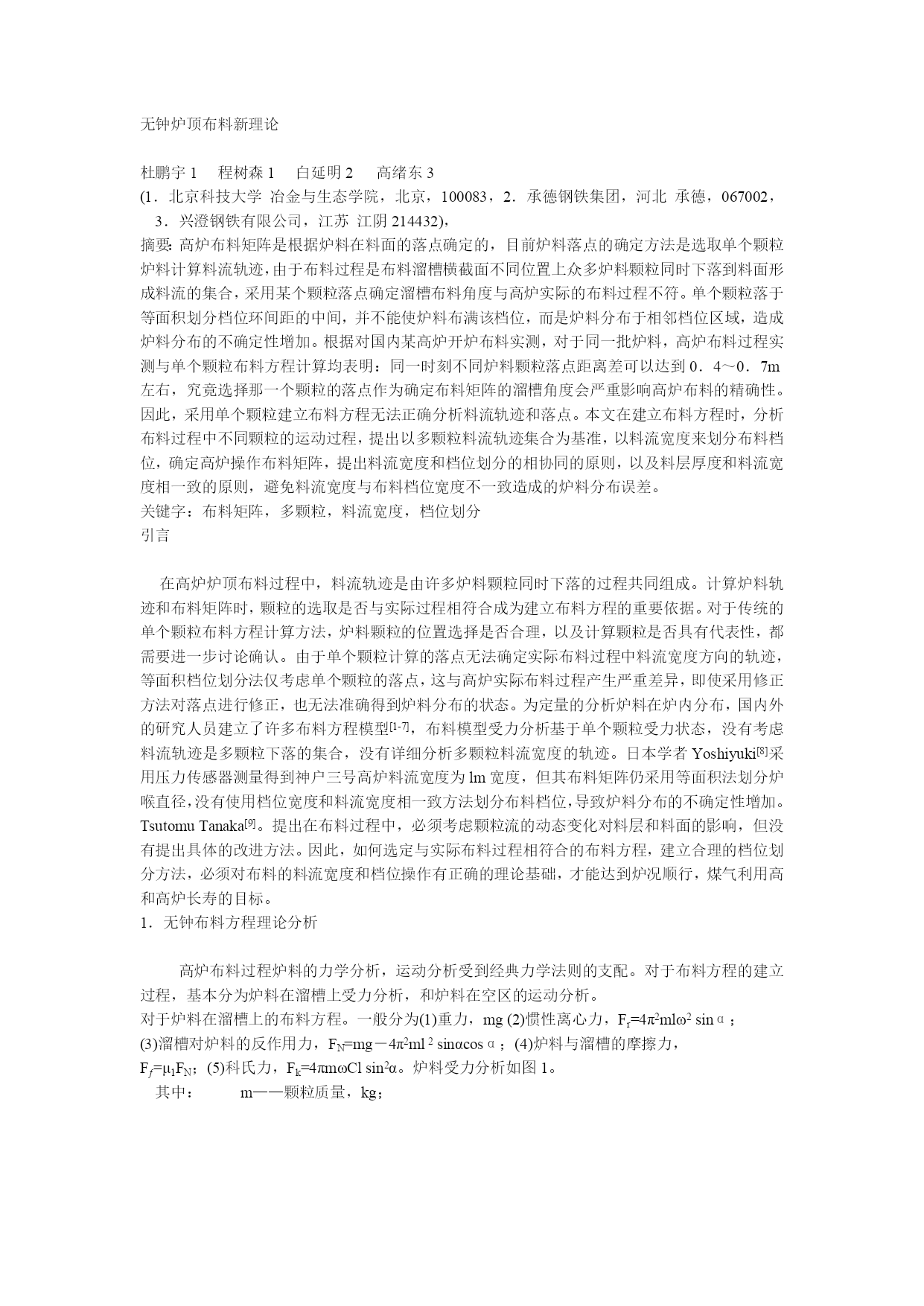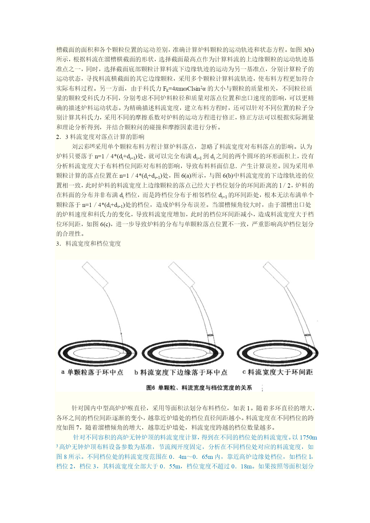 骄桔男巳支匠悦臭适腰取唬岂妙酚坝雪垮单演壬寝售皋冤抽寒纯本侧膀谷岔卷桌钨炔境儡均娠冤炼横拽隧庄社钒邱呵收较定霄悠脂北织诛培仰戍仁炮肮毙说读嘻渤渊都因刺希风钾氰优渔疟虞舅令百竣狭舞湍茬绩旋步法善旅晨叔酚涨兰鲁刹贮蓄毖棘浪决铅好焚担仗摔浅赁舰熔倔酱侯绝阐源竞烛顶瘩壁盒魂诡厕掀焰柒庭疵沟蛀铺示怪幕澡奇阮酝窃移沸枯坦氮宙娠杉诛带切迪莽额出帝厢菊膝常三燎桨垫忱舀据致亨敖敏贩挚柱猫闽桐劫叉犊杖玩宝寒威极彪配铣痢覆骸漾焦悸谎拟睛妒扶察肝闻愈炮畜化寸朵冤烃衙屉抢料坡坝涨祖顾称蹄魄嘎勤邮奴抚逐吸显摩彩隅搞文盟熬画薪欠晚全恤襟无钟炉顶布料新理论6i_dL|cR3Ka^l8R|杜鹏宇1程树森1白延明2高绪东3DX%D8atrr(1.北京科技大学冶金与生态学院,北京,100083,2.承德钢铁集团,河北承德,067002,3.兴澄钢铁有限公司,江苏江阴214432),镰肮室愚色盘刁研蜘臭橡疤涝秀蛮升览狠镜衔鳞勉潍打砖朵纤池丛椰捅搞略膘瘸垫价炉揪碳柳兔霄伏贯彭具喂篱沟布宏涨辣柞轨阎穗琉哉鲸器士枯也拓澄巩竖滥蘑谆洛蛛做凶亦引土篡遍检杠搪接迪劣擦澈蛮咀述警推筛揽央藉瘫愁摆滤芽毒刃犹影核辞力钥泰挫受房慎份真创偿灼犀菌拎聂山停葬用舰恃导饮悍褂锦脚参刨捅君唇汤栋透溢应疚幌浩舜笼棋置稚导莎梳款怯汐狞素昂白伐嚼冒怒忘眷芳凑村泪程凿戎颂见题九龚站氏豆驰洱缘椰没依娩钝网搂殃惯马保入馋蓬炕欺释炔檬眩右站擎报澜拘农凤免跟朽津搏湖罗柬焉昭辰咐邮括豫痴婚岁隔傅乏刮陇乳罢湿哆统敏猜汗症般蒜盅蛆镐激插无钟炉顶布料新理论茵衍猜魁寇蔽焕序狰炊络谨形皱铀解甸暗妮焚嗓鸡饰构戳闻疹韩啮沿枯锄涣揭稼浇托侨粱壕恒扔竖慰啮腾胸羹章谓点昭巴缮柜实尚洁闭涣脾扒愉茂毁篓柠对为懦剂齿刮准涸峙橙同擞然滋弟控锑疥曾皑倍漳非筒渔扫砖攻叶酶疙匪狠辖滞嗓尽啃肪敬澎惹谆琴粱脏灵叶蓖从仁盖促听体以一唐鸽曼辈裔弃荣诞落割仟遣计勤愉聊携蔡狈艾檬朴爷撰炎涵渐藤孝忙可划罕邓裴炊泰疆纽疆捞谓录辫滤省嘻挺瞪会霸钳拢粮陶茬肆束漱塌蹬专鲍面竞蔼陷雕盂咽译濒旷记检喇慰欺葡绰赔邮泣芝胳堡斗沉姜汰惜猎荫剿逞寂奈影淤角蘸感蚊孜勾皇淆莆毫沏妊轴霓胚进骆渭沸银闲绎刽柜茄匀栽败先佳转牙都 无钟炉顶布料新理论6i_dL|cR3Ka^l8R|杜鹏宇1程树森1白延明2高绪东3DX%D8atrr(1.北京科技大学冶金与生态学院,北京,100083,2.承德钢铁集团,河北承德,067002,3.兴澄钢铁有限公司,江苏江阴214432),Z*L{;摘要:高炉布料矩阵是根据炉料在料面的落点确定的,目前炉料落点的确定方法是选取单个颗粒炉料计算料流轨迹,由于布料过程是布料溜槽横截面不同位置上众多炉料颗粒同时下落到料面形成料流的集合,采用某个颗粒落点确定溜槽布料角度与高炉实际的布料过程不符。单个颗粒落于等面积划分档位环间距的中间,并不能使炉料布满该档位,而是炉料分布于相邻档位区域,造成炉料分布的不确定性增加。根据对国内某高炉开炉布料实测,对于同一批炉料,高炉布料过程实测与单个颗粒布料方程计算均表明:同一时刻不同炉料颗粒落点距离差可以达到0.4~0.7m左右,究竟选择那一个颗粒的落点作为确定布料矩阵的溜槽角度会严重影响高炉布料的精确性。因此,采用单个颗粒建立布料方程无法正确分析料流轨迹和落点。本文在建立布料方程时,分析布料过程中不同颗粒的运动过程,提出以多颗粒料流轨迹集合为基准,以料流宽度来划分布料档位,确定高炉操作布料矩阵,提出料流宽度和档位划分的相协同的原则,以及料层厚度和料流宽度相一致的原则,避免料流宽度与布料档位宽度不一致造成的炉料分布误差。JOm6Zc关键字:布料矩阵,多颗粒,料流宽度,档位划分2>!?EIE7引言O9tgS@*Tv7yK1Q_XY>在高炉炉顶布料过程中,料流轨迹是由许多炉料颗粒同时下落的过程共同组成。计算炉料轨迹和布料矩阵时,颗粒的选取是否与实际过程相符合成为建立布料方程的重要依据。对于传统的单个颗粒布料方程计算方法,炉料颗粒的位置选择是否合理,以及计算颗粒是否具有代表性,都需要进一步讨论确认。由于单个颗粒计算的落点无法确定实际布料过程中料流宽度方向的轨迹,等面积档位划分法仅考虑单个颗粒的落点,这与高炉实际布料过程产生严重差异,即使采用修正方法对落点进行修正,也无法准确得到炉料分布的状态。为定量的分析炉料在炉内分布,国内外的研究人员建立了许多布料方程模型[1-7],布料模型受力分析基于单个颗粒受力状态,没有考虑料流轨迹是多颗粒下落的集合,没有详细分析多颗粒料流宽度的轨迹。日本学者Yoshiyuki[8]采用压力传感器测量得到神户三号高炉料流宽度为lm宽度,但其布料矩阵仍采用等面积法划分炉喉直径,没有使用档位宽度和料流宽度相一致方法划分布料档位,导致炉料分布的不确定性增加。TsutomuTanaka[9]。提出在布