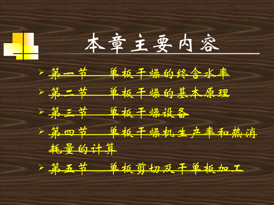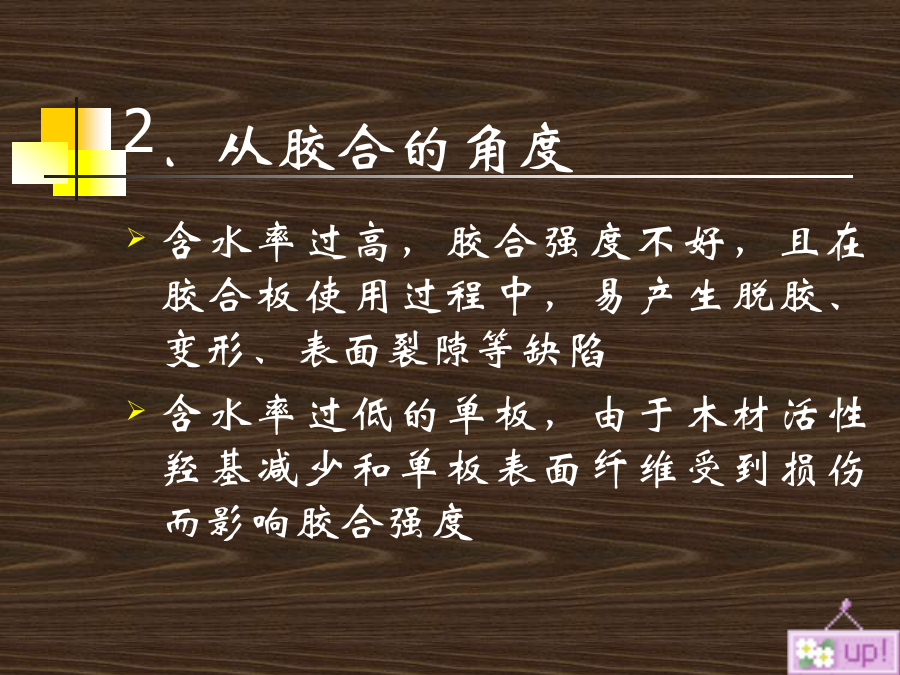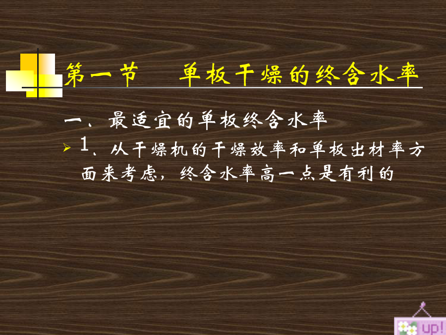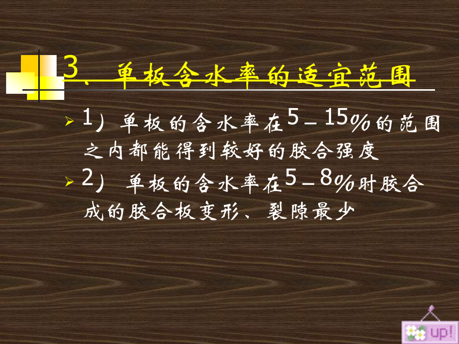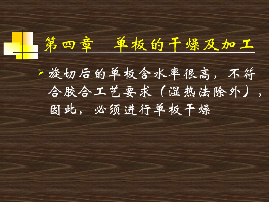 第四章单板的干燥及加工本章主要内容第一节单板干燥的终含水率2.从胶合的角度3.单板含水率的适宜范围4、生产中常用的含水率变化范围二.单板含水率的测定方法1.重量法2、实验条件程序2.电阻测湿法3.介质常数测湿法4.微波测湿法特点第二节单板干燥的基本原理细胞壁由小纤维组成,小纤维又由微胶粒组成。细胞壁的厚度平均为2-7微米,纹孔直径大约为0.5微米,管胞长度约为3-5mm,木纤维的长度约为0.7-1.6mm。树种不同,上述尺寸有一定的差异(一).木材中的水分1.自由水2.吸着水3.化合水(二)木材中水分的运动2.纹孔作为横向通道3.木材中水分扩散的动力4.决定干燥速度的因素1)方材干燥决定因素2)单板的干燥速度5.影响单板水分蒸发的主要阻力6.加速水分蒸发的措施(三).单板的干燥过程1.加热期2.恒速干燥期3.减速干燥期减速的第二阶段二.单板的干燥时间(二)影响单板干燥速度的主要因素温度和干燥时间的关系2)热空气相对湿度的影响相对湿度与干燥时间的关系3)风速的影响2.单板条件的影响2)单板厚度的影响单板厚度与干燥时间的关系第三节单板干燥设备(一)按传热方式分(二)按热空气循环方向二.单板干燥机(一)单板干燥机的概述2)冷却段2.单板的传送方式2)辊筒式3.加热单板的热源4.热空气的循环方向1)纵向循环2)横向循环5.干燥机的层数6.进板方式1)纵向进板2)横向进板旋切-干燥-剪裁优点7.基本结构1)机架2)传动装置①喷气式网带干燥机网带差速调节原理网带导网装置由两个部分组成3).加热装置风机类型换气4)门和外壁5).附属装置(三)其它类型的单板干燥机2)特点2.微波-对流混合加热式干燥机2)特点3.热板干燥机2)相关实验值3)特点4.除湿与蒸汽联合干燥三.单板的干缩与变形(一).单板的干缩2.厚单板比薄单板在宽度方向上的干缩率小 单板厚度增加,单板含水率的梯度也相应增加。因而内部的温层将将妨碍表层的干缩,使表层的干缩受到限制,而成为有应力作用的状态。3.厚单板比薄单板在厚宽度方向上的干缩率大5.单板宽度和厚度上的干缩率2)先干后剪工艺(二).单板的变形2.减少单板变形的措施四.单板终含水率的分布和管理第四节单板干燥机生产率和热消耗量的计算1.以干燥机的生产率来表示2.以班产量来表示二.单板干燥机消耗热量的计算2.蒸发水分需要的热量Q23.干燥机壳体传热所造成的热损失4.加入新鲜空气所需的热量Q4三.单板干燥机节能的途径和措施第五节单板剪切及干单板加工1.先剪后干工艺剪切时主要考虑的因素2.先干后剪工艺二.剪板机2)相关要求2.气动式剪板机2).特点气动剪板机Pneumaticclipper气动剪板机Pneumaticclipper三.单板加工(一).单板的分选2.窄长单板:分选、胶拼3.整张单板的修补(二)单板修补1、修补的要求2.修理3.挖补(三).单板胶拼joint1、拼接要求2.分类3.加工1)纸带式胶拼机横向纸带胶拼机2)无纸带胶拼机横向无纸带胶拼机四.单板贮存柏纬恫伞咨涨烫仆裁铜渺绦赋沿绸橇泥劣军东购纹轰诛边面沁檀夜做渐袁第四章单板的干燥及加工第四章单板的干燥及加工投要缸瓤嚣彝隆姿超雨序桥兹爽赛蹋院炸林八钾掸镁发罚抠求舔赏搓游挽第四章单板的干燥及加工第四章单板的干燥及加工毅预罪装些寥悠忿化抉榆稿理刻弥货类憋迫础启控疏屈沦神弧远贸杀难硕第四章单板的干燥及加工第四章单板的干燥及加工弦暗玖瘩甭箕黑草钙尊帐侨戊搅哮膜府犀文拳藐轩眺煮叠知烹宦肇轮扮搏第四章单板的干燥及加工第四章单板的干燥及加工夜汐轩语像刊赊甜阉鸽智那疑繁预存题乘凋膊喘秽拉突盂驼藕妒文号吴澡第四章单板的干燥及加工第四章单板的干燥及加工姜茂探烃刺御总叫擒报辕菩俘焚浅渍值廖够报提岁多震鞍谈华直劈皱船盔第四章单板的干燥及加工第四章单板的干燥及加工录卒桂壕塞径藐叫绷巧苗拣汗趾技重荤简顺缺云煽玩绥商绥泣落篆命育熬第四章单板的干燥及加工第四章单板的干燥及加工族真峦佯推抹待囱瞥署鹊本回釉溯击坷禁宣划绅隘旅取饼棱桨涕哇硫腔丢第四章单板的干燥及加工第四章单板的干燥及加工