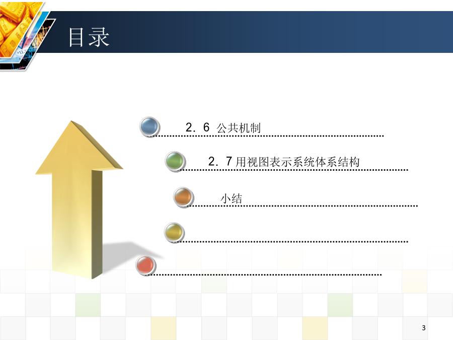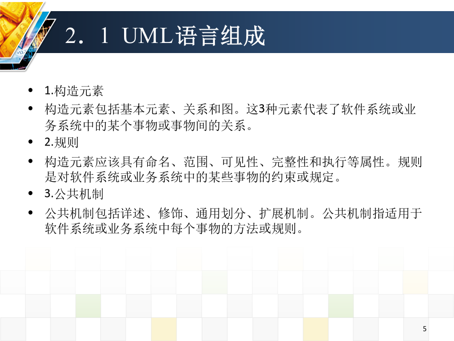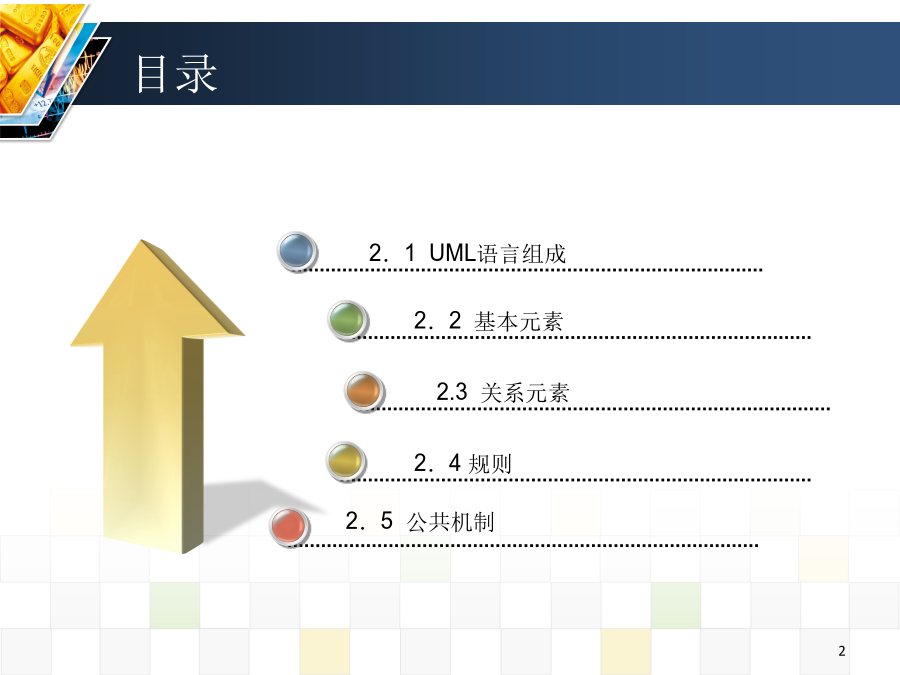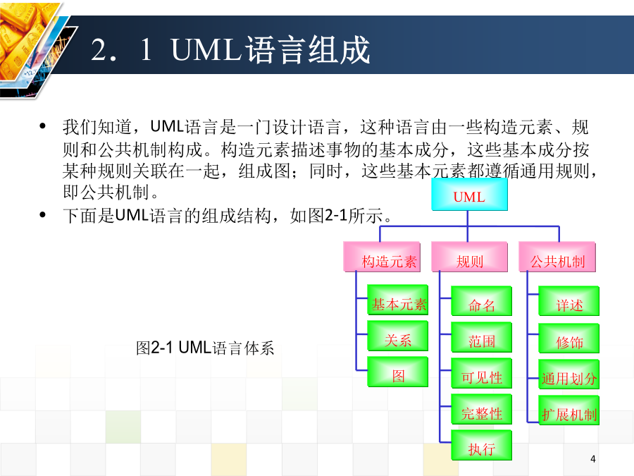 第2章UML语言体系目录目录2.1UML语言组成2.1UML语言组成2.2基本元素2.2.1结构元素2.2.1结构元素2.2.1结构元素2.2.1结构元素2.2.1结构元素2.2.1结构元素2.2.1结构元素2.2.2行为元素2.2.2行为元素2.2.3分组元素2.2.4注释元素2.3关系元素2.3关系元素2.3关系元素2.3关系元素2.3关系元素2.3关系元素2.3关系元素2.3关系元素2.3关系元素2.3关系元素2.4规则2.4规则(可见性)2.5公共机制2.6公共机制2.6公共机制2.6公共机制2.6公共机制2.7用视图表示系统体系结构2.7用视图表示系统体系结构小结