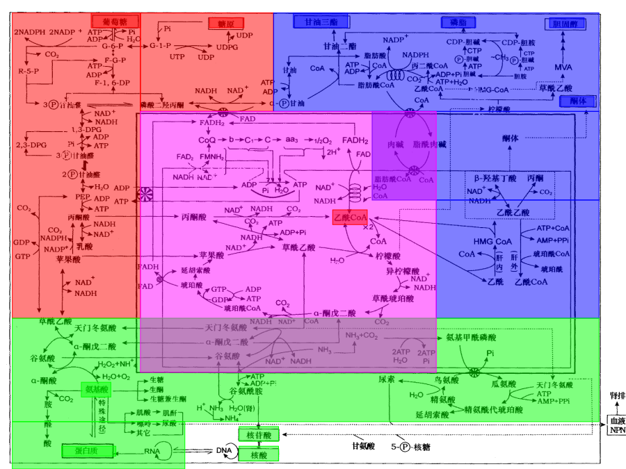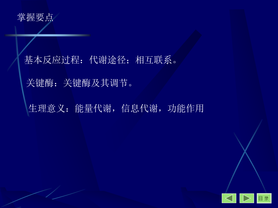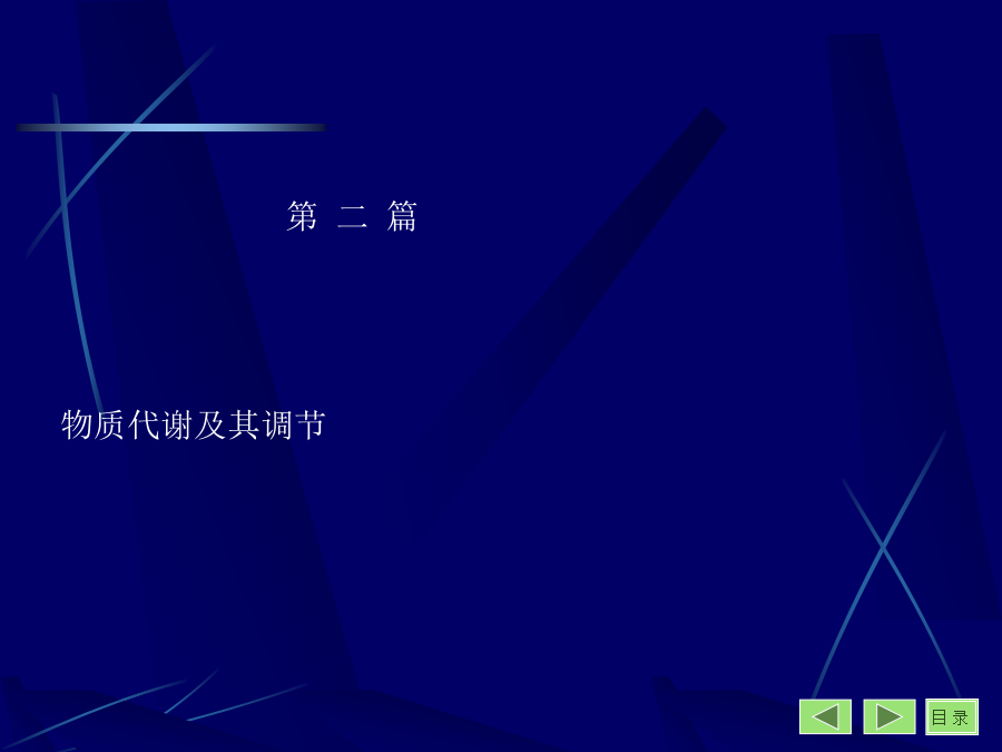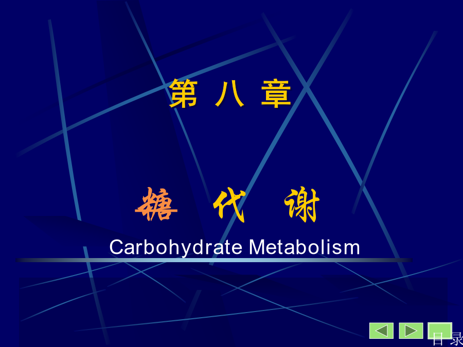 第二篇物质代谢研究的内容掌握要点糖代谢第八章糖代谢第一节概述一、糖的主要生理功能是氧化供能病例症状白细胞16400,中型83%,淋巴15%,单核2%。血糖7.5mmol/L,血清胆固醇300mg%,血液NPN52mg%,CO2结合力23ml/100ml,尿呈酸性,尿糖+++,酮体++++,血清A/G比值正常,GPT30单位。入院后,应用大量抗菌素,去甲肾上腺素,输液,并输入4%碳酸氢钠,连续应用胰岛素治疗,血压恢复正常,神智清醒,疖肿愈合,血糖逐渐下降,酮体消失,病情好转而出院。糖的化学糖的分类及其结构葡萄糖(glucose) (已醛糖)半乳糖(galactose) (已醛糖)寡糖多糖——能水解生成多个分子单糖的糖。淀粉——是植物中养分的储存形式。 结合糖——糖与非糖物质的结合物。二、糖的消化吸收是在小肠进行的淀粉(二)糖的吸收ADP+Pi4.吸收途径三、糖代谢是指葡萄糖在体内的复杂化学反应糖代谢的概况第二节糖的无氧分解AnaerobicOxidation*糖酵解(glycolysis):第一阶段1.葡萄糖磷酸化成为6-磷酸葡萄糖哺乳类动物体内:4种己糖激酶同工酶,Ⅰ-Ⅳ型。 肝细胞存在Ⅳ型,称为葡萄糖激酶(glucokinase)。 它的特点是: ①对葡萄糖的亲和力很低,Km值10mmol/L ②受激素调控,调节血糖浓度.4种,Ⅰ至Ⅳ型。 肝细胞:Ⅳ型,称为葡糖激酶(glucokinase)。 ①对葡萄糖的亲和力很低: Km=10mmol/L,[G]=5.5mmol/L [G]<KmV=Vmax*[S]/Km ②受激素调控 组织细胞己糖激酶: 对葡萄糖的亲和力高: Km:0.1mmol/L [G]=55KmV→Vmax2.6-磷酸葡糖转变为6-磷酸果糖3.6-磷酸果糖转变为1,6-双磷酸果糖1,6-双磷酸果糖5.磷酸二羟丙酮转变为3-磷酸甘油醛上述5步反应: 酵解途径的耗能阶段, 1分子葡萄糖代谢消耗2分子ATP, 产生2分子3-磷酸甘油醛。6.3-磷酸甘油醛氧化为1,3-二磷酸甘油酸 NAD+:R为H 7.1,3-二磷酸甘油酸转变成3-磷酸甘油酸8.3-磷酸甘油酸转变为2-磷酸甘油酸9.2-磷酸甘油酸转变为磷酸烯醇式丙酮酸ADPGlu(二)丙酮酸被还原为乳酸E1:己糖激酶二、糖酵解的调控是对3个关键酶活性的调节(一)6-磷酸果糖激酶-1对调节酵解途径的流量最重要F-2,6-2P是6-磷酸果糖激酶-1最强的变构激活剂。F-6-P(二)丙酮酸激酶是糖酵解的第二个重要的调节点共价修饰调节(三)己糖激酶受到反馈抑制调节乳酸酵解最主要的生理意义:迅速提供能量。 1.当机体缺氧或剧烈运动肌肉局部血流不足时,能量主要通过乳酸酵解获得。 2.红细胞没有线粒体,完全依赖乳酸酵解供应能量。 3.神经、白细胞和骨髓等代谢极为活跃,即使不缺氧也常由乳酸酵解提供部分能量。乳酸酵解时: 1mol葡萄糖生成4molATP, 消耗2molATP, 净生成2molATP。第三节糖的有氧氧化AerobicOxidationofCarbohydrate糖代谢的概况葡萄糖在有氧条件下彻底氧化成水和CO2的反应过程称为有氧氧化(aerobicoxidation)。一、糖的有氧氧化反应分为3个阶段(一)葡萄糖循酵解途径分解为丙酮酸丙酮酸脱氢酶复合体的组成 丙酮酸脱氢酶复合体催化的反应过程:(一)葡萄糖循酵解途径分解为丙酮酸(三)乙酰CoA进入三羧酸循环和氧化磷酸化生成ATP二、糖有氧氧化是机体获得ATP的主要方式*获得ATP的数量取决于还原当量进入线粒体的穿梭机制。有氧氧化的生理意义三、糖有氧氧化的调节是基于能量的需求别构调节共价修饰调节四、糖有氧氧化可抑制乳酸酵解第四节葡萄糖的其他代谢途径OtherMetabolicPathwaysofGlucose糖代谢的概况一、磷酸戊糖途径生成NADPH和磷酸戊糖*细胞定位:胞液6-磷酸葡糖酸催化第一步脱氢反应的6-磷酸葡糖脱氢酶是此代谢途径的关键酶。 两次脱氢脱下的氢均由NADP+接受生成NADPH+H+。 反应生成的磷酸核糖是一个非常重要的中间产物。在一系列反应中,通过3C、4C、6C、7C等演变阶段,最终生成3-磷酸甘油醛和6-磷酸果糖。5-磷酸核酮糖(C5)×3第二阶段反应的意义就在于通过一系列基团转移反应,将核糖转变成6-磷酸果糖和3-磷酸甘油醛而进入酵解途径。因此磷酸戊糖途径也称磷酸戊糖旁路(pentosephosphateshunt)。磷酸戊糖途径磷酸戊糖途径的总反应式:(二)磷酸戊糖途径受NADPH/NADP+比值的调节(三)磷酸戊糖途径的生理意义在于生成NADPH和5-磷酸核糖2G-SHG-S-S-G糖醛酸途径的主要生理意义 生成