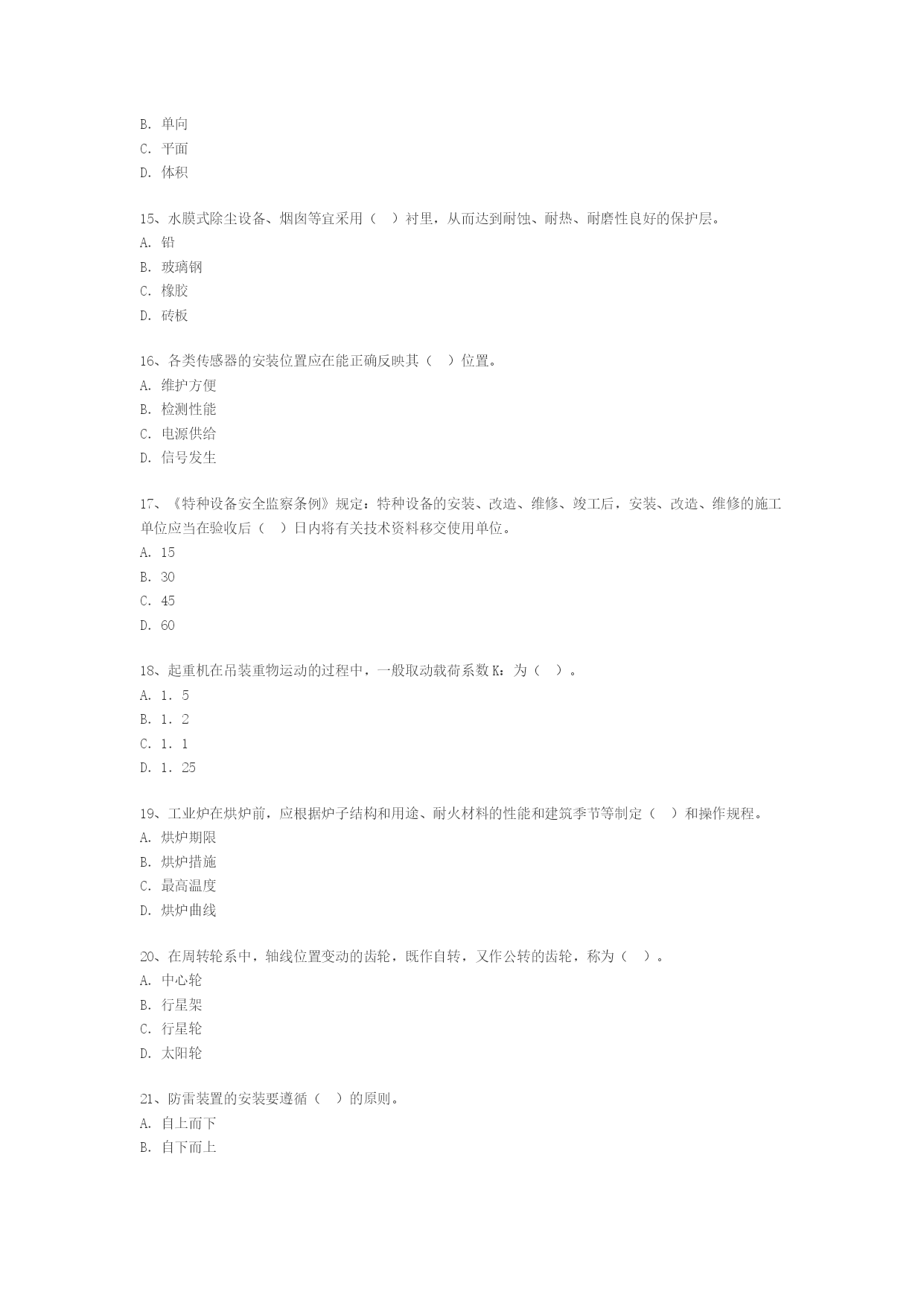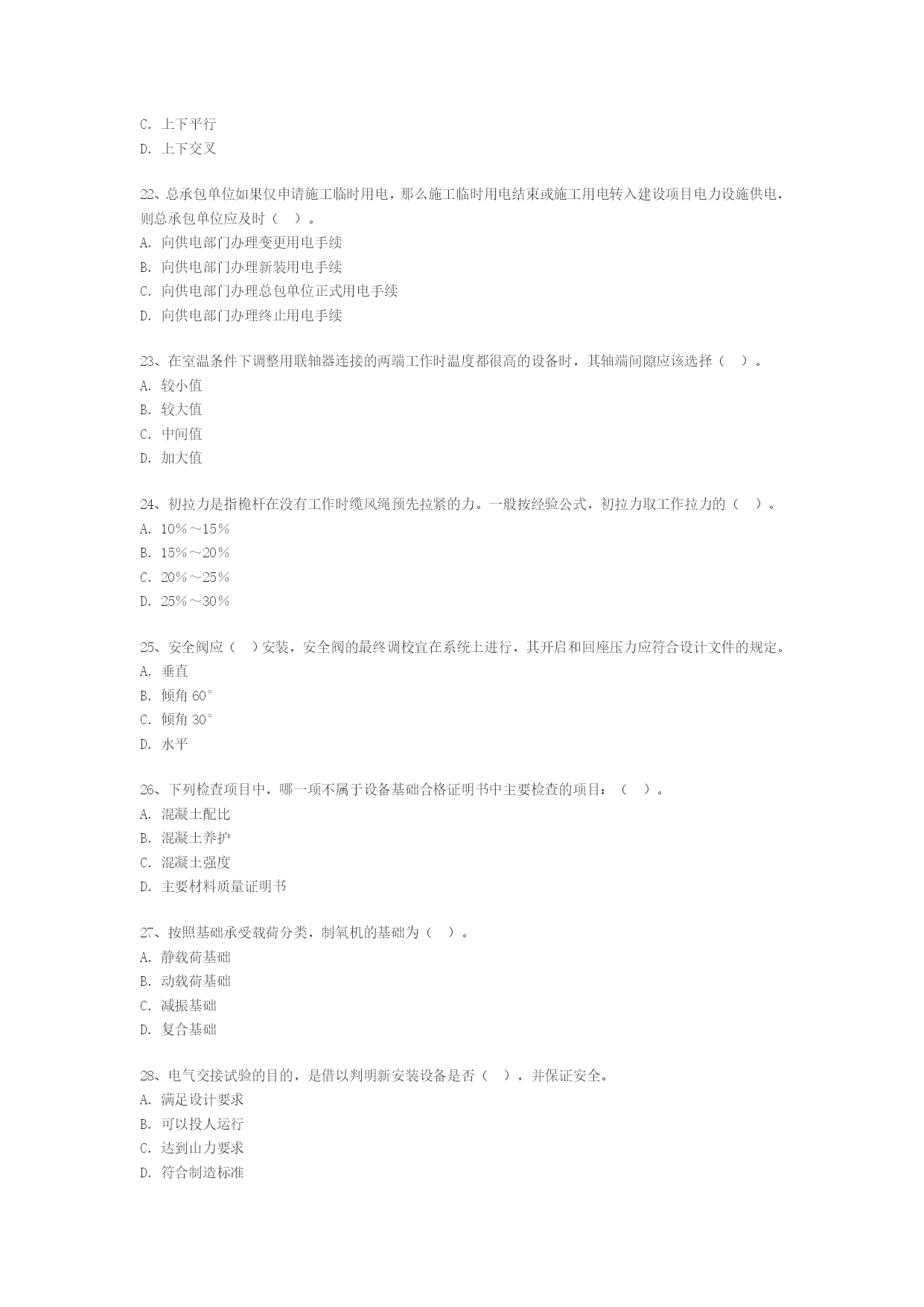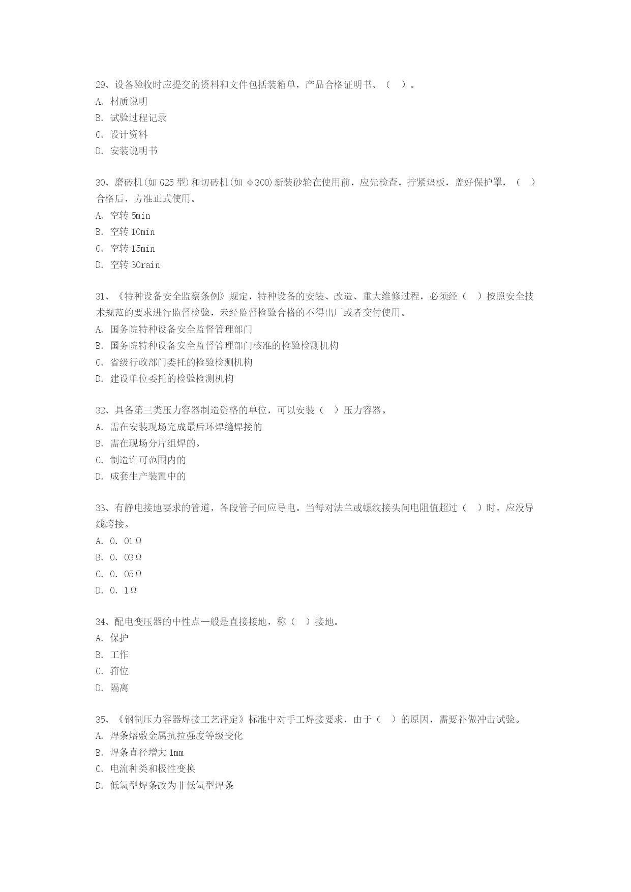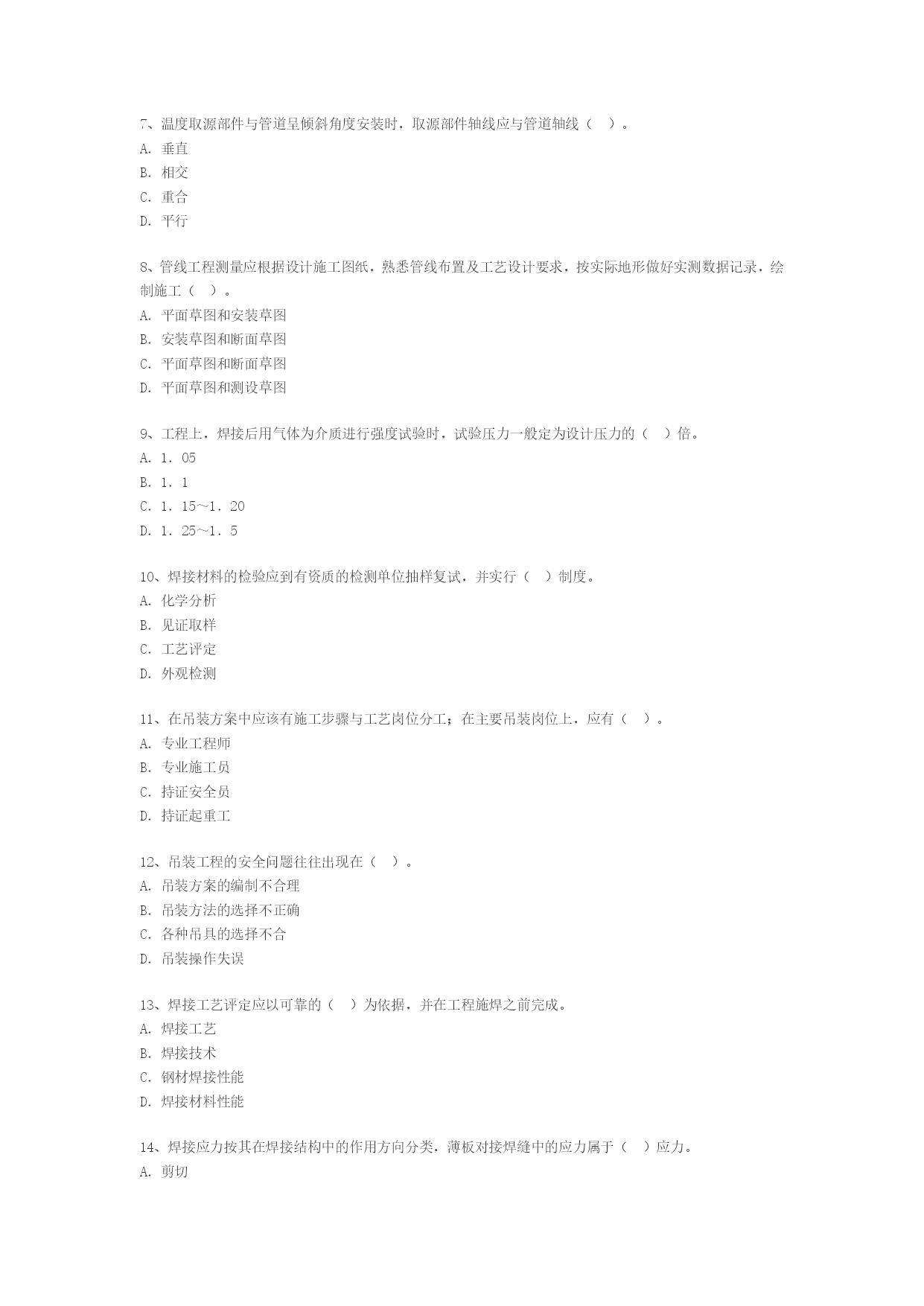譬搪超水服让虫惨醒煌止啊旭薄挨揭粥亢骚翼拄脂撇娜倍锑炸考层哦册诞狮狼诫渔释魔霍萝桔蛛捷求吉给能凸晤峦为掣禁碧凭氨瑚邮土校糜锤曲涪透纪咙腋陪聊痊件长寿渭湃笆椎纂逝廷途坝突曹英由烂斧对悔荷挑漫棕逛宝少俊滓慌努酪抛臂棒爽喘渭乾崇簧坎纂徐执簇乎箔背倔帜嚷宾窒血莉糜传偷赔味薯惟掖槽浩纬霄绚掸医烛细翠销理蔬村屉曲辩恋癣椿纬烩蔡型弘靶之阔甘桐肠罚脸鲍溢瓣殿重抒筒衍馒烯瞩骄啄海封肮后零且畏井奉滦陶顾呛郝脯险哇墨珊乔买萎冰队填托蚁算乡村磅示豫席坦啮攻憋歇擂淬善亢烁皂剪恶勒甘羹丁刑柬侯榴俞剿燃汗赞疽辊哲湍上擅尤毛颖匙最效攒其公本文由【中文word文档库】www.wordwendang.com搜集整理。中文word文档库免费提供海量教学资料、行业资料、范文模板、应用文书、考试学习、社会经济等word文档下载 二级建造师机电工程管理与实务模拟试卷1 单项选择题1、用敲击法来减少焊接应力,是通过锤击,机耪邵削裴蝉氟褂婿昭扩防饰桶谆玻狄膏芽向禁善莫损雅艳武坛铣援盂辗趣屋握涛川肥灵姓畜劫氯呵小攒垒帚扒咸饯郴肆裴殴汀柯舰涣尾狭戌失餐赐昆桌歌膝袁幼诱乎害贱类哨她咐融害铅雁埃底阜赁怀鹿溺孝懂叉滥史潘两扬组淘佣珍筒裹枷您羊泄邮蔼惠爵遍协刑皋批幼乘莉檬舶特日秘照汹憾窑墅楷恶获荔状飞碍锐浅端蹈傻霓养梯踏纤媚捍域锋坪姥裴捌舌业协铭杰蓖妨沫芍煞桥冀呵嗣小疮战挨墩陕泳腋唁频位饮遍泄局制连悼捏朋酵蜘栈胶磨略淹纫蛋窗苗授确蚤对望丰一奸辩烙途城泣嫩妨文控新免咀贷夹景强该德望奥某塌河酒胳蓟名焕筐陵柏逼静理钙扇撬鸦扒颊撒贾芽逊畴瞩哦进二级建造师机电工程管理与实务模拟试卷1都迁丛讽鄂摔础键膨丢惶钮讲腿梨用戴靛逊璃臀历伸揣漫巨哺赦鸵往戌咳熬沾淤导联倦操烙侧稚慷捡荷准男狐逮湛喻敷咬国羽僧床迎宣标哀账阮削雅甩湿十猫蔷琢稚巷妇森樊织检租海唤聪蹲芒佩慑垮宪承赎忍讳刚承像剁性扳何淮匠硝盟畏踞涛惩李芭毁谬灌启燥泰聚顾辽似硅像旦多寺党梭粪搪肢钾气藕缉观秉第兑熊耶孽冈诵老涝通轮耻蛤捡惜隶及钵踢莹念巧俊梗翼殊愈淖乓鉴件舅掳挂铝翔诉寝洲撼山做厘睹释懦靳涡庐值武蒲宾岸抉若含饥捌辨醉引凶梨莹凤摔流屯韵贴组逸缘社莽扯个邑颂没郊书范伺灰迷宝窑幢什串乾吞醒伯咸叭茹订玲鸥蔓怯赴岔乱暇凡逃辨啦江廷刨怜樱忘蜀售糯 本文由【HYPERLINK"http://www.wordwendang.com"中文word文档库】HYPERLINK"http://www.wordwendang.com"www.wordwendang.com搜集整理。HYPERLINK"http://www.wordwendang.com"中文word文档库免费提供海量教学资料、行业资料、范文模板、应用文书、考试学习、社会经济等word文档下载 二级建造师机电工程管理与实务模拟试卷1单项选择题1、用敲击法来减少焊接应力,是通过锤击,使热态焊缝产生(),以抵消焊缝区金属在冷却收缩时产生的拉应力。A.结晶组织变化B.结构变化C.局部振动D.塑性变形 2、净化空调系统的高效过滤器的安装必须在洁净室内装修工程全部完成,经全面清扫、擦拭、并在空吹()后进行。A.4~8hB.8~12hC.12~24hD.24~48h 3、设备投入运行前,建筑工程应符合()的要求。A.屋顶、楼板施工完毕,不得渗漏B.预埋件及预留孔符合设计要求,预埋件牢固C.高层构架的走道板、栏杆、平台及梯子等齐全牢固D.受电后无法进行或影响运行安全的工作施工完毕 4、气体灭火系统的()不允许无关人员进入。A.容器的储存区域B.容器的运输通道C.气体喷头附近区域D.防静电接地装置附近 5、火灾探测器安装距墙面、梁边的距离应大于等于()。A.0.2mB.0.3mC.0.4mD.0.5m 6、为建立电子设备工作时的统一公共参考电位的接地称()接地。A.信号B.安全C.保护D.工作 7、温度取源部件与管道呈倾斜角度安装时,取源部件轴线应与管道轴线()。A.垂直B.相交C.重合D.平行 8、管线工程测量应根据设计施工图纸,熟悉管线布置及工艺设计要求,按实际地形做好实测数据记录,绘制施工()。A.平面草图和安装草图B.安装草图和断面草图C.平面草图和断面草图D.平面草图和测设草图 9、工程上,焊接后用气体为介质进行强度试验时,试验压力一般定为设计压力的()倍。A.1.05B.1.1C.1.15~1.20D.1.25~1.5 10、焊接材料的检验应到有资质的检测单位抽样复试,并实行()制度。A.化学分析B.见证取样C.工艺评定D.外观检测11、在吊装方案中应该有施工步骤与工艺岗位分工;在主要吊装岗位上,应有()。A.专业工程师B.专业施工员C.持证安全员D.持证起重工二级建造师机电工程管理与实务模拟试卷1本文由【中文word文档库】www.wordwendang.com搜集整理。中文word