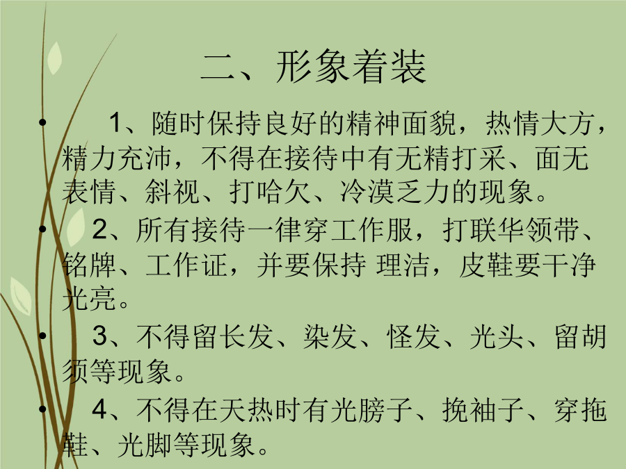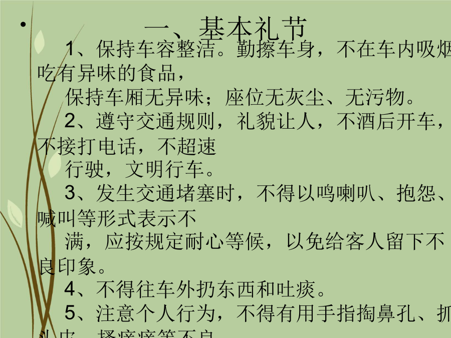 课程大纲课程目标一、基本礼节二、形象着装三、坐次礼仪 1、小轿车:贵宾专座应为后排右座,后排左座次之、其次是后排中座、副驾座。2、乘坐大巴、中巴或面包车:以司机后面的座位最为尊贵,后面座位的尊贵程度从前往后依次降低。 四、握手礼仪1、一般情况下,司机不得主动与客人握手,只有当客人主动伸手时,司机才可伸手相握。2、握手时,距对方约一步远,上身稍向前倾,两足立正,伸出右手,四指并拢,虎口相交。3、除了关系亲近的人可以长久地把手握在一起外,一般握两三下就行,一般要将时间控制在三五秒钟以内。4、不要太用力,但漫不经心地用手指尖“晴蜓点水”式去点一下也是无礼的。5、不可戴墨镜、手套与人握手。五、接收名片六、给客人引路七、礼貌用语4、与客人交谈时注意选择话题,如天气、当地风俗、特产、名胜以及沿途的景观等一些大众化的话题是首选,而像婚嫁、年龄(特别针对女性的时候)、工资、公司轶事、甚至还包括来这儿干什么等等话题,涉及到个人隐私的内容,都不应该问起。还有像小道消息、八卦新闻,谈论起来也显得很粗俗。5、与客人交谈还要做到语气婉转、口龄清晰、语调柔和、声音大小适中。对乘客的合理要求要尽量迅速作出使乘客满意的答复;对客人的过分或无理的要求需能沉得住气,婉言拒绝。要时时表现出热情、有教养、有风度。司机礼仪反面案例:在车上抽烟司机礼仪反面案例:在开车时打电话司机礼仪反面案例:在车上等候时睡觉司机接待礼仪反面案例司机接待礼仪反面案例司机接待礼仪反面案例司机礼仪正面案例:标准的驾驶姿势司机正反形象对比司机接待礼仪正面案例司机接待礼仪正面案例七、保持车容清洁八、行车礼仪守时应做到的三点:贴心细致兼周到的行李,待放好行李,客人入座后,驾驶员应逐一检查车门是否关好,然后才能开始驾驶; 车辆行至目的地后,驾驶员应先下车为客人打开车门,取出行李,帮助其将行李送至候机室、车站站台或房间并有礼貌地向客人道别。 专职驾驶员好似是客户的贴身秘书,在客户出行时,要事先了解客户的行程,适进提醒客户下一个行程的安排等事宜,以免延误; 如果需要,驾驶员应负责安排或配合安排客户的饮食、住宿等,这就就要求司机要灵活勤快,了解客户的饮食习惯与 禁忌,想再客户之前,不能让客户操心、烦心,更不能“推推动动”,甚至“推而不动”。(4)言谈有度守秘密领导与客人在车上谈话,要做到不该听的不听,不该说的不说,不该问的不问,更不能胡秘插话或打断谈话。不得与客人闲聊有关公司重大内容的话题,更不得在车内听到公司领导谈话内容后,到外面传播扩散。接待注意事项