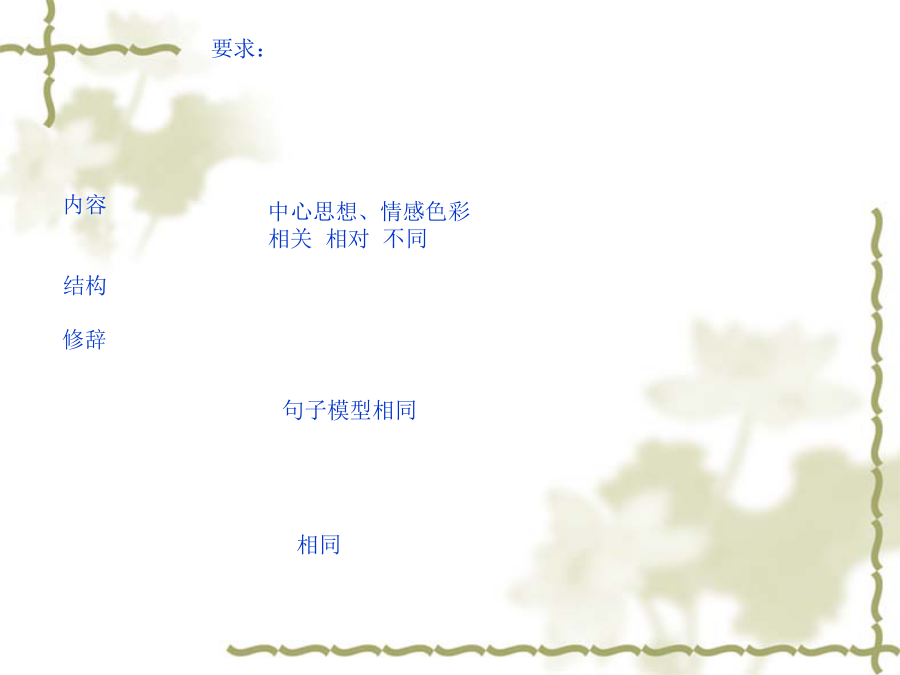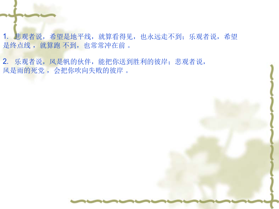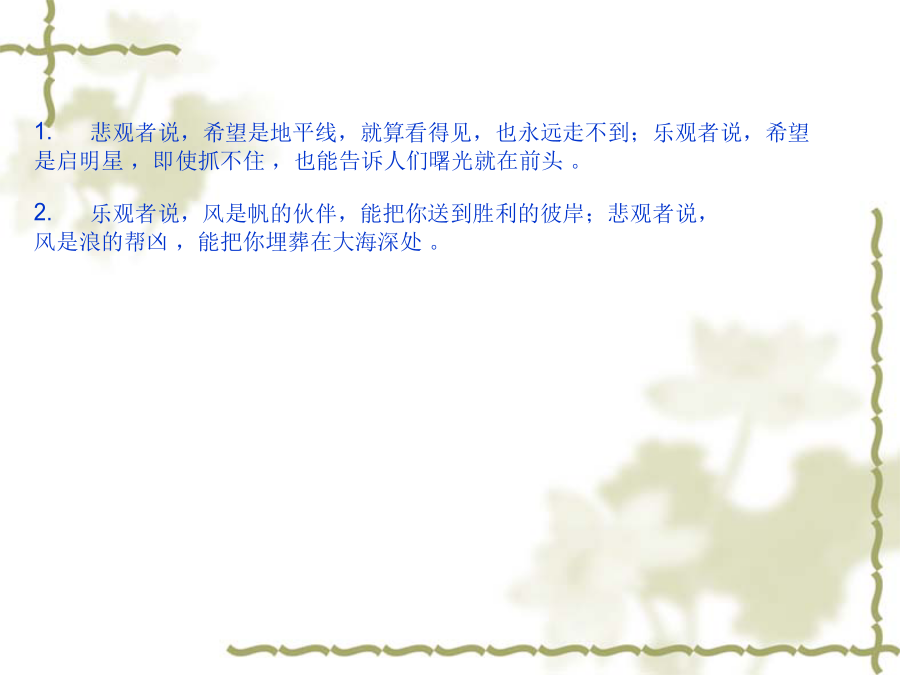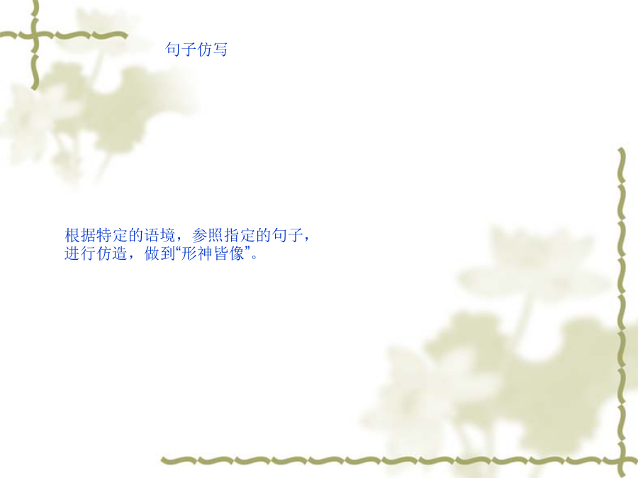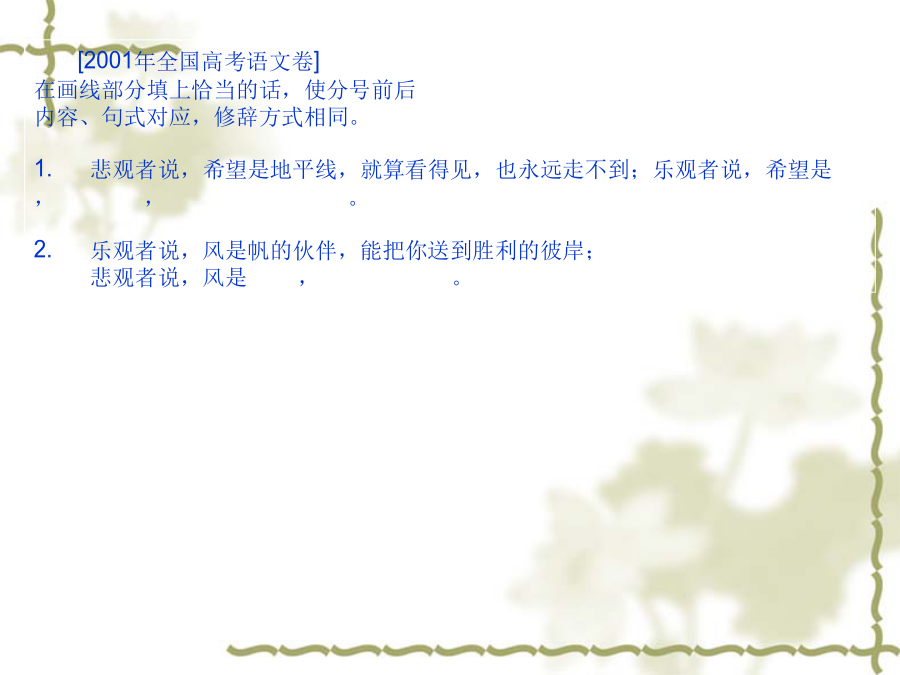 句子仿写内容 结构 修辞[2001年全国高考语文卷] 在画线部分填上恰当的话,使分号前后 内容、句式对应,修辞方式相同。 1.悲观者说,希望是地平线,就算看得见,也永远走不到;乐观者说,希望是,,。 2.乐观者说,风是帆的伙伴,能把你送到胜利的彼岸; 悲观者说,风是,。1.悲观者说,希望是地平线,就算看得见,也永远走不到;乐观者说,希望 是终点线,就算跑不到,也常常冲在前。 2.乐观者说,风是帆的伙伴,能把你送到胜利的彼岸;悲观者说, 风是雨的死党,会把你吹向失败的彼岸。 1.悲观者说,希望是地平线,就算看得见,也永远走不到;乐观者说,希望 是启明星,即使抓不住,也能告诉人们曙光就在前头。 2.乐观者说,风是帆的伙伴,能把你送到胜利的彼岸;悲观者说, 风是浪的帮凶,能把你埋葬在大海深处。 (1)乐观者说,希望是北斗星,即使抓不住,也能感受到光芒就在前方。 悲观者说,风是浪的同谋,会把你掀翻在失败之渊里。 (2)乐观者说,希望是煤油灯,就算很微弱,也能告诉人们光明就在前头。 悲观者说,风是帆的同伙,能把你吹翻在汹涌的浪涛中。 (3)乐观者说,希望是太阳,即使离得很远,也给人们无限温暖。 悲观者说,风是雨的死党,会把你送进深不可测的苦海里。 (4)乐观者说,希望是生命线,就算看不见,也能指点人们生命重在创造。 悲观者说,风是电的铁哥,能把你打入到地狱之中。 (5)乐观者说,希望是北斗星,即使摘不下,也始终亮心头。 悲观者说,风是浪的同谋,会把你掀到可怕的深渊。 (6)乐观者说,希望是煤油灯,就算光微弱,也一直照心中。 悲观者说,风是帆的同伙,能把你推向无边的苦海。(7)乐观者说,希望是一团火,即使熄灭了,也总会燃起来。 悲观者说,风是雨的死党,会把你吹向失败的彼岸。 (8)乐观者说,希望是终点线,就算跑不到,也常常冲在前。 悲观者说,风是电的铁哥,会把你打入阴森的地狱。 [2002年全国高考语文卷] 仿照下面的比喻形式,另写一组句子。要求选择新的本体和喻体,意思完整。(不要求与原句字数相同) 海是水的一部字典: 浪花是部首, 涛声是音序, 鱼虾、海鸥是海的文字。 春天是四季的一个乐章: 春雨是序曲, 春风是章节, 花鸟、鱼虫是春天的音符。[2002年全国高考语文卷]。 下列两个句子都写到“虚伪”。前一句直接表述,言简意赅;后一句连续类比,形象生动。请在“友谊”、“勇敢”、“信任”中任选一词,仿写两句话。 虚伪和欺诈产生罪恶。——[美]爱迪生 蚜虫吃青草,锈吃铁,虚伪吃灵魂。 ——[俄]契柯夫 信任和呵护哺育大师。 泥土铸成雕塑, 砖块铸成大厦, 信任铸成伟业。勇敢和机智创造财富。 蜘蛛有蛛网, 鸟有巢, 勇敢有事业。(1)友谊和真诚培育甜蜜 红花靠绿叶,瓦靠椽,友谊靠信任。 (2)勇敢和机智创造财富 蜘蛛有蛛网,鸟有巢,勇敢有事业。 (3)信任和宽容支撑友谊 春雨润万物,雪润土,信任润心灵。(4)友谊和直言种下美德 太阳化冰雪,甘露化干枯,友谊化分歧。 (5)勇敢和谦虚表现伟力 青枝出绿叶,红花出果实,勇敢出甜蜜。 (6)信任和呵护产生大师 泥土铸成雕塑,砖块铸成大厦,信任铸成 伟业。 (7)勇敢和坚毅改变人生 蟋蟀斗公鸡,螳螂斗蛇,勇敢斗命运。 (8)信任和谦虚组合美德 富贵润屋,德润身,信任润灵魂。 (9)友谊和勇敢结成兄弟 太阳献光芒,浪献花,友谊献爱心。 (10)勇敢和机灵创造奇迹 蚂蚁胜蟒蛇,鼠胜象,勇敢胜怯懦。 (11)信任和患难赢得友谊 众星烘月亮,叶烘花,信任烘寒夜。 [2003年全国高考语文卷] 仿照示例,改写下列两条提示语, 使之亲切友善、生动而不失原意。提示语:(公园里)禁止攀折花木,不许乱扔垃圾改写为:除了记忆什么也不带走, 除了脚印什么也别留下 (1)提示语:(教学楼内)禁止喧哗,不许打闹改写为: (2)提示语:(阅览室里)报刊不得带出,违者罚款改写为:(1)提示语:(教学楼内)禁止喧哗,不许打闹改写为: (2)提示语:(阅览室里)报刊不得带出,违者罚款改写为: (2004年高考语文试题--浙江卷) 请为图书馆的对联补拟下联。上联:学问藏今古下联:__________(2004年高考语文试题---全国卷二)下面两题都是春联的上联,请选择其中一题对出下联。4分第一题:春晖盈大地科学能致富 第二题:国兴旺家兴旺国家兴旺第二题:国兴旺家兴旺国家兴旺题型嵌入式在下面横线处填入适当的语句,组成前后呼应的排比句。 人民共和国迎来了她五十诞辰。五十年像一条长河,有急流也有缓流;五十年像一幅画卷,有冷色也有暖;五十年像一艘大船,有逆风也有顺风;五十年像一部诗,有痛苦也有欢乐。长河永远奔流,画卷刚刚展开,大船开始扬帆,史诗还在续写。我们的共和国正迈着坚定的步伐,