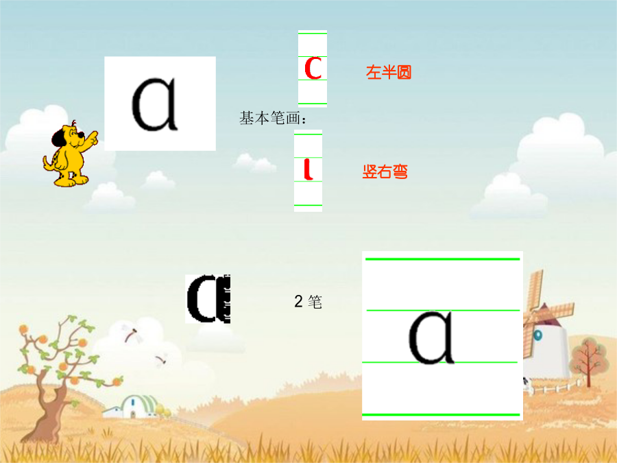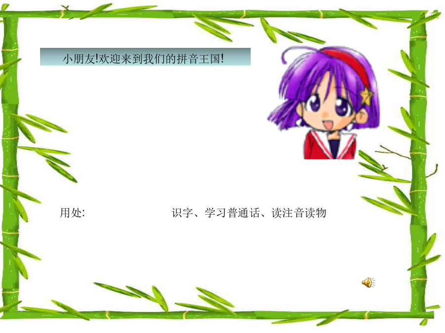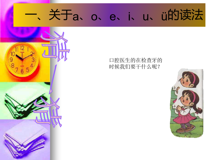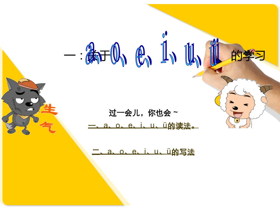 小朋友!欢迎来到我们的拼音王国!一:关于的学习一、关于a、o、e、i、u、ü的读法张大我们的嘴巴a、a、像这样跟着这位小朋友读三遍吧!基本笔画:啊,阿姨的阿!”“阿姨好”。一只大公鸡,早晨OO叫, 叫我早起上 学校 ééé,大白鹅的鹅,ěěě,恶心的恶,èèè,恶人的恶。下面我们来学一首儿歌谁能告诉老师这是 什么?会写吗?应该写在中间的一个之中的哦?好拜拜!