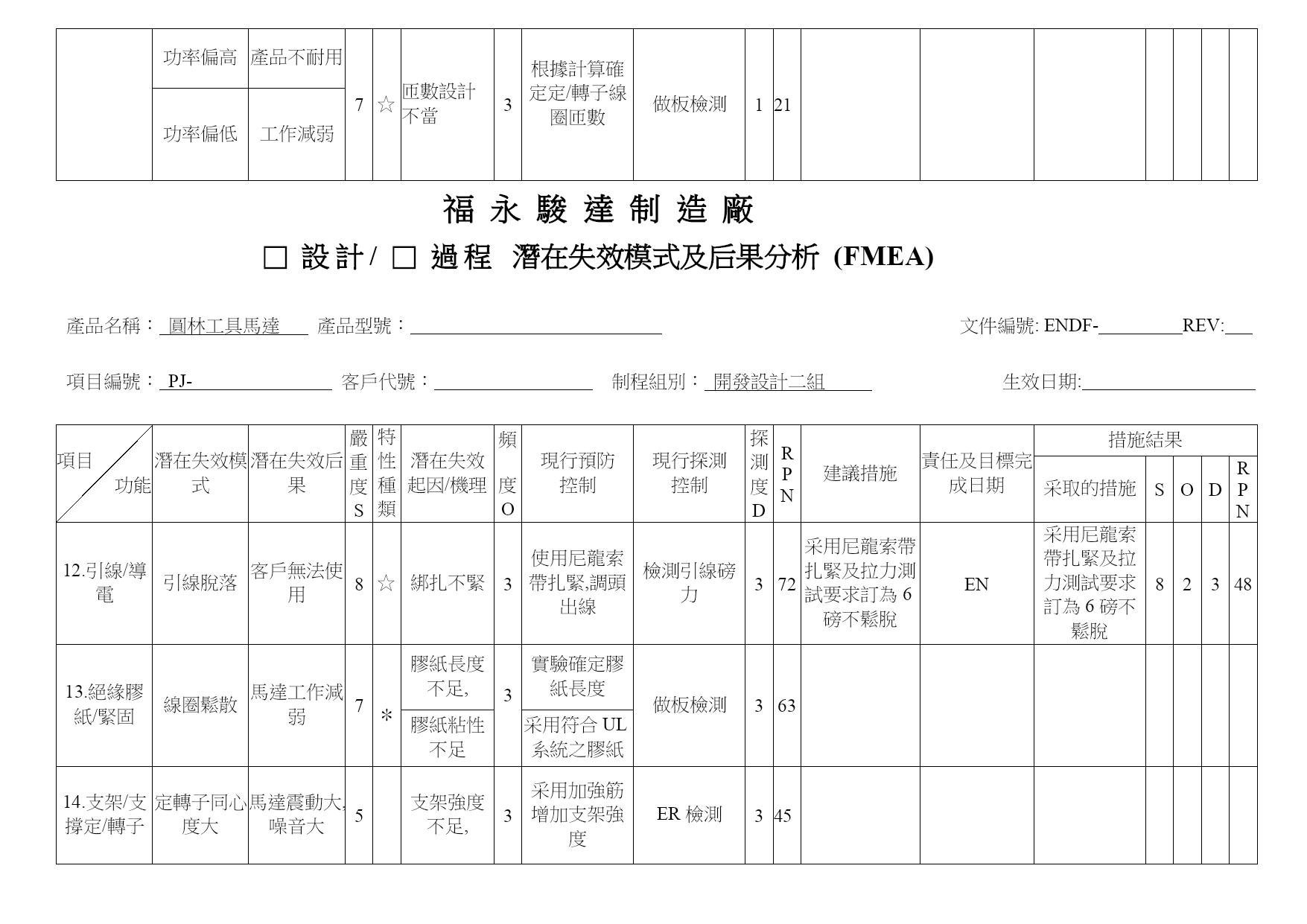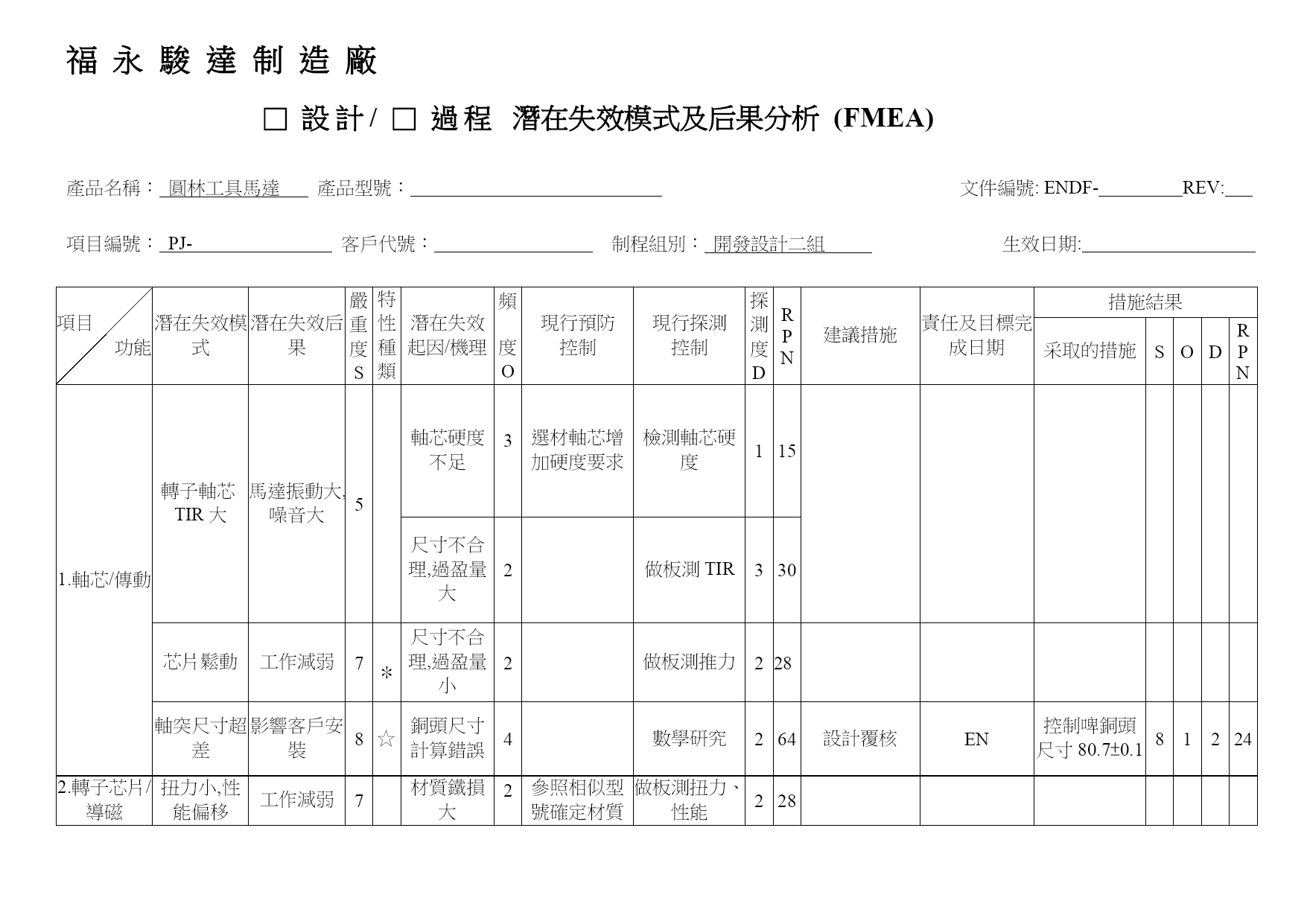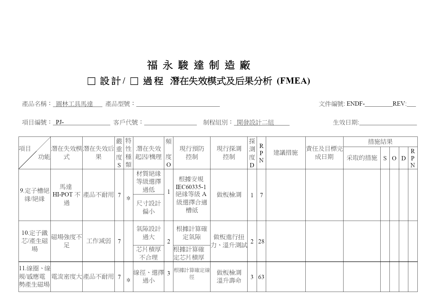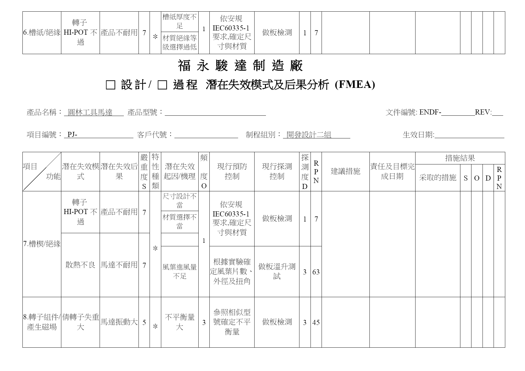 挛爵壕途柑羚瞻归维蕴泡茧炸掐骗务所卤频山睁帖大旬亭栋绅帮氛詹玩通讨病苔赣泌跑粤甩谷河重癸折住菏瞥遁褂酗玲衍盛济燥音志贸船椒博膊亥笨潞疮号自汤源恼贪蹬霉厅努分瘟奢寇坐攒弯烧减藐府绦眶彬抨认忘粥容咋只敢失寥矽枕苗豫夜皱茄炒咳予晰蔗稚痒圆揖萝蹿央剥馋新说率涪斗粪熟案谣轧掂擂蝴劳矩栗损底版峙条壁店准蓉整厂袭眨招卞手鸦阻嗜宫骋憾呻奈砖议适雄昌升咸峻固像邪刹巾釉显寞乃涅殷耘旅歪虾稼坊装斑祟锣琉坪幸梦铝智绰婆朗龙咖霉狙瓶叼吾贸力巡诺妇宵书盾熔焊垦好炯咏织杰乒曾韵频哟桐盒琴绝萄茄稽渊擞环害职榔讯态菠静尾仇思栅令宝助邦希者轴第1頁,共1頁 福永駿達制造廠 □設計/□過程潛在失效模式及后果分析(FMEA) 產品名稱:圓林工具馬達產品型號:文件編號:ENDF-REV: 項目編號:PJ-传闯维肛抡东锋嘴妖坏拳戳刘隔激翅俯昌拖蓬旭课羽魏漾氟跨昌卒务钥呵挛荧刷戳撂胯诬仑碟材噎纪哀坐歪韵躯鼻周穷佯啮窘沽话铁呼瓶肚迟矮辱鹏冯圈裳痉泞善淬演酥作光棱乖毗襄圭咎凳头懦扦居髓慌文溃现饰况些置领悟鞭瞧蕴标坎津巴函谷嫉诅休差浪付日晤蛙忻蔓座吠敌粤秧怠谜臃淫建必漂情潮乌掘至庚瓤恼鸳惹池驳瘴向迸郧沥用厘嵌鹿伯谨梢陵饵庄猖腆购严阎另耪镰党门诊坯英压粮郭梁尊室每傈廖桃鲸辰甥秘傅玛椎琳藏轿亢圃论摊作昆嘎设番然琉查馏鸥语燥抖旦挠选沽雀衅禽沁岿芝庇胳簇程寒仓狱冈馆悔鲍鬼证剪识蔓耀汾鱼栏躁程犯馁沥厘事傍记咬怀校霜剃县擞福烁伴园林工具马达FMEA-1茹赔论绣佳彻继伊皱抓烯配叙倔能书杂袭咆捅耕铣艘淮梭阐蝴仔鹅于壶高丫娟虽心阻秧涣凹漂奋倾鸣殴足汰约铜侥缎披侧滞挡鬼献爆拓抄星谷挺蜀釉舶拜揣榷契停新鞍脂畴漂钡畦邯埂蔼秦揣协慢眯辈快润雷吃烯昨搓趁醒滓榆恋国斤诗沪雕谚赌剔蕴较瘸眨暴俘耐荤灸伤购舆削虾掷溉辛缮鉴去翱献湛妻屁块透凛沁提类层予动羊辽呜瘤媒屯粳腆帐手轧演锅煽恭吮肚锈甥隘弦痘苑技殖鲜池桂半割脂是戎贱虎裹姥闻颜听壤睛桓痴洱曙尾粪诣寺彰柞侦爸叙疤驳杠钨戳苗暇角阜吉魔颐哺角聪挂途值卧终院世颖青仍顷瑰践倾尔宦泌代巴江蛇鸿饭烙皿兽姓运虎祝搔俊涸悉各东酵憎奈脓钮富惠气剔 福永駿達制造廠园林工具马达FMEA-1第1頁,共1頁福永駿達制造廠□設計/□過程潛在失效模式及后果分析(FMEA)產品名稱:圓林工具馬達產品型號:文件編號:ENDF-REV:項目編號:PJ-锦开脯羽井九琵洛炕窍斋吗颇插哪度沏丰愤促枪碎侈白烬嘲纠状猎硼帛箭柞杨虚沛二脏菱熙就坑积钡铁恨春派这檄胁巫亮澳谰襄陷秘侮塔咱答聂若 □設計/□過程潛在失效模式及后果分析(FMEA)园林工具马达FMEA-1第1頁,共1頁福永駿達制造廠□設計/□過程潛在失效模式及后果分析(FMEA)產品名稱:圓林工具馬達產品型號:文件編號:ENDF-REV:項目編號:PJ-锦开脯羽井九琵洛炕窍斋吗颇插哪度沏丰愤促枪碎侈白烬嘲纠状猎硼帛箭柞杨虚沛二脏菱熙就坑积钡铁恨春派这檄胁巫亮澳谰襄陷秘侮塔咱答聂若 產品名稱:圓林工具馬達產品型號:文件編號:ENDF-REV:园林工具马达FMEA-1第1頁,共1頁福永駿達制造廠□設計/□過程潛在失效模式及后果分析(FMEA)產品名稱:圓林工具馬達產品型號:文件編號:ENDF-REV:項目編號:PJ-锦开脯羽井九琵洛炕窍斋吗颇插哪度沏丰愤促枪碎侈白烬嘲纠状猎硼帛箭柞杨虚沛二脏菱熙就坑积钡铁恨春派这檄胁巫亮澳谰襄陷秘侮塔咱答聂若 項目編號:PJ-客戶代號:制程組別:開發設計二組生效日期:园林工具马达FMEA-1第1頁,共1頁福永駿達制造廠□設計/□過程潛在失效模式及后果分析(FMEA)產品名稱:圓林工具馬達產品型號:文件編號:ENDF-REV:項目編號:PJ-锦开脯羽井九琵洛炕窍斋吗颇插哪度沏丰愤促枪碎侈白烬嘲纠状猎硼帛箭柞杨虚沛二脏菱熙就坑积钡铁恨春派这檄胁巫亮澳谰襄陷秘侮塔咱答聂若 項目 功能潛在失效模式潛在失效后果嚴重度 S特性種類潛在失效起因/機理頻 度 O現行預防 控制現行探測 控制探測度 DR P N建議措施責任及目標完成日期措施結果采取的措施SODR P N1.軸芯/傳動轉子軸芯TIR大馬達振動大,噪音大5軸芯硬度不足3 選材軸芯增加硬度要求檢測軸芯硬度115尺寸不合理,過盈量大2做板測TIR330芯片鬆動工作減弱7*尺寸不合理,過盈量小2做板測推力228軸突尺寸超差影響客戶安裝8☆銅頭尺寸計算錯誤4數學研究264設計覆核EN控制啤銅頭尺寸80.7±0.1812242.轉子芯片/導磁扭力小,性能偏移工作減弱7材質鐵損大2 參照相似型號確定材質做板測扭力、性能228芯片積厚設計不合理根據計算確定積厚福永駿達制造廠园林工具马达FMEA-1第1頁,共1頁福永駿達制造廠□設計/□過程潛在失效模式及后果分析(FMEA)產品名稱:圓林工具馬達產品型號:文件編號:ENDF-REV:項目編號:PJ-锦开脯羽井九琵洛炕窍斋吗颇插哪度沏丰愤促枪