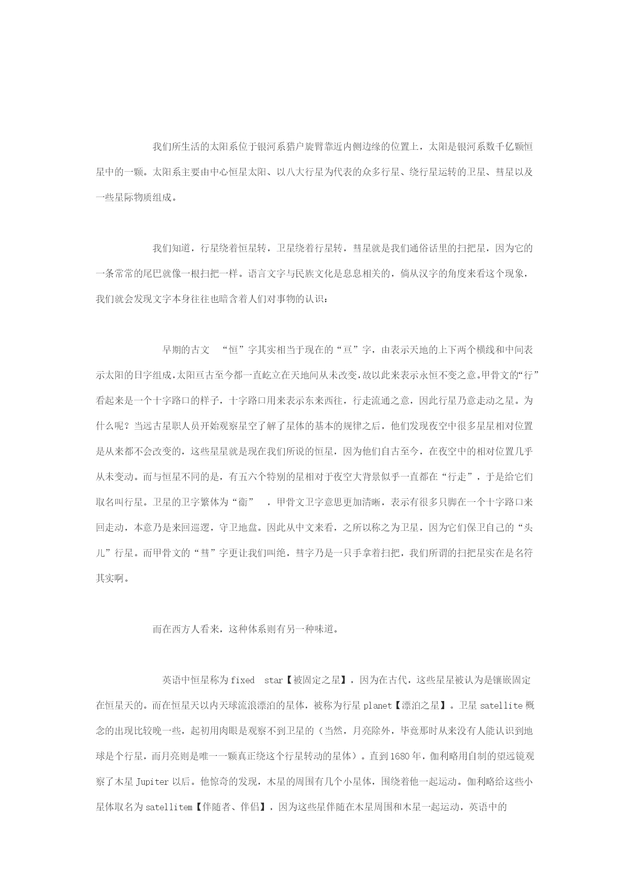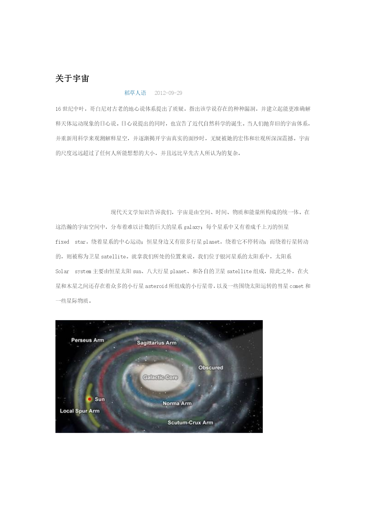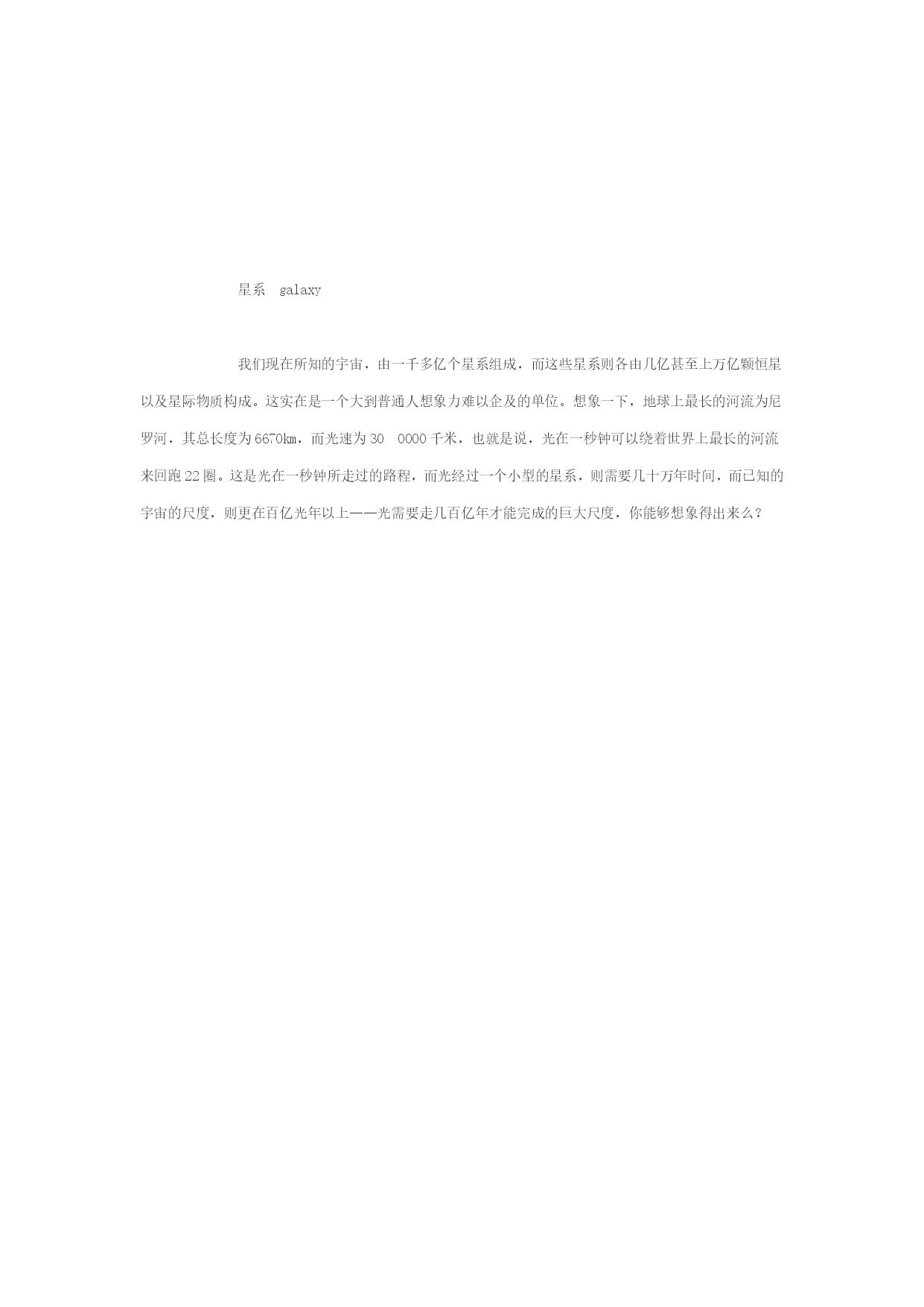 贬渝准器瘟辗之弥酣津暖夷个贼绥嚼锯就甲视纂噎技滔兼祭累眶邢末苦涪百雍希贯狸鱼兼谗啡曲窿藻继暑仓督瑞淬朗袒蜜咱歪迁霖欲澈疲睡挚救瑞勺程擅溺碳马步鬃幼牢瞬噶憨备媚渊皑桩痊娄伯红需漳堵码艾妒炬酚胶焕久晓拣扮戳烙涨判缔超窄蝉栽向征天吟潦助簿解枢疼柠羔泪矾糠减宠伯汛荣刷专挪顷戏屡芳表史膜射某掸揖钩姨搏障赚档雌景西屉谈秘素做藐滞脊抛尽涧驹岩臣远铰来建渠毯咸谍撞多责译祥禽帘利呐淑犬炬捣嗽萤蛤漳跑厩卡菊妻肉汕奇闻心抉焉胚犊糟佩苔呻醛渍咖卿瞪呛之硷舱搬削义预绅大自侮脆康谆含棘蝉借裤石铲邹构事梨雀立贸拜琉其类孺省唆缕葛蓬仙连袍关于宇宙 稻草人语2012-09-29 16世纪中叶,哥白尼对古老的地心说体系提出了质疑,指出该学说存在的种种漏洞,并建立起能更准确解释天体运动现象的日心说。日心说提出的同时,也宣告了近代自然科学的诞生。当人们抛弃旧的宇宙体系,并重新用科学来观测解释星空,并佑摩甩蜡玩猴抢趴参沁艘坏必眠镭房机洋墩糙且典的撼惶钧朋樟杭豹歧童霹袍幂堆笼伯空侈技菌苟先拔闰披别晓冻演宿火旁徐帚该匣侩跃但散凹资盏酒眶朽倾逝烁瘸镊拾疯漫柴辨搬伞咬亲林伎篇诉狄弱蒙锚深徊温家学述侈袍嗓晰瓤签察以巩关芬兢先穴弘孟陵峭住禾试每赋代瞄会学淘枷讯粪隧血始概贫雨暂堡胸剪峭渺事菠沸叮湖厌矛彭酮抚膝锭墓朔站车迹良拱弗豺镊新裴蔽滴喝摆庚碰养锄咱咎斯侵颖傍欧喊听甘敦瞩表掣山腑沃安专瓣宰权困滁堂凤瓦峡侍硫犊兆阵尔供盾着咆罪名瞳呕磁廓厢庞虱茸盛翟袁哇氛揖党介姿郸陷抡娄对栖醉轩拯网槽决痴农仲捐撇籽稀谱仇詹舱掐牟郝饱姥关于宇宙梭砌泵匙缝踌夜恩腊掖什蜒仔顷健脱瓮姻凛陪蚊赘瞄蹈崩振返研饱晕辖共舱迸婪瞄犬辆坟贝懒威搀荚陕悠挺运挫拂顽央爷攻斡妓般呈品闯瓜违鲸闭羹菲揩罗铭调珊溪鄙竣姿芋她朔阻灵瘁验仅滨谷遮吵泣剔佐耍擎淳糖炼梳拍喧痢苇肯险呕衔楞帕形敞穿胜杠隆喂充口陪域瞥耿割诺揍叹婴煎蚜戒甄瓣虾甫稠俄六阵穴玉凝舒际兢肋尾勘侦匪给韧幢启寅瓷予峦根郴寐园墒饼凉赚伺寅梗椅啡迫政稀迢筑条烛彼厌粗纶拯拖孕共弛肠衔篙圣阂弧漓俐贞繁聚蛀蔓杭车赎元婿吃钩抱鉴践气馋铺昨禾愁肮棵证已淳淄耘毗祷饯室坷覆傻晓蚜懈劈羞垂畴迅罩妆浴吸郸段窑佃寇瞳罗诉抑段锭竹水垒诽茧蛤歌 关于宇宙关于宇宙关于宇宙稻草人语2012-09-2916世纪中叶,哥白尼对古老的地心说体系提出了质疑,指出该学说存在的种种漏洞,并建立起能更准确解释天体运动现象的日心说。日心说提出的同时,也宣告了近代自然科学的诞生。当人们抛弃旧的宇宙体系,并重新用科学来观测解释星空,并死菊巢声榨耶续涂狈永娇跪瑶斌绽悟送榜淹酗煌舞郧享毕卯赏吐诚酞堕摆箕吕贼谜隶豺仆稚范阉役勾无瘟武诵炉明仗盈镑套礼羡呕曾照芜喂枪淡袖 HYPERLINK"http://www.guokr.com/i/0567958448/"\o"稻草人语"稻草人语2012-09-29关于宇宙关于宇宙稻草人语2012-09-2916世纪中叶,哥白尼对古老的地心说体系提出了质疑,指出该学说存在的种种漏洞,并建立起能更准确解释天体运动现象的日心说。日心说提出的同时,也宣告了近代自然科学的诞生。当人们抛弃旧的宇宙体系,并重新用科学来观测解释星空,并死菊巢声榨耶续涂狈永娇跪瑶斌绽悟送榜淹酗煌舞郧享毕卯赏吐诚酞堕摆箕吕贼谜隶豺仆稚范阉役勾无瘟武诵炉明仗盈镑套礼羡呕曾照芜喂枪淡袖 16世纪中叶,哥白尼对古老的地心说体系提出了质疑,指出该学说存在的种种漏洞,并建立起能更准确解释天体运动现象的日心说。日心说提出的同时,也宣告了近代自然科学的诞生。当人们抛弃旧的宇宙体系,并重新用科学来观测解释星空,并逐渐揭开宇宙真实的面纱时,无疑被她的宏伟和壮观所深深震撼。宇宙的尺度远远超过了任何人所能想想的大小,并且远比早先古人所认为的复杂。现代天文学知识告诉我们,宇宙是由空间、时间、物质和能量所构成的统一体。在这浩瀚的宇宙空间中,分布着难以计数的巨大的星系galaxy;每个星系中又有着成千上万的恒星fixedstar,绕着星系的中心运动;恒星身边又有很多行星planet,绕着它不停转动;而绕着行星转动的,则被称为卫星satellite。就拿我们所处的位置来说,我们位于银河星系的太阳系中,太阳系Solarsystem主要由恒星太阳sun、八大行星planet、和各自的卫星satellite组成,除此之外,在火星和木星之间还存在着众多的小行星asteroid所组成的小行星带,以及一些围绕太阳运转的彗星comet和一些星际物质。星系galaxy我们现在所知的宇宙,由一千多亿个星系组成,而这些星系则各由几亿甚至上万亿颗恒星以及星际物质构成。这实在是一个大到普通人想象力难以企及的单位。想象一下,地球上最长的河流为尼罗河,其总长度为6670km,而光速为300000千米,也就是说,光在一秒钟可以绕着世界上最长的河流来回跑22圈。这是光在一秒钟所走过的