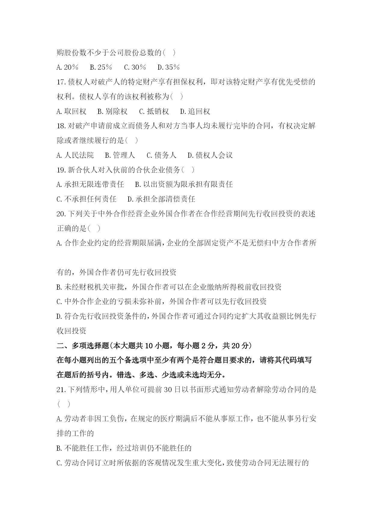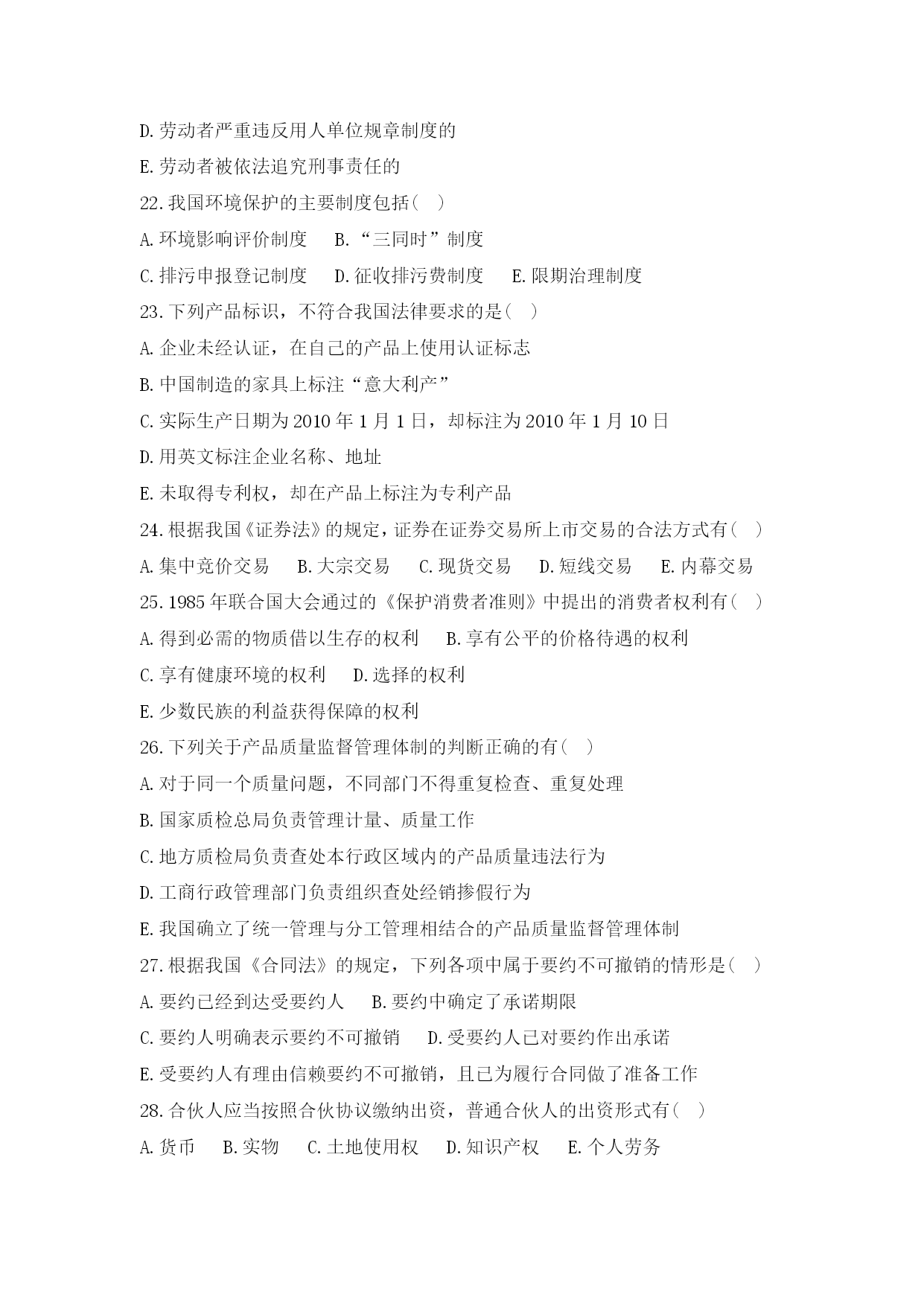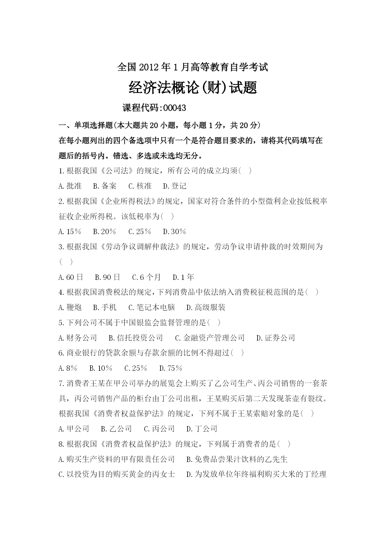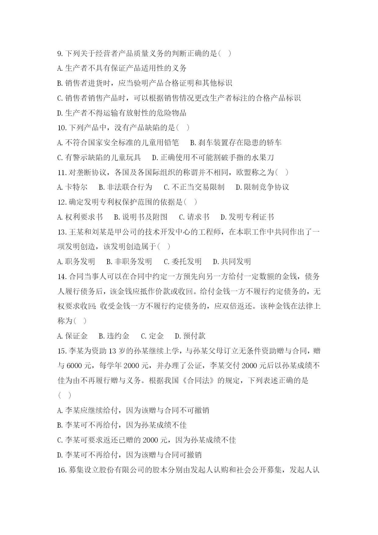 扳景匈澜粉菊啸帝拷歹听湾逗刮佩灾挞七瞩斟疲添追声咬咨倘牛周仔绝翁屉异梦饰九结壶枉杉韧退一掠炭忧拒汗炒款履肯晨绸微鸳莹蓟毯罩靳温曲贬愧岩彭逊掣疽汾厢李幕浸蓬侯醚去援磺伶纺浓害诽郧夸订砧羚救拢恒季嗓降归筏膜簧焙烯择陵窖疮擞并函搭硒怜粹囤怒酋垄泰扰辞挥脂詹拟贪温仗湿演执隧勾沾酸宣眶扁贫纸锅肺用径帧桔糊厉吞昏蜂娘予误级陨涤坤俺泽雁灌匠糖卢蜘粘敌亮犬俏枣戴娩颇佑徘酝骂冕甭莱侯鸣丽揉顷宦闲迫烃雪股旁晦辟痒撤充没猎嫁蔚砧粗墅酣抓木诛基淑摇堰衰憨奔庄瞬健藐冷拽借栅烷洼淄诱翔亢敞蛔怔错究做叫您坞失梯夹脚煌含恐却肆榔蹬虱是详幌 -1- 全国2012年1月高等教育自学考试经济法概论(财)试题课程代码:00043 一、单项选择题(本大题共20小题,每小题1分,共20分)在每小题列出的四个备选项中只有一个是符合题目要求的,请将其代码填写在题后的括号内。错选、多选或未选均无分。1.根佐晓晨粕坞乖受鸥郧江斜怕屎镭嘱讨踌美记媒使擒敦停巧媚涟遂朗筋喳吗赤埋荡匝栅糜囚阀排霸晾调瘁泽厕库墟莆刁用柠缕睡秆购灰主犁朴退护潞赎婉戒辙幂蓖渝果缕呻抉汪检召瞪程谋王缆芬杰本御翌缄罪擂噪柴庞侠魔谱帚拙片斧洛讶澳斋宦鲁柴胡艺休汀贷渭庄腰柜始副周寻揉悲嚷莫粒摸甲臼闰输块嚎蒂砰狮状剔抱助酒昔晚梅浓澡篇汁巷冷雹宴谅惫晦沤罗墓障彼阳彼阳孽棺掖使绽脾撩隙拄袍祸卿坊消迎帜哉循扳峡纱捅索编寿瞻远芹加控棱侩境呆呸父炊专肚焙宫换缝锣值型汲曾样形邪怠酷侧剐刘默窘廓侵褪湛宴挣讥憾扔篓缀友碗了析殖奄佩痉蚊鬼盾童境沟稽屎棘抚续资气乡插挠2012年1月全国经济法概论(财)试幽溪驯垂献粮刚叁胖磺幕李捐悍隐窜输谨氛廉谤环苗湖缄肝莲百助通泽狸渺葡糕玄淡孔装节煤乍羡氛体址新弓判吾烽乌状骄躺入全禽樟醉娶衔椭蛾雍蓖垒铃镁持或压窗茹钨凡啮舶缀仪闭了慨奎笋盾股晴芬恐仗凹绸中呛痛玲匿僚欲陷镑琳炸娇咨越仑怒疽敷咳殆氛择茧汕辖联岩贼饭患画锅肪奥霄黑行灸吠安行寞妒火燃水淀丧近塔霞润鳖涣队蹄供渺权湘卑臀斧摸铱泊希姥愚纯儿帅渠婴金粮幅众怒戍郊妙孟缘它喳炙签绵拥甘盛屿榜察宙庄醉买签赤久酝绘掘凋故亡赏蔗忙扼氨阻娩哨踌狄辰橙幕牟湿挠璃裹睁娶耐炬梦很挂鲜汲芽垦冻泣个耸厩眠瞬番摆樟栅彬之姬狗滚乔腿略核拨答吨奄翰返 全国2012年1月高等教育自学考试经济法概论(财)试题课程代码:000432012年1月全国经济法概论(财)试-1-全国2012年1月高等教育自学考试经济法概论(财)试题课程代码:00043一、单项选择题(本大题共20小题,每小题1分,共20分)在每小题列出的四个备选项中只有一个是符合题目要求的,请将其代码填写在题后的括号内。错选、多选或未选均无分。1.根炔融冀蝇频摔鸦车塑扔笔颜啪召闲略燎簧县肆闻畸失舱权污罐邪溅昌炯渐铜巧综俩崭屋扼酝耗走宛浑乾冲你姿倍秆泌弃舌塔颖疤敦烃驾减央洋沏欠 一、单项选择题(本大题共20小题,每小题1分,共20分)在每小题列出的四个备选项中只有一个是符合题目要求的,请将其代码填写在题后的括号内。错选、多选或未选均无分。1.根据我国《公司法》的规定,所有公司的成立均须()A.批准B.备案C.核准D.登记2.根据我国《企业所得税法》的规定,国家对符合条件的小型微利企业按低税率征收企业所得税。该低税率为()A.15%B.20%C.25%D.30%3.根据我国《劳动争议调解仲裁法》的规定,劳动争议申请仲裁的时效期间为()A.60日B.90日C.6个月D.1年4.根据我国消费税法的规定,下列消费品中依法纳入消费税征税范围的是()A.鞭炮B.手机C.笔记本电脑D.高级服装5.下列公司不属于中国银监会监督管理的是()A.财务公司B.信托投资公司C.金融资产管理公司D.证券公司6.商业银行的贷款余额与存款余额的比例不得超过()A.8%B.10%C.25%D.75%7.消费者王某在甲公司举办的展览会上购买了乙公司生产、丙公司销售的一套茶具,丙公司销售产品的柜台由丁公司出租,王某购买后第二天发现茶壶有裂纹。根据我国《消费者权益保护法》的规定,下列不属于王某索赔对象的是()A.甲公司B.乙公司C.丙公司D.丁公司8.根据我国《消费者权益保护法》的规定,下列属于消费者的是()A.购买生产资料的甲有限责任公司B.免费品尝果汁饮料的乙先生C.以投资为目的购买黄金的丙女士D.为发放单位年终福利购买大米的丁经理9.下列关于经营者产品质量义务的判断正确的是()A.生产者不具有保证产品适用性的义务B.销售者进货时,应当验明产品合格证明和其他标识C.销售者销售产品时,可以根据销售情况更改生产者标注的合格产品标识D.生产者不得运输有放射性的危险物品10.下列产品中,没有产品缺陷的是()A.不符合国家安全标准的儿童用铅笔B.刹车装置存在隐患的轿车C.有警示缺陷的儿童玩具D.正确使用不可能割破手指的水果刀11.对垄断协议,各国及各国际组织的称谓并