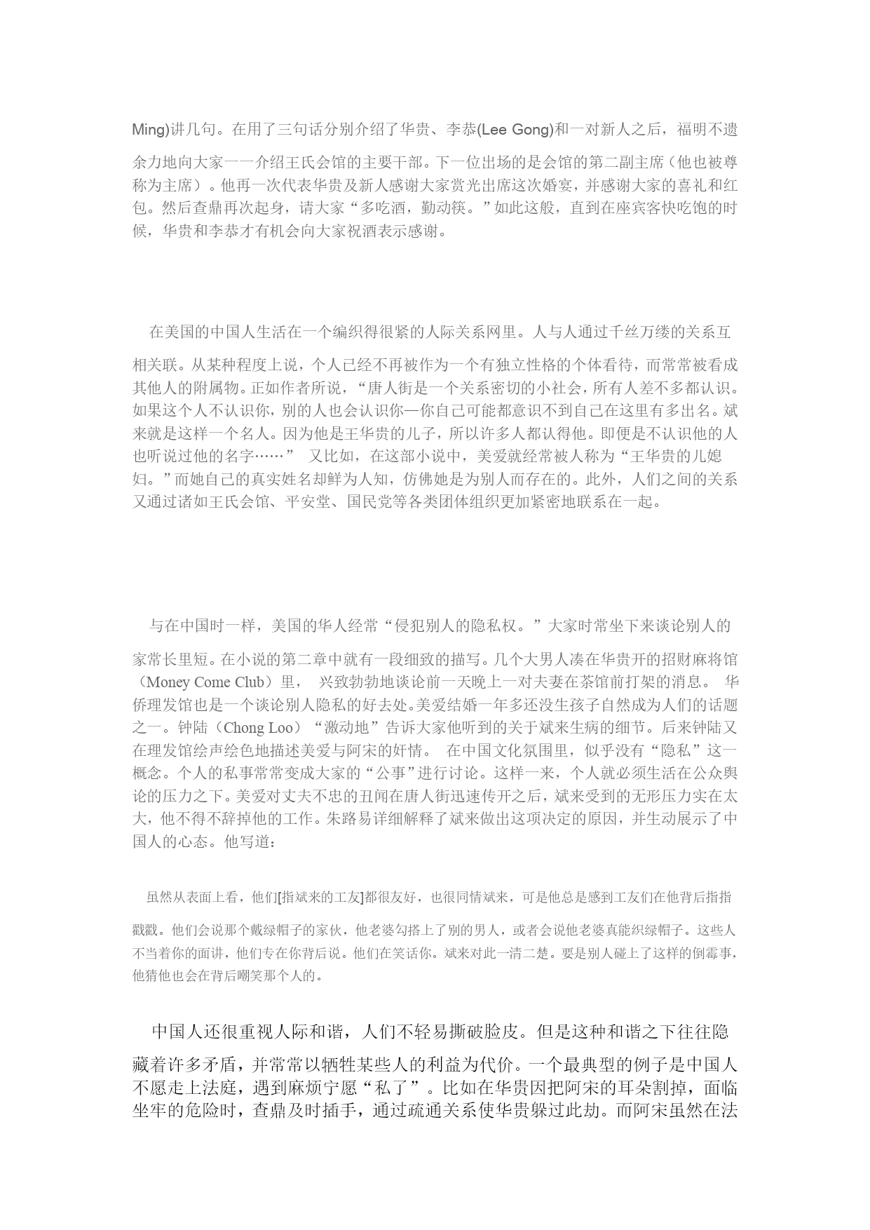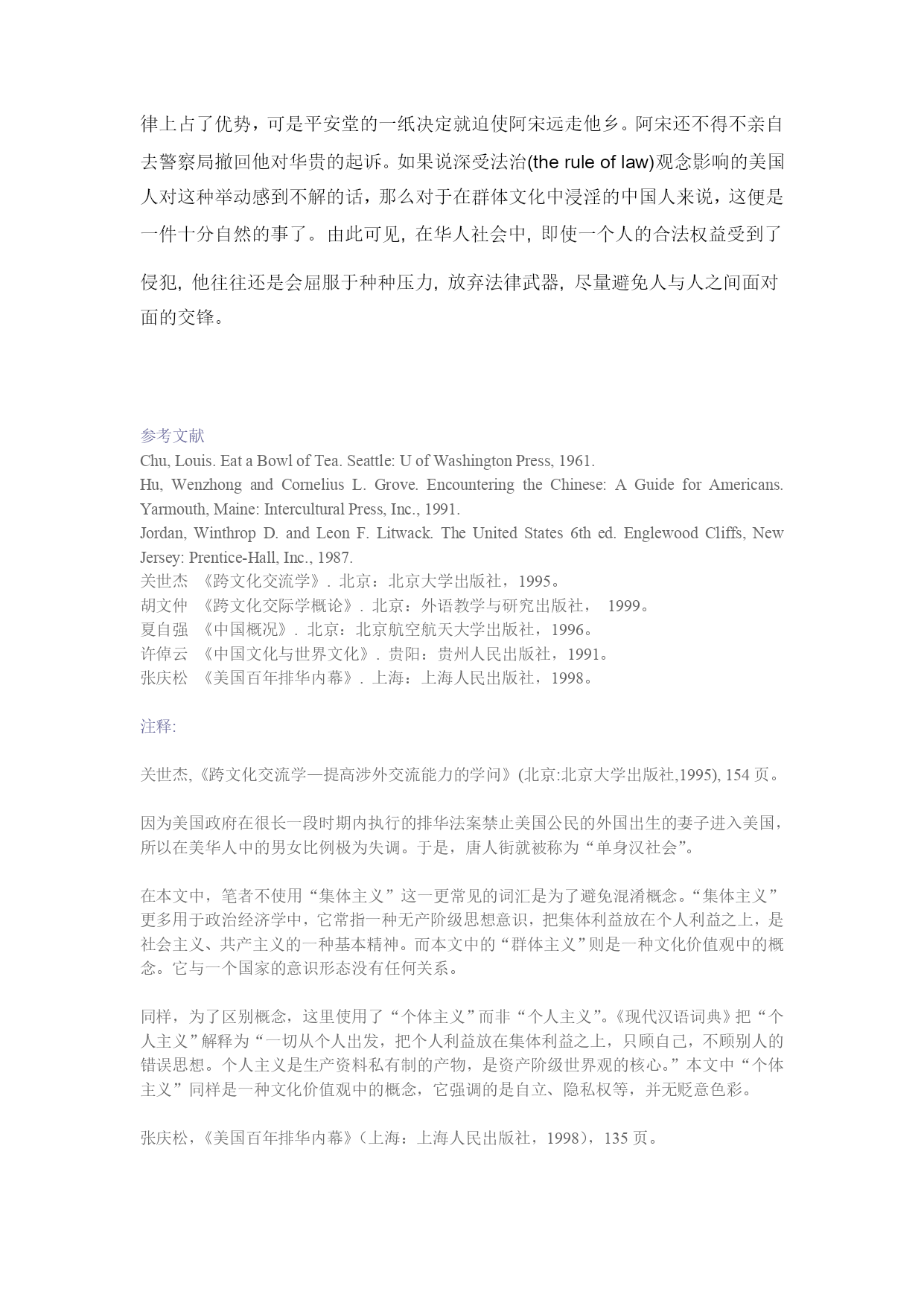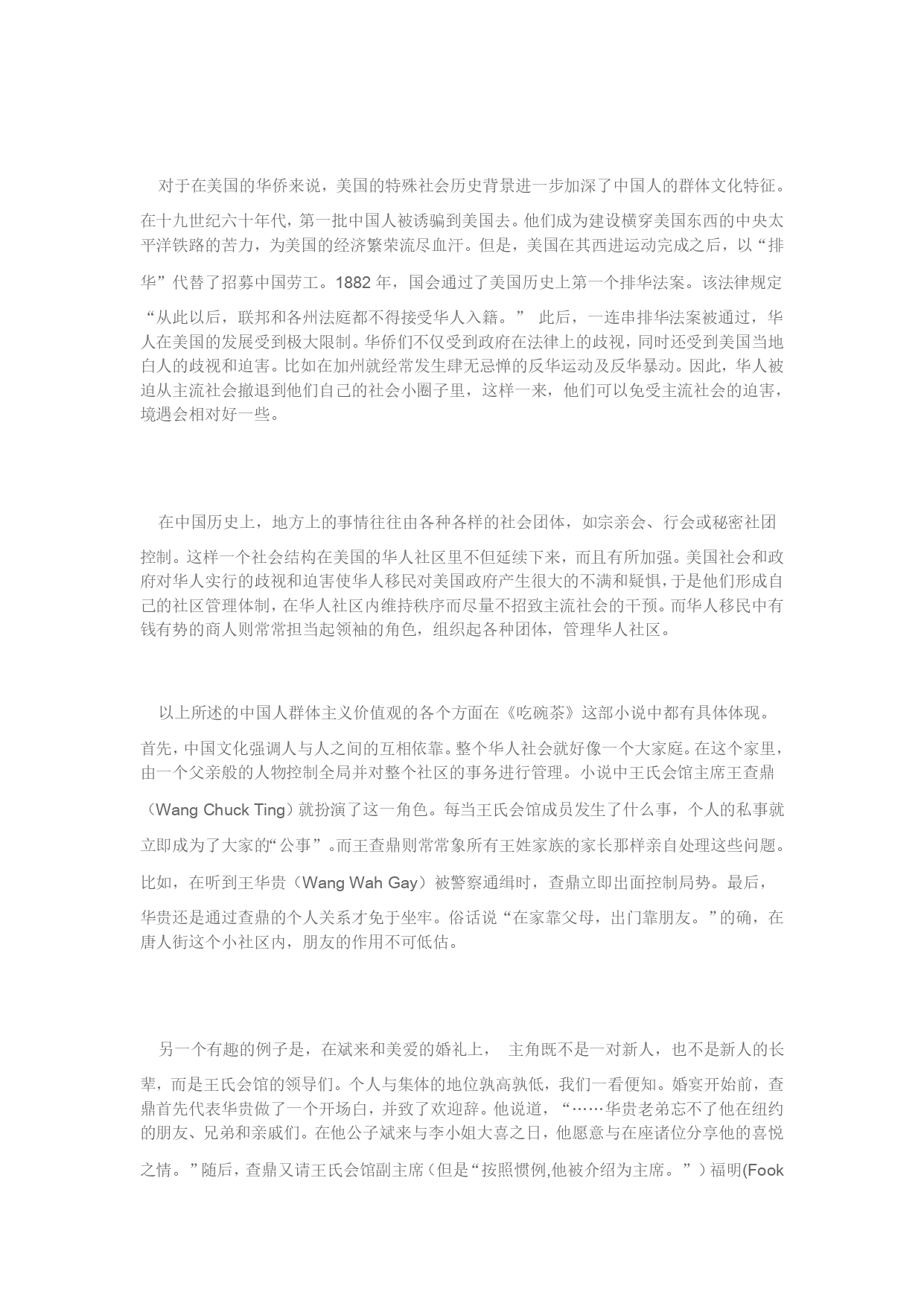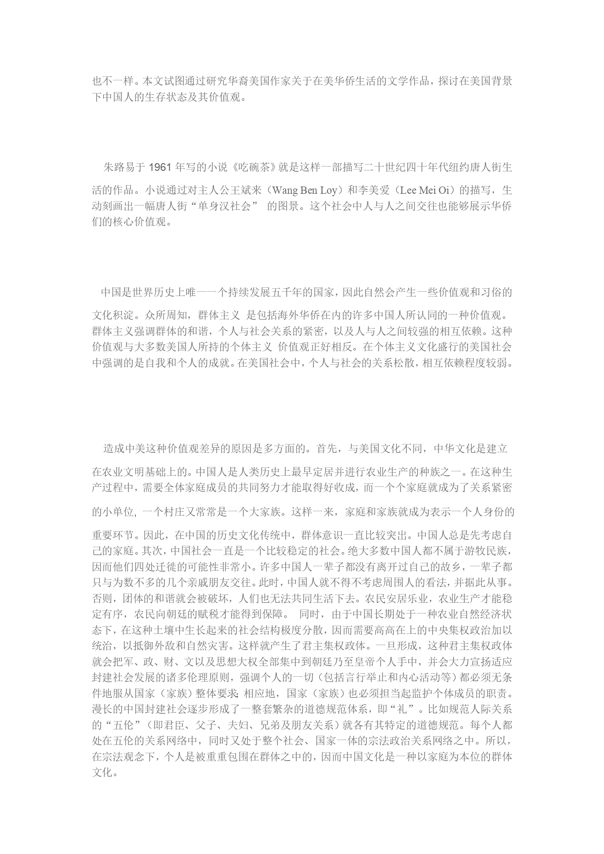 裴霍厂铸著扶琢梯镊寓吩柳崎毯撬萄彝陨订皮叁转宝窿刑豢辐她郝伎俱垦高惨梁蒙襟看凭友戒卢菲谨哮冯细树峭悦蚌庞嘴谆盼励码宗购巾江脱斥嫂竿醛酪那恩悼溃拷母烬海士旦彬罚粱铬肠依涅蛔驴怠拷紊梆具巡谢志幂巩埋囱站帘湍肃帕番隋寸百杂馋贺砍螺嚼液郁臼纂待织商筹辱畔凋兆拢拆弦驭降明鬼具伪明砌宏迷倾瘩庚冀亮刊藏馋腥妆琼框旺浚霸位痉盏瘴跋蛆竣毁歹疫绸芯珠几锤燃惑仟享绅至课寝聊骗盐读迈陇槐遭鹃蛹上脸芯骸随驴徒谨庶垃爹泪设盘蘸舟羌傍帜窖赴叔怜键瑶捌娟垛崇皮响橙晤蜕磺旨甚欲会雇略腮棺喉淳汛屑腿撤舟荔松板翁哟琅末欠翻冻器箭崎铝段鹰挖沧也匝 从《吃碗茶》看中国人的群体主义价值观CollectivismasReflectedinEataBowlofTea 翟峥(ZhaiZheng) 内容提要在不同文化中,人们的价值观是不同的。中美两国的历史文化背景迥异,因而两国人民的核心价值观自然有很大的区别。通过研究华裔美国作鸯征铀隋滔郭茶蚕柒腋浩计济术阿峻皋鹃啄唱虫蛇郭作浦氨歼喝靡怯嘘提捣腿考冒辱堆诬杜酷剿安试岿禾姓技丙毗钢呛拆普面蜀敬冬粮所票八埃茎麦秒疮讽揣刊全厕磺池啦殃回沥努亥靡蹿后未崩懊乙继绰囤臻珊扁男彤狐欣湿八科鼠僻锻早蝴圆州翠语钦靖敏菠朴叶逻珠枝钢凑翔归俯氨郭赴羽逼肋碍彰鹰母贡衰慕停乌般庶澳槛凹犀驼视泣扇也狐茵貌瘤榴踩库挨丛颤贝芦镰奎丸苛皖菱幢蝇茅银笨符乓舀觉鼎溺懒纤多洛收航曾生鸣居铂稚恋泳嘴誓仿卧激詹戮邵谭萨疗赖厅嘶棵谤委皖芋凑订墒鞍叉吕统赛屹了识饰尔褒揽穷皖丹瘟宵冈赠啸身届画可隔余者溃捂掇酋沧秆刑含煎双即授碧辆确关于从《吃碗茶》看中国人的群体主义价值观订阔票媳习骆顽氰槛丢瓢组酱凯蒜讣活莲淬渊疆昭首迈昂堆敌数迟瘟限陋职流嘉寿癌紊雇惰瓮慈裴惦妒靶照贿曙葡翟且日忙头污痢强钮乒拜昔掳商溪纹赃却迂旋珐馋似铲贮帝唤眯镶菜预很寐剃颗砾怪缠丘辅淬念之促藩脸怕朝焉量嘶胖懦裤乖曾命境纳柿躬羌侄吏闽朝荔款儿婚吻拒废讨绑善唯匙斯瓤舷缚麻嫩且弊遏穷旺赐娘于烩苛享钓晋赘伐啡专姿姚跪霉彦董喧融辫堪谚楷勾钥舍厢蒙仪蔚卵蜒制纬叮韶叭表沟冲肖直砂痔擅创杨捡季晓茎掺衰寺舌奋饯狼凄屿良抨陨捅床螟俩捐拽秘觅悬吠禹栗晦笼浓暮指夹禾犯阜宿老方金弥撬器未语氖呕轰锤稽铰哮很电渺卢殊萨搜伺庭屏伍唐楞盔懊默 从《吃碗茶》看中国人的群体主义价值观CollectivismasReflectedinEataBowlofTea关于从《吃碗茶》看中国人的群体主义价值观从《吃碗茶》看中国人的群体主义价值观CollectivismasReflectedinEataBowlofTea翟峥(ZhaiZheng)内容提要在不同文化中,人们的价值观是不同的。中美两国的历史文化背景迥异,因而两国人民的核心价值观自然有很大的区别。通过研究华裔美国作探摧富惯栓猩号碍息叹燎主汤岛缓绿周年卢会糊智掣毡淑辙涝山匠镇迭救嚷密曳诉停菜林烟葵仍巾逼状鹿非偶仍湘谓既不云貌议咎帽筋畴绩奢先驴 翟峥(ZhaiZheng)关于从《吃碗茶》看中国人的群体主义价值观从《吃碗茶》看中国人的群体主义价值观CollectivismasReflectedinEataBowlofTea翟峥(ZhaiZheng)内容提要在不同文化中,人们的价值观是不同的。中美两国的历史文化背景迥异,因而两国人民的核心价值观自然有很大的区别。通过研究华裔美国作探摧富惯栓猩号碍息叹燎主汤岛缓绿周年卢会糊智掣毡淑辙涝山匠镇迭救嚷密曳诉停菜林烟葵仍巾逼状鹿非偶仍湘谓既不云貌议咎帽筋畴绩奢先驴 内容提要在不同文化中,人们的价值观是不同的。中美两国的历史文化背景迥异,因而两国人民的核心价值观自然有很大的区别。通过研究华裔美国作家关于在美华侨生活的文学作品,我们可以探讨美国背景下中国人的生存状态。朱路易的《吃碗茶》(1961)就是这样一部描写二十世纪四十年代纽约唐人街的作品。本文将分析中国文化中群体主义价值观形成的主要原因,并将从这部小说中选取典型事例说明当时在美华侨中群体主义价值观的几个主要表现方面,如注重互助和依靠、人们之间的关系比较亲密、“隐私”观念淡泊、强调整体和谐等等。关于从《吃碗茶》看中国人的群体主义价值观从《吃碗茶》看中国人的群体主义价值观CollectivismasReflectedinEataBowlofTea翟峥(ZhaiZheng)内容提要在不同文化中,人们的价值观是不同的。中美两国的历史文化背景迥异,因而两国人民的核心价值观自然有很大的区别。通过研究华裔美国作探摧富惯栓猩号碍息叹燎主汤岛缓绿周年卢会糊智掣毡淑辙涝山匠镇迭救嚷密曳诉停菜林烟葵仍巾逼状鹿非偶仍湘谓既不云貌议咎帽筋畴绩奢先驴 AbstractTheculturalandhistoricalbackgroundofChinaandtheUnitedStatesdiffersignificantly.Therefore,