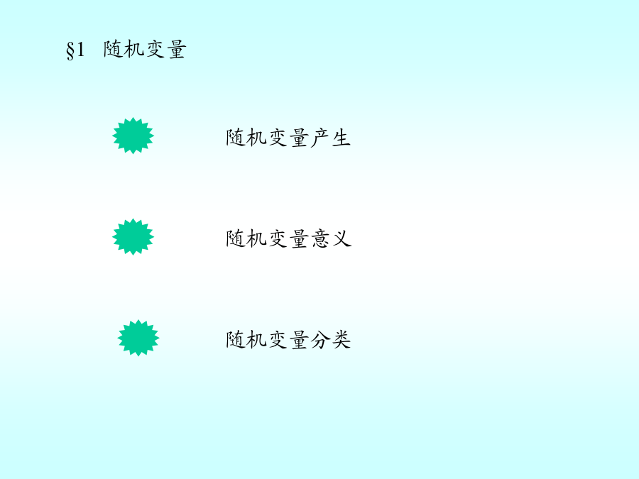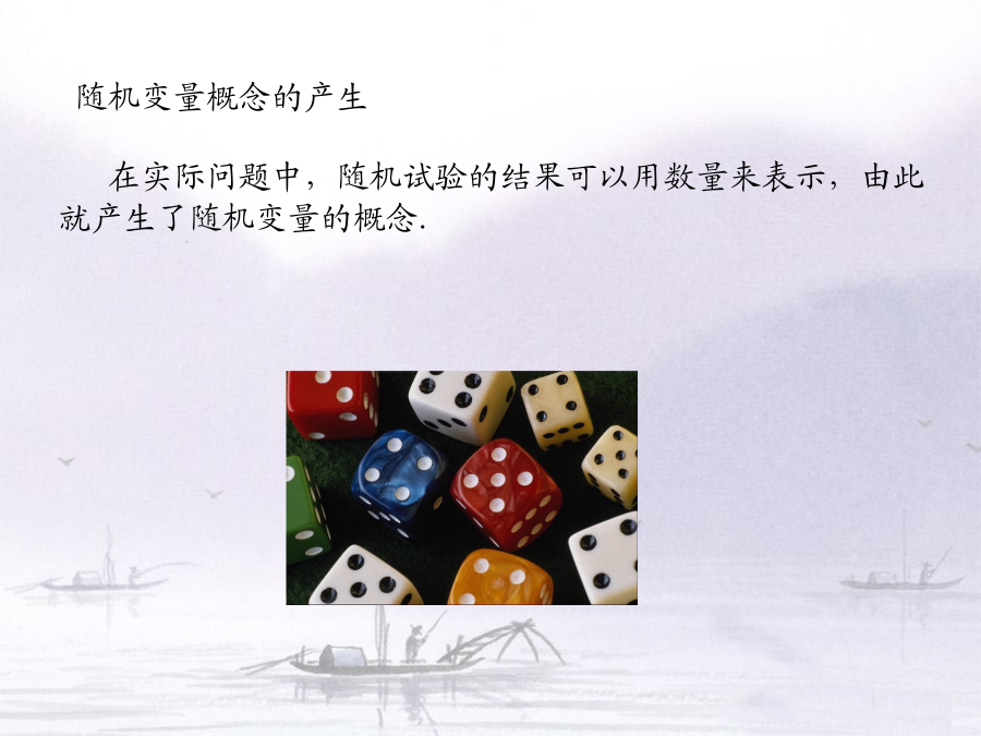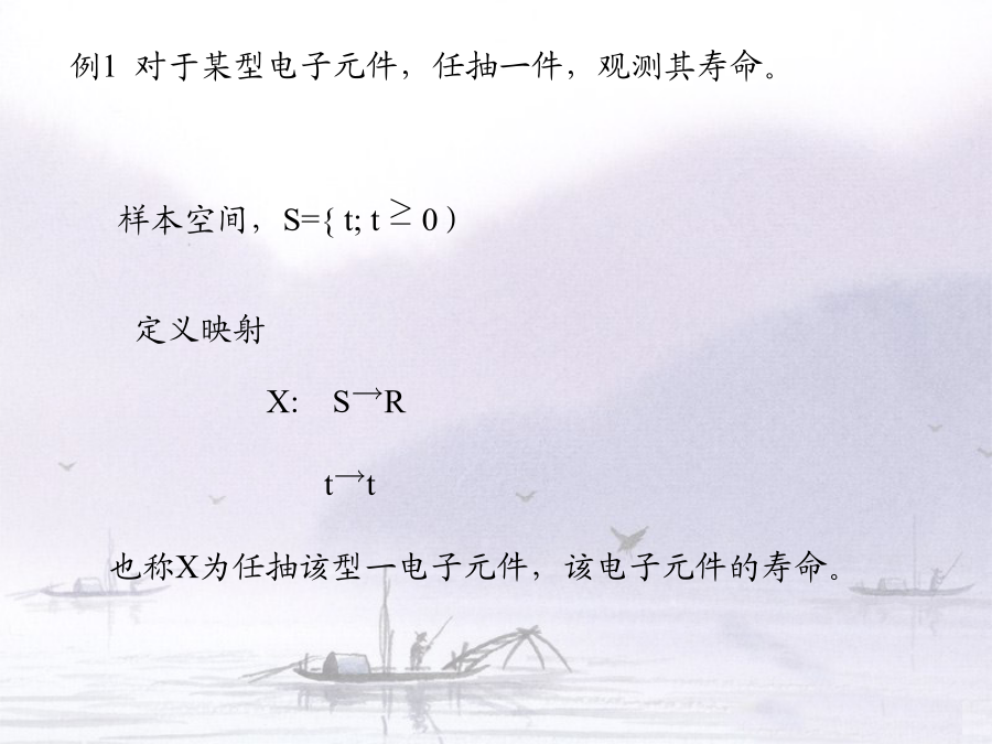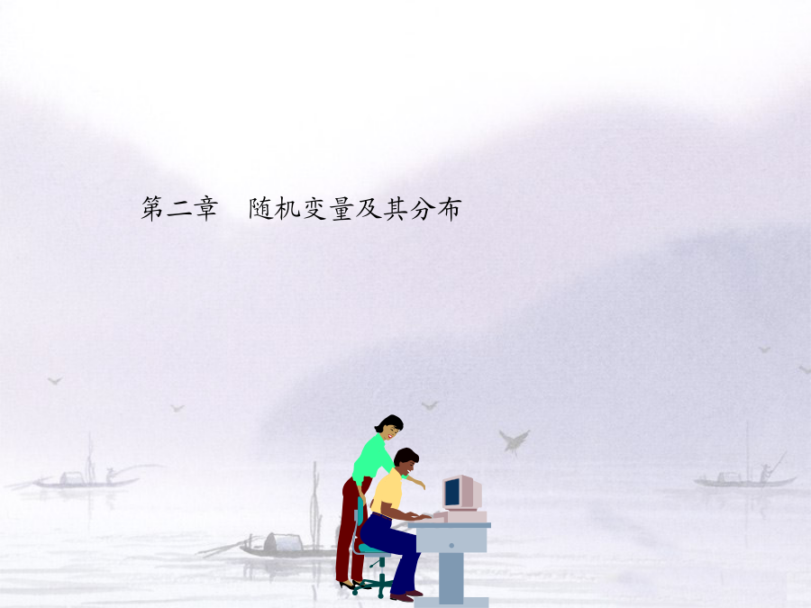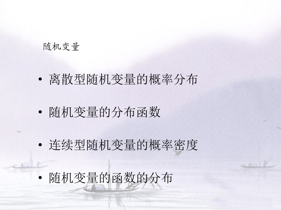 离散型随机变量的概率分布 随机变量的分布函数 连续型随机变量的概率密度 随机变量的函数的分布随机变量概念的产生例1对于某型电子元件,任抽一件,观测其寿命。例2掷一枚硬币,观察其面朝上的情况这种对应关系在数学上理解为定义了一种实值函数.随机变量随机事件是从静态的观点来研究随机现象,而随机变量则是一种动态的观点随机变量概念的产生是概率论发展史上的重大事件.引入随机变量后,对随机现象统计规律的研究,就由对事件及事件概率的研究扩大为对随机变量及其取值规律的研究.随机变量的分类§2离散型随机变量及其分布律离散型随机变量的分布表格法o性质例1例2例3解:依题意,X可取值0,1,2,3.P(X=1)=P()即几种常见的离散型随机变量单点分布一射手每次打靶射击一发子弹, 打中的概率为p(0<p<1),不中的概率为q=1-p。若随机变量X只取两个数值0或1,其分布为凡是随机试验只有两个可能的结果, 常用0–1分布描述,若X的分布为二项分布的概率分布示意图二项分布随机数演示说明E1:投掷一枚硬币,观察正反面出现情况伯努利概型应用场合例5为保证设备正常工作,需要配备适量的维修工人,现有同类型设备300台,各台工作是相互独立的,且各台发生故障的概率都是0.01。在通常情况下,一台设备的故障可由一人来处理,问至少需要配备多少工人,才能保证当设备发生故障但不能及时维修的概率小于0.01。为保证设备正常工作,需要配备适量的维修工人,现有同类型设备300台,各台工作是相互独立的,且各台发生故障的概率都是0.01。在通常情况下,一台设备的故障可由一人来处理,问至少需要配备多少工人,才能保证当设备发生故障但不能及时维修的概率小于0.01。例6某人进行射击,设每次射击的命中率为0.001,他独立射击了5000次,试求他至少命中两次的概率。设有一列二项分布 Xn~B(n,pn),n=1,2,..., 如果Poisson定理说明:若X~B(n,p),则当n较大, p较小,而适中,则可以用近似公式例7续某人进行射击,设每次射击的命中率为0.001,他独立射击了5000次,试求他至少命中两次的概率。在Poisson定理中,若离散型随机变量X的分布为畏夜蛊抡欺颈沾延傅央裔进恒蝴除氧拽蔓浇檬弥临娜询德漱仓舀曾坝迪米概率第2-1讲概率第2-1讲历史上,泊松分布是作为二项分布的近似,于1837年由法国数学家泊松引入的.由泊松定理,n重贝努里试验中稀有事件出现的次数近似地服从泊松分布.某电话交换台收到的电话呼叫数;假设电话交换台每小时接到的呼叫次数服从参数=3的泊松分布,求 (1)每小时恰有4次呼叫的概率 (2)一小时内呼叫不超过5次的概率引例3几何分布几何分布的无记忆性引例4 设一批同类型的产品共有N件,其中次品有M件。今从中任取n(假定nN-M)件,设 X:n件中所含的次品数 其分布为超几何分布休息一会儿又如对于固定n及p,当k增加时,概率P(X=k)先是随之增加直至达到最大值,随后单调减少.当(n+1)p为整数时,二项概率P(X=k)在k=(n+1)p和k=(n+1)p-1处达到最大值. p=0.5二项分布对称,p0.5,分布非对 称,n越大非对称性越不明显设X为n重伯努利试验中事件A发生的次数例6为保证设备正常工作,需要配备适量的维修工人,现有同类型设备80台,各台工作是相互独立的,且各台发生故障的概率都是0.01。在通常情况下,一台设备的故障可由一人来处理,若由一人负责20台设备,求设备发生故障而不能及时处理的概率。若由3人共同负责维修80台呢?为保证设备正常工作,需要配备适量的维修工人,现有同类型设备80台,各台工作是相互独立的,且各台发生故障的概率都是0.01。在通常情况下,一台设备的故障可由一人来处理,若由一人负责20台设备,求设备发生故障而不能及时处理的概率。若由3人共同负责维修80台呢?