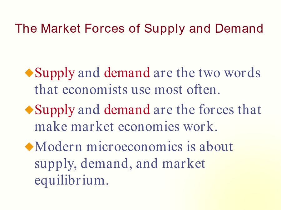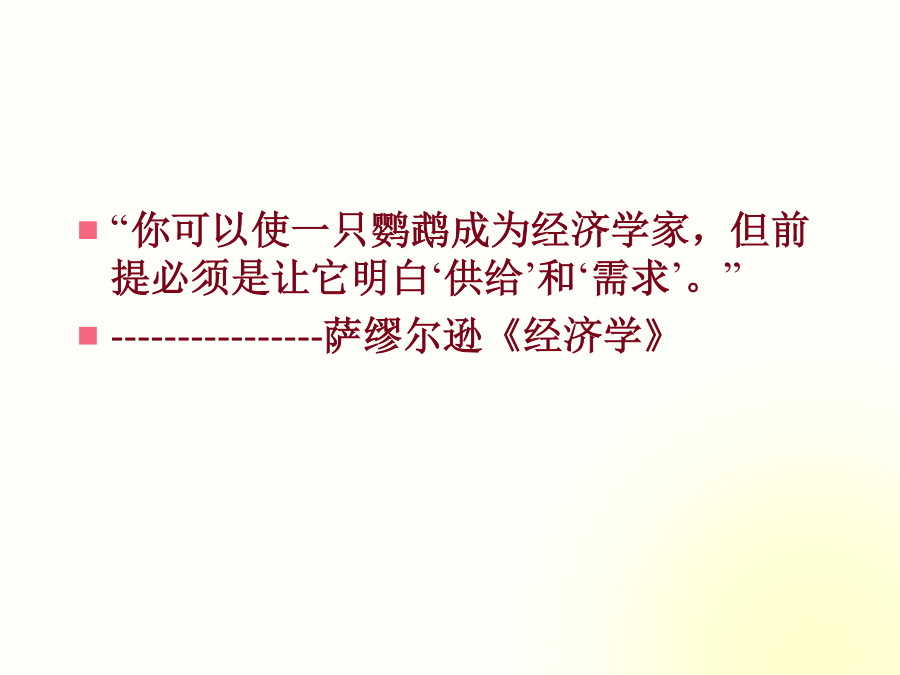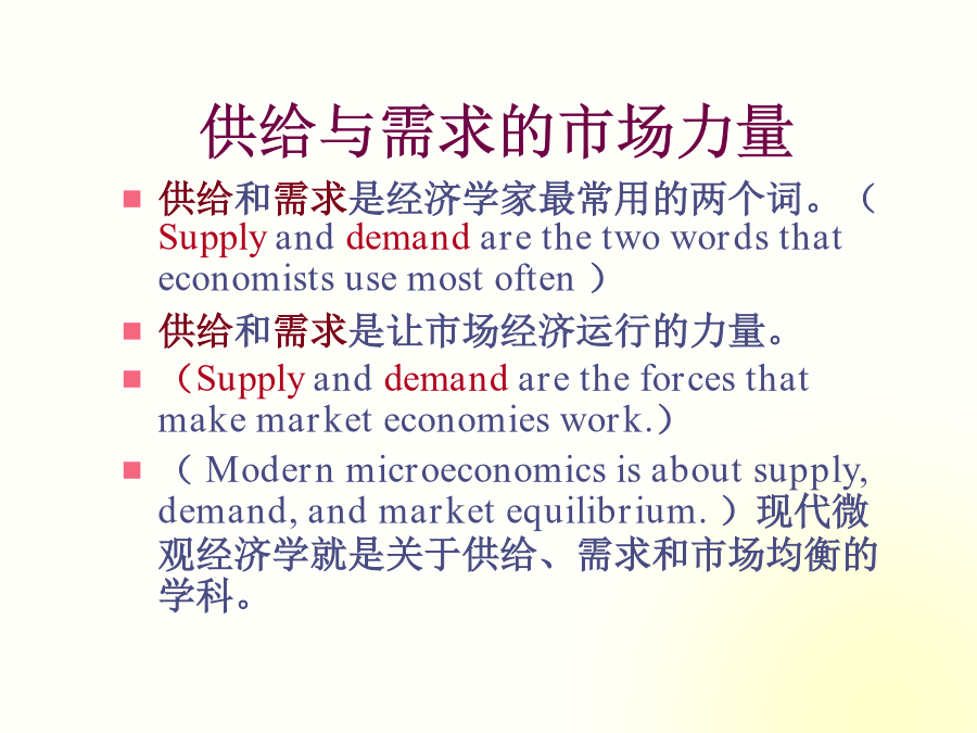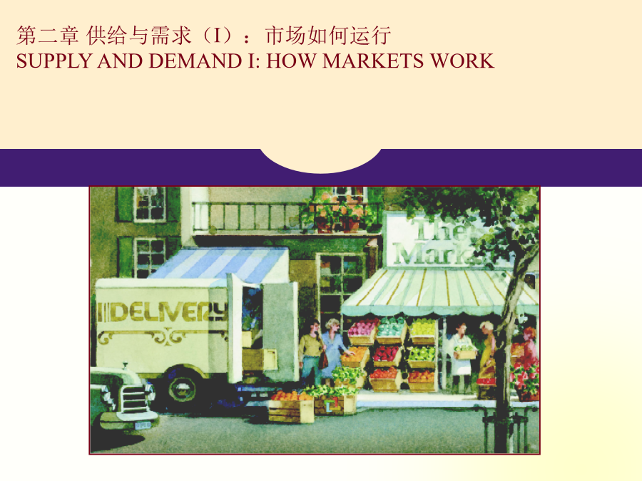 第二章供给与需求(I):市场如何运行 SUPPLYANDDEMANDI:HOWMARKETSWORK 思考:TheMarketForcesofSupplyandDemand供给与需求的市场力量Markets市场Marketsandcompetition市场与竞争ACompetitiveMarket完全竞争市场CompetitiveMarket完全竞争市场Competition:PerfectandOtherwiseCompetition:PerfectandOtherwise竞争:完全及其它Demand需求LawofDemand需求规律DemandSchedule需求表Catherine’sDemandSchedule凯瑟琳的需求表DemandCurve需求曲线Figure1Catherine’sDemandScheduleandDemandCurve(Catherine’s的需求表和需求曲线)MarketDemandversusIndividualDemand市场需求和单个消费者需求ChangeinQuantityDemandedversusChangeinDemand需求量的变化与需求的变化0ChangeinDemand需求的变化Non-priceDeterminingVariablesofDemand需求的非价格决定因素Figure2Catherine’sDemandScheduleandDemandCurveConsumerIncome消费者收入ShiftsintheDemandCurve需求曲线的移动ConsumerIncomeNormalGood消费者收入正常商品ConsumerIncomeInferiorGood消费者收入劣等品PricesofRelatedGoodsSubstitutes&Complements相关物品的价格替代品和互补品Table1VariablesThatInfluenceBuyers影响消费者需求的因素Supply供给LawofSupply供给规律SupplySchedule供给表Ben’sSupplySchedule供给表SupplyCurve供给曲线Figure5Ben’sSupplyScheduleandSupplyCurve()MarketSupplyversusIndividualSupply市场供给和单个厂商供给ChangeinQuantitySuppliedversusChangeinSupply供給量的变化与供给的变化ChangeinQuantitySupplied供应量的变化ChangeinSupply供给的变化Non-priceDeterminingVariablesofSupply供给的非价格决定变量ShiftsintheSupplyCurve供给曲线的移动Table2VariablesThatInfluenceSellersSUPPLYANDDEMANDTOGETHER供给与需求的结合SupplyandDemandTogetherFigure8TheEquilibriumofSupplyandDemandSupplyandDemandTogether供给与需求的结合Figure9MarketsNotinEquilibriumEquilibrium均衡Figure9MarketsNotinEquilibriumEquilibrium均衡ThreeStepsToAnalyzingChangesinEquilibrium分析均衡变动的三个步骤HowanIncreaseinDemandAffectstheEquilibrium需求增加如何影响均衡S2S2Summary小结Summary小结Summary小结Summary小结