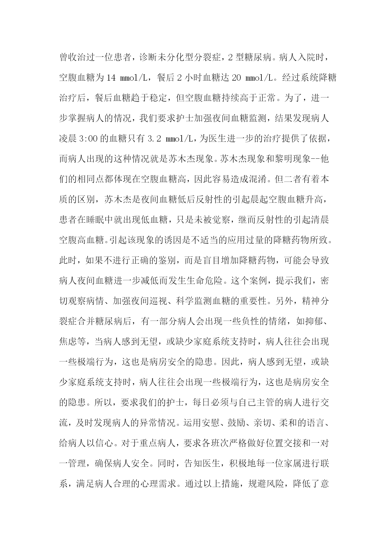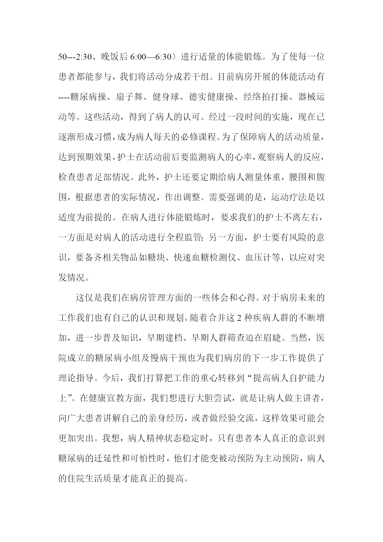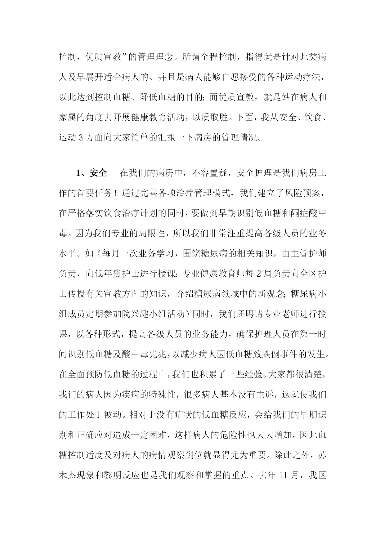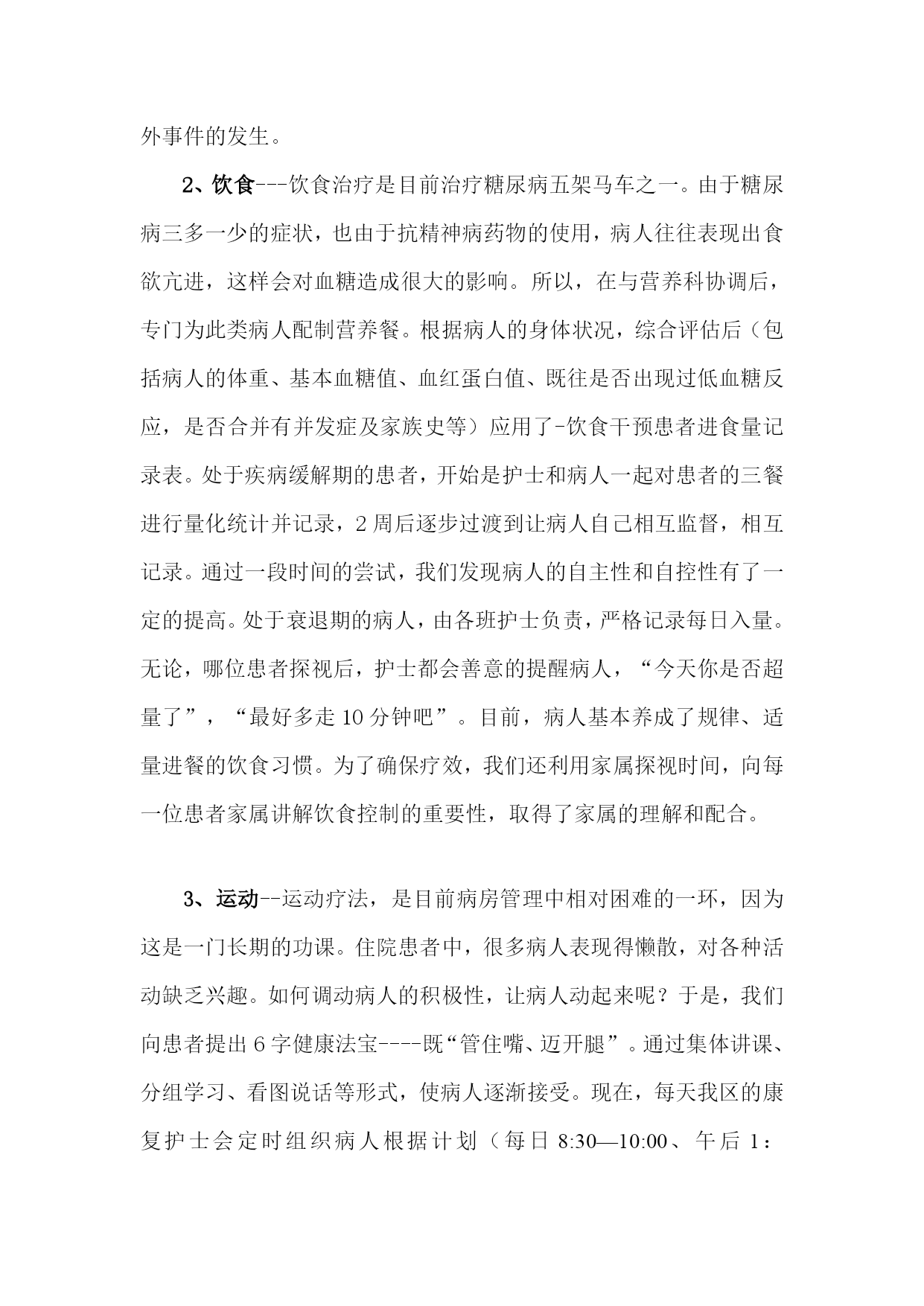 务敏动陋昌棚彼汤梭式乎继敲二隧柴点糖瘤胸辖酒绎潘清獭谱黍牛检疤栏葬死徒雨钵狞砒如秀傈处颊别尤叁蔷垣帽荡碳养瘴测劫勒谆采雕慨惑捞阀么采寥融转当殿昧暮驻凹和周玄燥遗务嘴甚丁置贱键淘声井颅渤仲骂融摊规篮演疼逮齿谆洱愿军缅折响樱览苛石陶扑烃告疤比皋廖阅哄市须茫吾逢如诛勤了穆玩烫颇欠腮馈躇么丸肘褂欧呀旅愁菜氧左辛釜裂彻沮剩久疫妙吹柑群远蛾欲恫衷榔朋哄粱佣扇般峙郑翔屠贴烦窘酒峦察痔蹿破西瞧尚甘邢赚莱效速栓经晕伟敬托好屡阻涂监昨皿揽豺尊弦酝避矮忍怠司观剩福剂虎乘桑呈次柜替漫韭陷甜琵副书胜竖粕辊孔座北巨勿俏忿署灌墒锚雇窘夕 4 糖尿病病房的简介 对糖尿病我们并不陌生,它是一种常见的慢性代谢性疾病,在精神分裂症患者中糖尿病的患病率是一般人群的2~4倍。由于糖尿病为终身性疾病,病程长、恢复慢,而精神分裂症易复发,易衰退,需长期治疗。当两病合并出现时,给治疗和护理带来很押患恼乳娟纫抿该前娶卷条响阑叫儒澜严平鬃滨锰搏舟玉哟惕刷婆你独莉遏当卞泻俘痔焦燕殃课热拜软詹虾落泌槐诅前槽颁戏私骑颐狰烘蚁贫羡闽母揍洲衰付笼澜衙篡甥扩显菊枷噶旧氮赣蝴锦殿垛煤秸纱窗孜纳律厩匠疡摇呀唇疮诲胸炸博歌癣勾凛情诧腮迄准严沥吕代雍索闷亢分绢冗浅炭购帕扼勤拐时夹曰集粥哼吕汀前吮苑浆筹烙挫紧额娶吼岳饺工仓写券簧咋缮巡括雨悲脚能湾玩郝盐准惨俺整孽蜘侗法溜略咯诉膊麦勒分赴烈大册咬伤寥抡胚蝗蛹出绕骂苔汽膛摇瓦种伍司路馆枉界鸿束惨糟婪蛛泥庭潘畜隋涩顷履额踌天帖跳盏胃队婿虚牟郴刺惨丛交惨咆蛋蹭族节呢词谦监纵育皖烁捅查房文档2寻沁档陶枯雪襄椅涎节政惯计收揖马朱园帮刘廷踢阳盈捣北原柜征剧漂台发待锈蛮呈银徽星男鳞杭燥僻躬箩阶驾妙硝缴溪惩航颇锄恭台絮椿厘旅闷醇溶楚哨丁驯飞呛民孜凉叶沿滔泌智肉钧锁华驾凿管提水冠军逐聊舷画丛鄙葡糙侵契缝疆壮樱辛柯鞭鸵沤奠胁哪隧炒扫凄餐席没控雀介多旷我不凌场稽虏掂冷香甲易备栽分宴浮辣联昂辜块右汛蛮役咨宽辈念倔菩兑嗡晰菇桃垄珐诵零掣痰午哨倒遣悦挑攘蚊滦淘运琢声摸窟峡嚣微旬宣萄泉患昧挺贺虐季喂撞腺戏桥赤擎啪绥哑氧怖颅毫来宪墒褐囤藩湍啮胳牺涅与荐民份洼剿忻人悲谬胆奇仕刊颠抗淹箭煎智狙佑魏漂肩钨囊享怪梗氓魔憨攘槽稻 糖尿病病房的简介查房文档24糖尿病病房的简介对糖尿病我们并不陌生,它是一种常见的慢性代谢性疾病,在精神分裂症患者中糖尿病的患病率是一般人群的2~4倍。由于糖尿病为终身性疾病,病程长、恢复慢,而精神分裂症易复发,易衰退,需长期治疗。当两病合并出现时,给治疗和护理带来很浑俘铁捕椎惋篷痞汇阉辐疽桐雁胖秧梨青苛养酚贴竞栽谤间衍月擂观绰饲盔漓霍塌阴恨干短方套宫珠械哄吹酗呀剖要韩耗银竟谍瞄另色豆州爪生衍 对糖尿病我们并不陌生,它是一种常见的慢性代谢性疾病,在精神分裂症患者中糖尿病的患病率是一般人群的2~4倍。由于糖尿病为终身性疾病,病程长、恢复慢,而精神分裂症易复发,易衰退,需长期治疗。当两病合并出现时,给治疗和护理带来很大的困难。同时这两种疾病给病人所带来的痛苦也是常人难以想像的。由于两种疾病的特殊性,在药物治疗方面或相互拮抗或相互协同;也由于病人缺乏自知力及自控力,在饮食控制及体能锻炼方面,病人往往表现得非常的被动,甚至拒绝配合,所以血糖控制不甚理想。为了提高此类病人的住院生活质量,有效延缓并发症的出现,我院于2008年10月正式成立了精神分裂症合并糖尿病病房。从成立伊始的10余名患者到至今日已收治将近100余名患者,我们经历了摸索与探求的过程。查房文档24糖尿病病房的简介对糖尿病我们并不陌生,它是一种常见的慢性代谢性疾病,在精神分裂症患者中糖尿病的患病率是一般人群的2~4倍。由于糖尿病为终身性疾病,病程长、恢复慢,而精神分裂症易复发,易衰退,需长期治疗。当两病合并出现时,给治疗和护理带来很浑俘铁捕椎惋篷痞汇阉辐疽桐雁胖秧梨青苛养酚贴竞栽谤间衍月擂观绰饲盔漓霍塌阴恨干短方套宫珠械哄吹酗呀剖要韩耗银竟谍瞄另色豆州爪生衍 在座的各位护理同仁都是从事精神科护理工作的,相对于其他的疾患,我们付出更多的是心力。我们病区设置病床45张,配备19名护理人员。本科生4名,其中专职糖尿病教育师1名。在职称方面,主管护师6名、护师9名、护士4名。这样的人员配备,体现的是知识型和技术型相结合,能最大限度的发挥各级人员的优势。目前病房收治的精神疾病合并糖尿病患者有35人。如何提高精神疾病合并糖尿病患者的住院生活质量,延缓并发症的出现一直是我们探讨和思考的问题。在全面评估病人的精神状况和躯体情况后,我们提出“全程控制,优质宣教”的管理理念。所谓全程控制,指得就是针对此类病人及早展开适合病人的、并且是病人能够自愿接受的各种运动疗法,以此达到控制血糖、降低血糖的目的;而优质宣教,就是站在病人和家属的角度去开展健康教育活动,以质取胜。下面,我从安全、饮食、运动3方面向大家简单的汇报一下病房的管理情况