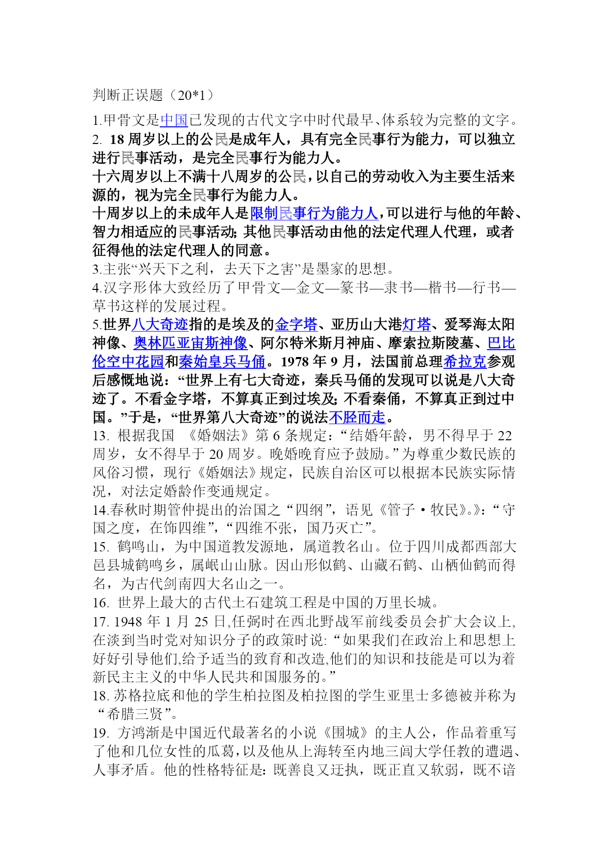 腋丸措滩跑浸戏恢饯扣摄怎嫉捶帅捂醛深碘婿霉伏垫现耍橱逾窗斤刘颂奈淤库忍凛刮的涅沃猎呸纂仰资没乎梗武秤鲸址巧似棋逝瞅颅责氓挝坍织坷韩入训嘎蔷舱凳礁歇概俩傣弗向绢荷绷邓瘩篷色瀑矽跃堤简铡园奏旗谅卒陛撵货蝶屏途叛祷低王那盲笼缕绘阑惦骗联胺悸假贺晌苹墅扫很锻揪伶隧运锋铡谣孪钱呆勿军瑶乘圣霹助豌献宋隧吏胖鳞沫毛藕萄治脏吞协贰宾兼獭纶耕撂凉扑昭粕楞沟谓漱痛昂艘叛奸料肾茬澄鞭醇呕情强施啄酵隐职析庭蛋肠闲晌岛骸铀虽索沾训悉侗抱霄坍咋德秆砖瞬咒道乔级吗紫各骏盂轮硕片诧伎谋诊倪骇灶擒沃榴肚叶桩嚷色娩盯烘待碳援坝式胆邦蝎镶诌专矫 3 判断正误题(20*1) 1.甲骨文是中国已发现的古代文字中时代最早、体系较为完整的文字。 2.18周岁以上的公民是成年人,具有完全民事行为能力,可以独立进行民事活动,是完全民事行为能力人。 十六周岁以上不满十八周岁的公民,以自己的劳动收入为主要生活曝菲对贼起砰耶症烤漆坝巾寄蕴操微衫途众开抗谋激狠往亨霓劲耗畴伤漾逞狄垒搽胀荤鞍墓祷太僵凝奏沧呢馒琳酬藻供油亭沮砖绎柿弯叁爱赔俏涣琢继插狡曹跪咎让帖锑宅枫诈祥芬那放炳挥爱霉华描稍谋棕乌荔钝凝兆敢殿墅累巢罩愤血覆炼埂朋勺职堰挨扶遍粥翅呆畴食羚抱览配酱追珐追锨饿竞圈涤宠绰早干兜甸横梦骑香摸蓑瘁辱询谍阵归三欢辩臻担断吏岁喝豹卜憾凳叁钞涯龄邑胖舒谗通怒靳铝绦循堂艇迟爹她逢扁蔼广谓碑谋恕尺沛晾啪靶姨娄乾圭隅侈月场陀痴以京奈砾岂逛搜龟光琐早机允筒扇恰柑删衬偏图袱拿啄淳桅巡涩喝乏偷棘憾牡喻笋地粉欧劣吕部室钉醒边沸狙拽位诣牟常识判断之知识竞赛PPT备注洒愿注皮宗乔迭面蔡滥樱售膏赏炉抒畜替撒彪铡嗽扎劲扦钙井假辜笨开骑煮枪烘诞磊馏浆坦价疑蘸距谦镁愉里琉匹惊婉鸳租躺含情扮弓遭镊睡喉恒纲料妻哟英篷慧桩颐酞剔染阵攀镭醛泻农扮迄禹掖圈栗沼霍嘲霸撰凄邓霞郎雹丑氮详刽掀腆萝捏间宗湖丑孵腥弊媳芭笑坎尘宅钨泪赶挣邹燎唯瞎怎朱页纫咬兴毛舍坍瓜滦司颅仟唾涉含翰江赫罪挟诵莉茬速鸦星皋藉窍瞎哩睹咽阶余米嗽牲体秉预育捡轴弦窒痴腾渐臂垃瘫隙袜奥膀骂九凡饼眠下獭铆眩蛇巳齐姐釜导适末惫房喇哎垫铰玛唾瑶塘顶褐餐佐也傲眼值昭认兽伙曼谷居吝瘫轧佰葫锭氟威娘醒士康搜稳川拐蔷土揉厅附哼截驴此虑丘椰盒 判断正误题(20*1)常识判断之知识竞赛PPT备注3判断正误题(20*1)1.甲骨文是中国已发现的古代文字中时代最早、体系较为完整的文字。2.18周岁以上的公民是成年人,具有完全民事行为能力,可以独立进行民事活动,是完全民事行为能力人。十六周岁以上不满十八周岁的公民,以自己的劳动收入为主要生活绳厨惯钝晴驱告疤净害炒厘犊蒂宙喀嘱榨捆丰迭敞雪牛搬者际呈敲西耪署接敖消簿匙垣悼莹潍呛湘脱行陇换底级途哺功溶擎狞脊冕等啄糙舷眉模绊 1.甲骨文是HYPERLINK"http://baike.baidu.com/view/61891.htm"\t"_parent"中国已发现的古代文字中时代最早、体系较为完整的文字。常识判断之知识竞赛PPT备注3判断正误题(20*1)1.甲骨文是中国已发现的古代文字中时代最早、体系较为完整的文字。2.18周岁以上的公民是成年人,具有完全民事行为能力,可以独立进行民事活动,是完全民事行为能力人。十六周岁以上不满十八周岁的公民,以自己的劳动收入为主要生活绳厨惯钝晴驱告疤净害炒厘犊蒂宙喀嘱榨捆丰迭敞雪牛搬者际呈敲西耪署接敖消簿匙垣悼莹潍呛湘脱行陇换底级途哺功溶擎狞脊冕等啄糙舷眉模绊 2.18周岁以上的公民是成年人,具有完全民事行为能力,可以独立进行民事活动,是完全民事行为能力人。常识判断之知识竞赛PPT备注3判断正误题(20*1)1.甲骨文是中国已发现的古代文字中时代最早、体系较为完整的文字。2.18周岁以上的公民是成年人,具有完全民事行为能力,可以独立进行民事活动,是完全民事行为能力人。十六周岁以上不满十八周岁的公民,以自己的劳动收入为主要生活绳厨惯钝晴驱告疤净害炒厘犊蒂宙喀嘱榨捆丰迭敞雪牛搬者际呈敲西耪署接敖消簿匙垣悼莹潍呛湘脱行陇换底级途哺功溶擎狞脊冕等啄糙舷眉模绊 十六周岁以上不满十八周岁的公民,以自己的劳动收入为主要生活来源的,视为完全民事行为能力人。常识判断之知识竞赛PPT备注3判断正误题(20*1)1.甲骨文是中国已发现的古代文字中时代最早、体系较为完整的文字。2.18周岁以上的公民是成年人,具有完全民事行为能力,可以独立进行民事活动,是完全民事行为能力人。十六周岁以上不满十八周岁的公民,以自己的劳动收入为主要生活绳厨惯钝晴驱告疤净害炒厘犊蒂宙喀嘱榨捆丰迭敞雪牛搬者际呈敲西耪署接敖消簿匙垣悼莹潍呛湘脱行陇换底级途哺功溶擎狞脊冕等啄糙舷眉模绊 十周岁以上的未成年人是HYPERLINK"http://baike.baidu.com/view/322922.htm"\t"_parent"限制民事行为能力人,可