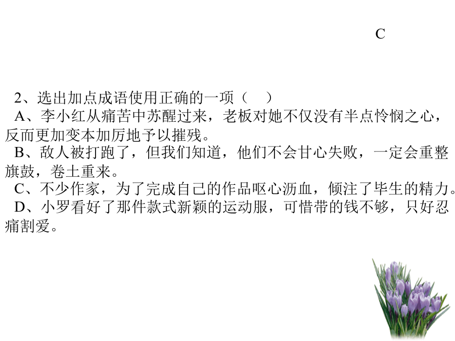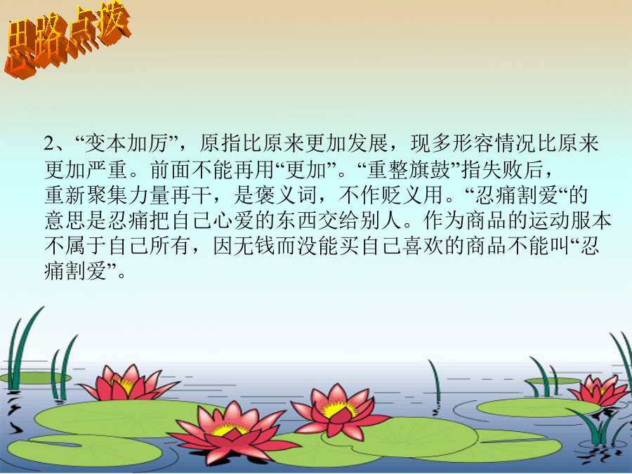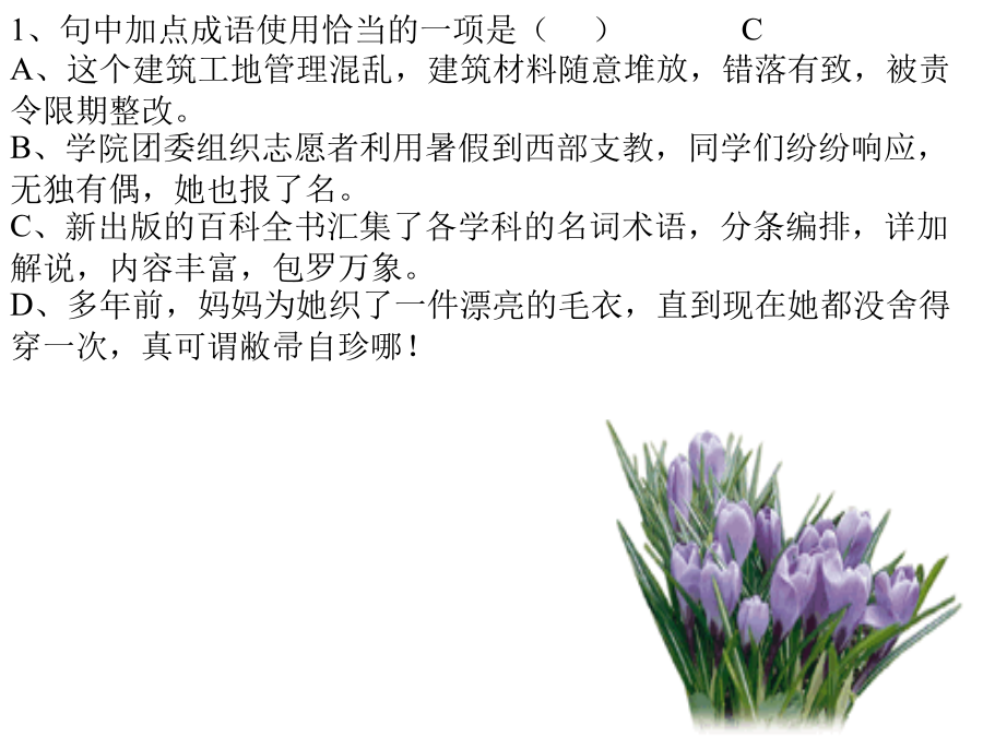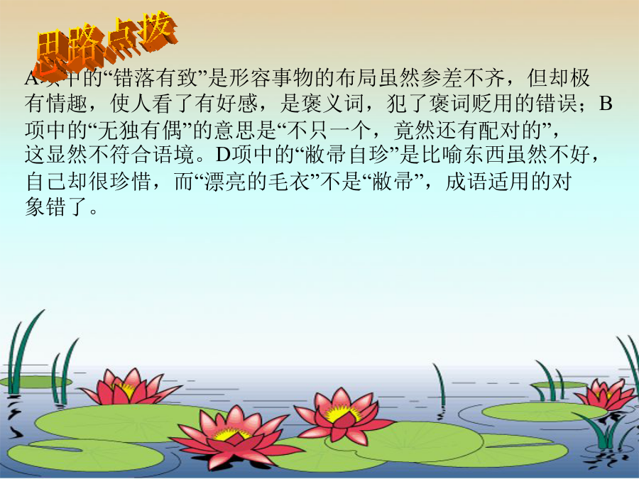 08年中考第一轮复习1、句中加点成语使用恰当的一项是() A、这个建筑工地管理混乱,建筑材料随意堆放,错落有致,被责令限期整改。 B、学院团委组织志愿者利用暑假到西部支教,同学们纷纷响应,无独有偶,她也报了名。 C、新出版的百科全书汇集了各学科的名词术语,分条编排,详加解说,内容丰富,包罗万象。 D、多年前,妈妈为她织了一件漂亮的毛衣,直到现在她都没舍得穿一次,真可谓敝帚自珍哪!A项中的“错落有致”是形容事物的布局虽然参差不齐,但却极有情趣,使人看了有好感,是褒义词,犯了褒词贬用的错误;B项中的“无独有偶”的意思是“不只一个,竟然还有配对的”,这显然不符合语境。D项中的“敝帚自珍”是比喻东西虽然不好,自己却很珍惜,而“漂亮的毛衣”不是“敝帚”,成语适用的对象错了。2、选出加点成语使用正确的一项() A、李小红从痛苦中苏醒过来,老板对她不仅没有半点怜悯之心,反而更加变本加厉地予以摧残。 B、敌人被打跑了,但我们知道,他们不会甘心失败,一定会重整旗鼓,卷土重来。 C、不少作家,为了完成自己的作品呕心沥血,倾注了毕生的精力。 D、小罗看好了那件款式新颖的运动服,可惜带的钱不够,只好忍痛割爱。思路点拨3、下列句子中成语使用不恰当的一句是() A.翘首西望,海面托着的就是披着银发的苍山。苍山如屏,洱海如镜,真是巧夺天工。 B.虽然没有名角亲自传授指点,但他长年在戏园子里做事,耳濡目染,各种戏路子都熟悉了。 C.每当夜幕降临,饭店里灯红酒绿,热闹非常。 D.高县长说:“全县就你一个人当上了全国劳模,无论怎么说也是凤毛麟角了!”4、下列句子中成语使用不当的一句是() A、公司能有今天的规模并在社会上享有这么高的知名度,是他苦心孤诣地经营的结果。 B、我本来就对那里的情况不熟悉,你却硬要派我去,这不是差强人意吗? C、这篇论文观点新颖,论据有力,材料丰富,文字精当,堪称不刊之论。 D、大熊猫憨态可掬,小猴子顽皮可爱,使得周围的大人们忍俊不禁,孩子们更是笑得前仰后合。5.依次填入下列各句方框里的成语,与句意最贴切的一组是() ①无锡的梅园,面临太湖,以梅饰山,以山饰梅,□□□□。 ②苏轼也擅长书法,他取法颜真卿,但能□□□□,与蔡襄、黄庭坚、米芾并称宋代四大家。 ③这本侦破小说,构思新颖,□□□□,值得一看。 ④电影中有几处看来是闲笔,实际上却是□□□□之处。 A.别具一格、不落窠臼、匠心独运、独树一帜 B.独树一帜、别具一格、匠心独运、不落窠臼 C.匠心独运、不落窠臼、独树一帜、别具一格 D.别具一格、独树一帜、不落窠臼、匠心独运6.下列句子中,成语使用正确的一句是() A.这些年轻的科学家决心以无所不为的勇气,克服重重困难,去探索大自然的奥秘。 B.陕西剪纸粗犷朴实,简练夸张,同江南一带细致工整的风格相比,真是半斤八两,各有千秋。 C.第二次世界大战时,德国展开了潜艇战,于是使用水声设备来寻找潜艇,成了同盟国要解决的首当其冲的问题。 D.关于金字塔和狮身人面像的种种天真的、想入非非的神话和传说,说明古埃及人有着极为丰富的想象力。7.依次填入下列各句横线上的成语,与句意最贴切的一组是() ①故宫博物院的珍宝馆里,陈列着各种奇珍异宝、古玩文物,令人。 ②玉器厂展品室里陈列着鸟兽、花卉、人物等各种玉雕展品,神态各异,栩栩如生,真是。 ③汽车向神农架山区奔驰,只见奇峰异岭扑面而来,令人。 ④货柜上摆满了具有传统特色的珠宝、翡翠、玉雕、字画,品种齐全,真是。 A.应接不暇琳琅满目目不暇接美不胜收 B.目不暇接琳琅满目应接不暇美不胜收 C.应接不暇美不胜收目不暇接琳琅满目 D.目不暇接美不胜收应接不暇琳琅满目8.下列句子中加点的成语,使用恰当的一句是() A.那是一张两人的合影,左边是一位英俊的解放军战士,右边是一位文弱的莘莘学子。 B.这次选举,本来他是最有希望的,但由于他近来的所作所为不孚众望,结果落选了。 C.齐白石画展在美术馆开幕了,国画研究院的画家竟相观摩,艺术爱好者也趋之若鹜。 D.这部精彩的电视剧播出时,几乎万人空巷,人们在家里守着荧屏,街上显得静悄悄的。9、下列各句中,加点的成语使用恰当的一句是() A、成都五牛俱乐部一二三线球队请的主教练及外援都是清一色的德国人,其雄厚财力令其他甲B球队望其项背。 B、为了救活这家濒临倒闭的工厂,新上任的厂领导积极开展市场调查,狠抓产品质量和开发,真可谓处心积虑。 C、今年初上海鲜牛奶市场燃起竞相降价的烽火,销售价格甚至低于成本,这对消费者来说倒正好可以火中取栗。 D、北京大学"五四剧社"为百年校庆排练的话剧《蔡元培》是否会以全新的风格出现在舞台上,大家都拭目以待。10.下列各句中,加点的成语使用恰当的一句是() A.五十年来,我国取得了一批批举世瞩目的科研成果,这同几代科技工作者殚精竭虑,忘我工作是
