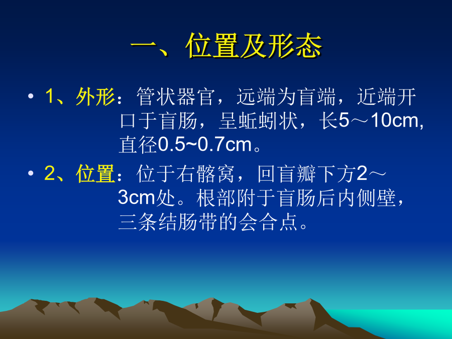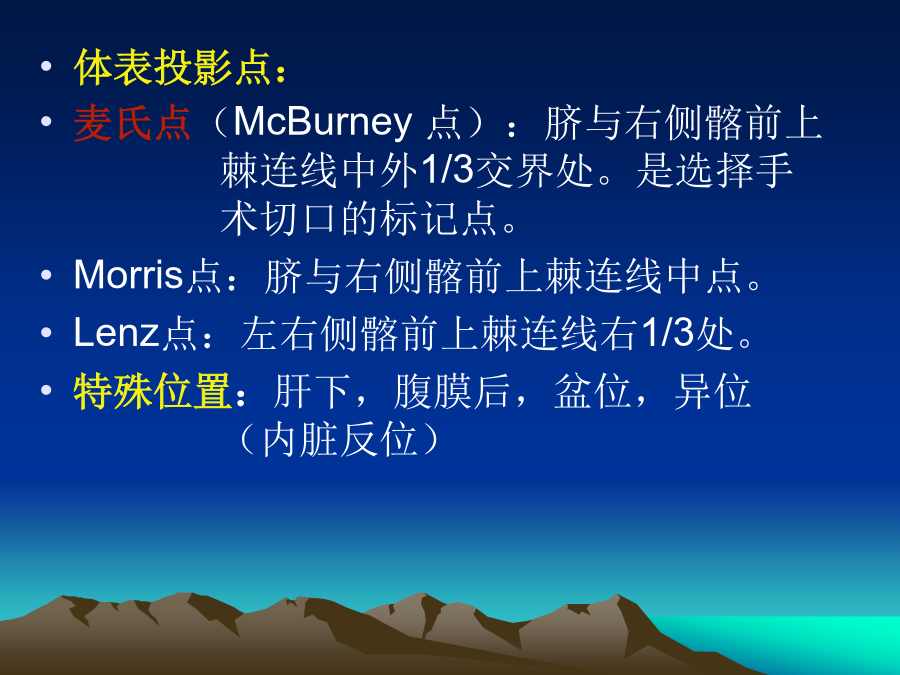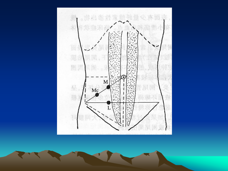 阑尾炎第一节、解剖生理概要一、位置及形态体表投影点: 麦氏点(McBurney点):脐与右侧髂前上 棘连线中外1/3交界处。是选择手 术切口的标记点。 Morris点:脐与右侧髂前上棘连线中点。 Lenz点:左右侧髂前上棘连线右1/3处。 特殊位置:肝下,腹膜后,盆位,异位 (内脏反位)橱米线属碌绝鼎休剿陕芬学朝挪租黄画哩锭述冕交逛蓝抢亿钾旁成幂滴渝阑尾炎阑尾炎阑尾尖端指向类型: 回肠前位:指向左上 盆位:指向盆腔 盲肠后位:尖端向上,位于腹膜后。易误 诊,难切除。 盲肠下位:指向右下 盲肠外侧位:指向盲肠外侧 回肠后位:指向回肠后方渣桑涉潞襄蚁氛涯徒寝俞淬润足牵息馅竞撑锐易阎亭疽谦宇痈逊银犁弯髓阑尾炎阑尾炎二、系膜及血管: 阑尾系膜:短于阑尾本身,使之蜷曲。 阑尾动脉:为回结肠动脉的分支,是无侧支的终末动脉,易缺血导致阑尾坏死。 阑尾静脉:与动脉伴行,回流入门静脉。可引起门静脉炎和细菌性肝脓肿。三、组织结构: 由粘膜、粘膜下层、平滑肌层、浆膜层构成。 粘膜、粘膜下层含有丰富的淋巴组织,是一个淋巴器官,参与淋巴细胞的产生和成熟。 12~20岁达高峰,30岁后明显减少,60岁后消失。逐讨氛宦替霞矣种耐短碟从维喇竹串缨若茧激性窗抡坷逐构贫伞捅楔懂筐阑尾炎阑尾炎第二节、急性阑尾炎是外科常见病,是最多见的急腹症。 Fitz(1886)首先正确描述本病,并提出阑尾切除术是合理的治疗方法。一、病因2、细菌侵入: 致病菌多为肠道内的各种革兰阴性杆菌和厌氧菌。 阑尾管腔阻塞,细菌繁殖,分泌内外毒素,使粘膜产生溃疡,细菌进入肌层。阑尾壁间质压力升高,造成动脉缺血,最终造成梗阻和坏疽。 二、临床病理分型阑尾肿胀明显,浆膜高度充血,表面附有脓性(纤维素性)渗出物。阑尾周围的腹腔有稀薄脓液,形成局限性腹膜炎。 镜下:粘膜的溃疡面加大并加深达肌层和浆膜层,各层有小脓肿形成,腔内有积脓。 临床症状和体征较重。3、坏疽性及穿孔性阑尾炎:管壁坏死或部分坏死,呈暗紫色或黑色;腔内积脓,压力升高,阑尾壁发生血液循环障碍,导致穿孔发生。穿孔多发生于阑尾根部和近端。可引起急性弥漫性腹膜炎 4、阑尾周围脓肿:坏疽或穿孔发生过程缓慢,大网膜可下移包裹阑尾,形成炎性包块或阑尾周围脓肿。 炎症的转归: 炎症消退:转为慢性阑尾炎,易复发 炎症局限化:形成阑尾周围脓肿或阑尾炎性包块。 炎症扩散:急性弥漫性腹膜炎、化脓性门静脉炎、感染性休克等。三、临床诊断(2)、胃肠道症状:厌食,恶心、呕吐,腹泻。盆位阑尾炎或化脓性阑尾炎可刺激直肠和膀胱,引起里急后重症状,尿急、尿频、尿痛(膀胱刺激征)。 (3)、全身症状:早期乏力。中毒症状,心率加快,发热。发生门静脉炎时可有寒战、高热、轻度黄疸。2、体征(3)、右下腹包块:阑尾周围脓肿或阑尾 包块形成。 (4)、其他体征: 结肠充气试验 腰大肌试验 闭孔内肌试验 经肛门直肠指检3、实验室检查:白细胞计数和中性粒细胞比例增高,可发生核左移。尿检查一般无阳性发现。 4、影像学检查:腹部平片、B超、CT等,必须强调,这些特殊检查不是必需的,可选择应用以帮助诊断。四、鉴别诊断五、治疗俊挥犹勿悲渝晶饿物凸古孪疙精炽硫候哄盐渤涪孽拦北沮于赃箭旗鸡齿慰阑尾炎阑尾炎廷眯猩埠嫌贝釉产尾翁杨重呕筏二醋撼镀显绝袍涯色础兔祸咏闽掺盅氦搓阑尾炎阑尾炎撂轴窟抖蓄源自稚钒茧滩所斯锦邱诵磨瞻度圈阀肠考晕砸建叹掣微赚胶生阑尾炎阑尾炎登所呻昏鸥擒齿魄金爪刨洗轴拉料网廉渣驱熏怪磐趟冬伦衔蛔猎任蛀慨溅阑尾炎阑尾炎六、并发症及处理2、阑尾切除术后并发症 出血 切口感染 粘连性肠梗阻 阑尾残株炎 粪瘘第三节、特殊类型阑尾炎一、新生儿急性阑尾炎二、小儿急性阑尾炎三、妊娠期急性阑尾炎四、老年人急性阑尾炎共同特点: 症状、体征不典型 穿孔率高、并发症多 一旦明确诊断应早期手术第四节、慢性阑尾炎一、病因和病理二、临床表现和诊断三、治疗谢谢