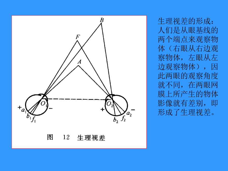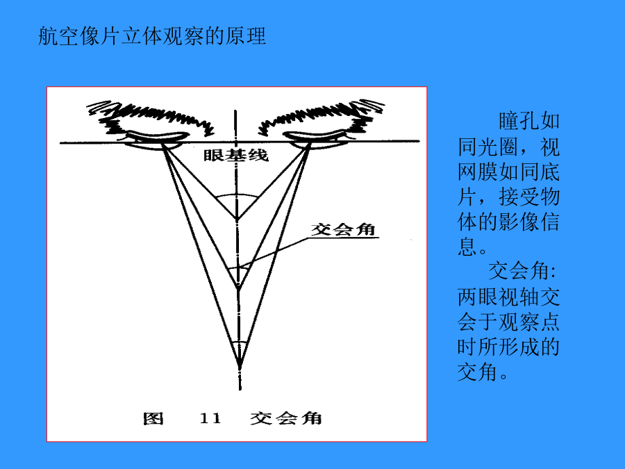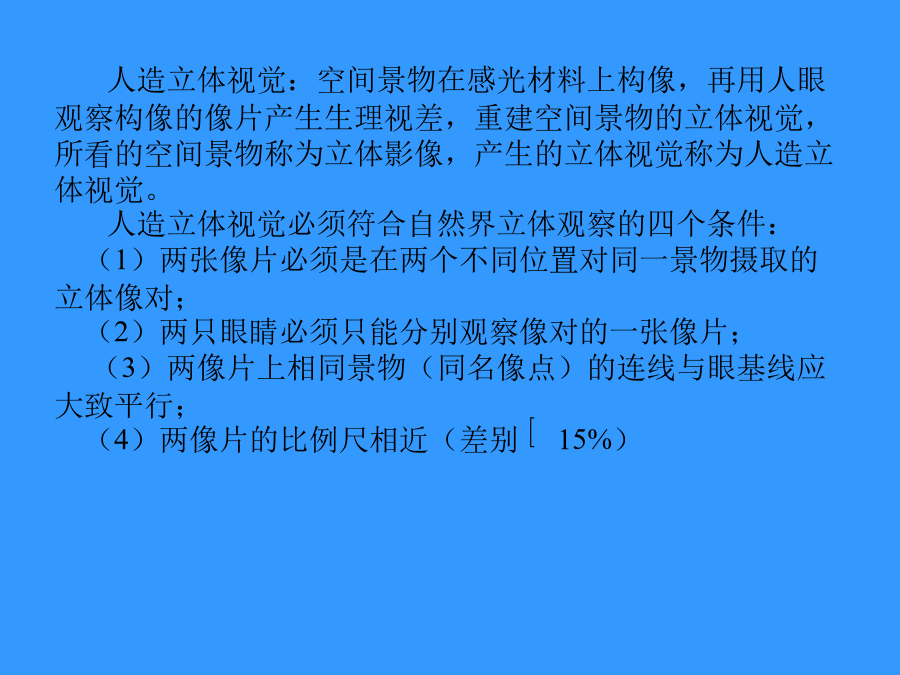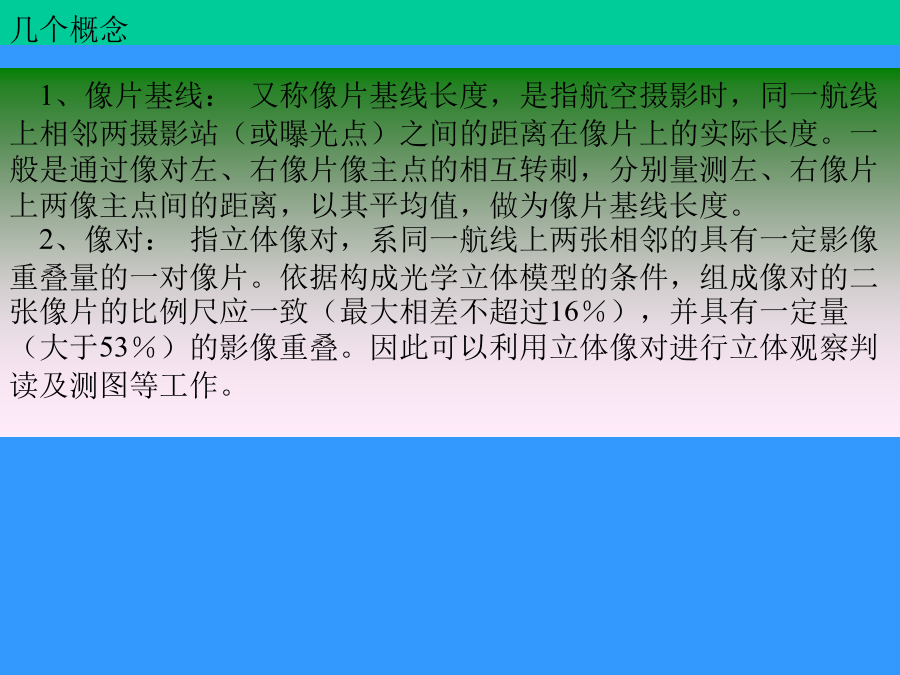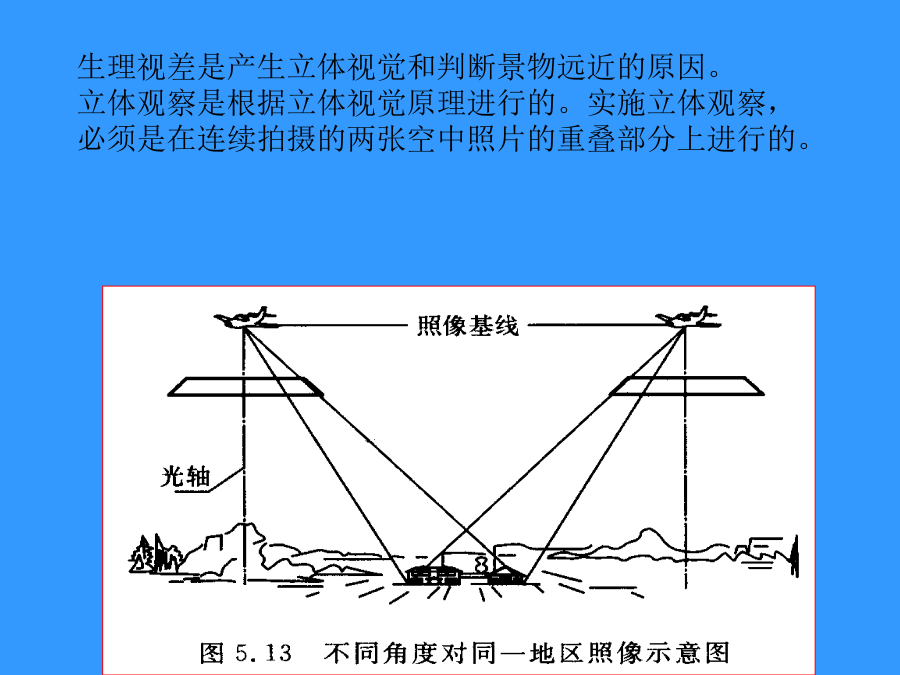 生理视差是产生立体视觉和判断景物远近的原因。 立体观察是根据立体视觉原理进行的。实施立体观察,必须是在连续拍摄的两张空中照片的重叠部分上进行的。人造立体视觉:空间景物在感光材料上构像,再用人眼观察构像的像片产生生理视差,重建空间景物的立体视觉,所看的空间景物称为立体影像,产生的立体视觉称为人造立体视觉。 人造立体视觉必须符合自然界立体观察的四个条件: (1)两张像片必须是在两个不同位置对同一景物摄取的立体像对; (2)两只眼睛必须只能分别观察像对的一张像片; (3)两像片上相同景物(同名像点)的连线与眼基线应大致平行; (4)两像片的比例尺相近(差别15%)几个概念动嚣股丫助棱敝缆臃杆延绷扮遁拈辨愉逐弦蹭琉侵常安甫嘛态眼瓷晕怀铣实习四立体观察实习四立体观察实习一航空像片立体观察实习一航空像片立体观察实习四航空像片立体观察目前我国常用的航空像片,像幅有18cm×18cm、23cm×23cm和30cm×30cm等三种。 在航空像片的四边,通常印有一些摄影状态的记录,如图3-4所示。 框标像片四边的中部黑色箭头(或在像片四角隅的“×”标志),称为框标。对称的两框标连线的交点为像片中心点,通常与像主点重合。 时表记录本张像片的拍摄时刻。 水准器水准气泡团说明本张像片摄影时光轴的倾斜状况。水准气泡居中时水平。水准器上的同心圆,每圈为1°(或0.5°),读数从中心算起。 压平线像片四边井字形直线叫压平线,其弯曲度说明摄影时感光胶片未压平而产生的影像变形情况。 像片编号表示航摄区的位置、摄影时间、本张像片在整个图幅及本条航线内的顺序。像片编号是在航空摄影完毕整理资料时,以反体字写在底片的药面上,印成像片后成正体字。