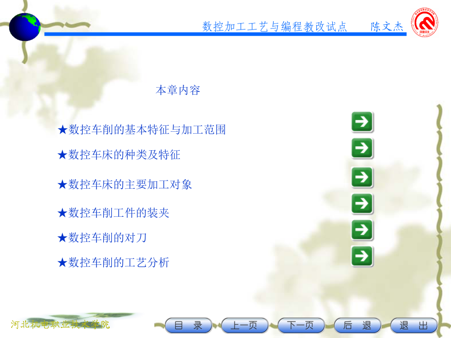 数控车削工艺本章内容车外圆数控车削的基本特征与加工范围数控车床的种类和特征数控车床的种类和特征项目随着数控技术的发展,数控车床的工艺和工序将更加复合化和集中化。即把各种工序(如车、铣、钻等)都集中在一台数控车床上来完成。目前国际上出现的双主轴结构就是这种构思的体现。采用四轴三联动配置,线性轴X/Y/Z及旋转C轴,C轴绕主轴旋转。机床除具备一般的车削功能外,还具备在零件的端面和外圆面上进行铣加工的功能。项目外圆上槽的加工数控车床的种类和特征项目数控车床的种类和特征项目双主轴,双刀塔车床,仅仅使用夹具一次装夹就可以进行全部加工。主轴车床结构示意项目可以同时连续对零部件进行车削、铣削加工,只需进行一次装夹就可以完成对零部件的全加工。项目对复杂零件进行高精度的六面完整加工。可以自动进行从第1主轴到第2主轴的工件交接,自动进行第2工序的工件背面加工。具有高性能的直线电机、以及高精度的车-铣主轴。对于以前需要通过多台机床分工序加工的复杂形状工件,可一次装夹进行全工序的加工。特别适用航天航空工业、汽车工业和液压气动产业以及在高精度要求的机床和刀具制造业中应用。项目项目装载了ATC装置的CNC立式车床,可以对工件尺寸最大为φ1000X1000mm的大型零部件、或使用卧轴CNC车床不可能抓住的异型巨大零部件进行高效率地加工。通常有专用于车削和可以进行铣削、研磨等复合加工性能的2种机型。项目车削外圆 车削外圆是最常见、最基本的车削方法,工件外圆一般由圆柱面、圆锥面、圆弧面及回转槽等基本件组成。 锥面的车削,可以分别视为内圆、外圆的一种特殊形式。锥面可分为内锥面和外锥面,在普通车床上加工锥面的方法有小滑板转位法、尾座偏移法、靠模法和宽刀法等,而在数控车床上车削圆锥,则完全和车削其他外圆一样,不必像普通车床那么麻烦。 在车削圆弧面时,则更能显示数控车床的优越性。数控车床的主要加工对象车削内孔 车削内孔是指用车削方法扩大工件的孔或加工空心工件的内表面,是常用的车削加工方法之一。在车削盲孔和台阶孔时,车刀要先纵向进给,当车到孔的根部时再横向进给,从外向中心进给车端面或台阶端面,车削端面 车削端面包括台阶端面的车削,偏刀车削端面,可采用较大背吃刀量,切削顺利,表面光洁,而且大、小端面均可车削;使用90°左偏刀从外向工件中心进给车削端面,适用于加工尺寸较小的端面;使用90°左偏刀从工件中心向外进给车削端面,适用于加工工件中心带孔的端面;使用右偏刀车削端面,刀头强度较高,适宜车削较大端面,尤其是铸锻件的大端面。车削螺纹 车削螺纹是数控车床的特点之一。在普通车床上一般只能加工少量的等螺距螺纹,而在数控车床上,只要通过调整螺纹加工程序,指出螺纹终点坐标值及螺纹导程,即可车削各种不同螺距的圆柱螺纹、锥螺纹或端面螺纹等。螺纹的车削可以通过单刀切削的方式进行,也可进行循环切削。数控车床的主要加工对象表面形状复杂的回转体零件钢制联接零件高压技术隔套精密加工业三爪自定心 卡盘装夹找正法:找正装夹时必须将工件的加工表面回转轴线(同时也是工件坐标系Z轴)找正到与车床主轴回转中心重合。一般为打表找正。通过调整卡爪,使工件坐标系Z轴与车床主轴的回转中心重合也可以改变夹紧力的作用点,采用轴向夹紧的方式。数控车削的对刀数控车削的工艺分析研究制定工艺方案的前提是:熟悉本厂机床设备条件,把加工任务指定给最适宜的工种,尽可能发挥机床的加工特长与使用效率。并按照分析上述零件图所了解的加工要求,合理安排加工顺序。 一、安排加工顺序的一般方法 (1)安排工件上基准部位的辅助加工及其他准备工序。 (2)安排工件工艺基准面的加工工序。 二、根据工件的加工批量大小,确定加工工序的集中与分散。 三、充分估计加工中会出现的问题,有针对性地予以解决。例如:对于薄壁工件要解决装夹变形和车削震动的问题。对有角度位置的工件要解决角度定位问题。对于偏心工件要解决偏心夹具或装夹问题.一、零件图形的数学处理及编程尺寸设定值的确定 二、根据工艺方案中工步内容及顺序的要求,逐项创建刀具路径并生成程序 三、程序校验确定走刀路线的一般原则是: 保证零件的加工精度和表面粗糙度要求; 缩短走刀路线,减少进退刀时间和其他 辅助时间; 方便数值计算,减少编程工作量; 尽量减少程序段数车圆锥的加工路线分析车圆锥的加工路线分析车圆弧的加工路线分析车圆弧的加工路线分析车圆弧的加工路线分析1.三爪自定心卡盘 三爪自定心卡盘是最常用的车床能用卡盘,其三个爪是同步运动的,能自动定心(定心误差在0.05mm以内),夹持范围大,一般不需要找正,装夹效率比四爪卡盘高,但夹紧力没有四爪卡盘大,所以适用于装夹外形规则、长度不太长的中小型零件2.四爪单动卡盘 四爪单动卡盘,它的四个对分布卡爪是各自独立运动的,因此工件装夹时必须调整工件夹持部位在主轴上的位置,使