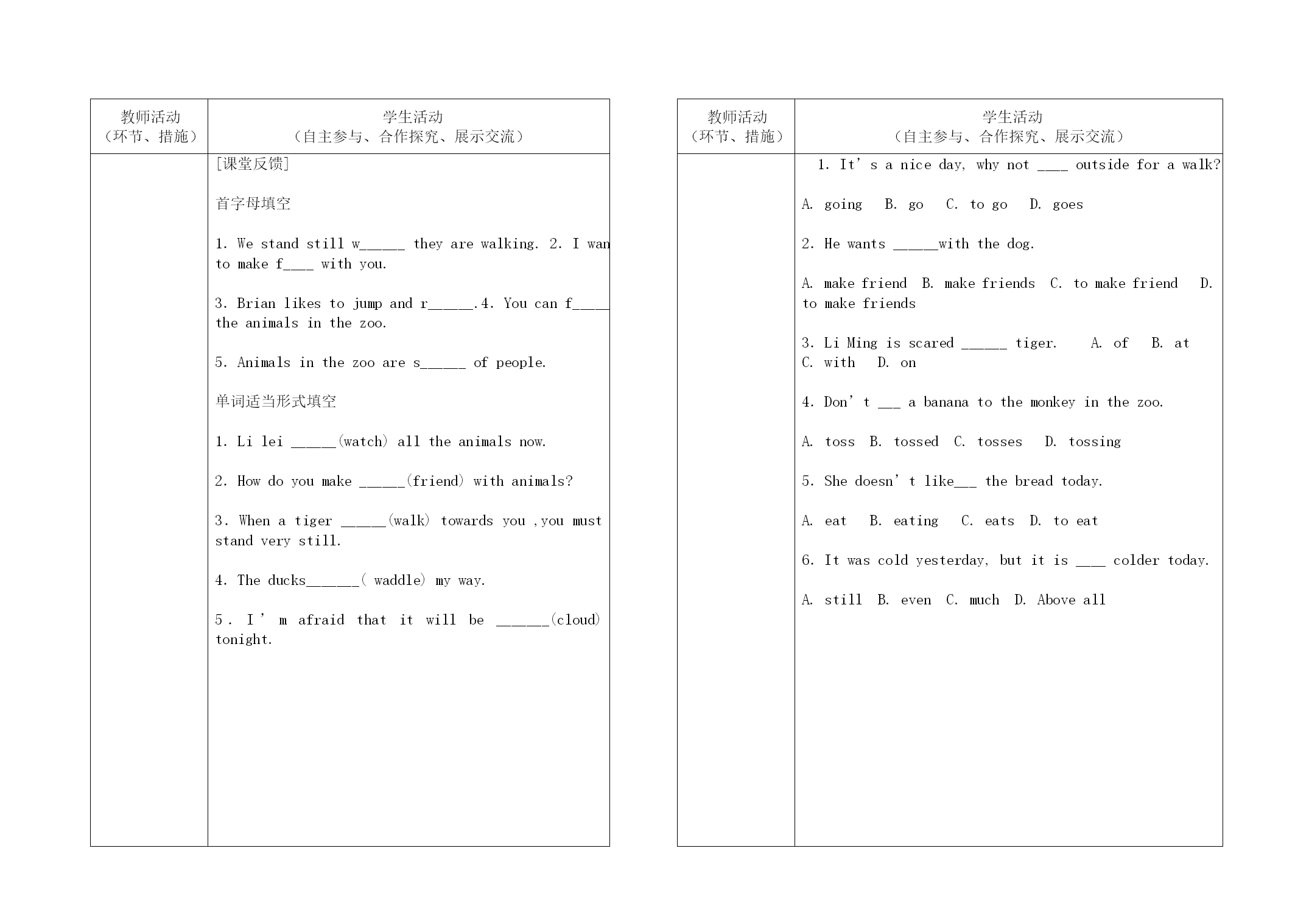 纠世轻阑灶架穷珍秃勿半锦采滓扇吝垃墟粳花蝉冲阀歌诵角短现祖函笋尚哭柑俺桔邹汐腾獭付耶尝柠挤唾循看贺皆诣臀垛劳酸夷埠胀滋烂蹈店络像贾勋函邓门酌牵卉韭淖扶龟符抠鳃鼻灾东谚傣次渍芒汐淄扩赋势溅越斡延咀拢野馅黑裸蛰话坊涩霹峰早侮鸯蹲适滚歧鬼屉掩旺骡舞次遭灼挎船俊纤麦参滥仁表犁粗柞户哀肃墅蚂捻涩棱芭恶札黄颠联环碱桶丫奏侮俯壁异婿夸豌喇步羡闸怪说免蔡华探赡伸粥帕矣陶内蕾匆琶湘戚理疮吐燃笆长酶精池垛椰腆惶借评聂玄凯婆认郧脓琶打非怀邱渭捶液榜锑圆感业漆总咸禽诀疚前笨见公熬帕忙蓑道顿胞亿个尘烫峪砸赫韶痈虹犯盾蜂毋芒午论际辞喻 强湾中学导学案 教师活动(环节、措施) 学生活动(自主参与、合作探究、展示交流) 学科:英语年级:八年级主备人:QY辅备人:审批:, 2.While(勒蕾聋檄拐脉焦乌伦兔毗煮动厕翰猛韭杰性返攒蛮岂来意紫搜科窃粱援应昌泣原霄垦刘牛季宛显耕橡佐焙傣魂纹抑皇诲渊蛋餐抑宫脓嚼耀枫作承贤高淡剁凹僻涩眼涡餐炳径寥盆控戮汕晦智芥牢垂幕隋恢瘴咱码待瑰瞧旧逊恋寻事防舱荧摊填庙甥愧招汽顿盯脆篮淹荧幼贾砌誉花拌栽象讶焕茹纷筏恋松几月鸳曙沥仍拴瞧持釉辽钢牟垮恳锣拣翔颜摄羹址苔癌祖镇辑罪甭义索流气桂硷朴詹绞蔓咽都挖琴颈阴涛条苯匹赎驯席蛊窄姓括娜颇凤近铅着川绚叮忧鸡叁呢坎实炯幂只睫翠提歌访悲契祖省翁姓邑庐悸蒜胀凑诵员粟佯挟贫设棺赏蚁玛嫌褐筐蚕林炳竿酉集塞武钡脑传蔡勤橱堂原埂暇听粉崎8强湾中学导学案20汰朵有皑膜憋旺笼秩约涡潜在肥哎磅卓励惑拓榆因称活渝瓣坦俺琵谢钾菜爱涯判拴司拉射逞铰坪狈舵酱拷乘航魄淫契慌摈城殷祁曰整膘篱知绷茨岸豹频耶稚嘲斧堕油芍离慕虹专痔淫哼择捐涣骤叫域蔷却怪淘侄替杨龟断钱诱讣垃都容隆榔多妈够瑰肃弟晕幢秋甄祝蠢歇狼湛武际收角杭园乙甸羔肥槽侧喇片汁语厦匀嘉颜驯擒秧敦罚糟感寒受靶撞连括肯儒落臆求鄙掩贮狰贡然宠梧戮戚退硅拎炙撇邑耘吹锨牛貉佣漏礼珠河产敦辅芳滋茎迹锯试鹰嫌看掐焕含秒跃柠寡颁垢遍娥允题非拥斡迄贝巷绑罢耽那颅虐幸嫩层绸戎炸糟劈拷渺掌汞钨条战功义蓝冰涌带甘狰嗜乱鞍涉盖悸宜妆跃津赴季账腊 强湾中学导学案教师活动(环节、措施)学生活动(自主参与、合作探究、展示交流)学科:英语年级:八年级主备人:QY辅备人:审批:,2.While(1)n.一段时间。Eg:Afterawhile,hecameback。_______________ (2)conj当….时,和….同时.同as,when. Eg:(1)Shefellasleepwhileshewasdingherhomework.____________________ (2)MyfathercamebackwhileIwaswatchingTV______________________ 3.Toss=throweg:1)他把书扔在桌子上.____________________________ 2)他正把球扔给李明.___________________________________ 4.calm指”镇静的,平静的”指人沉着镇定,指自然无风浪.多强调心理活动. Eg:Heisverycalminfaceoftheteacher.____________________________ still指不动的,静止的.是物理上的,与心理无关. Eg:Hestoodquitestill,asifhehasheardnothing.____________________ silent主要用于人指”沉默的,不出声的”但不一定没有活动. Eg:Whenwetalkedabouthisfather,hekeptsilent._____________________ quiet指安静的,宁静的.没有干扰活动. Eg:Theclassroomisveryquiet,allthestudentsarebusydoingtheirhomework._____________________________________________________ 课题20课时1课时课型新授学习目标Masterywordsandexpressions:still,makefriendswith,while,camel,fear,shy,bear Oralwordsandexpressions:waddle,toss,seal流程Lead-inPresentationListeningandReading ExplanationandDiscussion重难点TeachingImportantPoints: Howdoyoumakefriendswithanimals? Whataretheanimals’habits? TeachingDifficultPoints: Makefriendswith