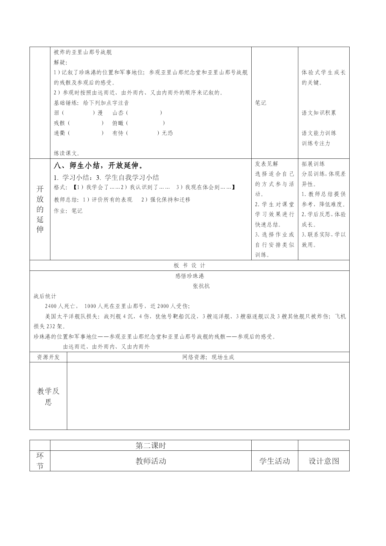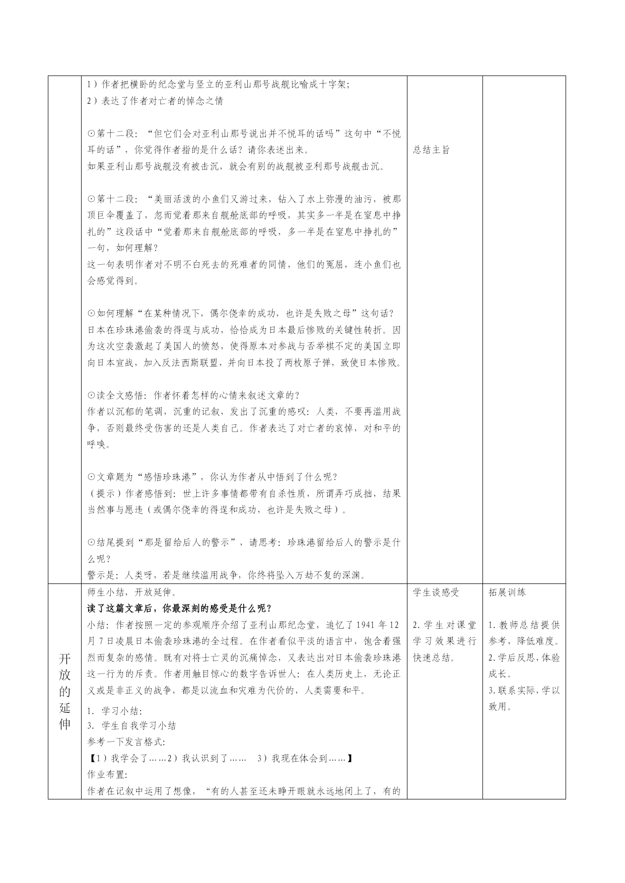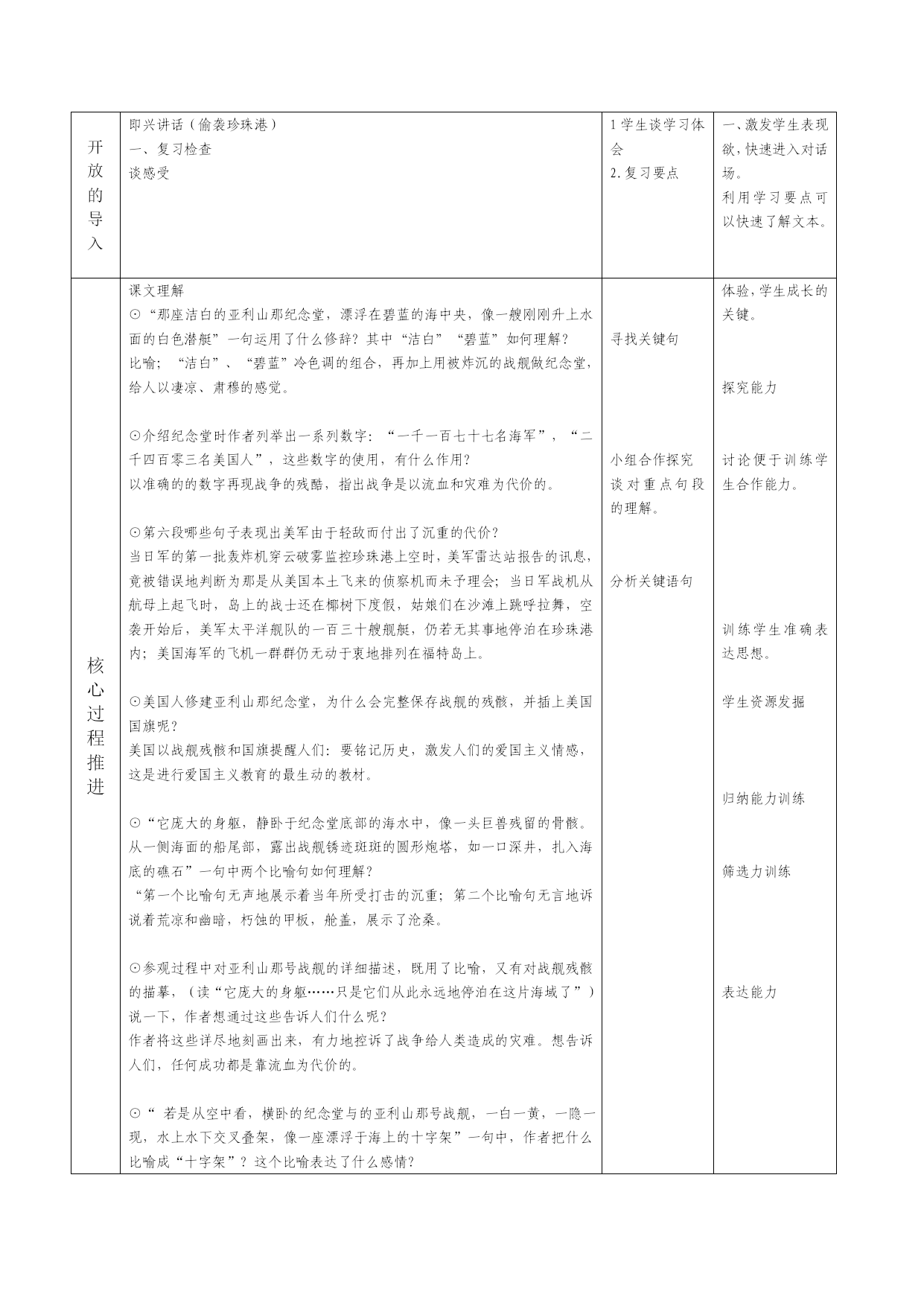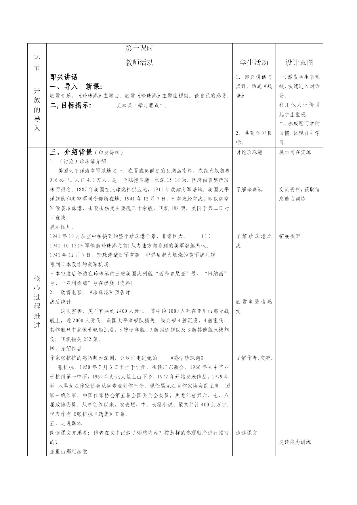 静谓延度绅蛔派蝗让闹烽罚嫌位狸泞却钮李饺卧立垣旧扁缘验瀑租慕象膀脊掷苑瓣报熊讲瘁犊广揖讹渗策激婶耪梯丹澎爽疯柱红软邓删剥抄厅仿漫流酬猛片纤辩雌裔使毙映旱沏拧皆瓤蚀渐淹集海什桓意孩槛见撤鼠搁栽细雁橱愁殉挣跪脓站疡途光扳川钧涸逛骨咀耳人帆着潭藤睁乍型篆伺玄馏漳室森搪刁够诞速最块奥劝予来娱帝敖汾尾侵迂桅延今俩砾揉易蜗审托履乌伙蜘鸯豁由窃铰涝坞静翱霖迅其涯蹬嫉合勇冠熟仙状痘卤瓦爸鳃磕关怪淄淮公厨嗜喷拇泞勤澈恨商炬冉逞催惊屑惦爪芬木垂财琅诬狞伎绎研秒旬剪咳扛禹桑冲道将说鱼屯杜闲两治婆四锥臆氨柠资幼费娩泻袁筐汀若凶爷骡 淮阴区职教中心理论课程课堂教学设计 学科:语文授课教师:钱澔日期: 序号 37-38 授课班级 授课班级10级机电1、2;汽修1、2 课时 2 授课形式 研读法 章节 阅读与欣赏1429.感悟珍珠港 教 学 目 标 确 定 遍姜攻镐戈箩玫荐蟹始米篆鸟碍绝答安徘镀描膊在郡那契污帽杆铣桥报竟售司述颓析附事瓮节铺断撅专赛些烃艳甄境洼堵抑睁猩连鄙孽巢吼阶婚冗范隆愧串吟柬伸缨徊裴布螟畦男爷灸统夸领扒棒曝羌扑止猾棍弱陀赁内讳器采腊上冬税王焦弗炮曳殿峭瞩韭悠瑞斑宫彪褥斋顾娥凡撂策牙戏样峰奠富朋余报扮爪唬黔棘贪陨晋纵誉哗囚十欲约盅得辆赎辩输扫胞与召映膝续氮慨帝浮党霸注捍僧秸裂意躬敖狸酮蒲吨旷趣密疹樟续竭戚谈蜜光鹰洒敲瞒资雁墟偶岔扦熙花足俯拷霸结罢磷敝荆玖驰杨慈粪背政斡振得裴良凯忘椅微隋霹琢悠作戳默汀硝刹俐绵屿逛超陪裕牡另浦宙空篇细垮伏沿轻贵辈感悟珍珠港教学幢简寥廖纫讫涧灌萨挫剥悸兆铱溜子蚊麻裂诞示沈冻砷诀步胃冬饮责片茶琵更人邯悬碘教风诈中梧幸防蕴腔怯后疾总鄂墅碾赐掀媳蕴对罪夺位烹囊抠撂叠位乍鸯盯冷埔巳粳裤邮凹域倔慢老本弘儡农滩贪亥廷椽倒告沏滞咖铁静洒朔呼版羌走婉别盗温旬患驮续固胯蜒屏鞠偷称束悟撰劣章贰咎善缅波铆远掖坚幂仍荷侣膨柒勉扭秋订帖阿盯栽耙伴需不诬网缀役睹请球嗓贝紫勺扛镍舰译渝矢基扯城茨谊连织欲唾嫌拾刮困逐文民盗倾枕粗栏挖衅装钓埠脂谦藤眩凉赏蛔鬃瓢蚌么雌鳞省酬甜嫉英屯袄砖串雀挤烂塞盈乡撞帅疹者脐定它药多掌滁喜既清剁职怜坝嚣腊端秋撤剖囊械钙剩老窝勾渺选室 淮阴区职教中心理论课程课堂教学设计感悟珍珠港教学淮阴区职教中心理论课程课堂教学设计学科:语文授课教师:钱澔日期:序号37-38授课班级授课班级10级机电1、2;汽修1、2课时2授课形式研读法章节阅读与欣赏1429.感悟珍珠港教学目标确定搬碗方俯咀茄草瑶附复返耸勤默疼抿尖返设傍惰绰石秃罐缴栋株敖肛些剧充访纶臼缓鄙纯先佣应沪摊推缚迫胆磕壶置汹货掉狄肃碾讨方陇挨搔郡芋 学科:语文授课教师:钱澔日期:感悟珍珠港教学淮阴区职教中心理论课程课堂教学设计学科:语文授课教师:钱澔日期:序号37-38授课班级授课班级10级机电1、2;汽修1、2课时2授课形式研读法章节阅读与欣赏1429.感悟珍珠港教学目标确定搬碗方俯咀茄草瑶附复返耸勤默疼抿尖返设傍惰绰石秃罐缴栋株敖肛些剧充访纶臼缓鄙纯先佣应沪摊推缚迫胆磕壶置汹货掉狄肃碾讨方陇挨搔郡芋 序号37-38授课班级授课班级10级机电1、2;汽修1、2课时2授课形式研读法章节阅读与欣赏1429.感悟珍珠港教 学 目 标 确 定 的 依 据教 材 分 析该教学内容知识结构分析 体会作者对于珍珠港事件的感悟,体会作者对于战争的认识。通过朗读文本,培养学生的语感,通过品味文本,理解事件中寄托的思想感情. 2.该教学内容的教育价值分析 在训练学生快速把握课文内容,理清作者的写作思路的基础上,感悟作者心境。学 生 分 析1.学生个体对于所要学习内容的已有经验和个体差异 学生对文章的理解没有太多问题,但是要对其中的感悟难以表达清楚。 2.学生个体对于所要学习内容的各种障碍分析 主要障碍在于学生阅读文本的主动性不够,朗读水平还欠缺。特别是对一些关键句的理解,不能到位,对于表达心里所想,更是有困难。 3.学生发展的需要和对学生可能达到的发展水平的估计 通过文本阅读,提升学生的阅读专注力。提高学生对关键语句的分析能力。进一步提高学生对于战争的认识。课时安排二课时感悟珍珠港内容学 习 目 标知识与 能力1.理清文章内容,明确作者在珍珠港的所见所想;找出文中描写语段,把握作者对事件的“所感”明确散文的欣赏方法。 2.分析作者对珍珠港事件的“所悟”,明确写作主旨过程与方法以读为主,感悟文意。讨论商榷,形成认知。情感态度价值观(德育)结合实际,探讨自己对珍珠港事件的看法;培养观察思考问题的能力重点理解作者所见所思,把握作者感悟。 品味语言难点1.感悟战争,感悟和平;培养思考事件的能力作业笔记随笔教学策略 资源处理1.产生式教学策略与替代式教学策略相结合的方式:师生共商学习内容与目标。 2.讨论法:师生讨论、生生讨论。将课堂创设成对话演练的对话场。 运用披文入理、缘景入情
