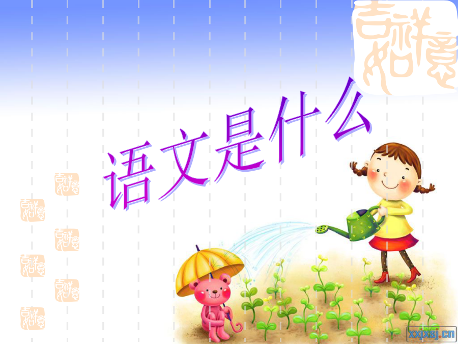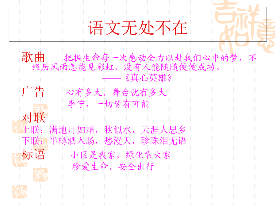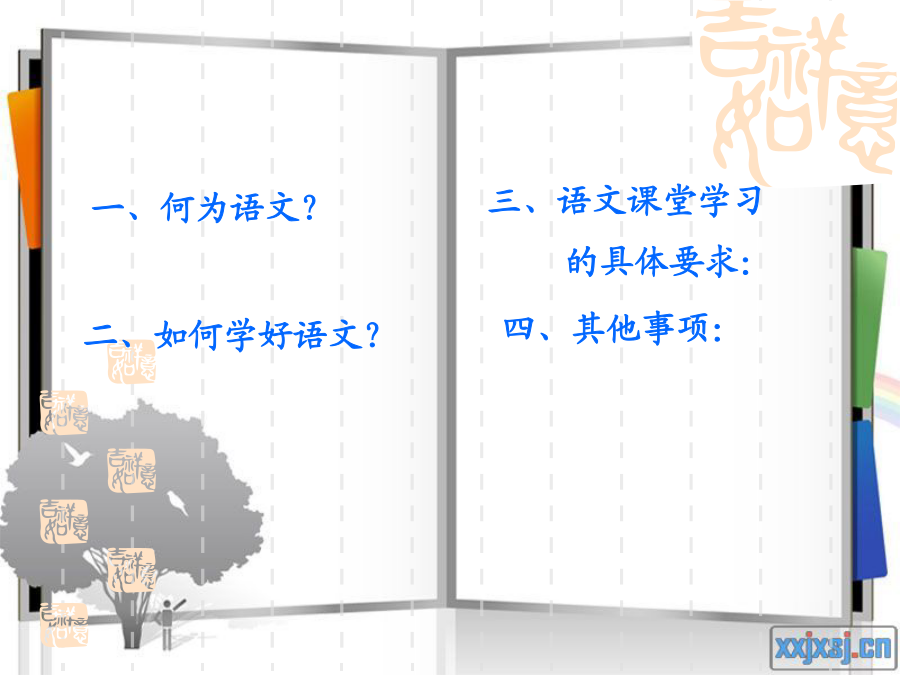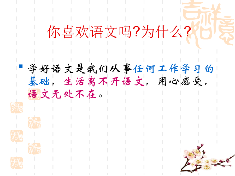 欢迎进入语文课堂你喜欢语文吗?为什么?语文无处不在一、何为语文?语文是什么语文叔叔亲了我妈妈也亲了我。 叔叔亲了我,妈妈也亲了我。 叔叔亲了我妈妈,也亲了我。长长长长长长长 长长长长长长长 ChangZhangChangZhangChangChangZhang ZhangChangZhangChangZhangZhangChang 主人家的都要常长常长,生长不止,越长越长,越来越长(1)猪鼻子上插大葱—— (2)千里送鹅毛—— (3)秋后的蚂蚱—— (4)孔夫子搬家—— (5)老鼠爬进书箱里—— (6)周瑜打黄盖—— (7)刘备借荆州—— (8)司马昭之心—— (9)徐庶进曹营-——铁杵磨针守株待兔揠苗助长语文的趣味、魅力无处不在!如何学好语文各抒己见“六要”:要做到“四多”语文课堂学习要求 其他事项1、课前演讲4、每天练习一篇钢笔字推荐书目:6、需要准备物品:爱好语文吧!同学们!