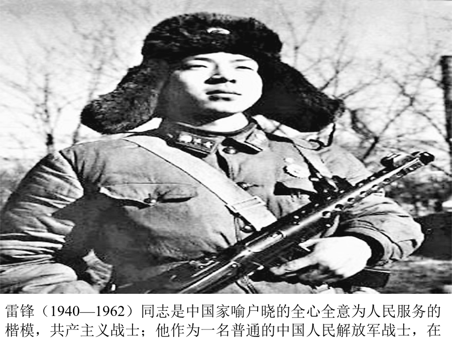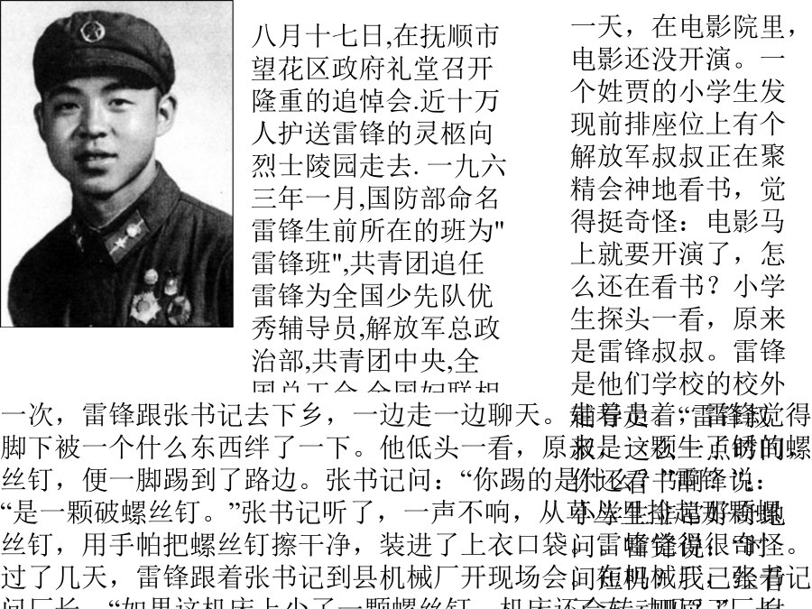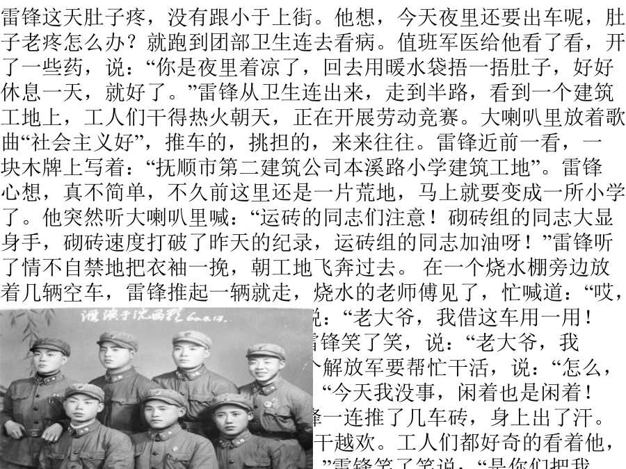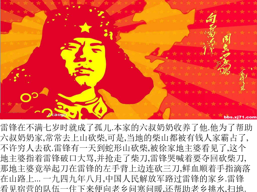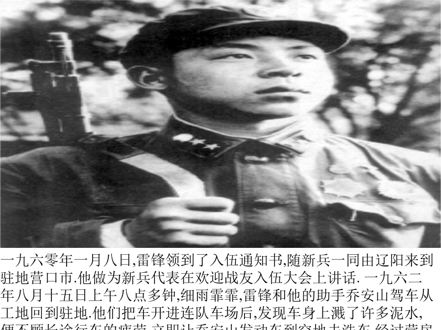 雷锋(1940—1962)同志是中国家喻户晓的全心全意为人民服务的楷模,共产主义战士;他作为一名普通的中国人民解放军战士,在他短暂的一生中却助人无数,伟大领袖毛泽东主席也亲笔为他题词“向雷锋同志学习”;一部可歌可泣的《雷锋日记》令读者为之动容。雷锋在不满七岁时就成了孤儿.本家的六叔奶奶收养了他.他为了帮助六叔奶奶家,常常去上山砍柴,可是,当地的柴山都被有钱人家霸占了,不许穷人去砍.雷锋有一天到蛇形山砍柴,被徐家地主婆看见了,这个地主婆指着雷锋破口大骂,并抢走了柴刀,雷锋哭喊着要夺回砍柴刀,那地主婆竟举起刀在雷锋的左手背上边连砍三刀,鲜血顺着手指滴落在山路上...一九四九年八月,中国人民解放军路过雷锋的家乡.雷锋看见宿营的队伍一住下来便向老乡问寒问暖,还帮助老乡挑水,扫地.买柴买菜按价付钱,不拿群众的一针一线,就从心底萌生了要参军的愿望.雷锋找到部队的连长,坚决要当兵,当连长得知他苦难的身世后告诉他还小,等长大了才能当兵,并把一支钢笔送给了他,鼓励他要好好学习,长大了才能保卫和和建设中国.一九五九年十二月初,新一年的征兵工作已经开始,雷锋迫切要求参加中国人民解放军,但鉴于焦化厂的征兵名额有限,且雷锋在工地的表现十分突出,领导也舍不得放他走,就不同意他报名.这可急坏了雷锋,他跑了几十里路,来到辽阳市人民武装部向余政委讲起自己的经历,表明他参军的志愿和决心.武装部的余政委和工程兵派来的接兵的领导专门研究了雷锋的入伍问题,认为他是苦孩子出身,经过实际工作的锻炼,政治素质好,入伍动机明确,虽然身高1.54米,体重不足55公斤,身体条件差些,但他在农场开过拖拉机,在工厂开过推土机,多次被评为社会主义建设积极分子和先进工作者.相信他入伍会成长得更快.最后决定批准雷锋入伍.一九六零年一月八日,雷锋领到了入伍通知书,随新兵一同由辽阳来到驻地营口市.他做为新兵代表在欢迎战友入伍大会上讲话.一九六二年八月十五日上午八点多钟,细雨霏霏,雷锋和他的助手乔安山驾车从工地回到驻地.他们把车开进连队车场后,发现车身上溅了许多泥水,便不顾长途行车的疲劳,立即让乔安山发动车到空地去洗车.经过营房前一段比较窄的过道,为安全起见,雷锋站在过道边上,扬着手臂指挥小乔倒车转弯;"向左,向左……倒!倒!"汽车突然左后轮滑进了路边水沟,车身猛一摇晃,骤然碰倒了一根平常晒衣服被子用的方木杆子,雷锋不幸被倒下来的方林杆子砸在头部,当场扑倒在地,昏过去……战友们立即用担架把他送到附近医院抢救,各级首长立即赶到了医院,同时以最快速度把沈阳的医疗专家接到雷锋床前.由于颅骨损伤,导致脑机能障碍,雷锋这个劳动人民的好儿子,中国共产党的优秀党员,年仅22岁,就这样和我们永别了!八月十七日,在抚顺市望花区政府礼堂召开隆重的追悼会.近十万人护送雷锋的灵柩向烈士陵园走去.一九六三年一月,国防部命名雷锋生前所在的班为"雷锋班",共青团追任雷锋为全国少先队优秀辅导员,解放军总政治部,共青团中央,全国总工会,全国妇联相继发出关于学习雷锋的通知,《人民日报》,《解放军报》,《中国青年报》等相继发表社论,评论和介绍雷锋事迹的文章.一九六三年三月五日,首都各大报纸发表了毛泽东主席的光辉题词:"向雷锋同志学习".雷锋这天肚子疼,没有跟小于上街。他想,今天夜里还要出车呢,肚子老疼怎么办?就跑到团部卫生连去看病。值班军医给他看了看,开了一些药,说:“你是夜里着凉了,回去用暖水袋捂一捂肚子,好好休息一天,就好了。”雷锋从卫生连出来,走到半路,看到一个建筑工地上,工人们干得热火朝天,正在开展劳动竞赛。大喇叭里放着歌曲“社会主义好”,推车的,挑担的,来来往往。雷锋近前一看,一块木牌上写着:“抚顺市第二建筑公司本溪路小学建筑工地”。雷锋心想,真不简单,不久前这里还是一片荒地,马上就要变成一所小学了。他突然听大喇叭里喊:“运砖的同志们注意!砌砖组的同志大显身手,砌砖速度打破了昨天的纪录,运砖组的同志加油呀!”雷锋听了情不自禁地把衣袖一挽,朝工地飞奔过去。在一个烧水棚旁边放着几辆空车,雷锋推起一辆就走,烧水的老师傅见了,忙喊道:“哎,同志!你推车干什么?”雷锋回头说:“老大爷,我借这车用一用!”老大爷说:“我们的车不外借!”雷锋笑了笑,说:“老大爷,我就在这儿用!”老大爷才明白,这个解放军要帮忙干活,说:“怎么,你要帮咱们工地推砖啊!”雷锋说:“今天我没事,闲着也是闲着!”说完,推起车就飞快地走了。雷锋一连推了几车砖,身上出了汗。他把军装脱了下来搭在车把上,越干越欢。工人们都好奇的看着他,有的说:“同志,谁叫你来干活的?”雷锋笑了笑说:“是你们把我吸引来的呀!”“我们?”“是呀!你们星期天也不休息盖小学,今天我也没事……”说着,他又推着车走了。雷锋一边推砖一边想:自己小时候上不了学,现在国家这样关心少年儿童,给他们创造这样好