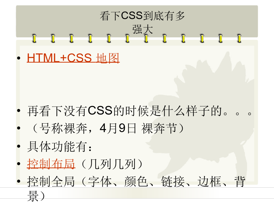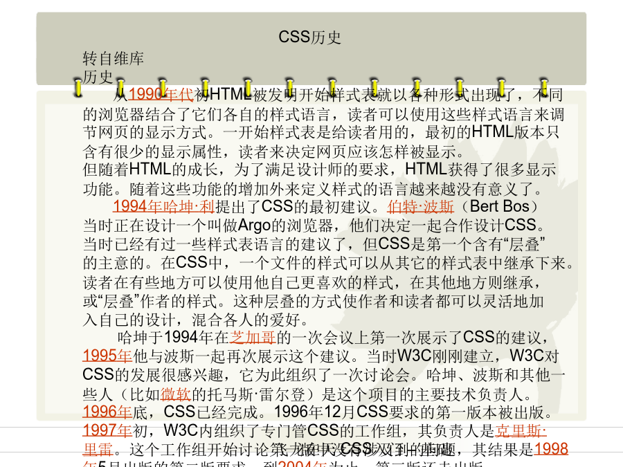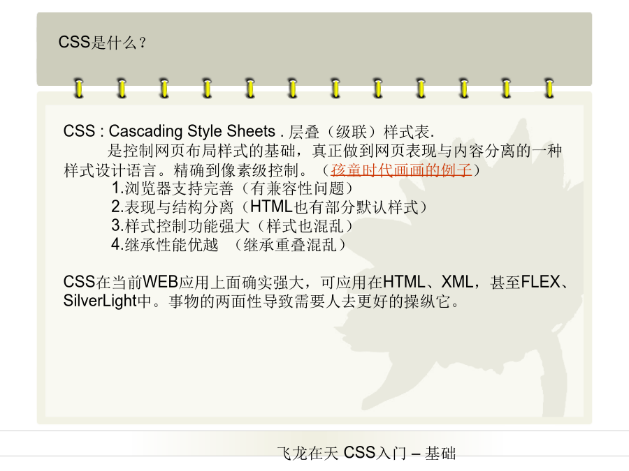 飞龙在天之CSS入门-基础CSS是什么?CSS是什么CSS历史看下CSS到底有多强大css控制布局css控制布局(头和身体的问题)看下CSS是怎么样的剖析csscss优先级常用选择符第一阶段总结:理下思路快速实现CSS(编辑器)第二阶段:CSS的基本属性设计字体/段落设计边框等效果背景设计的妙用内外边距的问题浮动的功能布局初探display:显示方式属性标签初始化的一些问题定位的慎用和好用列表的使用表单控制技能介绍推荐工具/书籍课程到此结束