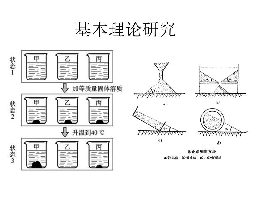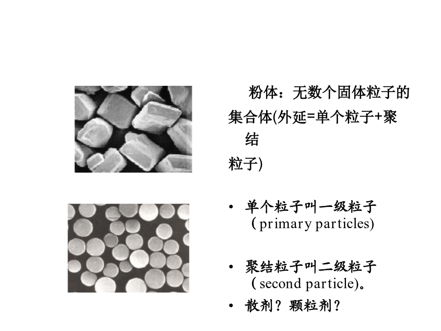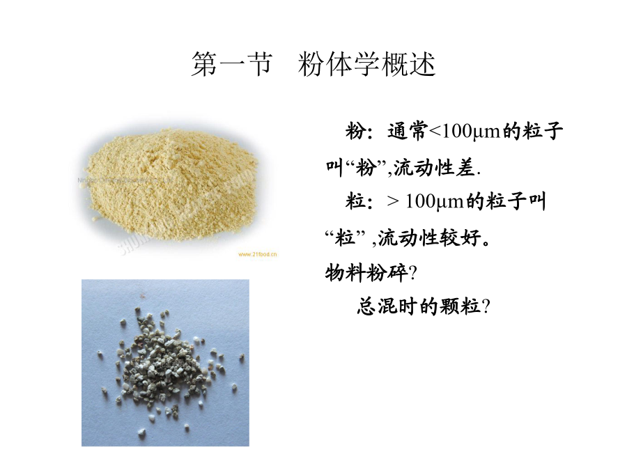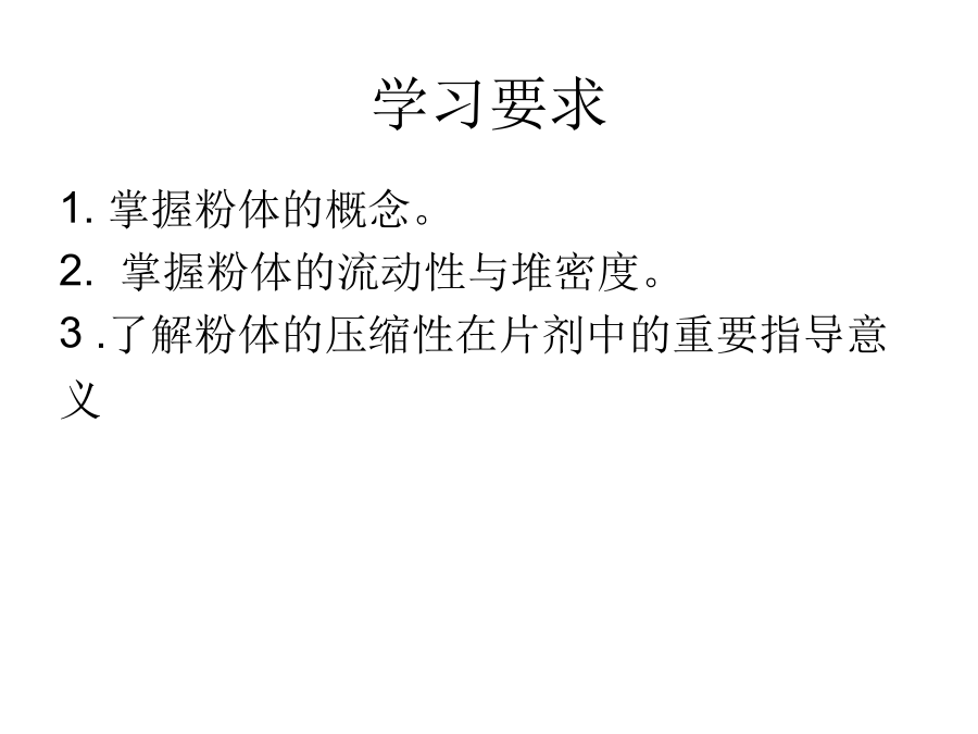 粉体学基本理论研究学习要求第一节粉体学概述粉体:无数个固体粒子的 集合体(外延=单个粒子+聚结 粒子) 单个粒子叫一级粒子(primaryparticles) 聚结粒子叫二级粒子(secondparticle)。 散剂?颗粒剂?粉体学:是研究粉体 所表现的性质及其应用 的科学。 性质? “第四物态”一.粉体粒子的性质2.球相当径(三维) (1)等体积(球)相当径 (2)等表面积(球)相当径 (3)等比面积(球)相当径 (4)不规则物体的表征3.筛分径:细孔通过相 当径。 算术平均值 几何平均值 表示方法: (-1000,900)um(二)粒度分布2.粒度分布的表示方法频率 (1)频率分布:表示与各个粒径相 对应得粒子在全粒子群中所占的百 分数(微分型) (2)累积分布:表示小于(pass) 或大于(on)某粒径的粒子在全 粒子群中所占的百分数(积分 型)。 考分? 3.平均粒子径 (1)算术平均径 (2)众数径 (3)中位径…….. 4.粒子径的测定方法 (四)粒子径的测定方法比表面积法测定方法粒子经(μm)二、粒子形态(自学)三、粒子的比表面积第三节粉体的密度与空隙率真密度ρg=W/Vg ρb=W/Vb 粉体的流动性休止角:粉体堆积层的自由斜面与水平面所形成的最大角。廷登脚环当赛略哭困驾羚竟禄凝狠往瘦撰渤阶豪厨炬柴扒淘云箕属咋咏治粉体学基础,药剂粉体学基础,药剂休止角 方法:将物料加入斗 中,测量全部物料流出 所需的时间,即为流出 速度。 C=(ρf-ρ0)/ρf×100% 式中,C为压缩度;ρ0为 最松密度;ρf为最紧密度。 压缩度20%以下流动性较 好。压缩度增大时流动性下 降。粉体流动性的影响因素与改善方法二、粉体的填充性(自学)粉体的吸湿性药物吸湿的规律(二)水不溶性药物的吸湿性 水不溶性药物的吸湿性随着相对 湿度的变化而缓慢发生变化,没有 临界点。 水不溶性药物的混合物的吸湿性 具有加和性。 应用? 私裁谜歼钠蚀琴烤阐即铲父缝瑰统宰银圭何辊建紊涣浸撤可汐垫愁粪阶站粉体学基础,药剂粉体学基础,药剂润湿性(wetting)是指固体 界面由固-气界面变为固-液 界面现象。粉体的润湿性对 片剂、颗粒剂等到固体制剂 的崩解性、溶解性等具有重 要意义。 固体的润湿性用接触角θ 表示。 θ>90,不湿润 θ<90,湿润 接触角测定第六节粘附性与凝聚性第七节粉体的压缩性质横乍挖纹丈簇切符竞脑心醋挥样鹤曲史夷惦倍醚深阉盎讥仅论洋敲铣享德粉体学基础,药剂粉体学基础,药剂课堂练习