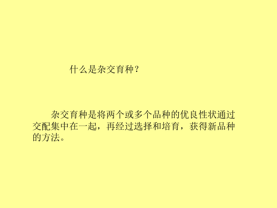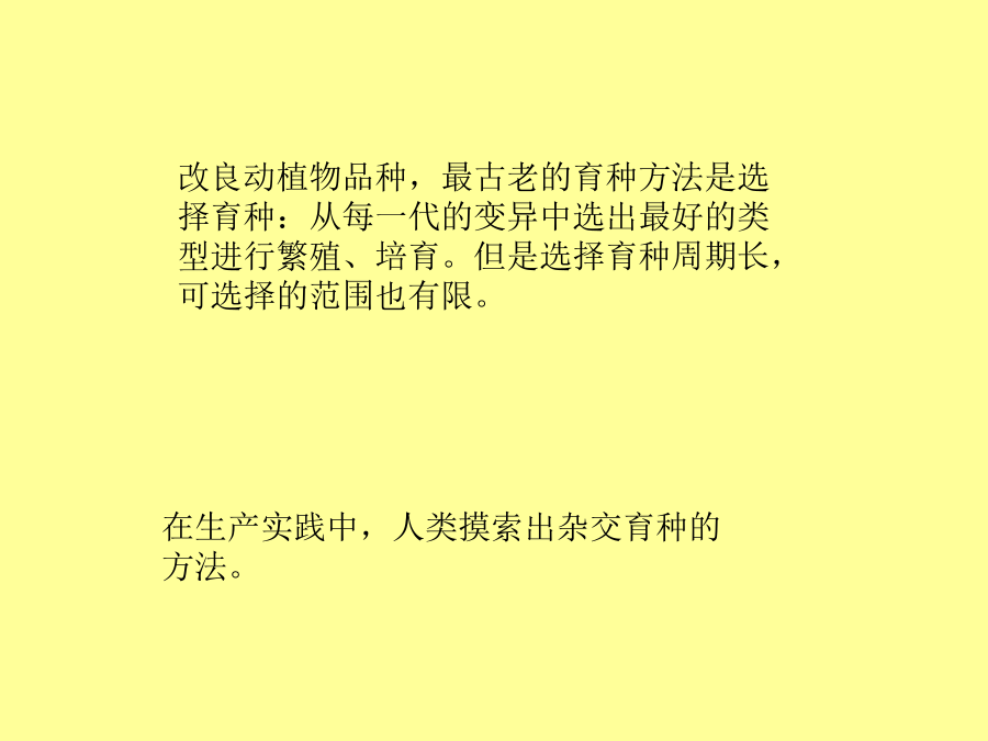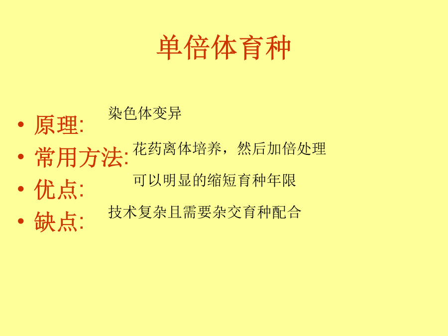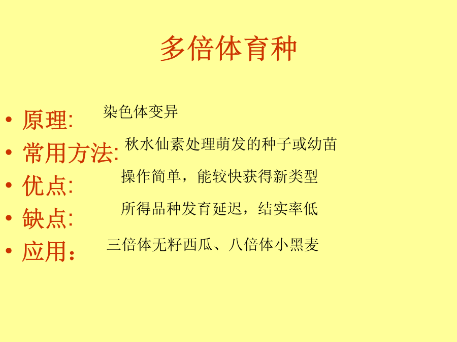 多倍体育种单倍体育种第一节杂交育种与诱变育种改良动植物品种,最古老的育种方法是选择育种:从每一代的变异中选出最好的类型进行繁殖、培育。但是选择育种周期长,可选择的范围也有限。什么是杂交育种?小麦高秆(D)对矮秆(d)为显性,抗锈病(T)对不抗锈病(t)为显性,现有纯合的高秆抗锈病的小麦(DDTT)和矮秆不抗锈病的小麦(ddtt),如果你是育种工作者,怎样才能得到矮秆抗病的优良品种(ddTT)?以下是杂交的育种参考方案:以下是杂交的育种参考方案:试一试:动物的杂交育种方法长毛立耳短毛折耳!例2:现有3个番茄品种,A品种的基因型为AABBdd,B品种的基因型为AAbbDD,C品种的基因型为aaBBDD。3对等位基因分别位于3对同源染色体上,并且分别控制叶形、花色和果形3对性状。请回答: 一、杂交育种4.应用我国奶牛的主要品种中国荷斯坦牛(原称中国黑白花牛),是将国外的荷斯坦-弗里生牛引进后,在我国经过长期驯化,与当地黄牛进行杂交和选育,逐渐形成的优良种。ⅹ例2:我国运用返回式运载卫星搭载水稻种子,返回地面后种植,培育出的水稻穗长粒大,亩产达600kg,最高达750kg,蛋白质含量增加8%-20%,生长期平均缩短10天。请回答: 诱变育种医药工业应用的青霉素就是利用普通青霉菌,经过X射线的照射,产生的有利突变型。还有医学上应用的其他抗菌素如链霉素、地霉素、金霉素等,经辐射处理的突变系,比原始品系抗菌素产量增长几十倍到几百倍,促进和提高了抗菌素的生产。拓展视野:诱变育种——太空育种太空黄瓜优点: 1、提高突变的频率; 2、能产生新的基因,大幅度地改良某些性状; 3、较短时间内能获得稳定遗传的个体(缩短育种时间)。优点: 1、提高突变的频率; 2、能产生新的基因,大幅度地改良某些性状; 3、较短时间内能获得稳定遗传的个体(缩短育种时间)。二、诱变育种单倍体育种 aaB_高杆抗病矮杆易感病单倍体育种单倍体育种多倍体育种三、多倍体育种二倍体多倍体育种类别育种的方法有多种,各有各的优点,我们要合理的有机结合各种方法,高效的达到各种目的。人工诱变+单倍体育种:下列表示某种农作物①和②两种品种分别培育出④⑤⑥三 种品种,根据上述过程,回答下列问题:普通小麦中有高秆抗病(TTRR)和矮秆易感病(ttrr)两个品种,控制两对性状的基因分别位于两对同源染色体上。实验小组利用不同的方法进行了如下三组实验:请分析回答: (1)A组由F1获得F2的方法是________,F2矮秆抗病植株中不能稳定遗传的占________。 (2)Ⅰ、Ⅱ、Ⅲ三类矮秆抗病植株中,最可能产生不育配子的是________类。 (3)A、B、C三组方法中,最不容易获得矮秆抗病小麦品种的是________组,原因是________________________________________________________________________。 (4)通过矮秆抗病Ⅱ获得矮秆抗病小麦新品种的方法是________________。获得的矮秆抗病植株中能稳定遗传的占________。(5)在一块高秆(纯合子)小麦田中,发现了一株矮秆小麦。请设计实验方案探究该矮秆性状出现的可能原因(简要写出所用方法、结果和结论)。 【尝试解答】(1)自交2/3(2)Ⅱ (3)C基因突变频率低且不定向 (4)秋水仙素(或低温)诱导染色体加倍100% (5)将矮秆小麦与高秆小麦杂交,如果子一代为高秆,子二代高秆∶矮秆=3∶1(或出现性状分离),则矮秆性状是基因突变造成的,否则,矮秆性状是环境引起的。或将矮秆小麦与高秆小麦种植在相同环境条件下,如果两者未出现明显差异,则矮秆性状由环境引起,否则,矮秆性状是基因突变的结果。 【解析】(1)A组为杂交育种方法:两亲本杂交TTRR×ttrr获得F1TtRr,F1自交,后代中有四种表现型,其中矮抗个体为ttRR或ttRr,ttRR只占1/3,ttRr占2/3;(2)在B组育种中,矮抗植株Ⅱ是通过花药离体培养得到的个体,为单倍体,应为高度不育,不能产生配子;(3)C组为诱变育种,原理为基因突变,具有不定向性,且突变频率低,因此C组育种较难获得符合要求的新品种;(4)在B组中要想得到矮抗植物必须用秋水仙素对单倍体幼苗进行处理,获得的个体全为ttRR;(5)①矮秆的性状如果是环境因素造成的,不能遗传给后代;②矮秆性状如果是基因突变造成的,能够稳定地遗传给后代。