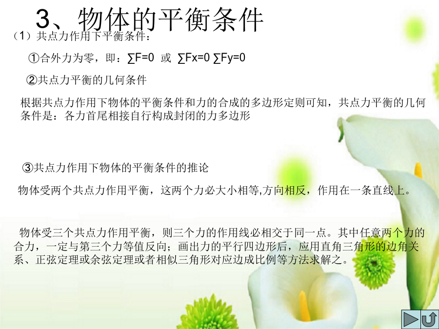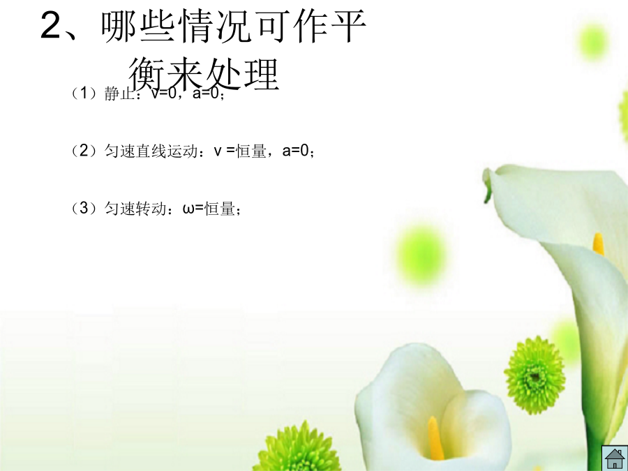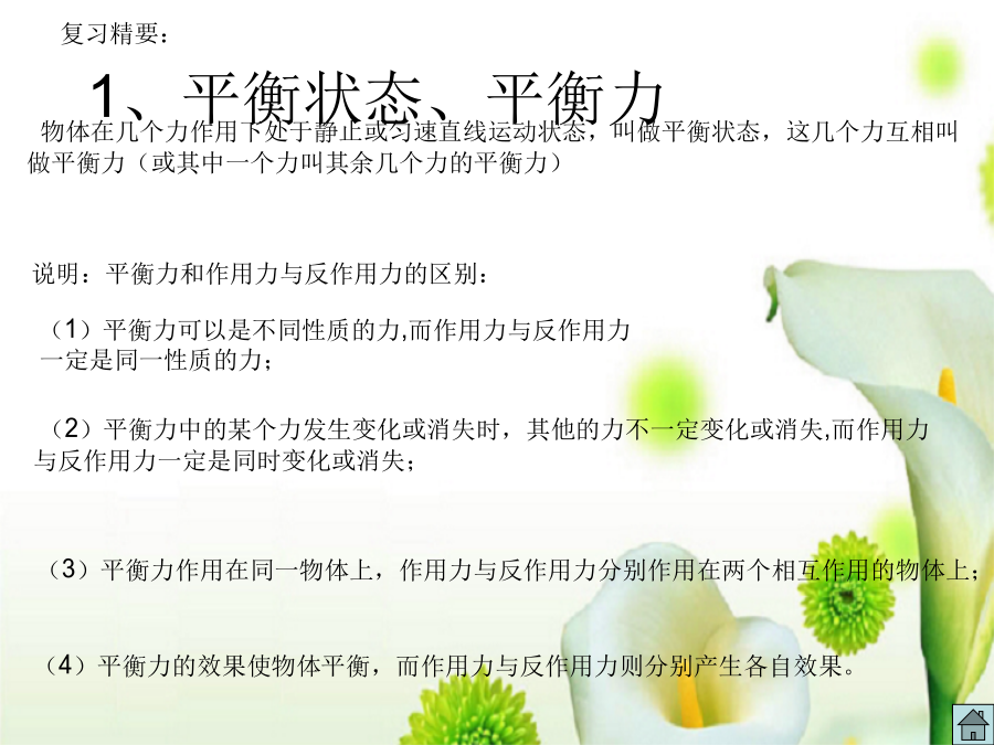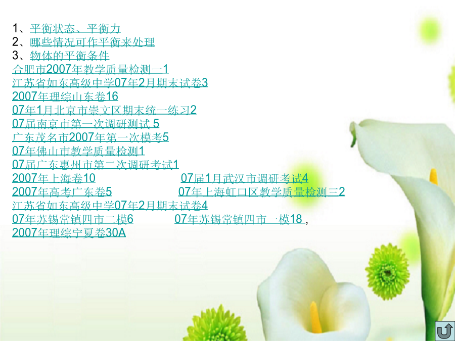 物体的平衡1、平衡状态、平衡力 2、哪些情况可作平衡来处理 3、物体的平衡条件 合肥市2007年教学质量检测一1 江苏省如东高级中学07年2月期末试卷3 2007年理综山东卷16 07年1月北京市崇文区期末统一练习2 07届南京市第一次调研测试5 广东茂名市2007年第一次模考5 07年佛山市教学质量检测1 07届广东惠州市第二次调研考试1 2007年上海卷1007届1月武汉市调研考试4 2007年高考广东卷507年上海虹口区教学质量检测三2 江苏省如东高级中学07年2月期末试卷4 07年苏锡常镇四市二模607年苏锡常镇四市一模18, 2007年理综宁夏卷30A1、平衡状态、平衡力2、哪些情况可作平衡来处理3、物体的平衡条件三个以上力依次类推,而且三个以上的力最终都可归结为三个力的平衡。所以三个力平衡在共点力作用下物体的平衡问题中具有典型性。合肥市2007年教学质量检测一1江苏省如东高级中学07年2月期末试卷32007年理综山东卷1607年1月北京市崇文区期末统一练习207届南京市第一次调研测试5广东茂名市2007年第一次模考507年佛山市教学质量检测107届广东惠州市第二次调研考试12007年上海卷1007届1月武汉市调研考试42007年高考广东卷507年上海虹口区教学质量检测三2江苏省如东高级中学07年2月期末试卷4解:07年苏锡常镇四市二模6.50m07年苏锡常镇四市一模18解:2007年理综宁夏卷30A解: