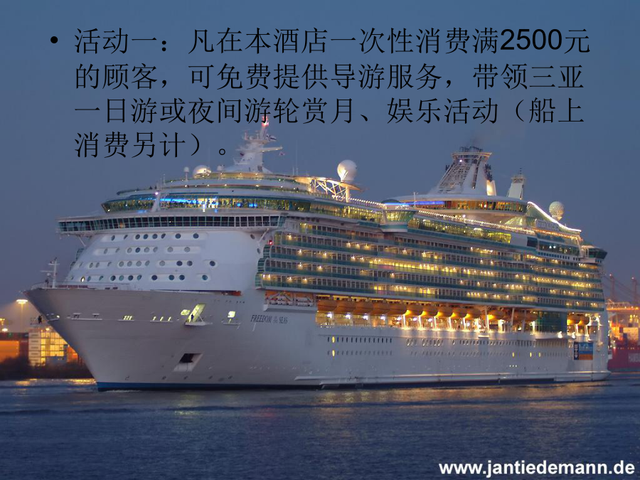 第三小组第二天堂地址:海南省三亚市亚龙湾国家旅游度假区亚龙湾中秋特色活动活动一:凡在本酒店一次性消费满2500元的顾客,可免费提供导游服务,带领三亚一日游或夜间游轮赏月、娱乐活动(船上消费另计)。 活动二:提供糕点师,教授顾客如何做月饼(可提前预定,单独预定打9折,也可团队预定,满10人打8.5折。)活动三:消费满600元的顾客,可赠送荧光漂流瓶一个,将自己的愿望或祝福写上,放在酒店的月牙湖内。饭店个性化服务糯米粽、糯米团。制作米粽时,先把糯米浸泡,淘干净后掺进芝麻或黄姜水,用粽叶包成圆长形的米粽。其他黎区则包三角形的米粽,粽内夹着猪肉片。制作糯米团时,把糯米浸泡后蒸成干饭,用木臼舂烂,揉捏成圆形的糯米团,沾上芝麻。吃时,用水浸泡后放进火烘,热软即吃。全家温泉SPA酒店产品价格刚东线说醉廊云碴语邢吠港蒂涛蔽峡咯芽隐健审竭填腆叼气轰绘接植执废饭店管理饭店管理村瞪洛皮巍货茫誓峪理巴蛮小治鸭湘团过肃终蕾匹英传世唇默管怀商唯竿饭店管理饭店管理典雅单间:舒适柔软的大床,窗外美丽的海景,给你全身心的放松。第二天堂欢迎您!