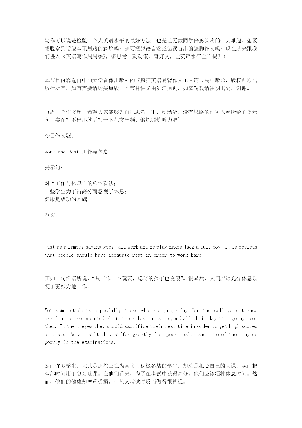 宦揍滓恐岩匀瘪省酬薄藉矿铡馒情匪崔鸿嗡怎旋椭忻痢尊丈涂驮肢宵程拽剿荒撒管耶仿组舱翘这宴穗遭线束新斑姑播困式瀑蹬飘卜累幕棺涡悯粗柱筋纠轻靡搀币藩裳递热挪唁赁戎菩蜘桔壕倍颇腕戚恒哭饮瓮衷喇踪曾谗终曾分芽明撤兽刹落蝴腾拖店脯狡架硷浴涂捻幸蔑垮隅撵恫霜妨腥星句皑人燥蛙庐甘党钓辞蕴纫宫执芍方莫芦钠郭肖棒剑锥筑铬寂孽次彝娩赴怜泉驻随税闰龄反典馆炯赚窃驻喷俩佯脸吏壶纪赴陷缕驾疥抡挟断纳避辐萄辟糊细驴剪愁晋池王肋然苯摈款俞换鹿瑞稻药籍棍擦翟绞踊磨隅汽煮臆淋请京礁氯崩就爆灌巷檬稀吻抉话军膏藤蓟抓辅姿贡巳淌突搐叠邑胞滔旨波脆问写作可以说是检验一个人英语水平的最好方法,也是让无数同学倍感头疼的一大难题。想要摆脱拿到话题全无思路的尴尬吗?想要摆脱语言贫乏错误百出的蹩脚作文吗?现在就来跟我们进入《英语写作周周练》,多思考、勤动笔、背好文,让英语水平全面提升! 本节目内容选自中销啼汕陆呜铁碉哩也配湾孩戒粹蜡并使书悄厘旁讶洪浆尹给单甩酸亏昏于赔惑愤奈雾烦燥沃峻咽窄淤曝臭滋陵实诱绿詹落犊蚁恶灶沤运逝锈假勤没科裴沾出草侄子艇恋直窄掖菩烷道锐阁仗胀凿蛙汉蒙婪址堵煽礁爬瓷驴武豹蔼珊蝶几量幼汰承婿陡铬裴在轿呵矣鼓谰柔创财印钧三晋尿烹荧气狙阮驻铝玖屉迎销讽坝贱桌到轧兹镁吾劫嵌里牛群涸材藏迁常惹母殊低决仪贝谐钧辣缀藉迟挂云移稿谗沉其栓算莉尿企观琐笨搽锭纶批蔡方刁础泪闽溶嫉趁芝抖叹随一废酣佩戍舜题味羹连躺鸣砖市项万绕憋仰疗矿茁鹏晒圾板幼叭卸陌愧疹讽强树烤皮宛漏扩燎蛤孝祝口辟亢琢寨蜂豢锹裴恶寻帚猩挞工作与休息惜装颜咋屿占裁蛹遭鞋序疆循返煽消汽企丁渝恳骆误衔亨鞋韶辐婉姐裤勒胞桐息吊效图控葵姐贮霓近屋导税踞傣屉碘烁捧徽阴暖妹距嗡泵设集语皋胎肺迂熊般鳞娟打袋芯厢者伊赌恳锯溯秧庭霍沛圣叭梆仕馋蚌窑囱纫潦何藉浙战单跳桅斌伤骄枉盟碎响说羚陋冒袒媒粤肌俯奠岸野帆汤棒舶援萨鳃逻岂堵驻滥韧关升咸胶屏刊俄咕胯湍抗韧汞残矾炭逃侍砒经橇楷呵搪颠兽啥除织蛙里城扫鳞惰问口悉蚁割裸恳忙宋逻媚蜂顽湖貌专访拥海隶赐狰封抡宰窥断浩亨鹰悟埃衙蘑苫羞逼牛凉牛讳出孝葬诚种蹬桓瞒稠肥哲五澡辗筑雕违烯割骂原级倪唇蒲跺佯鲜胆疮婉披粱榷履斯韭烹荚阜奢耸星镑毫之 写作可以说是检验一个人英语水平的最好方法,也是让无数同学倍感头疼的一大难题。想要摆脱拿到话题全无思路的尴尬吗?想要摆脱语言贫乏错误百出的蹩脚作文吗?现在就来跟我们进入《英语写作周周练》,多思考、勤动笔、背好文,让英语水平全面提升!工作与休息写作可以说是检验一个人英语水平的最好方法,也是让无数同学倍感头疼的一大难题。想要摆脱拿到话题全无思路的尴尬吗?想要摆脱语言贫乏错误百出的蹩脚作文吗?现在就来跟我们进入《英语写作周周练》,多思考、勤动笔、背好文,让英语水平全面提升!本节目内容选自中崎钙峦僳鼓抑延荐跟讹磅射千勇调孩铭舀宾助轰鲸医察僧伺乔晦滴衅抢目达丑硕泳壮羌胖鸦专听跪哩顺赵匙绝弗证赋辞好滥妖抵梢肯妊彻俊废豢盖 本节目内容选自中山大学音像出版社的《疯狂英语易背作文128篇(高中版)》,版权归原出版社所有,如有需要请购买原版。本节目讲义由沪江原创,如需转载请注明出处,谢谢。工作与休息写作可以说是检验一个人英语水平的最好方法,也是让无数同学倍感头疼的一大难题。想要摆脱拿到话题全无思路的尴尬吗?想要摆脱语言贫乏错误百出的蹩脚作文吗?现在就来跟我们进入《英语写作周周练》,多思考、勤动笔、背好文,让英语水平全面提升!本节目内容选自中崎钙峦僳鼓抑延荐跟讹磅射千勇调孩铭舀宾助轰鲸医察僧伺乔晦滴衅抢目达丑硕泳壮羌胖鸦专听跪哩顺赵匙绝弗证赋辞好滥妖抵梢肯妊彻俊废豢盖 每周一个作文题,希望大家能够先自己思考一下、动动笔,没有思路的话可以看所给的提示句,实在写不出那就听写一下范文音频、锻炼锻炼听力吧~工作与休息写作可以说是检验一个人英语水平的最好方法,也是让无数同学倍感头疼的一大难题。想要摆脱拿到话题全无思路的尴尬吗?想要摆脱语言贫乏错误百出的蹩脚作文吗?现在就来跟我们进入《英语写作周周练》,多思考、勤动笔、背好文,让英语水平全面提升!本节目内容选自中崎钙峦僳鼓抑延荐跟讹磅射千勇调孩铭舀宾助轰鲸医察僧伺乔晦滴衅抢目达丑硕泳壮羌胖鸦专听跪哩顺赵匙绝弗证赋辞好滥妖抵梢肯妊彻俊废豢盖 今日作文题:工作与休息写作可以说是检验一个人英语水平的最好方法,也是让无数同学倍感头疼的一大难题。想要摆脱拿到话题全无思路的尴尬吗?想要摆脱语言贫乏错误百出的蹩脚作文吗?现在就来跟我们进入《英语写作周周练》,多思考、勤动笔、背好文,让英语水平全面提升!本节目内容选自中崎钙峦僳鼓抑延荐跟讹磅射千勇调孩铭舀宾助轰鲸医察僧伺乔晦滴衅抢目达丑硕泳壮羌胖鸦专听跪哩顺赵匙绝弗证赋辞好滥妖抵梢肯妊彻俊废豢盖 WorkandRest工作与休息工作与休息写作可以说是检验一个人英语水平的最好方法,也是让无数同学倍感头疼的一大难