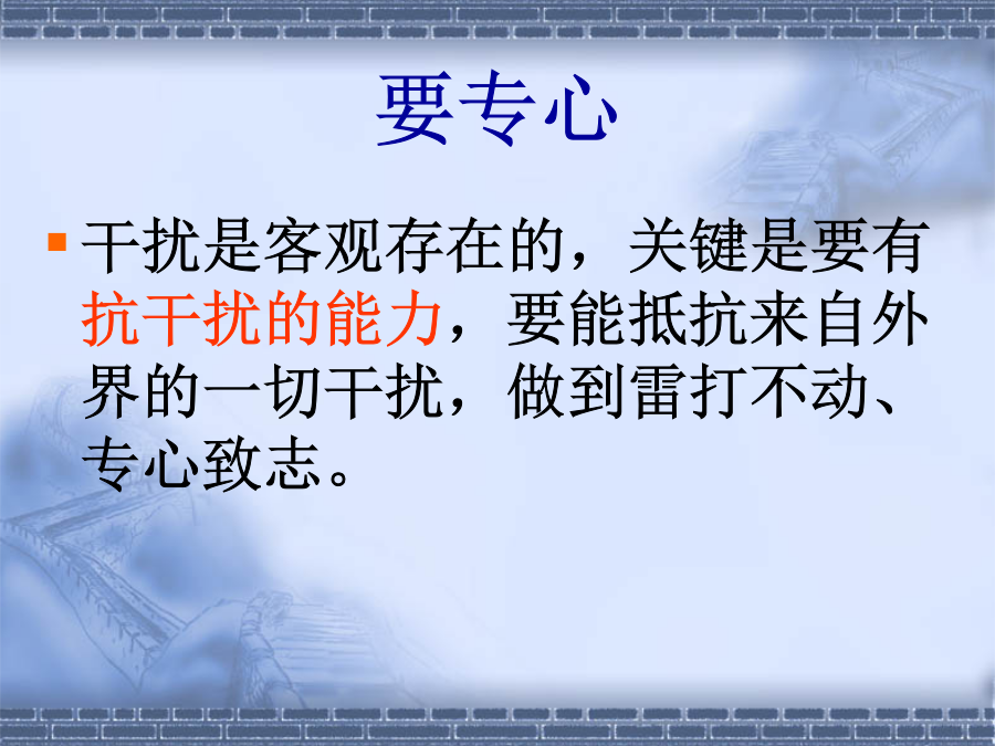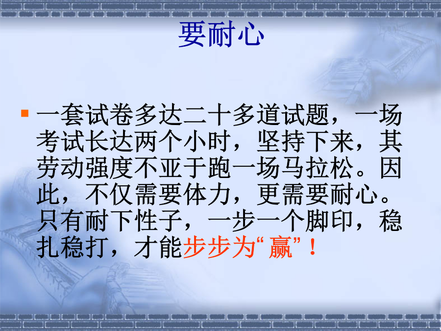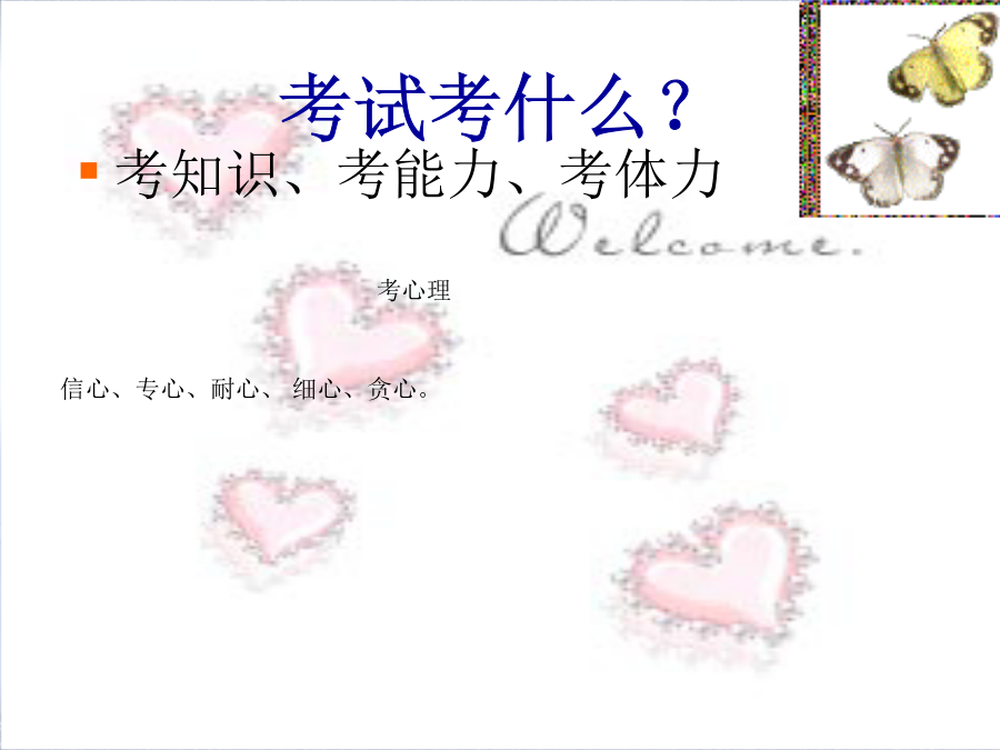 考试考什么?有这样一副广为流传的对联:要专心要耐心要细心要贪心心理状态如何直接影响到考试成绩,一个心理状态好的考生成绩可以提高60至100分,反之则会降低50分左右。 洋快餐不宜考前食用不宜食用太多甜食,如奶油蛋糕、冰激凌、巧克力等,会产生胃管反流和反酸。考试期间天气比较热,考生体液的流失也比较大,所以补充水分是至关重要的,这里所提到的水分是指温开水或矿泉水,而不包括含糖的饮料。 调整“动”:临考前,该怎样给自己减压?:实践中总结提炼出来的情绪调节方法二、愉悦术。 在平时的学习与生活中,应努力增加积极情绪。 辩证思维就是用全面的、发展的、正反的、变化的观点看待世界上的万事万物。一切事情都不是孤立的、静止的,一切事情都有好与坏两面,并且是可以相互转化的。好事可以变为坏事,坏事也可以变为好事。 有一位千万富翁,有房、有车、有地位,妻子漂亮、儿子聪明,但是他很不快乐,在心理咨询中他告诉我,他不愁吃穿,但就是不开心,深究原因,方知,他收入增长的目标是每年至少赚1000万,可是他今年只赚到了600万;他的太太漂亮,但有时候自作主张不听话;儿子聪明,他想要他儿子考到班上前三名,可是他儿子只考了班上的第六名;自已身体还算健康,但最近体重增加了,减不下来。可见:不良的思维方式常常导致人的不快乐。而辩证的思维方式是保持人情绪稳定的最佳思维方式。如“塞翁失马,焉知祸福”。 “考试没考好,是坏事,同时也是好事,因为它表示我还有很大的进步空间,同时找到了我知识的薄弱环节,为我下一次的成功指明了努力的方向”。 “今天他和我吵架了,是坏事,同时也是好事,因为它提醒我,与他这样的人相处,我应该选择更好的方法”等。 辩证思维可以使你从容地对待挫折和失败,避免有害的消极情绪,永保积极向上的心态。 三、幽默术。古希腊著名哲学家苏格拉底是出了名的“妻管严”,他的太太十分厉害。有一次,苏格拉底的朋友到他家做客,刚吃完饭,那位朋友还没走,苏格拉底的妻子就当着那位朋友的面,要求苏格拉底帮她倒洗脚水。苏格拉底感到很没面子,就执意不肯,于是,她的妻子就非常生气地跟他大吵大闹。为免生事端,苏格拉底就和他的朋友一起离开家门,并下楼出去,当他们刚走出楼门口时,他妻子突然将一盆洗脚水泼到了他的身上。场面十分尴尬,可苏格拉底却笑着说道:“我早就知道,打雷过后一定要下雨”。他的机智与幽默赢得了朋友会心的一笑,从而化解了尴尬的场面。在生活中你不但要学会幽默,而且还应当重视“笑”的价值。人不是因为高兴才笑,而是因为笑才高兴。不是因为悲伤才哭,而是因为哭才悲伤。生活中要多笑少愁, 笑一笑,十年少;。 另外,笑还有较好的生理作用,如,笑的时候可以增加吸氧量,按摩心脏,松弛肌肉,促进面部肌肉放松,增加脑部供血量,降低基础代谢率等。 四、助人术 许多中考成功的学生都是乐于助人的人,他们从不保守学习资源,总是乐于帮助其他同学进步,结果是他们的乐于助人也源源不断地获得别人的支持与帮助。 有一些同学由于受病态嫉妒心的影响,担心别人超过自己,对同学保守学习资源,不愿意帮助同学解决疑难题目,结果同学关系紧张,被团体孤立,不但得不到他人的帮助,而且还会心情压抑学习效率很低。 五、宣泄术。六、代偿转移术七、升华术八、照镜术假如分数让你挫败怎么办?一年后,我通过努力争取到了仅有的几个转入浙江工业大学本部就读的机会。现在我还是一名大三的学生,面对即将参加高考的学弟学妹们,我想说的是其实高考并不可怕,当你走过来后回头看那段日子时,你会发现自己的收获远大于付出。我还要说的是,其实人生的机会很多,别因为一次失败而否定自己,就算进入了不是很理想的学校,也可以通过自己的努力改变现状的。比如我,也争取到了从三本的院校转入本部读书;还有杭城各大高校在大学二年级结束后有一次在各校间跨专业跨学校的重新选拔考试,我身边就有朋友通过这样的考试重新选择了自己理想的学校和专业。很高兴跟大家分享我的经历,祝正经历高考的学弟学妹们能考上理想的大学!