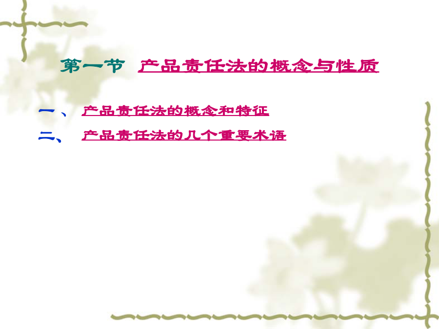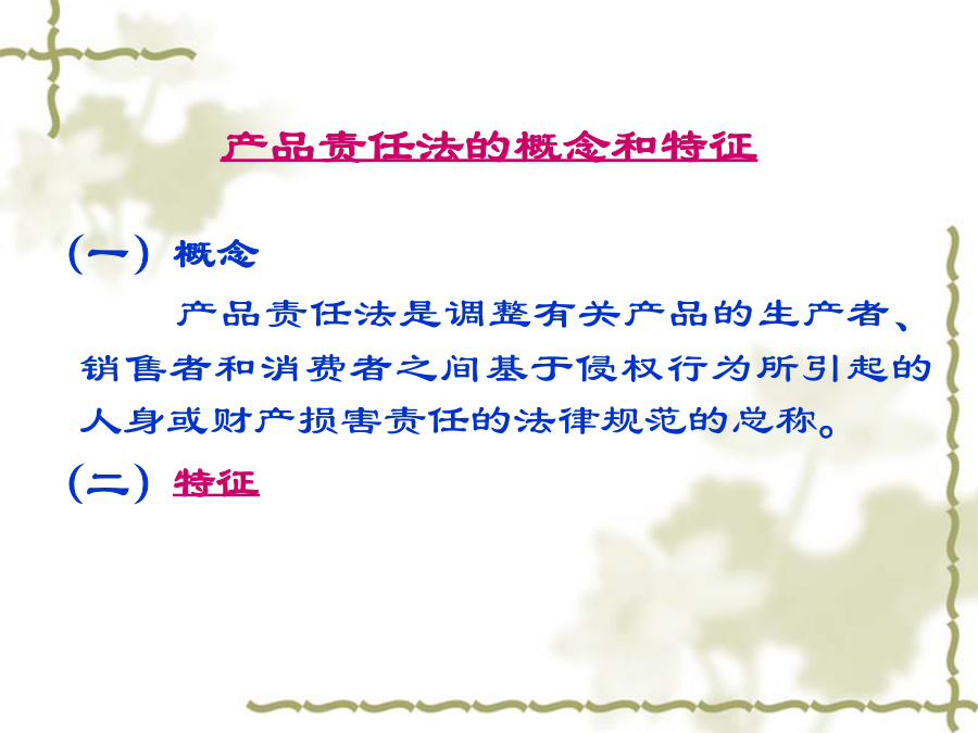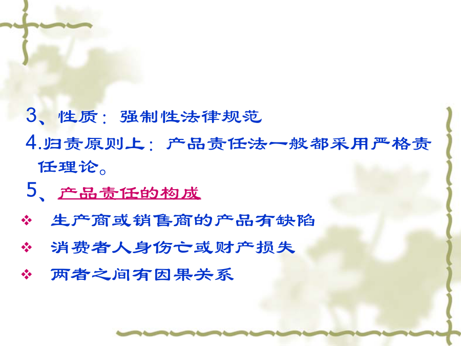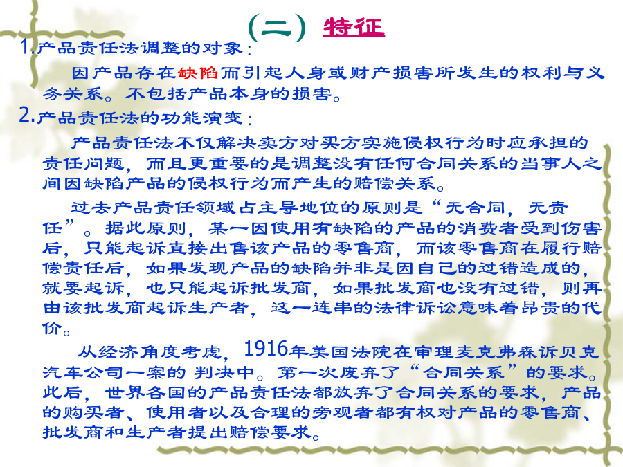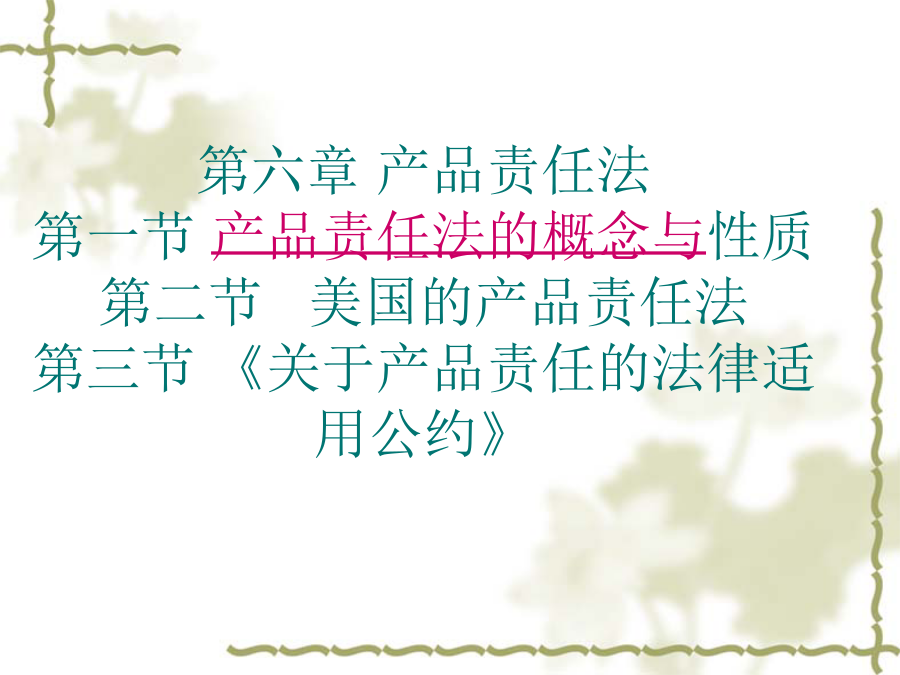 第六章产品责任法第一节产品责任法的概念与性质第二节美国的产品责任法第三节《关于产品责任的法律适用公约》第一节产品责任法的概念与性质产品责任法的概念和特征(二)特征产品责任法的几个重要术语(一)产品(products) 1.美国:产品指任何经过工业处理,用于销售的物品。 2.1976年欧洲理事会制定的《斯特拉斯堡公约》:产品是一切可移动的物品,不论是否加工过、天然的或工业的,甚至组合到另一可移动或者不可移动的物体中的物品。 3.1980年欧共体《产品责任指令》:产品指工业生产的可移动的物品。 4.我国《产品质量法》:产品是指经过加工、制作,用于销售的产品,不包括建设工程。 5.1978年《关于产品责任的法律适用公约》:产品包括天然产品和工业产品,无论是加工的,还是未加工的,也无论是动产还是不动产。 (二)缺陷 1、美国法院判决认为,具有不合理危险性或过分不安全的产品,就是缺陷产品。 2、《产品责任指令》规定,考虑到包括产品的说明及产品投入流通领域的时间等因素在内的所有情况,如果一项产品未能给按预期的目的加以使用该产品的人之身体或其财产提供他们有权期待的安全,那么该项产品即是缺陷产品。 3、中国产品质量法:产品存在危及人身、他人财产安全的不合理危险;产品有保障人体健康、人身、财产安全的国家标准、行业标准的,是指不符合该标准。 产品缺陷的类型概括 (1)产品设计缺陷。往往是导致产品存在潜在危险的根本因素。 (2)产品制造缺陷。技术水平差,管理不善引起的。 (3)产品指示缺陷。说明、警告、安全指示等不合格。 (4)科学上不能发现的缺陷。指在投入流通时的科学技术水平无法发现而后又被证明确实存在的某种缺陷——发展缺陷。(不能主张)第二节美国的产品责任法1.疏忽 所谓疏忽是指产品的生产者或销售者有疏忽之处,致使产品有缺陷,而且由于这种缺陷使消费者的人身或财产遭到损害,对此,该产品的生产者和销售者应承担责任。 当原告以疏忽为理由向法院起诉要求被告赔偿其损失时,原告必须提出证据证明:①被告没有做到“合理的注意”(reasonablecare),即被告有疏忽之处;②由于被告的疏忽直接造成了原告的损失,仅凭原告使用产品造成了损失这一事实的本身一般并不能推定被告有疏忽。另外,如果由于原告自己的疏忽造成了损失,原告也不能要求被告赔偿损失。 在以疏忽为理由提起诉讼时,原告与被告之间不需要有直接的合同关系(privityofcontract),因为这不是根据合同提起的诉讼,从这一点看,是对“无合同,无责任”的发展。 2.违反担保 所谓违反担保是指产品存在某种缺陷或瑕疵,卖方违反了对货物的明示或默示担保,例如违反了产品应具有商销性的默示担保,或违反了产品必须适合一般用途或特定用途的默示担保等。如果原告由于产品的缺陷遭受损害,原告可以以违反担保为理由对被告起诉,要求其赔偿损失。违反担保之诉是根据买卖合同提起的诉讼。 违反担保之诉是根据买卖合同提起的诉讼。按照美国普通法的原则,凡依合同提起的诉讼,原告与被告之间必须要有直接的合同关系。具体到买卖合同来说,只有买卖双方才存在直接的合同关系,所以,如果卖方违反担保义务,原则上只有买方才能对卖方起诉,买方以外的任何人都无权对卖方起诉;另一方面,买方只能对其卖方起诉,而不能对卖方以外的其他人(如货物供应商或制造商)起诉。 美国法院在审判实践中,对以违反担保为理由提起的产品责任的诉讼,逐步从纵横两个方面放宽和取消了对双方当事人要有直接合同关系的要求。从纵的方面来说,原告不仅可以对卖方起诉,而且可以对生产或销售这种有缺陷的产品的各有关责任方起诉,其中包括零售商、批发商、进口商、出口商,一直到制造厂商。从横的方面来说,有权提起产品责任诉讼的人不仅包括买方,而且包括一切因使用有缺陷的产品而蒙受损失的人,如买方的家属、亲友、客人,甚至包括被伤害的过路行人。 但是,受害人依然要举证产品制造人有过失,而这往往是困难的。 3.严格责任对原告来说,以严格责任为依据对被告起诉是最为有利的,因为严格责任原则消除了以违反担保或以疏忽为理由提出损害赔偿时所遇到的种种困难: 第一,严格责任是一种侵权行为之诉(aformoftortaction),它不用于以合同为依据的违反担保之诉,不要求双方当事人之间要有直接的合同关系; 第二,在以严格责任为理由起诉时,原告毋需承担证明被告有疏忽的举证责任,因为它要求卖方承担无过失责任。 原告的举证责任仅限于:①证明产品确实存在缺陷或不合理的危险;②正是由于产品的缺陷给使用者或消费者造成了损害;③产品所存在的缺陷是在生产者或销售者把该产品投入市场时就有的。只要原告能证明以上三点,被告就要承担赔偿损失的责任。 所谓产品的缺陷不仅包括设计和生产上的缺陷,而且包括为使产品安全使用所必需的各种因素,如包装、标签、提醒用