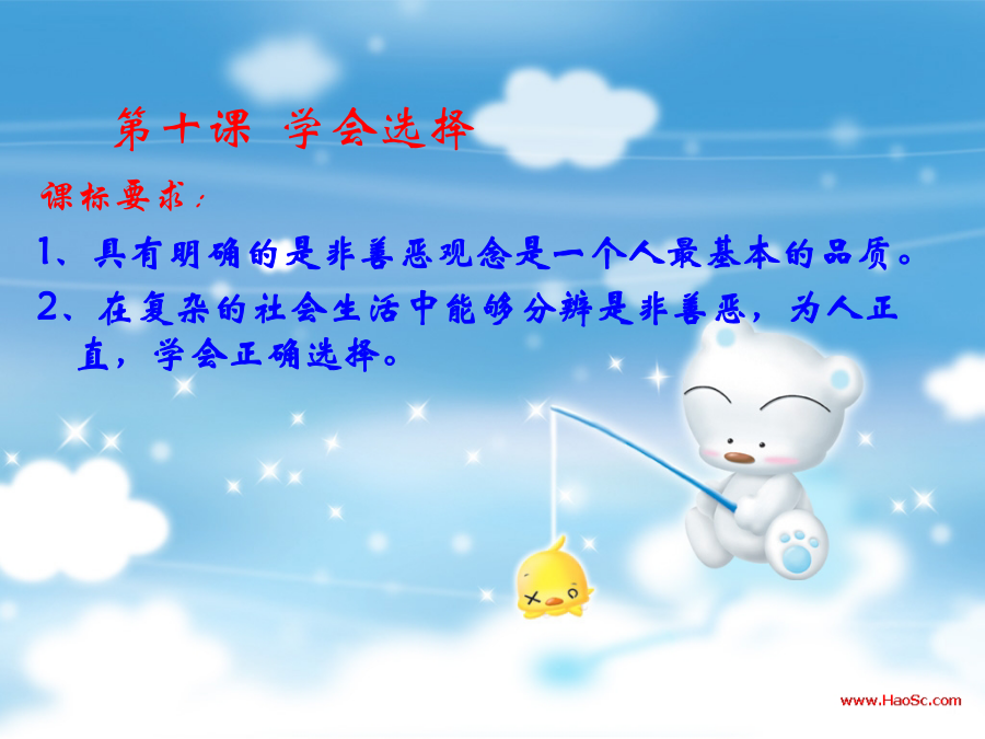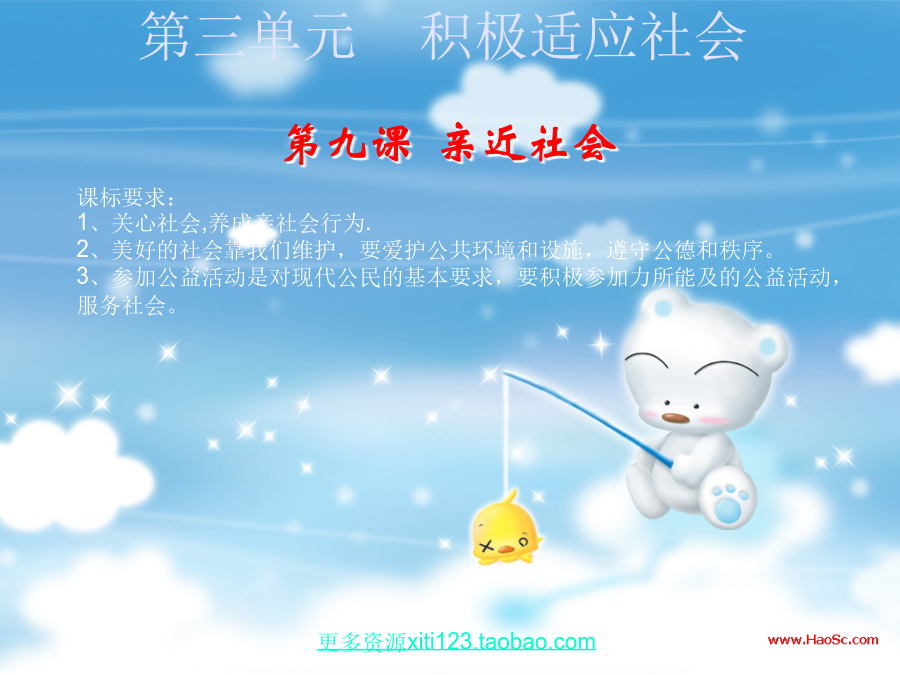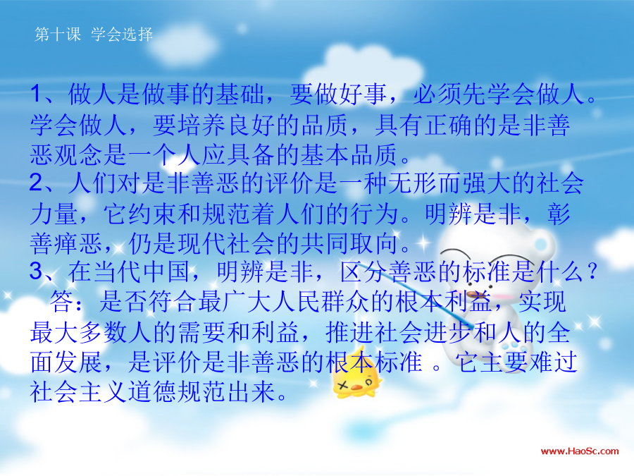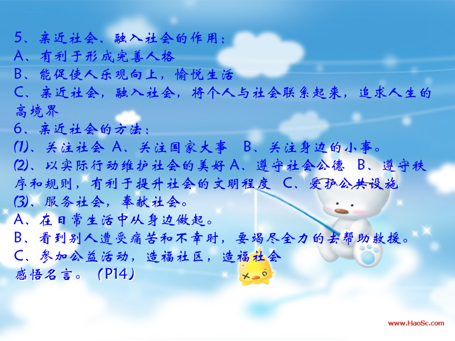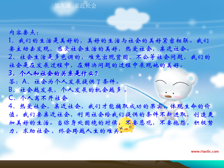 第九课亲近社会内容要点:1、我们的生活是美好的,美好的生活与社会的美好紧密相联。我们要主动去发现,感受社会生活的美好,热爱社会,亲近社会。2、社会生活是多色调的,难免出现贫困、不公等社会问题,我们的社会是在发展过程中,在解决问题的过程中展现她的美好。3、个人和社会的关系是什么?答:A、社会为个人发展提供了条件。B、社会越发展,个人发展的机会越多。C、个人离不开社会4、热爱社会,亲近社会,我们才能摘取成功的果实,体现生命的价值。我们要亲近社会,利用社会给我们提供的条件不断进取,创造更加美好的生活。当你身处困境的时侯,不要悲观,不要抱怨,积极努力,求助社会,终会跨越人生的难关。5、亲近社会、融入社会的作用:A、有利于形成完善人格B、能促使人乐观向上,愉悦生活C、亲近社会,融入社会,将个人与社会联系起来,追求人生的高境界6、亲近社会的方法:⑴、关注社会A、关注国家大事B、关注身边的小事。⑵、以实际行动维护社会的美好A、遵守社会公德B、遵守秩序和规则,有利于提升社会的文明程度C、爱护公共设施⑶、服务社会,奉献社会。A、在日常生活中从身边做起。B、看到别人遭受痛苦和不幸时,要竭尽全力的去帮助救援。C、参加公益活动,造福社区,造福社会感悟名言。(P14)第十课学会选择1、做人是做事的基础,要做好事,必须先学会做人。学会做人,要培养良好的品质,具有正确的是非善恶观念是一个人应具备的基本品质。2、人们对是非善恶的评价是一种无形而强大的社会力量,它约束和规范着人们的行为。明辨是非,彰善瘅恶,仍是现代社会的共同取向。3、在当代中国,明辨是非,区分善恶的标准是什么?答:是否符合最广大人民群众的根本利益,实现最大多数人的需要和利益,推进社会进步和人的全面发展,是评价是非善恶的根本标准。它主要难过社会主义道德规范出来。4、社会主义道德的核心:为人民服务。社会主义道德的原则:以集体主义为原则。社会主义道德的基本要求:以爱祖国、爱人民、爱劳动、爱科学、爱社会主义为基本要求。5、社会主义基本道德规范的内容:爱国守法、明礼诚信、团结友善、勤俭自强、敬业奉献。6、道德的含义:道德依靠人们的内心信念、习俗和社会屿论,确定是非善恶的界限,引导和约束着人们的行为。7、在复杂有社会生活中,我们要明辨是非善恶,做正直的人。8、在复杂有社会生活中,怎样做正直的人?答:①提高明辨是非的能力。②善于做出正确的选择。A、坚持自己的意见,不屈从伙伴的压力而做错误的事情。B、敢于对他人做的错事提出反对意见。C、如果做了错事要敢于承担责任。9.具有正确的是非善恶观念是一个人应具备的基本品质,分清是非善恶是人生修养中的重要内容.感悟名言。(P26)第十一课竞争与合作1、竞争与合作是社会生活中必然存在的现象,竞争中有合作,合作中有竞争。2、个人与个人之间,集体与集体之间,不同国家与地区之间,都存在竞争与合作。3、怎样正确认识竞争?答:竞争既有优点又有,优点是竞争可以开发人的潜能和智力,提高人的积极性和主动性,竞争能促进经济的发展;缺点是可能带来负面影响.(因此,我们要客观看待竞争。应对竞争有一个正确的认识,要对自己有个实事求是的评价,在竞争中要能审时度势,扬长避短.4、合作的重要性是什么?答:⑴、合作不仅是应对竞争的一种重要手段,更是实现自我发展的必经之路。⑵、个人的成功离不开合作。⑶、经济的发展也离不开合作。⑷、合作是人类生存和发展的重要手段。5、怎样提高竞争意识?答:①、增强竞争意识。②、提高竞争能力。③、既要勇于竞争又要善于竞争,但不能采取不正当手段。④、在竞争中要培养团结合作,乐于助人的品质。6、在竞争中应注意:①、诚实守信。②、遵纪守法。③、公平公正。④、遵守竞争的规则。7、怎样培养合作意识?答:①、从身边小事做起。②、参加集体性竞争活动。8.竞争与合作的关系:竞争与合作构成了人生和社会生存.发展的两股力量,竞争中有合作,合作中有竞争,竞争与合作是统一的是相互渗透相辅相成的,一方面任何竞争都离不开合作,竞争的基础在于合作,没有合作的竞争是孤单的竞争,这种竞争是没有力量的;另一方面,合作能更好的竞争,合作越好,力量越强,竞争成功的可能性就越大.所以,对于社会的发展进步来说,竞争与合作是同样重要的,缺一不可的.感悟名言。(P39)第十二课维护权利适应社会内容要点:1、我的受教育权(1)、教育的重要意义①、教育是知识创新、传播和应用的主要基地,也是培养创新精神和创新人才的摇篮。②、教育能培养高素质的劳动者和专业人才;能提高创新能力,提供知识、技术创新成果;能增强民族凝聚力。(2)、受教育权的含义:我国宪法规定“中华人民共和国公民有受教育的权利和义务”。①、受教育权是指公民有从国家接受文化教育的机会,以及获得教育物质帮助的权利。②、受教育权是公民的一项基本权利,不容侵犯,一旦受到侵犯,我