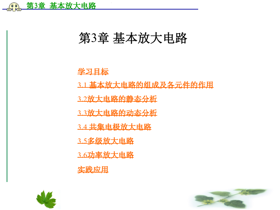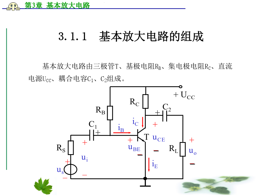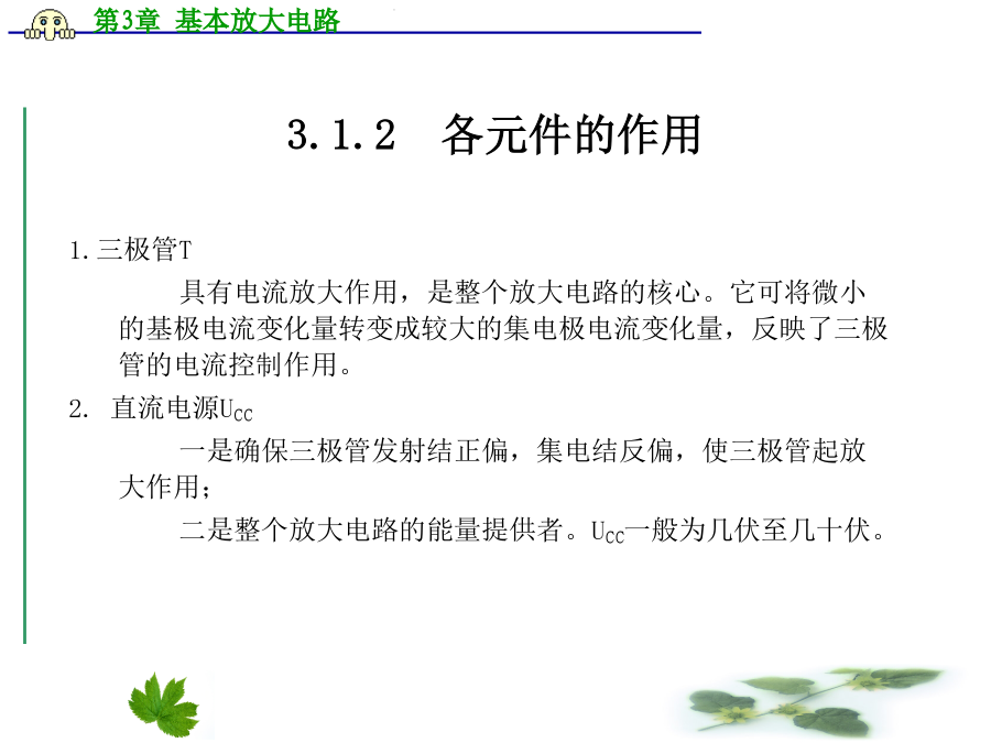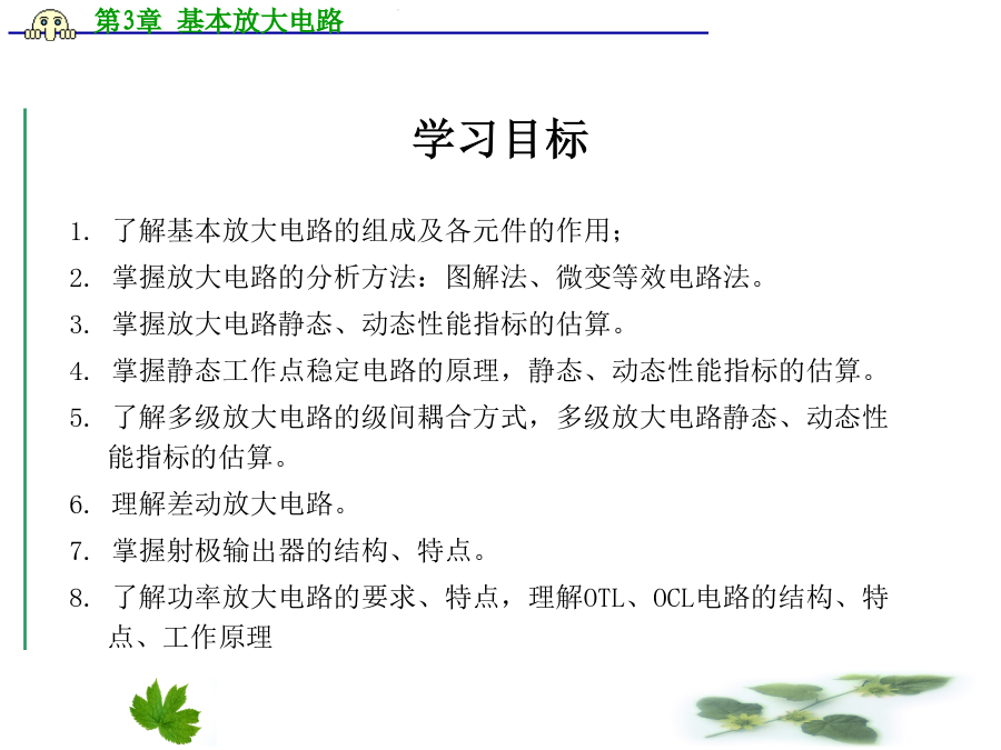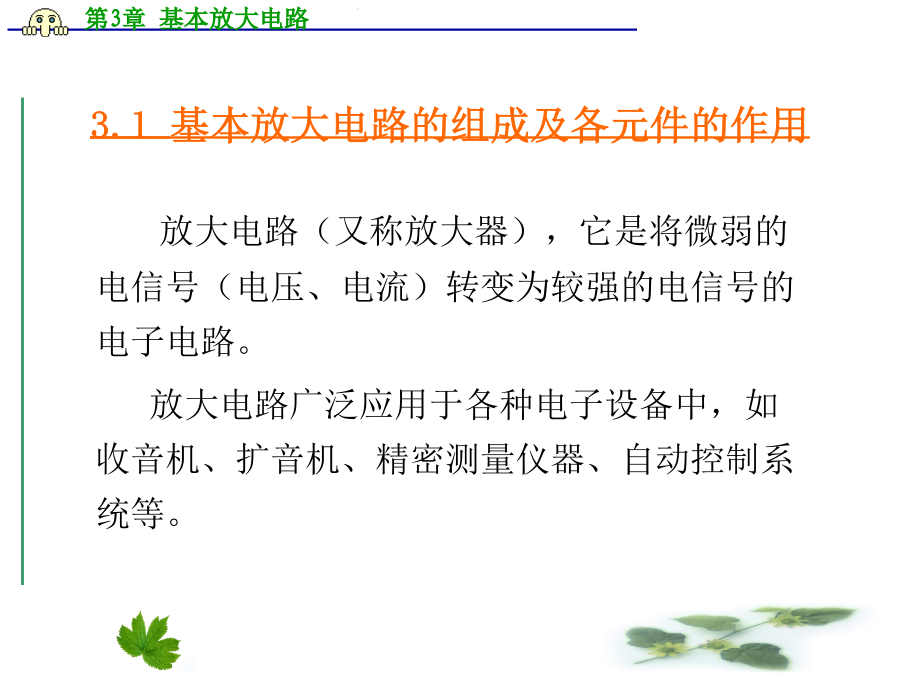 第3章基本放大电路学习目标3.1基本放大电路的组成及各元件的作用3.1.1基本放大电路的组成3.1.2各元件的作用3.基极电阻RB 控制基极电流IB的大小,使放大电路工作在较合适的工作状态。RB一般为几十千欧至几百千欧。 4.集电极电阻RC 能将集电极电流的变化转换成集–射极电压的变化,以实现电压放大作用。RC一般为几千欧至几十千欧。 5.耦合电容C1、C2 隔直流,通交流。一般选5微法至50微法的电解电容器。 3.2放大电路的静态分析3.2.1估算法它包含两个独立回路: 由直流电源UCC、基极电阻RB、三极管的基-射组成的基极回路; 由直流电源UCC、集电极电阻RC、三极管的集-射组成的集电极回路。 由直流通路可得 基极电流[解]3.2.2图解法取两个特殊点: 令IC=0时,UCE=UCC得M点 UCE=0时,得N点 两点连成一条直线,直线MN称直流负载线。直流负载线MN与输出特性曲线簇交点上的每一个电压、电流既满足线性部分中的要求,又满足非线性部分中的要求。 输出特性曲线中IB那条曲线与直流负载线MN的交点Q即为静态工作点。 Q点所对应的电流、电压值为三极管静态工作时的电流IB、IC和电压UCE.3.3放大电路的动态分析3.3.1放大电路的动态工作情况表示直流量3.3.2放大电路中各参数的定义2.输入电阻ri3.输出电阻ro4.通频带fL与fH之间的频率范围称为通频带,用BW表示。 3.3.3微变等效电路法1.三极管的微变等效电路对于低频小功率晶体管的输入电阻估算为:三极管静态工作点附近的输出特性曲线近似与横坐标轴平行且间距相等,当uce在较大范围变化时,ic几乎不变,三极管具有恒流特性和放大特性。这样三极管C、E之间可等效为一个受控电流源(其输出电流为ib)与三极管的输出电阻rce并联,rce很高(一般为几十千欧到几百千欧)可忽略 ube2.微变等效电路分析法RB1.电压放大倍数的计算2.输入电阻的计算3.输出电阻的计算[解]3.3.4静态工作点的设置与稳定除羞媒仆兔丹痈忧拐盐检翘窖侧世奋常留郸圆拷倘恩样胀墨雍昂苛键刽衅第3章基本放大电路第3章基本放大电路共射极基本放大电路具有元器件少,电路简单,容易调整等优点,但最大的缺点是稳定性差。当它受到外界因素影响时,都会引起工作点的变化,严重时还会造成放大电路不能正常工作,只能用在要求不高的场合。为此广泛采用分压式偏置放大电路RB11.分压式偏置放大电路的基本特点(1)利用电阻RB1和RB2的分压使三极管的基极电位固定(2)利用发射极电阻来获得发射极电位UB,自动调节IE和IB,使IC保持不变2.静态工作点的估算3.4共集电极放大电路共集放大电路(射极输出器)3.4.2共集电极电路分析(1)电压放大倍数输出电压和输入电压同相且大小基本相等, 故射极输出器又称为射极跟随器。(2)输入电阻ri高(3)输出电阻ro低3.4.3射极输出器的特点及应用3.5多级放大电路第一级作为输入级,它的任务是将小信号放大,常采用共射极放大电路。 最后一级(有时也包括末前级)作输出级,它的任务是功率放大,常采用功率放大电路。 其余各级称中间级,它的任务是电压放大,常采用若干级共射极放大电路组成。 多级放大电路中级与级之间的连接称为耦合。常用的耦合方式有:阻容耦合、直接耦合和变压器耦合。阻容耦合是电容器作为级间的连接元件,并与下级输入电阻连接而成的一种耦合方式。3.5.1多级放大电路的电压放大倍数,输入电阻、输出电阻3.5.2差动放大电路零漂在阻容耦合放大电路中也存在,但由于电容器的隔直作用,它只局限在本级范围内,不会被逐级放大,对输出不会带来影响。但在直接耦合放大电路中,这个微小的变化会被逐级放大,给放大电路的输出带来严重的影响。 产生零漂的原因有:温度变化、电源电压波动、元器件参数变化等,其中以温度变化引起的零漂最严重。 在多级直接耦合放大电路的各级漂移中,以第一级的零漂最严重。解决零漂最有效的方法是在多级放大电路的输入级采用差动放大电路。1.差动放大电路的组成2.差动放大电路的工作原理瑶挽均滑奠涧杠伎刘摊账衡蛰趾知扣漳兴悦腾撰俏鳃晃轩抡尿古亭鱼住叮第3章基本放大电路第3章基本放大电路(3)对差模信号的放大作用。3.6功率放大电路3.6.1功率放大电路的特点(3)非线性失真要小。 功放管在大信号下工作,不可避免地会产生非线性失真,只能从电路的结构上采取措施。让非线性失真尽可能的小。 (4)要考虑功放管的散热问题。 在功率放大电路中,有相当大的功率消耗在功放管的集电结上,使结温和管壳温度升高。为了充分利用功放管所允许的管耗,以获得足够大的输出功率,就要考虑功放管的散热问题。 2.功率放大电路的特点: 功率放大电路有甲类、乙类、甲乙类三种工作状态。(2)甲乙类工作状态3.6.2互补对称功率放大电路在ui