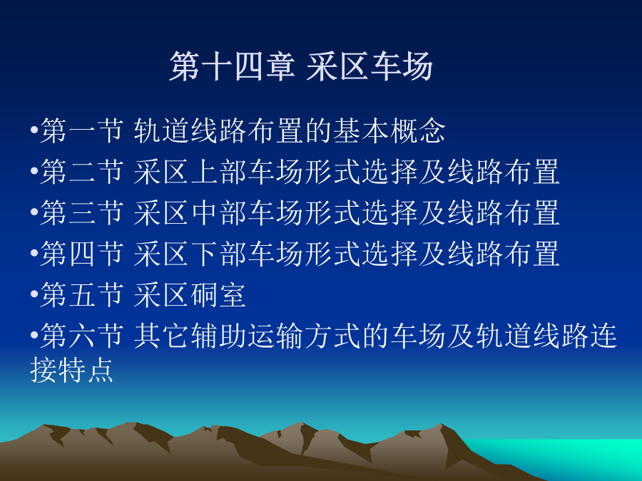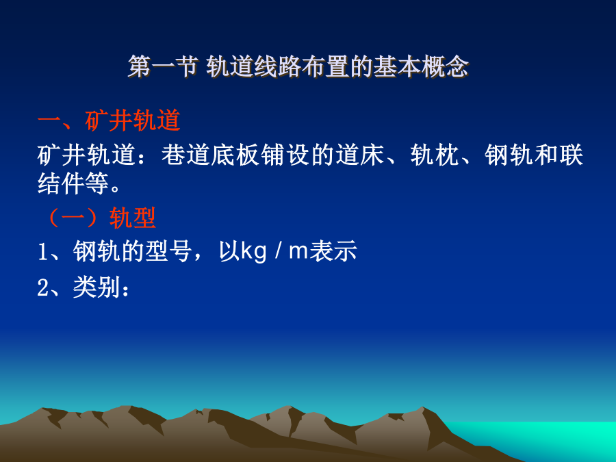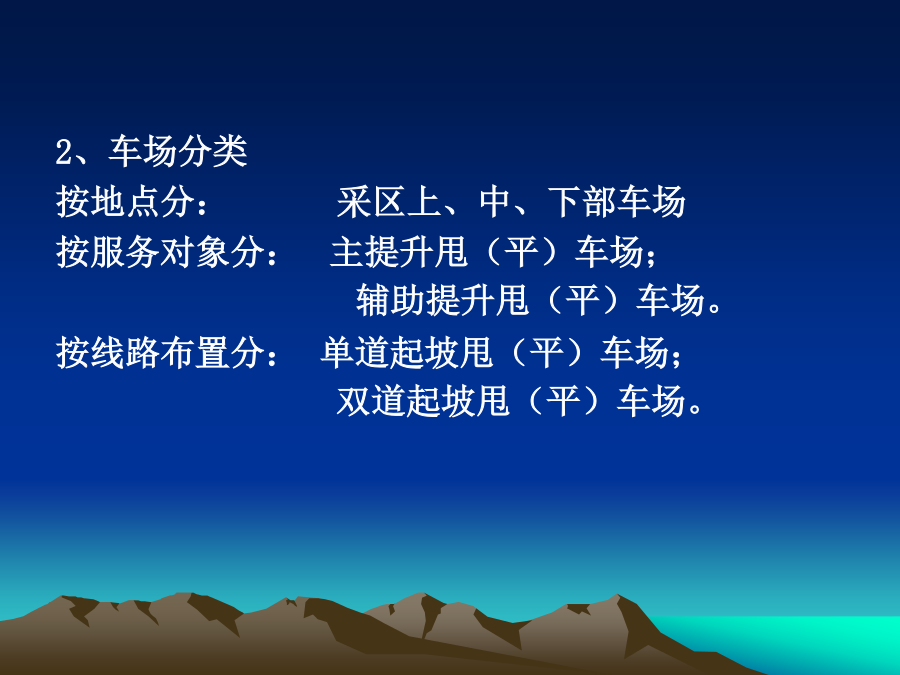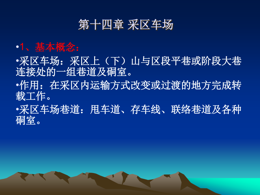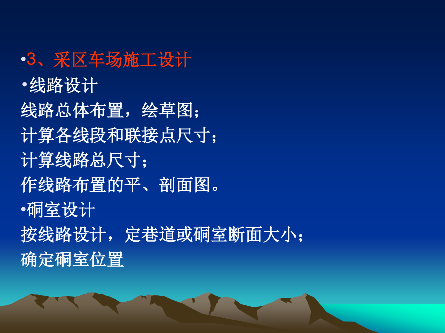 1、基本概念: 采区车场:采区上(下)山与区段平巷或阶段大巷连接处的一组巷道及硐室。 作用:在采区内运输方式改变或过渡的地方完成转载工作。 采区车场巷道:甩车道、存车线、联络巷道及各种硐室。 2、车场分类 按地点分:采区上、中、下部车场 按服务对象分:主提升甩(平)车场; 辅助提升甩(平)车场。 按线路布置分:单道起坡甩(平)车场; 双道起坡甩(平)车场。3、采区车场施工设计 线路设计 线路总体布置,绘草图; 计算各线段和联接点尺寸; 计算线路总尺寸; 作线路布置的平、剖面图。 硐室设计 按线路设计,定巷道或硐室断面大小; 确定硐室位置一、矿井轨道 矿井轨道:巷道底板铺设的道床、轨枕、钢轨和联结件等。 (一)轨型 1、钢轨的型号,以kg/m表示 2、类别: 重轨24kg/m的钢轨; 轻轨24kg/m的钢轨;矿井常用轨型有:24、18、15、11等。 小矿或运输量小的巷道可选用8.5型。 3、轨型选用:轨型选用(二)道岔道岔—使车辆由一线路转运到另一线路的装置(2)道岔参数:2、道岔类别(国标)对称道岔渡线道岔2)系列:615、618、624、918、924 每个系列中按辙每个系列中按辙叉号码和曲线半径不同,又有不同型号: DK615—4—12 DC624—3—9 DX918—5—2016 (1)符号含义:DK、DC、DX 单开、对称、渡线。 (2)第一段数:6、9—分别表600mm、900mm轨距。15、18、24—分别表示轨型。第二段数字(4、3、5)为辙叉号码(M) (3)辙叉号(M): M与辙叉角()的关系是:DK道岔DC道岔:DX道岔:(4)道岔半径 DK和DC名称尾数表示道岔曲轨的曲线半径,单位为:m。 如:6、9、12、15、20、25、30m。 DX—名称尾数有四位数。 DX918—5—2016 DX918—5—2019 四位数—前两位数:表示曲线半径,单位:m;后两位数:表示轨中心距,单位为:dm。 如:16示1600mm;19示1900mm。(5)道岔的方向性3、道岔选择4)与行驶车辆速度相适应 R小,大,行车v,只走矿车的道岔, 其行车v1.5m/秒,车场调车用。 5)注意左向、右向。 6)道岔选择:表18-2 4、简易道岔 1)结构尖轨,辙叉角,无统一标准。 2)用途:人力推车,行车速度15m/秒。二、轨道线路轨距及选用2、线路中心距线路中心距3、线路表示方法:(二)轨道曲线线路已知巷道转角 曲线半径R(选用) 切线长T: 弧长K: 2、曲线处巷道加宽和轨中心距加宽轨中心距加宽: 车辆外伸1、内伸2, 轨中心距加宽值:S=1+2 机车:S=300mm, 其他车:S=200mm。 曲线段巷道加宽: 机车运输: 外伸1=200mm,内伸2=100mm。 曲线段加宽S=1+2巷道加宽和轨中心距加宽加宽方法及范围 (1)将外轨线路平移S距离(移动外侧线路), 利用异向曲线联接方法。 (2)加宽范围L0 双轨线路中心距加宽必须从直线段开始。 在直线段加宽L0内,轨中心距由SS。 外轨抬高 为抵消离心力的影响,避免挤压外轨 900mm轨距时,h=1035mm 600mm轨距时,h=525mmL0值选取: 机车运输:L05m 1t矿车:L0=25m 3t矿车:L0=20m三、轨道线路联接计算(3)采用道岔岔线与弯道曲线直接相连,取消了缓和直线C;(4)巷道转角。 2、DK道岔平行线路联接参数:B=Sctg,m=Scsc; n=mT,c=nb L=a+B+T L—DK平行线路联接点长度; m—联接系统斜长; C—联接系统参数,C≮03、DC道岔平行线路联接L=a+B+T C≮0(三)绕道装车式线路布置